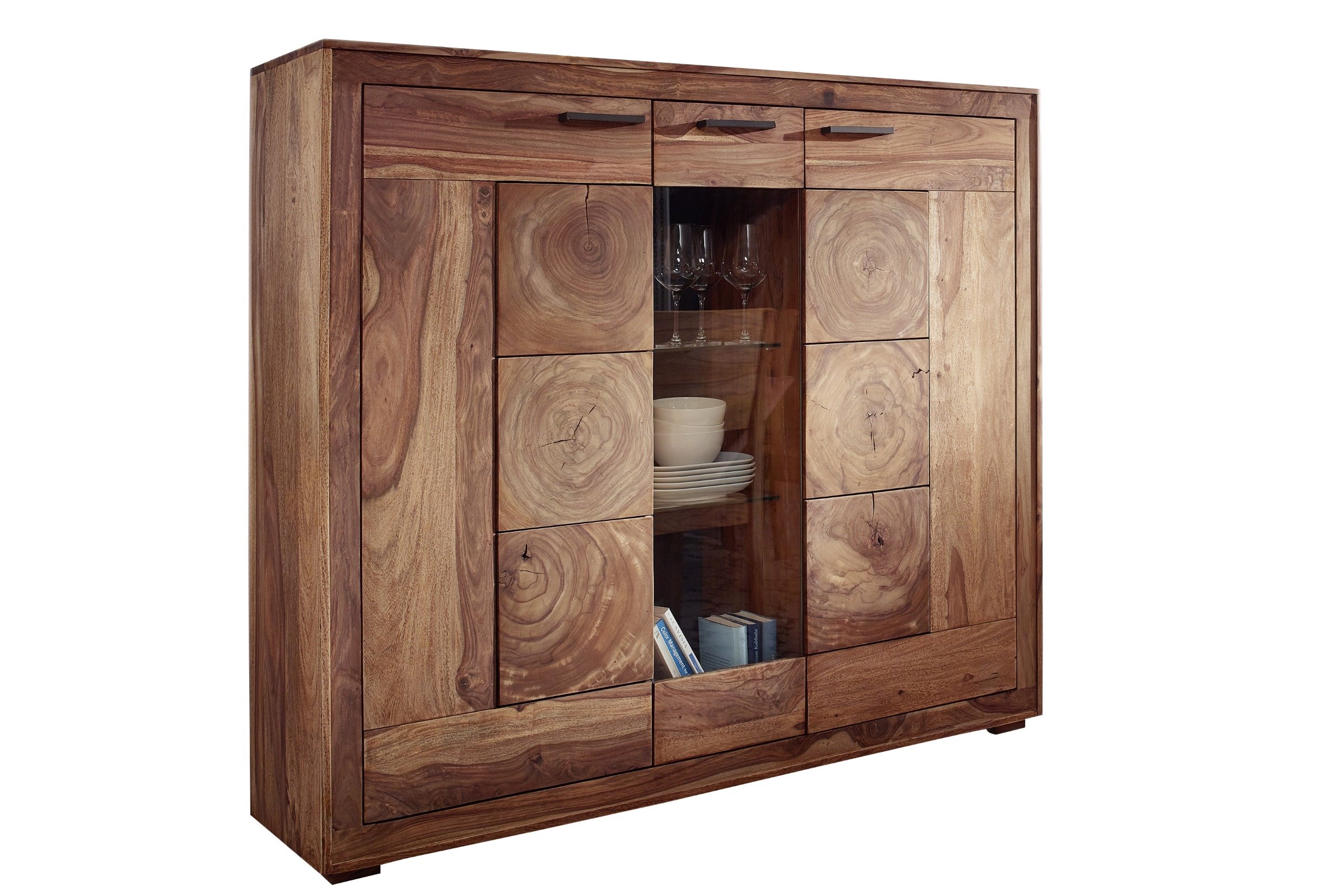 B-Ware Einzelstück Highboard Malfa, Akazienholz naturfarben, massiv & lackiert, mit 3 Türen, 150 x 130 x 40 cm