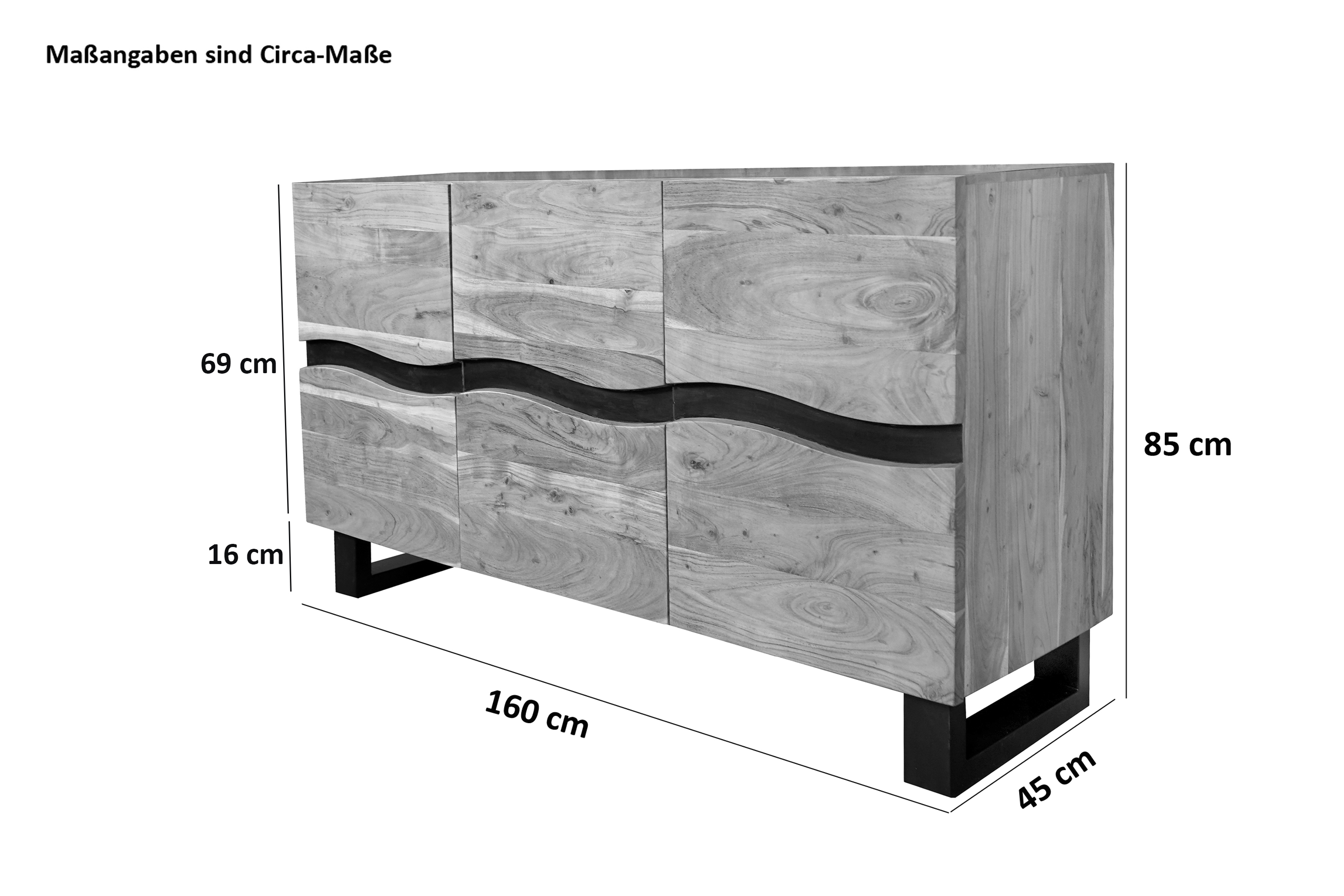 Unsere B-Ware Produkte bieten Ihnen die Möglichkeit, hochwertige Artikel zu attraktiven Preisen zu erwerben, die lediglich leichte optische Mängel aufweisen. Funktionalität und Qualität bleiben dabei uneingeschränkt erhalten. Jeder Schrank ist eine sorgfältig geprüfte Retoure und kann kleine Schönheitsmakel wie leichte Kratzer, Astlöcher, Farbabweichungen oder minimale Mängel am Gestell aufweisen. Diese beeinträchtigen jedoch weder die Nutzbarkeit noch die Stabilität. Indem Sie sich für B-Ware entscheiden, tragen Sie aktiv zum Umweltschutz bei, indem Sie Ressourcen schonen und Abfall reduzieren.Dieses moderne Sideboard verbindet massives Akazienholz mit dunklem Metall und schafft dadurch ein einzigartiges Möbelstück, das Ihrem Wohnraum einen neuen Charakter verleihen wird.