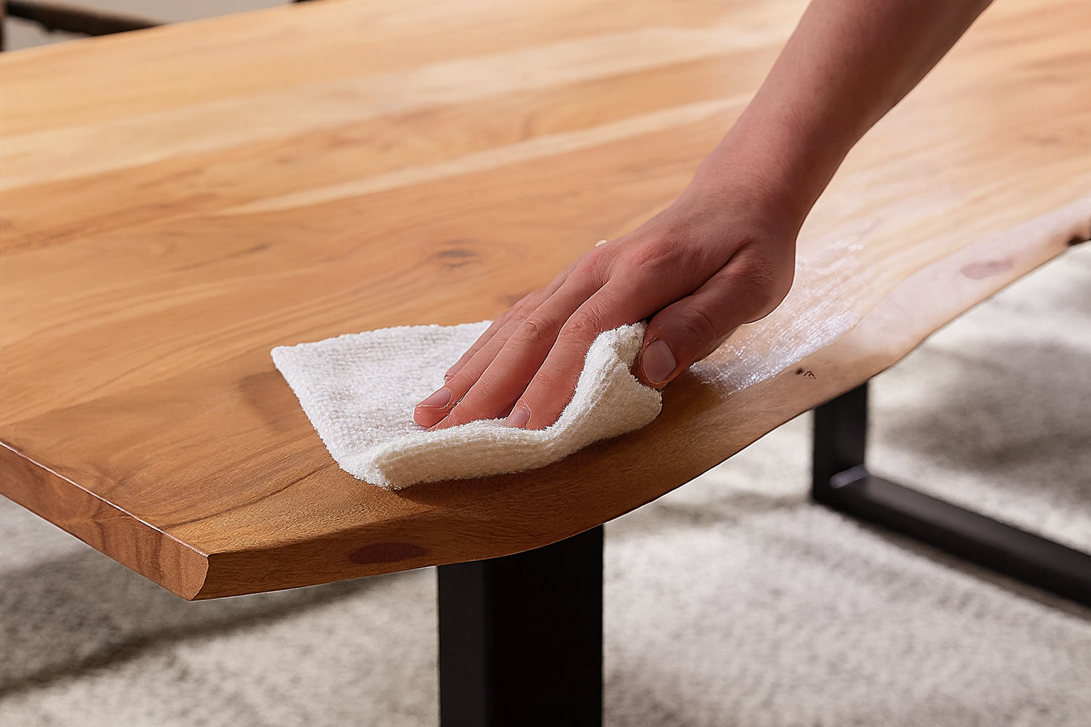 Staub, Schmutz und Fingerabdrücke können die Holzoberfläche auf Dauer beschädigen. Eine schonende Reinigung ist daher unerlässlich. Verwende am besten ein sauberes, leicht angefeuchtetes Baumwolltuch, um das Holz sanft abzuwischen. Achte darauf, dass der Lappen nur feucht, nicht nass ist – zu viel Wasser kann in das Holz eindringen und es aufquellen lassen.