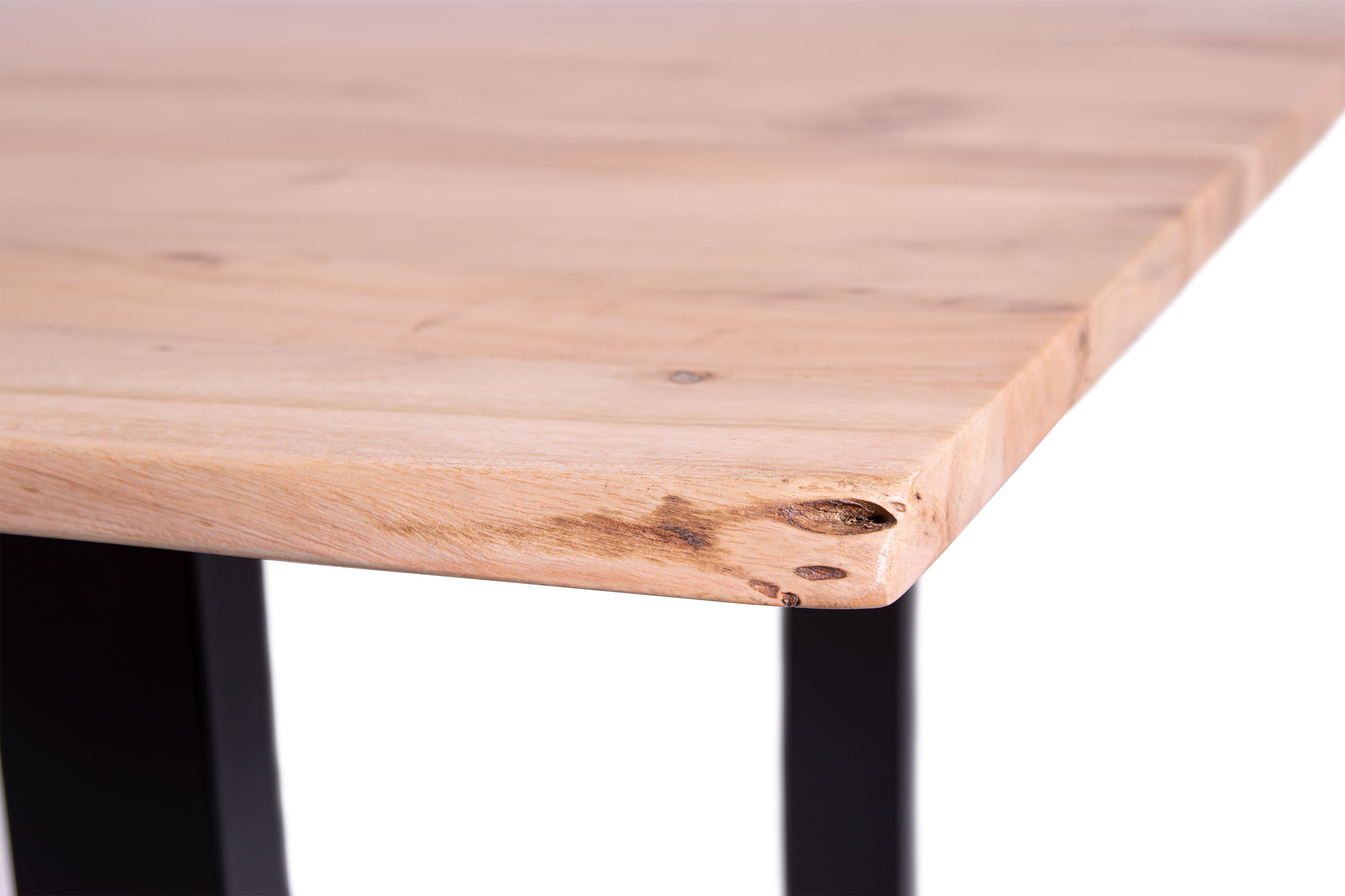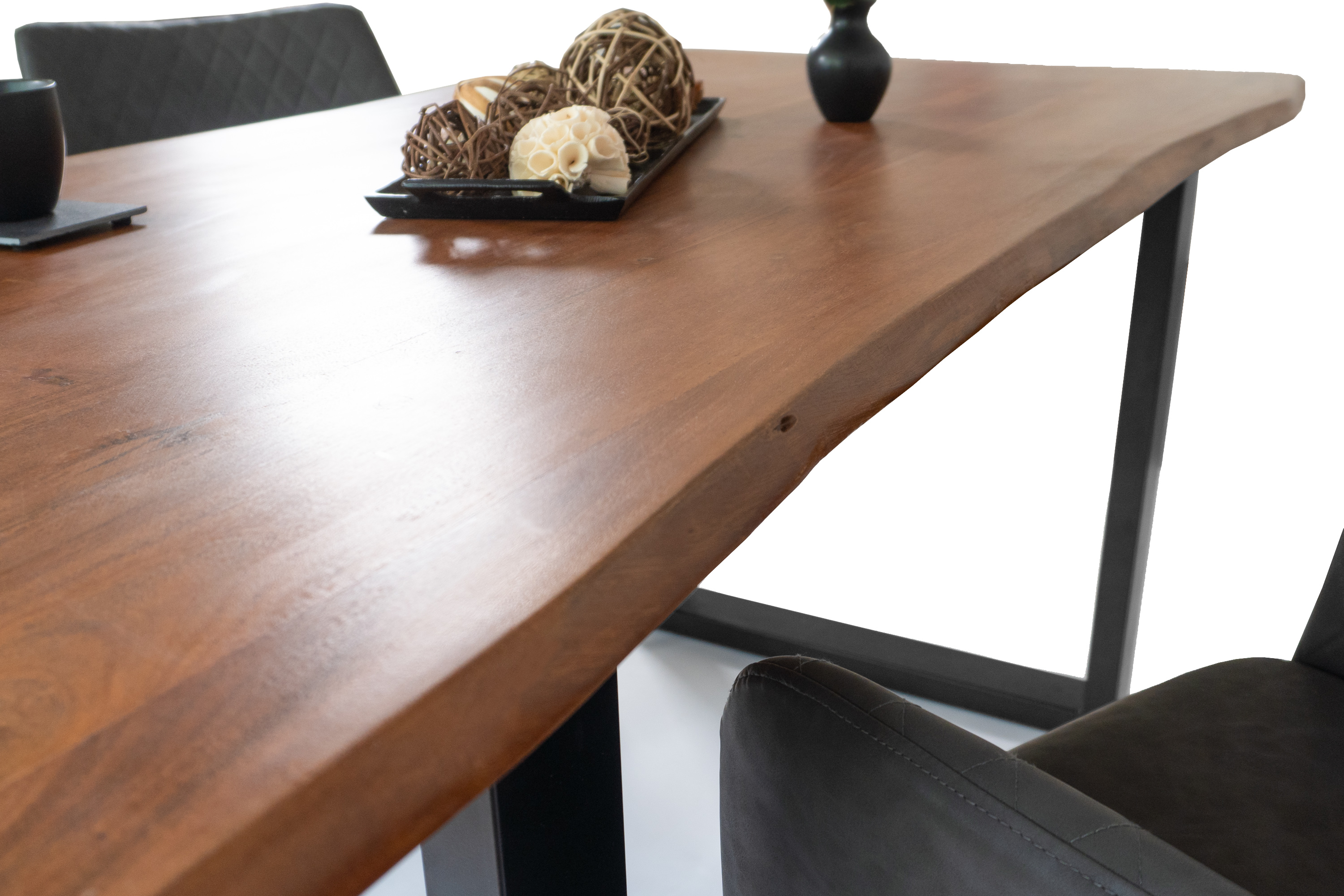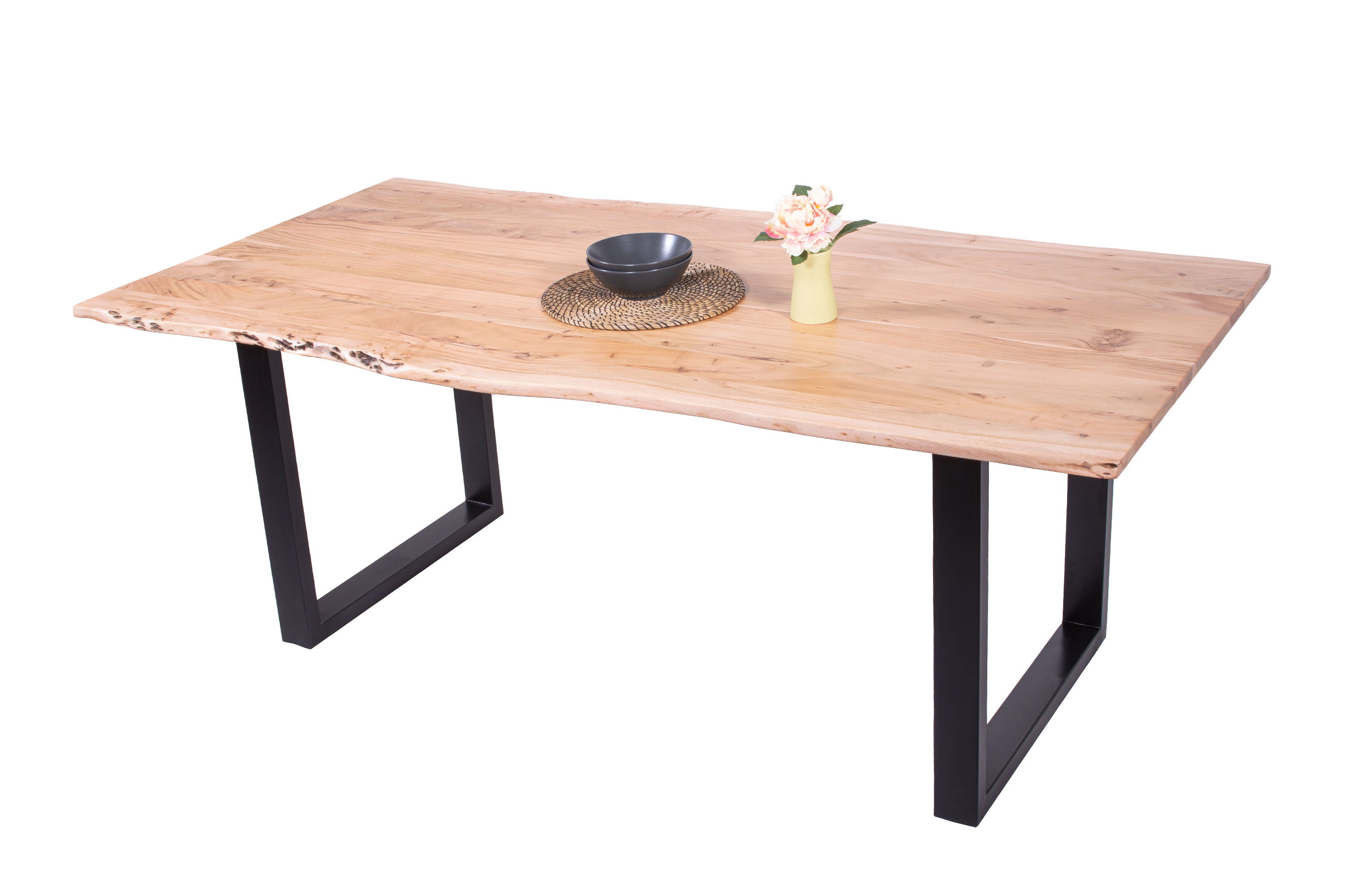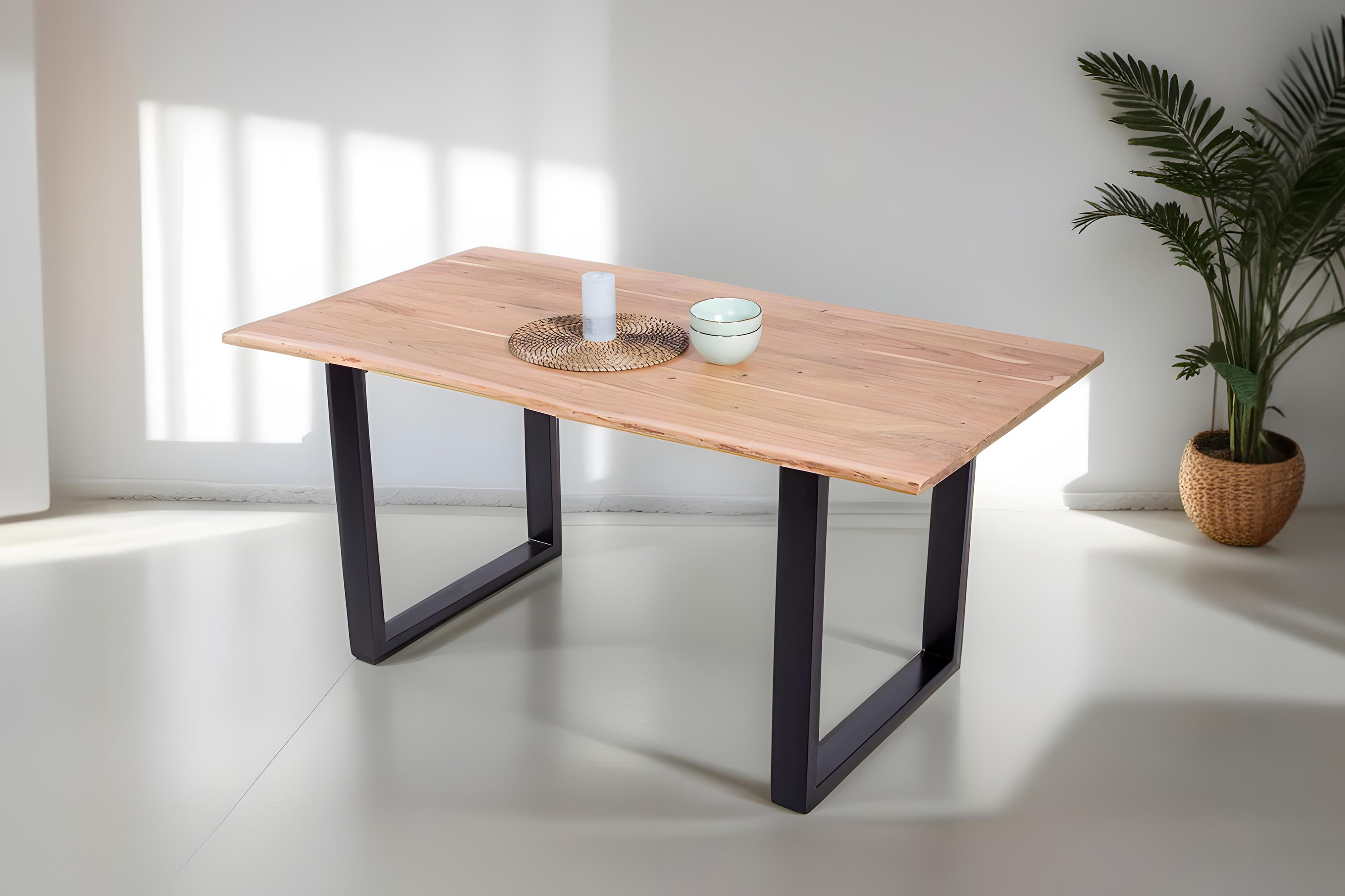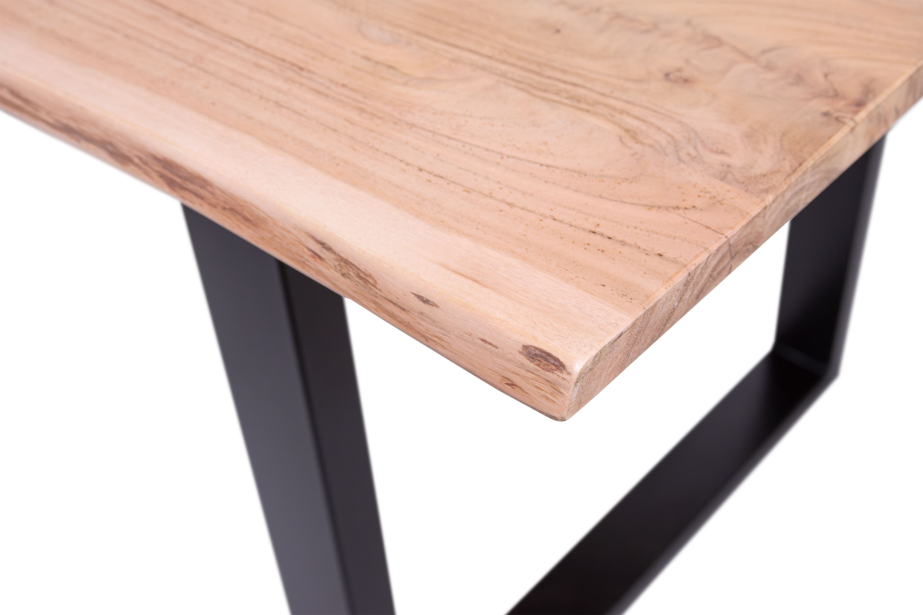 Die Tischkanten wurden direkt aus dem Baumstamm geschnitten und behalten ihre natürliche Form bei, was jeden Baumkantentisch zu einem Unikat macht. Die Metallbeine sind ein besonderes Highlight, denn das elegante U-Gestell aus hochwertigem Metall setzt gezielte Akzente im Industrial-Design. Durch diese Kombination wirkt der Tisch sowohl rustikal als auch modern und fügt sich nahtlos in jedes Ambiente ein.