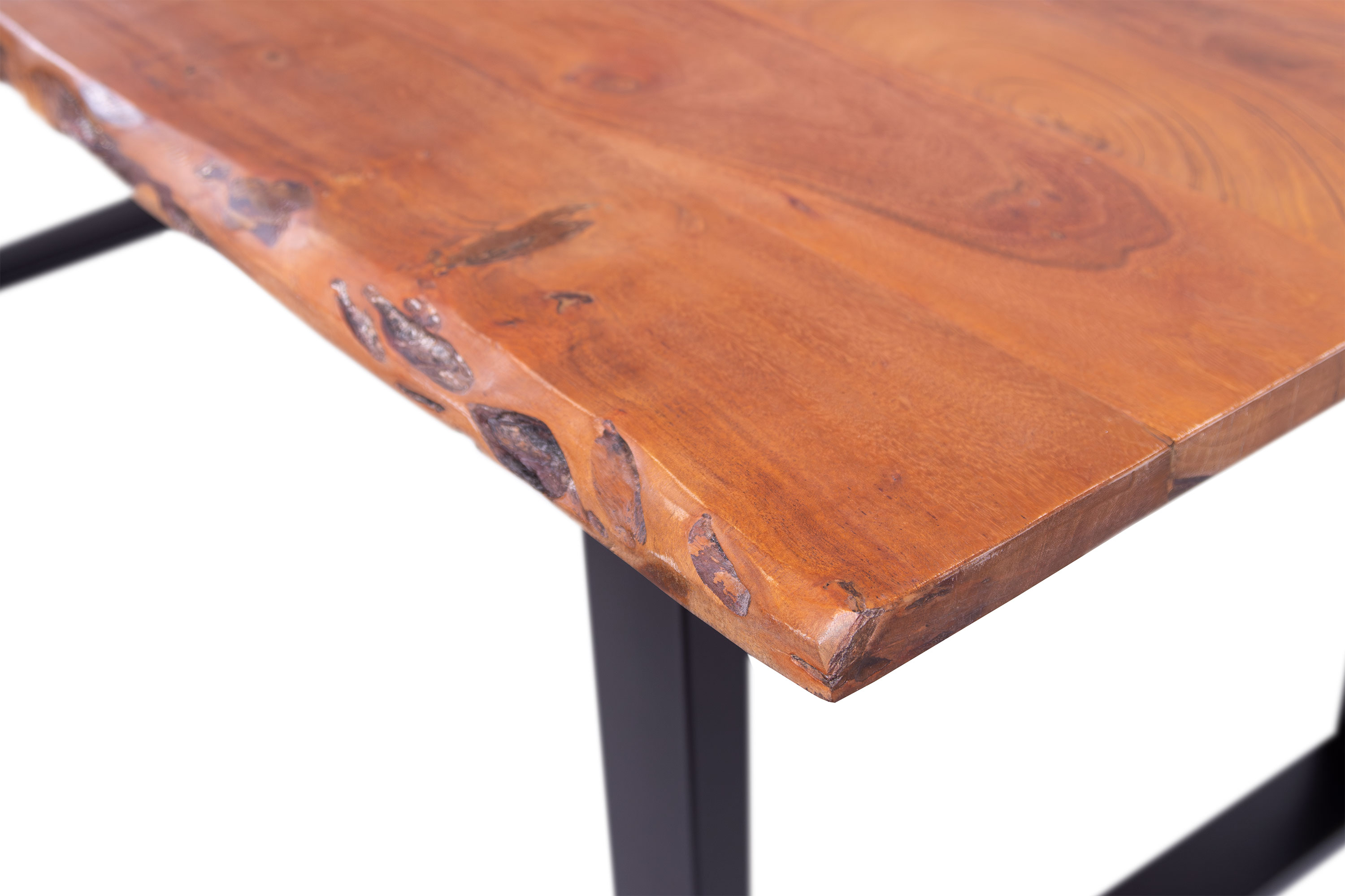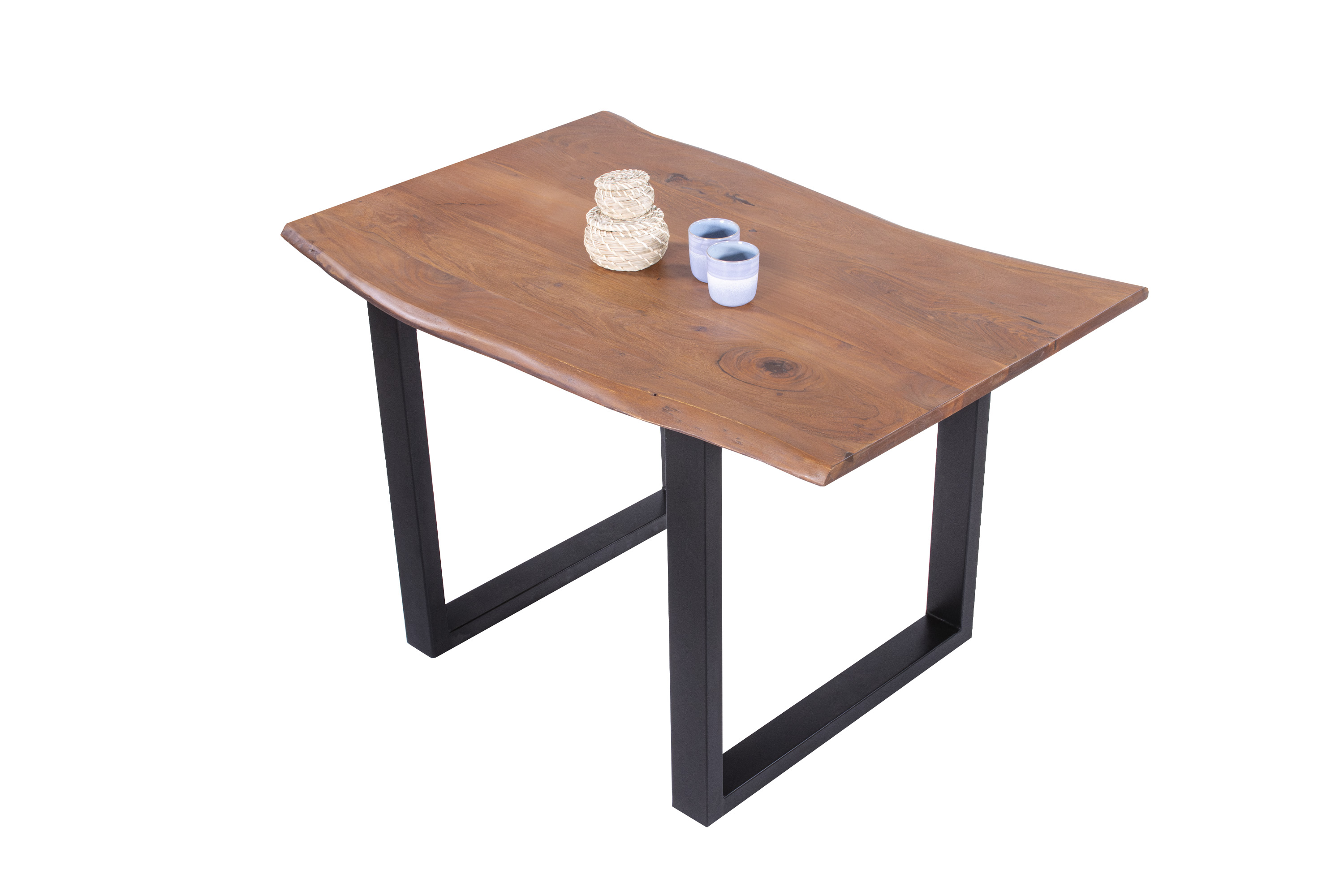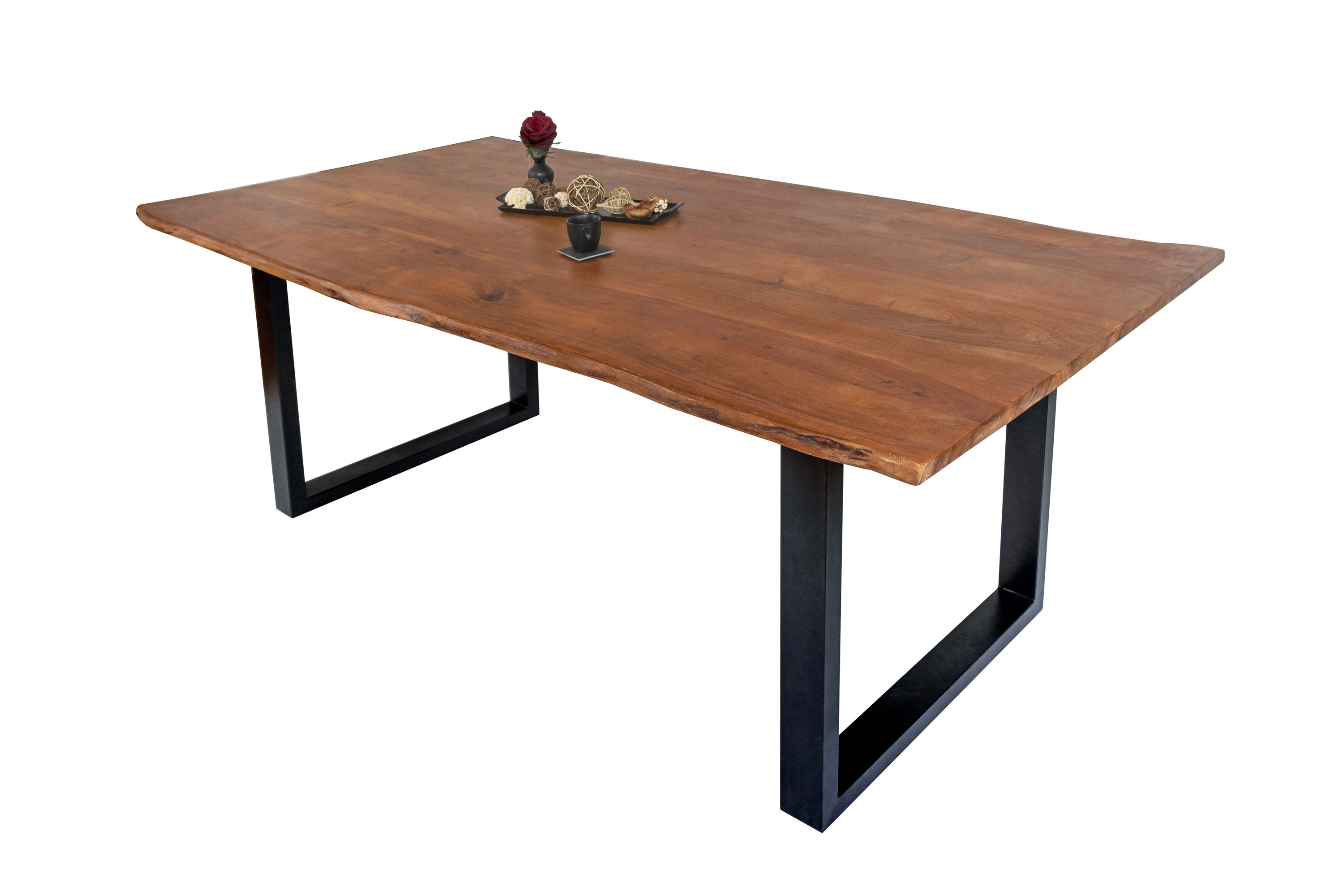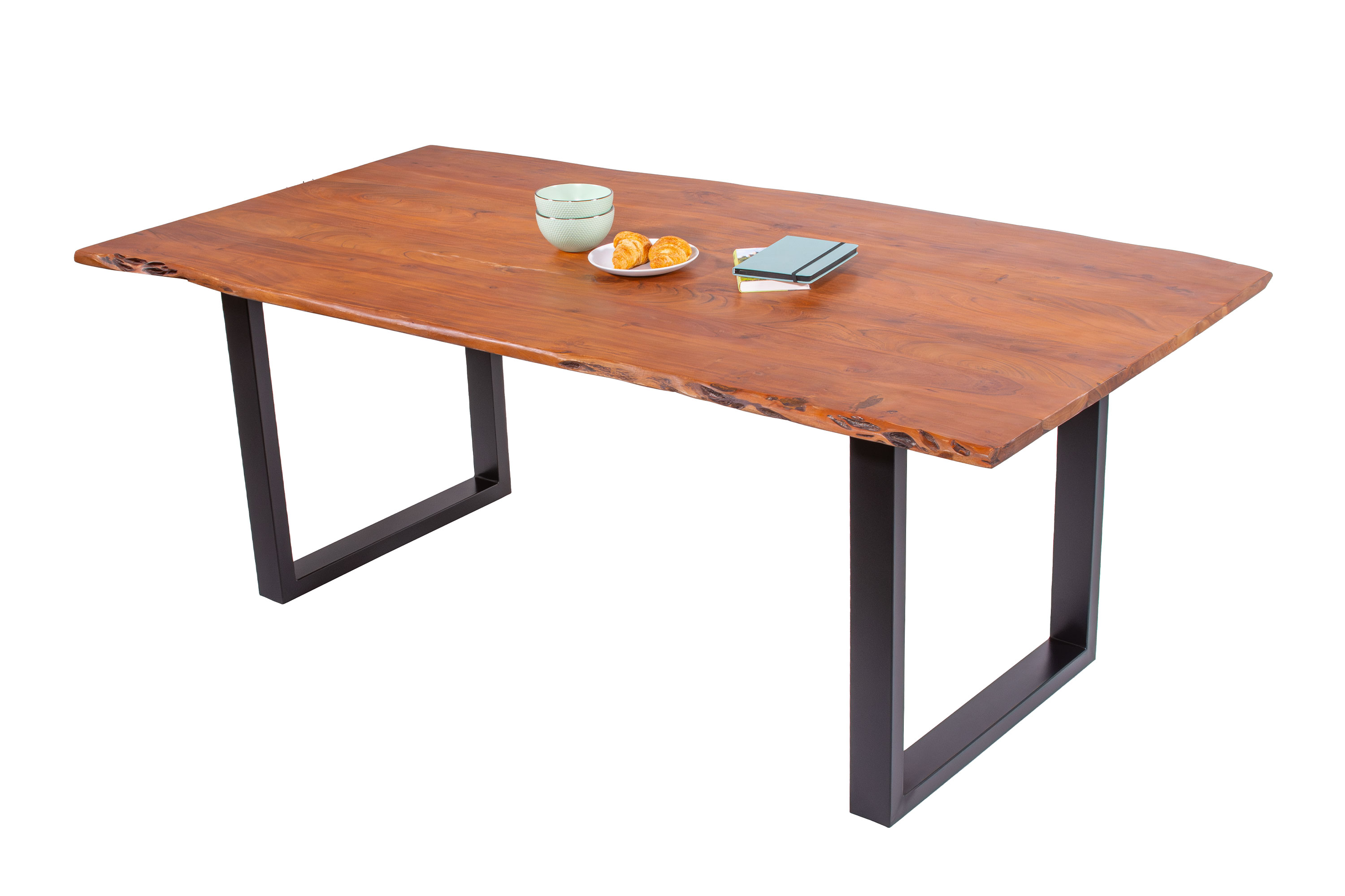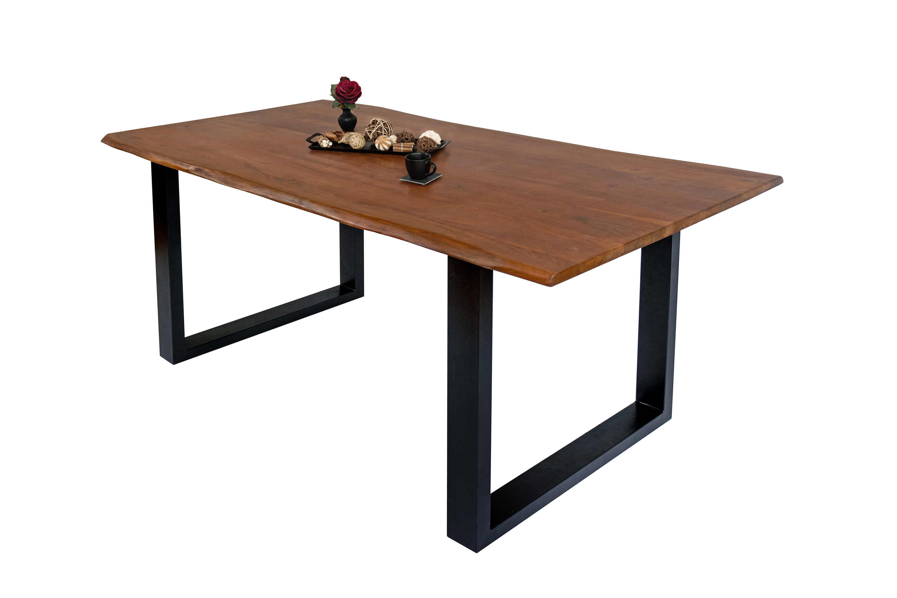 Die Tischkanten wurden direkt aus dem Baumstamm geschnitten und behalten ihre natürliche Form bei, was jeden Baumkantentisch zu einem Unikat macht. Die Metallbeine sind ein besonderes Highlight, denn das elegante U-Gestell aus hochwertigem Metall setzt gezielte Akzente im Industrial-Design. Durch diese Kombination wirkt der Tisch sowohl rustikal als auch modern und fügt sich nahtlos in jedes Ambiente ein.