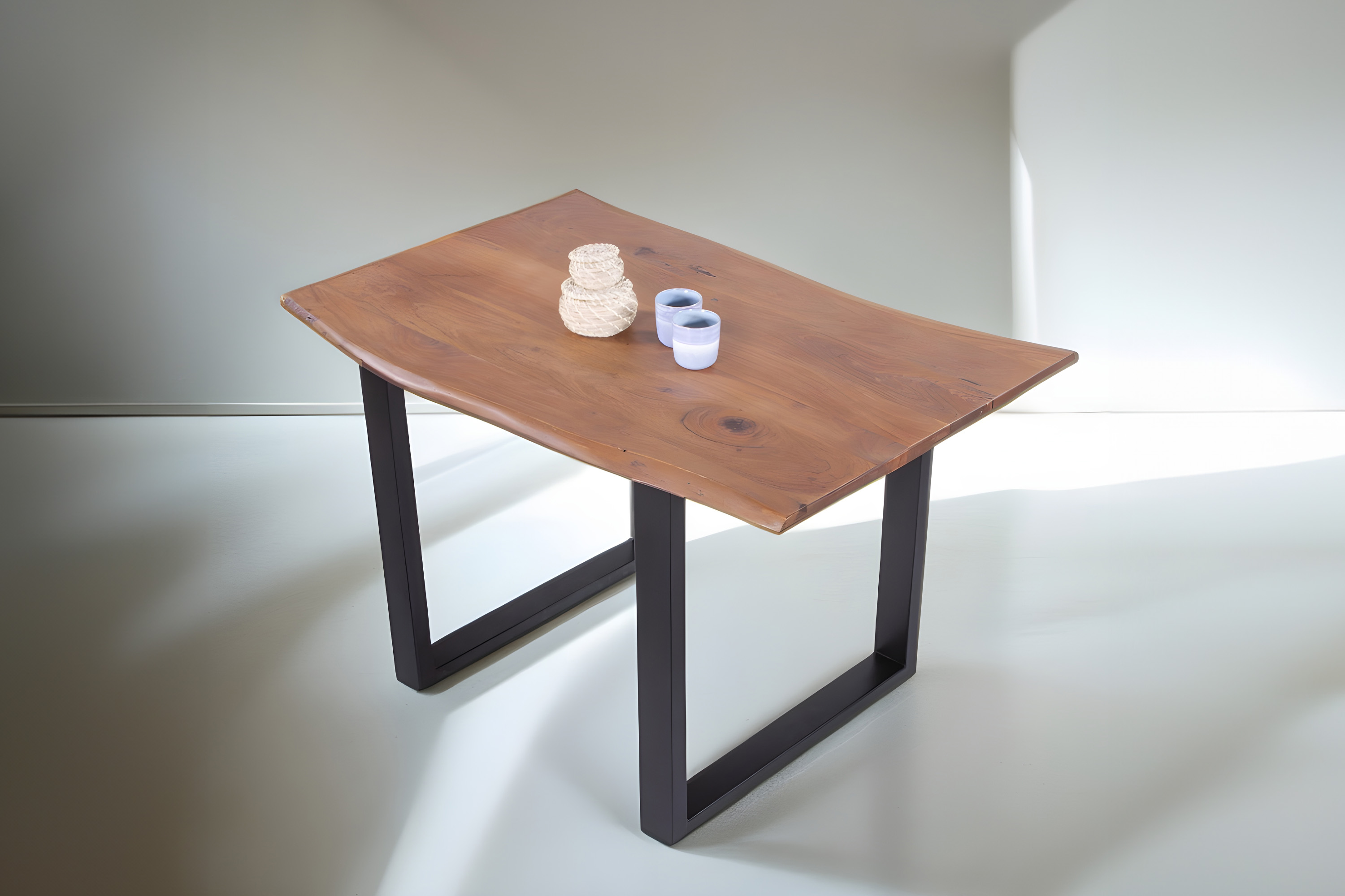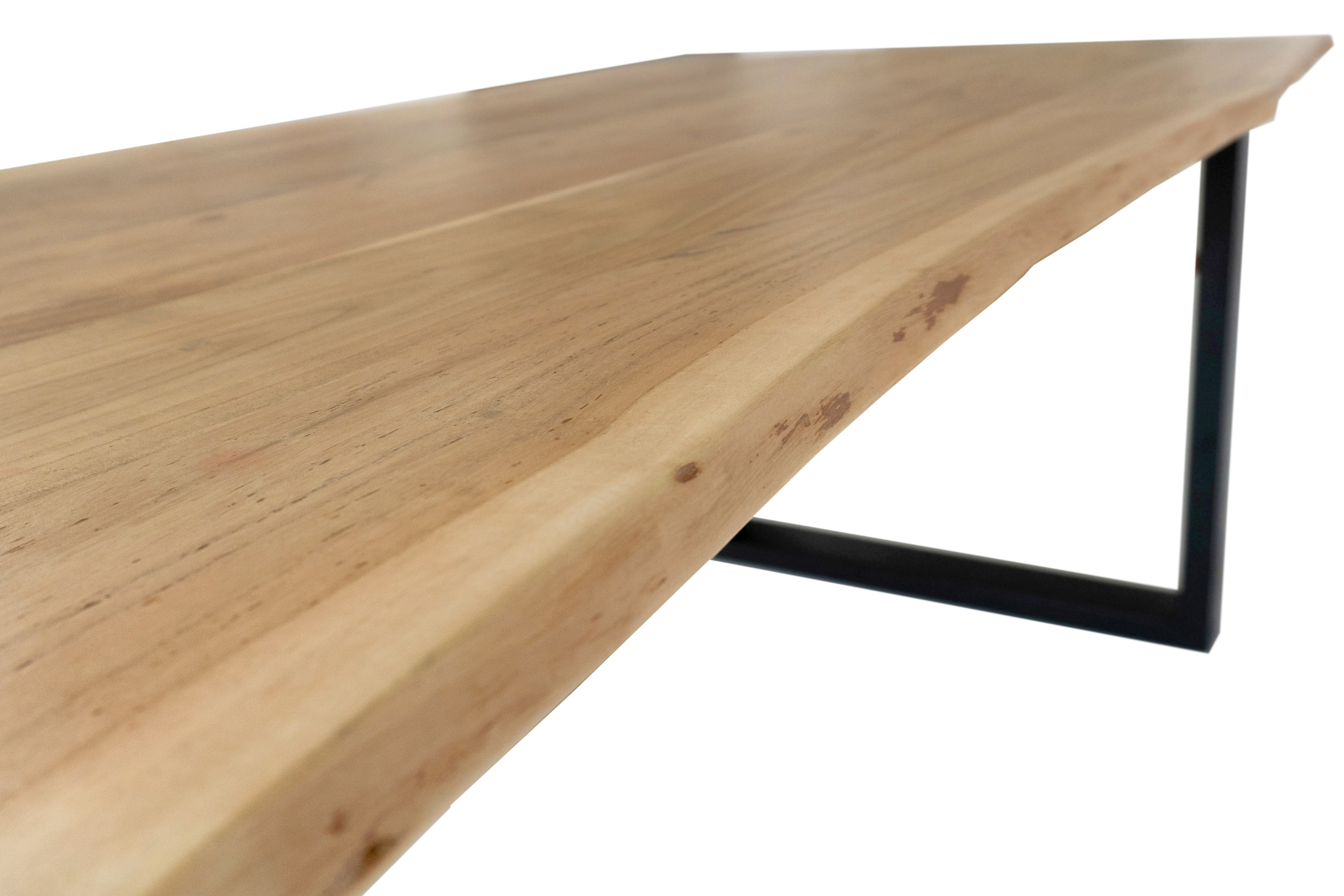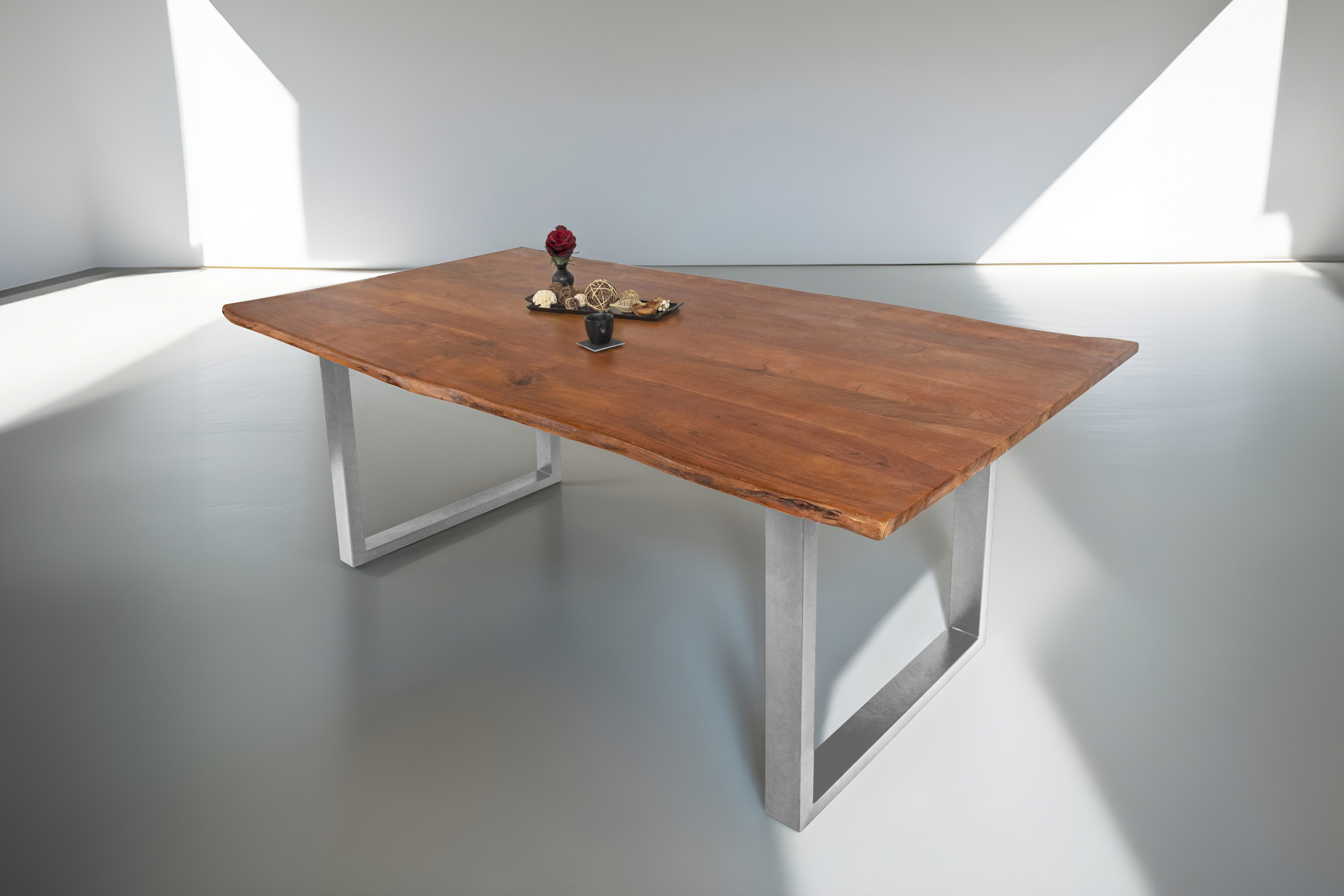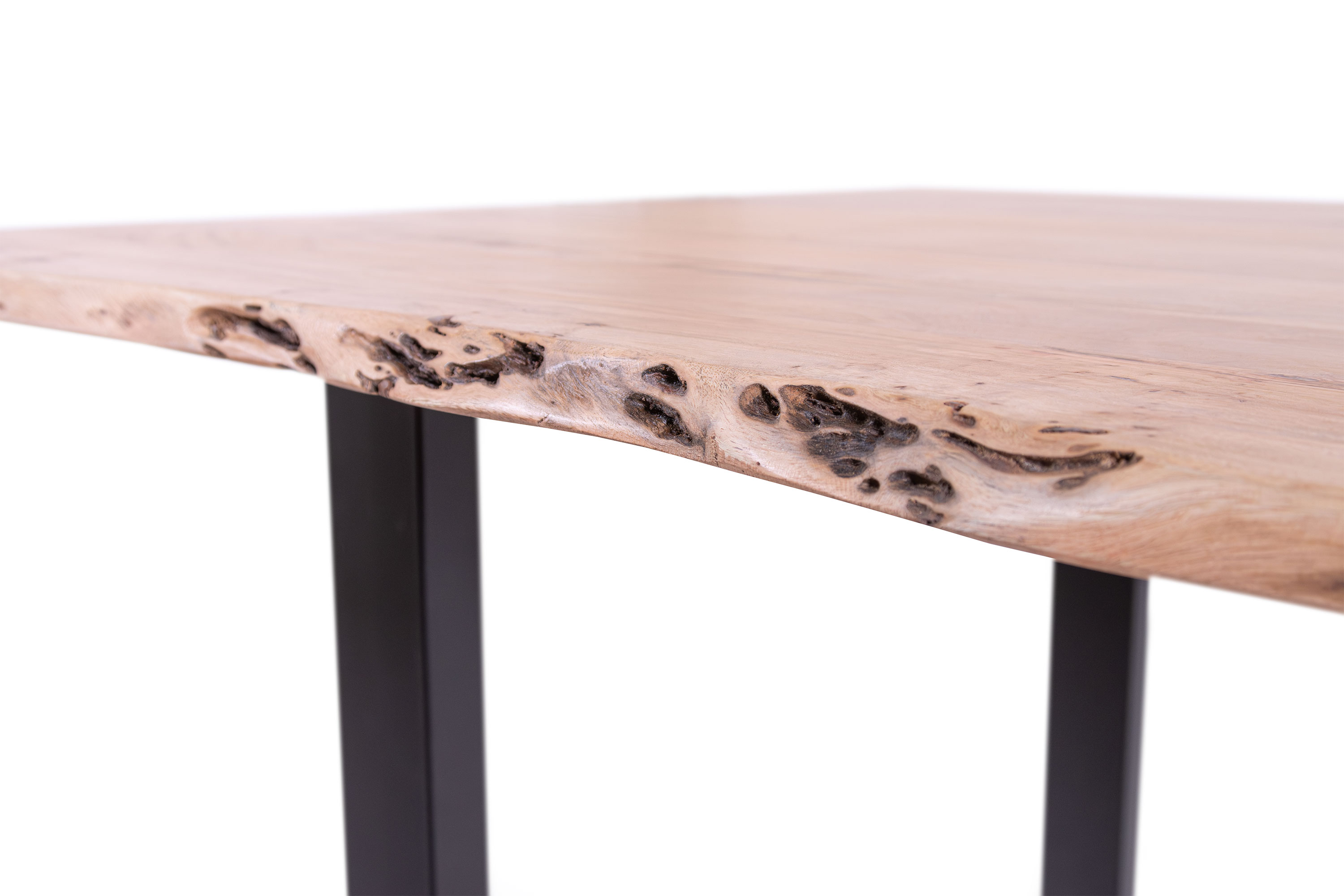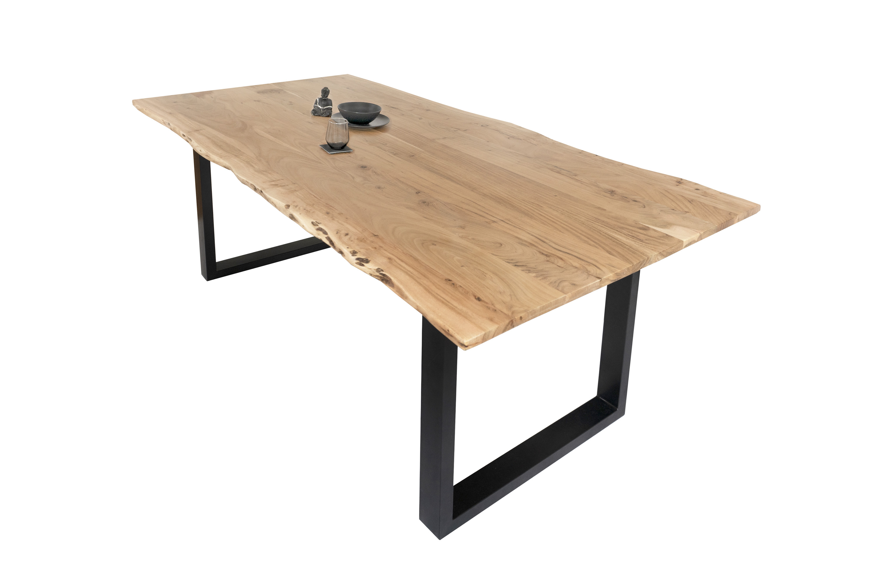 Die Tischkanten wurden direkt aus dem Baumstamm geschnitten und behalten ihre natürliche Form bei, was jeden Baumkantentisch zu einem Unikat macht. Die Metallbeine sind ein besonderes Highlight, denn das elegante U-Gestell aus hochwertigem Metall setzt gezielte Akzente im Industrial-Design. Durch diese Kombination wirkt der Tisch sowohl rustikal als auch modern und fügt sich nahtlos in jedes Ambiente ein.