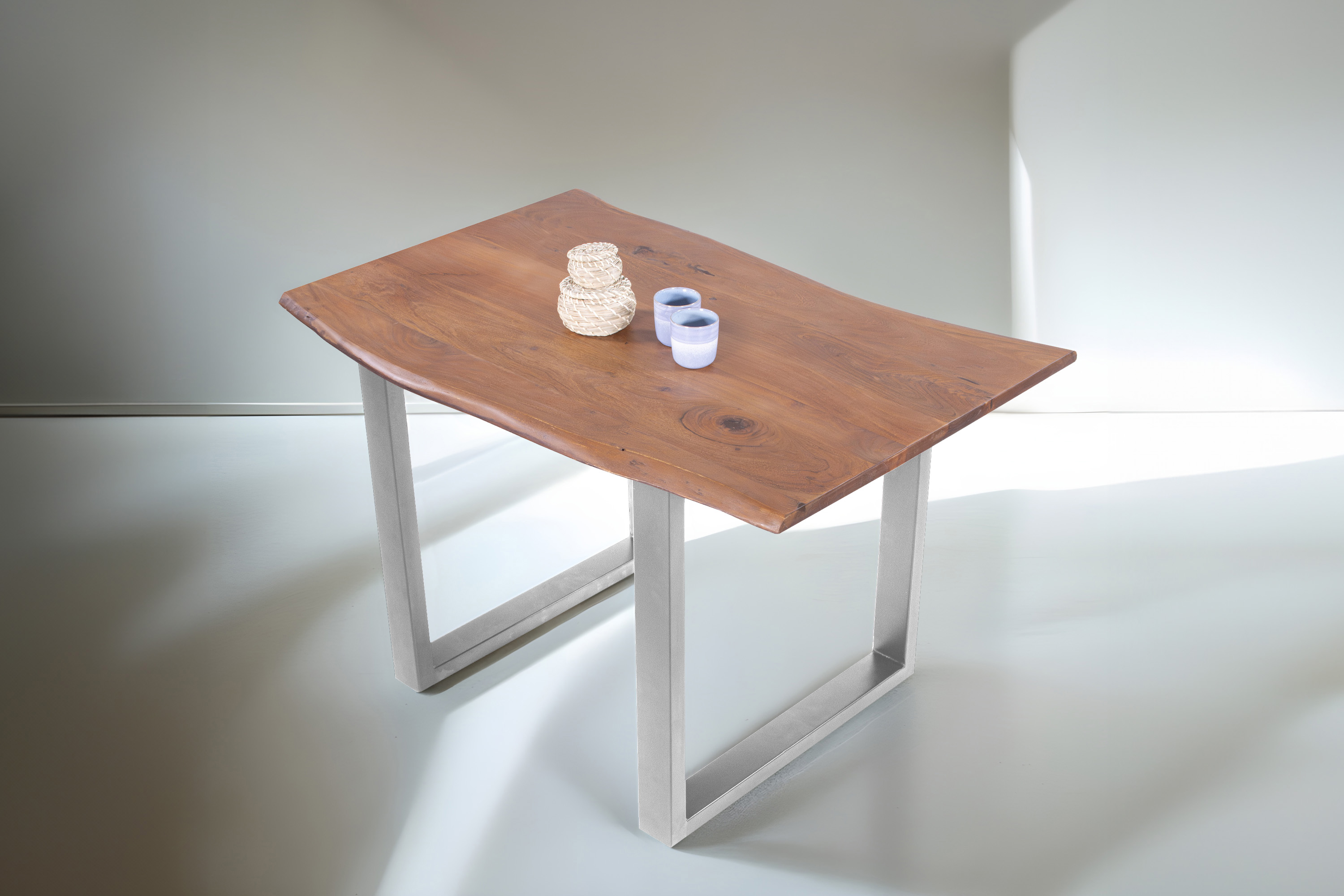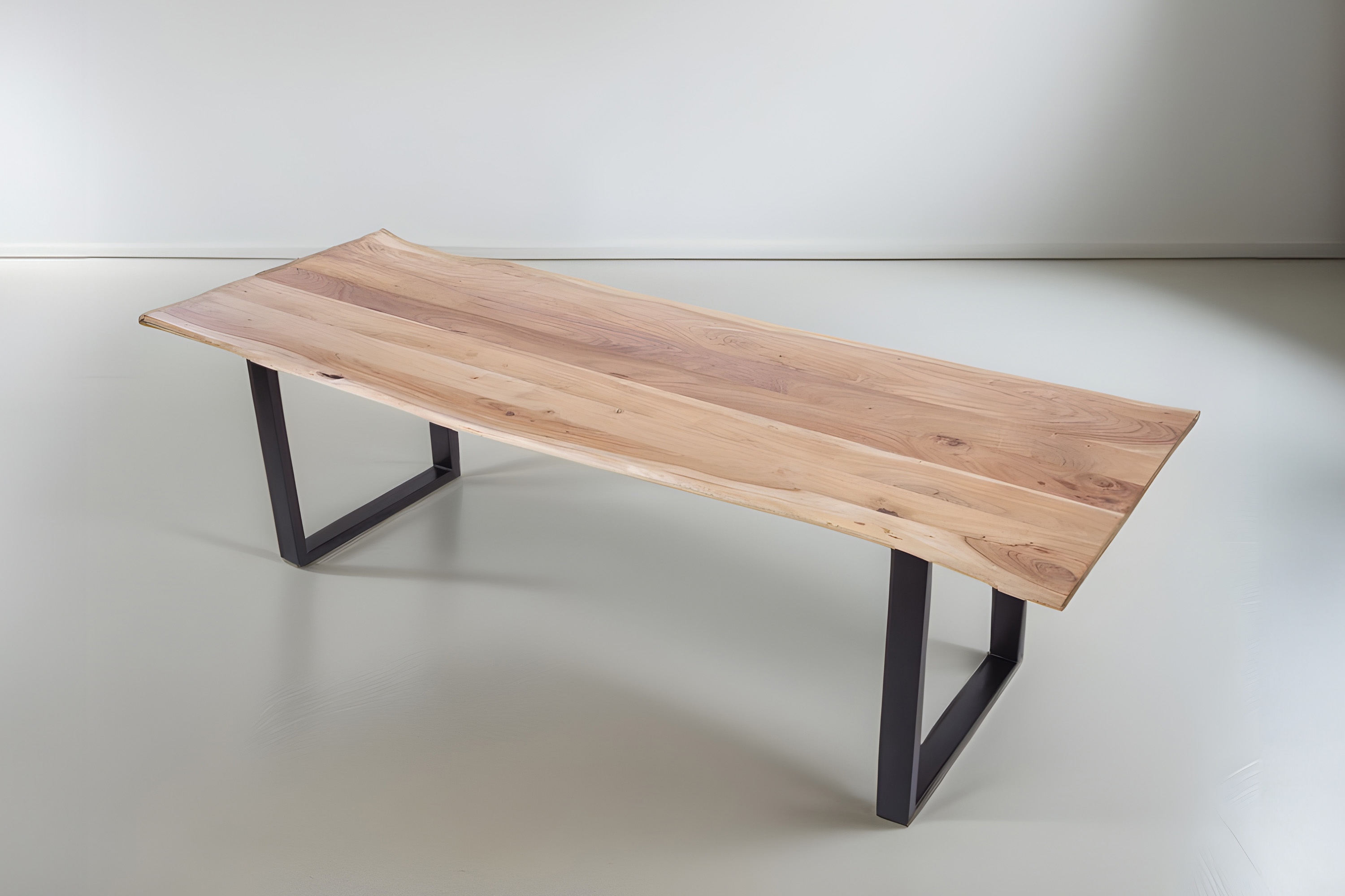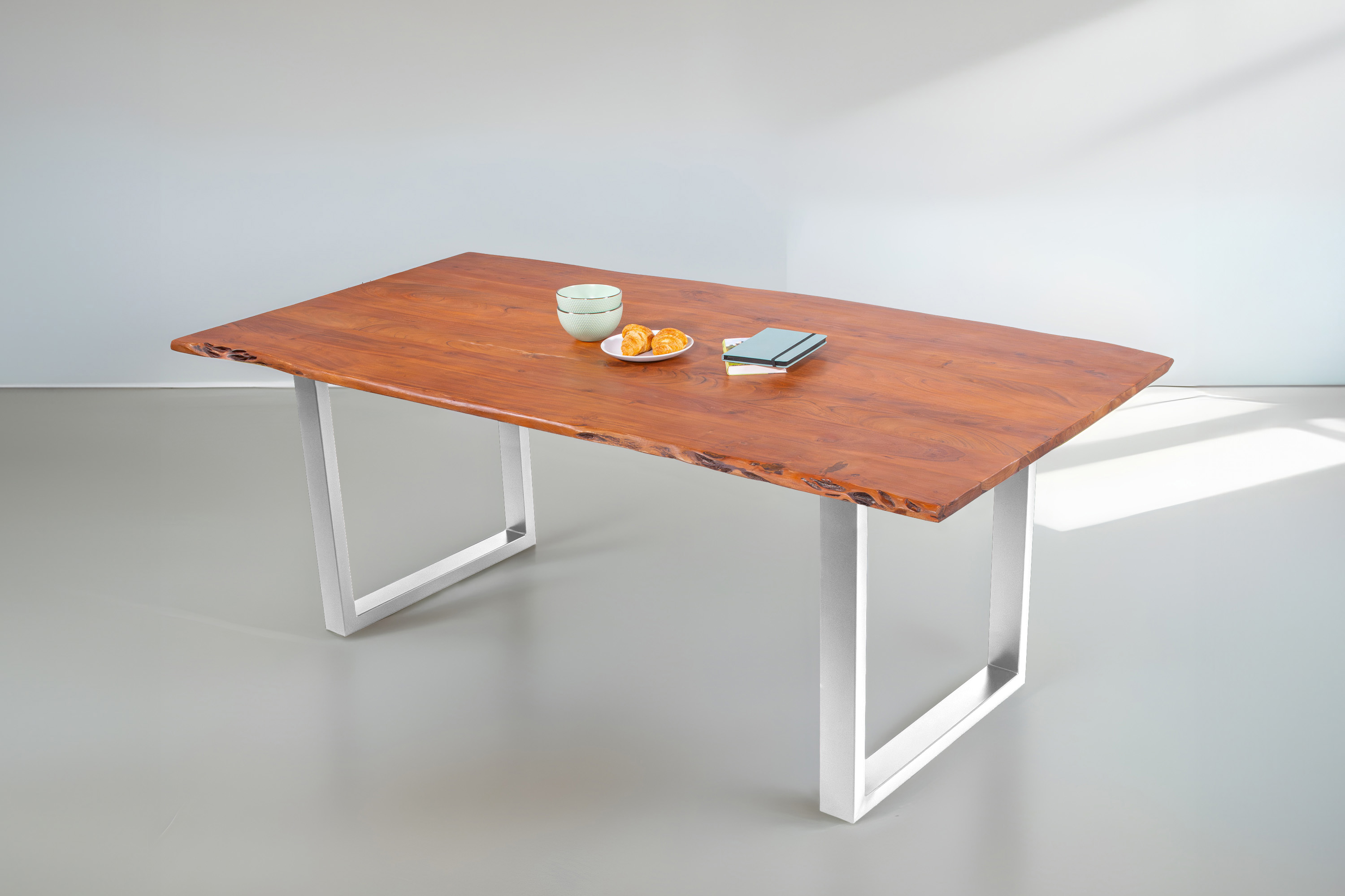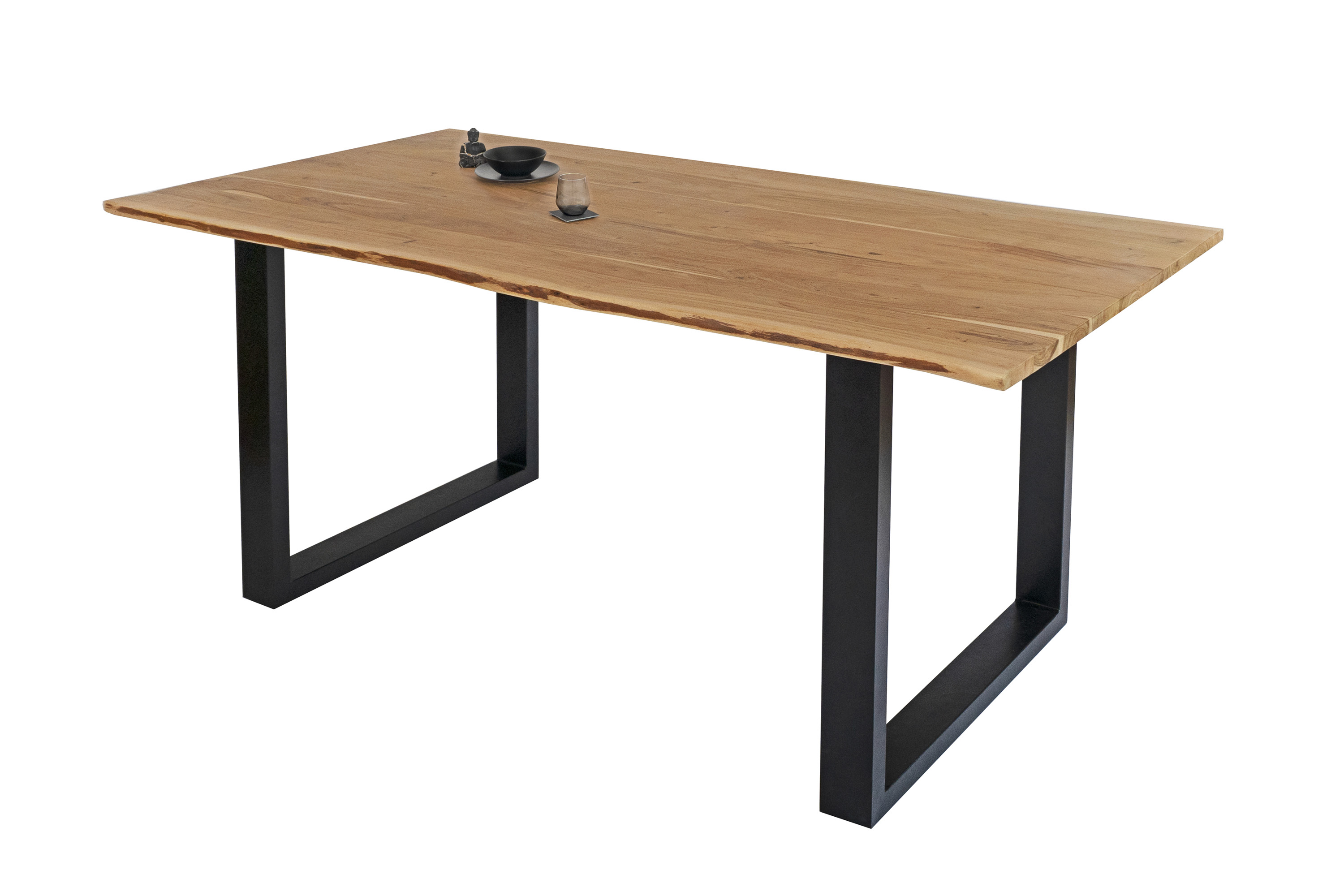 Die Tischkanten wurden direkt aus dem Baumstamm geschnitten und behalten ihre natürliche Form bei, was jeden Baumkantentisch zu einem Unikat macht. Die Metallbeine sind ein besonderes Highlight, denn das elegante U-Gestell aus hochwertigem Metall setzt gezielte Akzente im Industrial-Design. Durch diese Kombination wirkt der Tisch sowohl rustikal als auch modern und fügt sich nahtlos in jedes Ambiente ein.