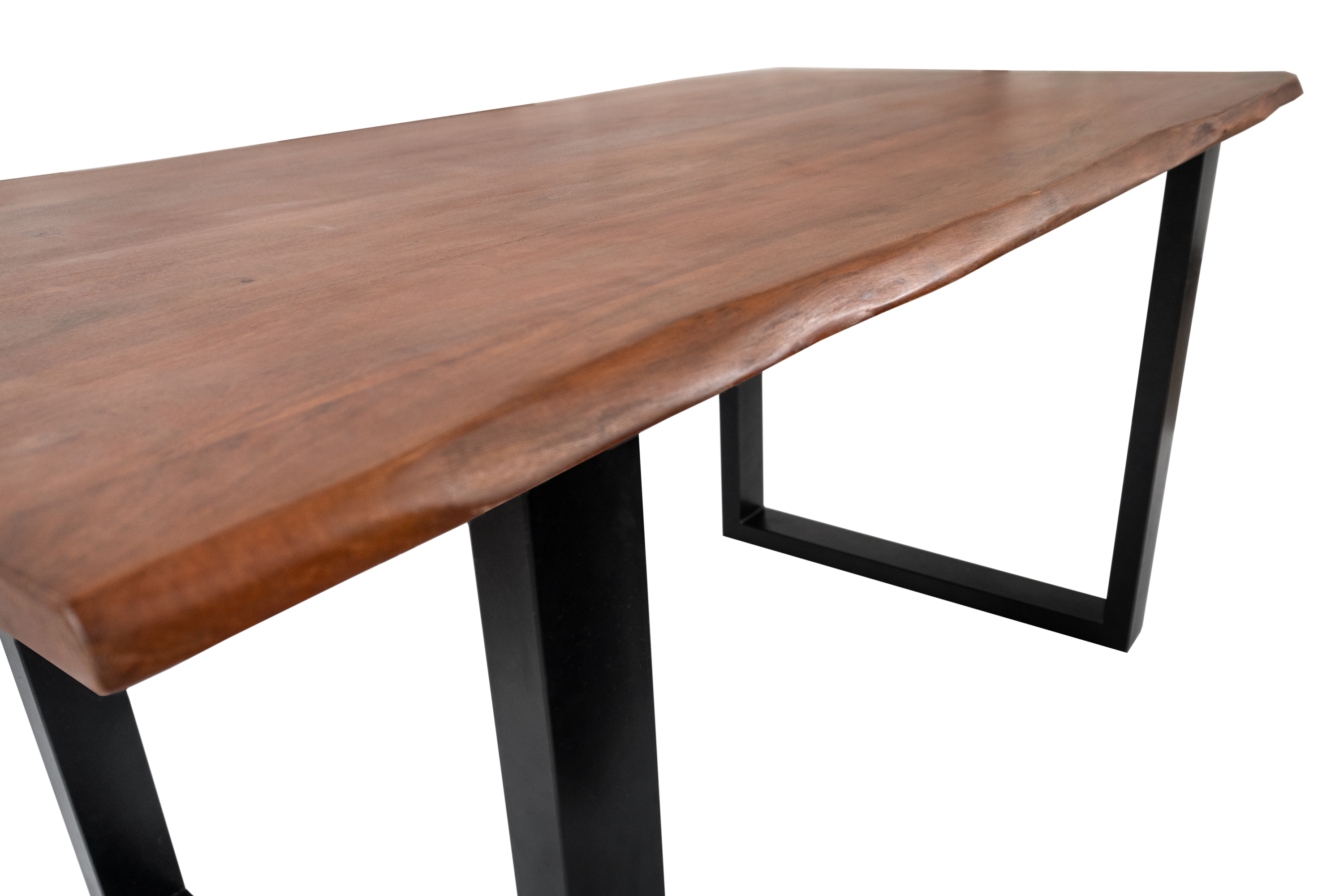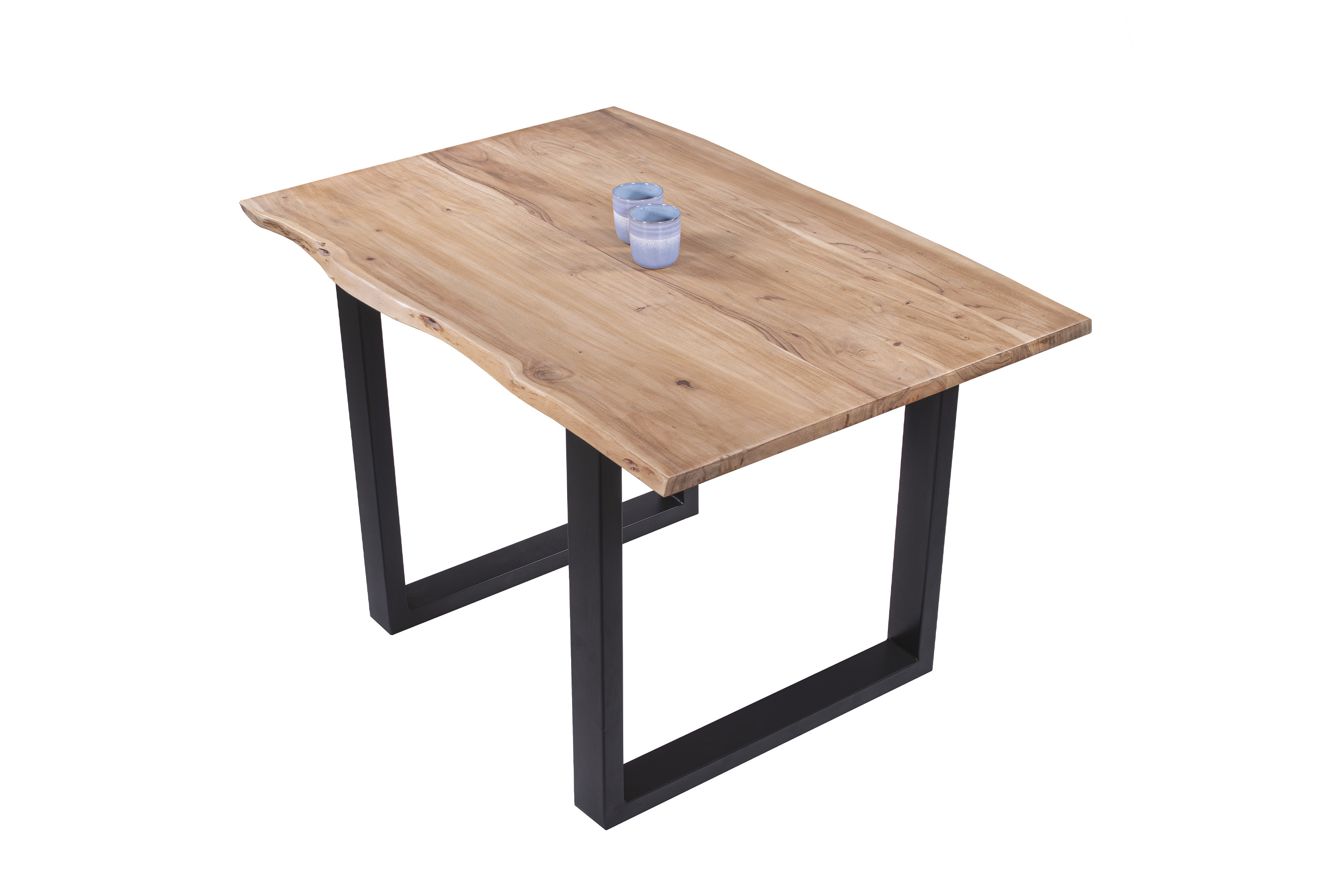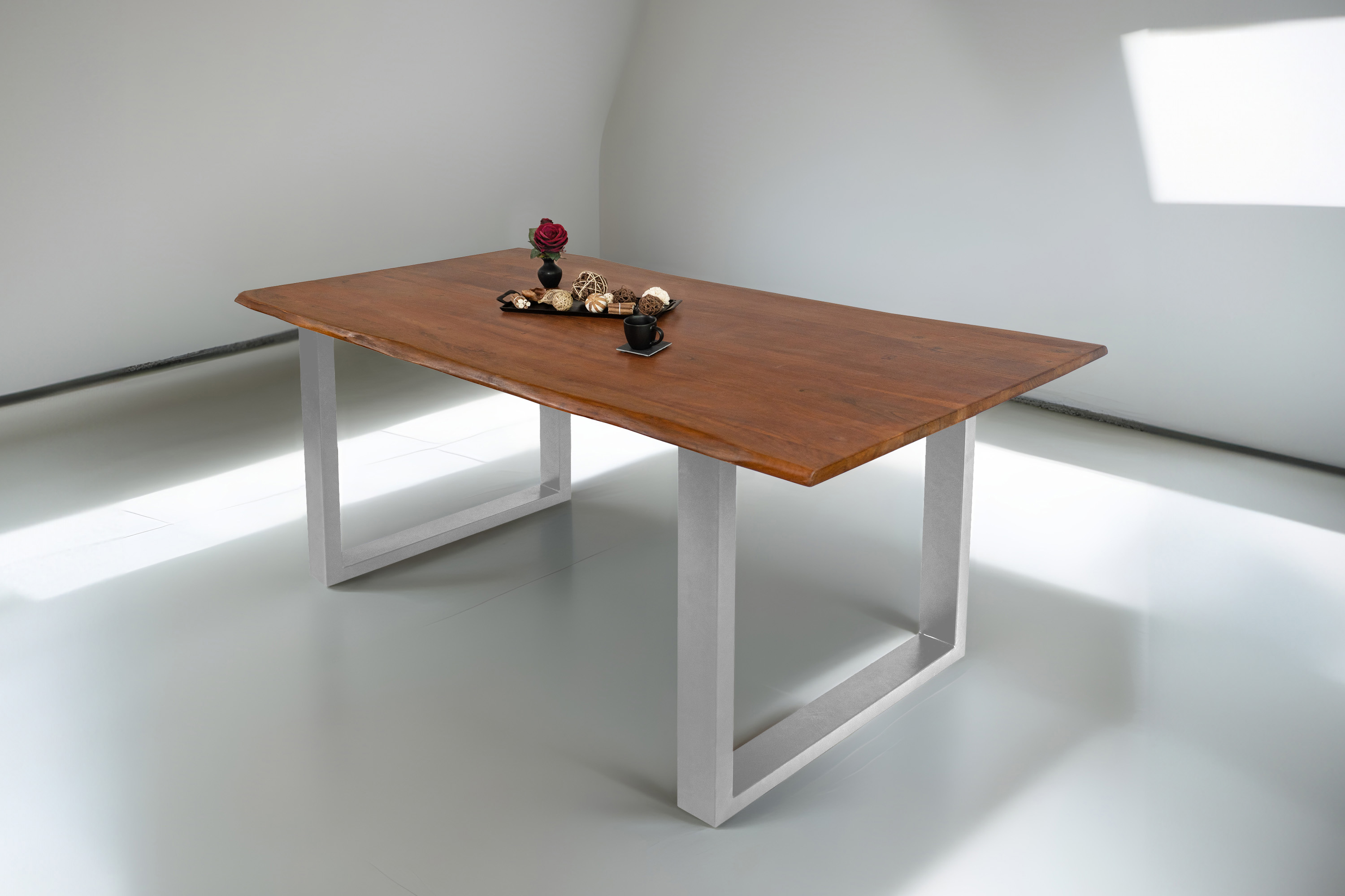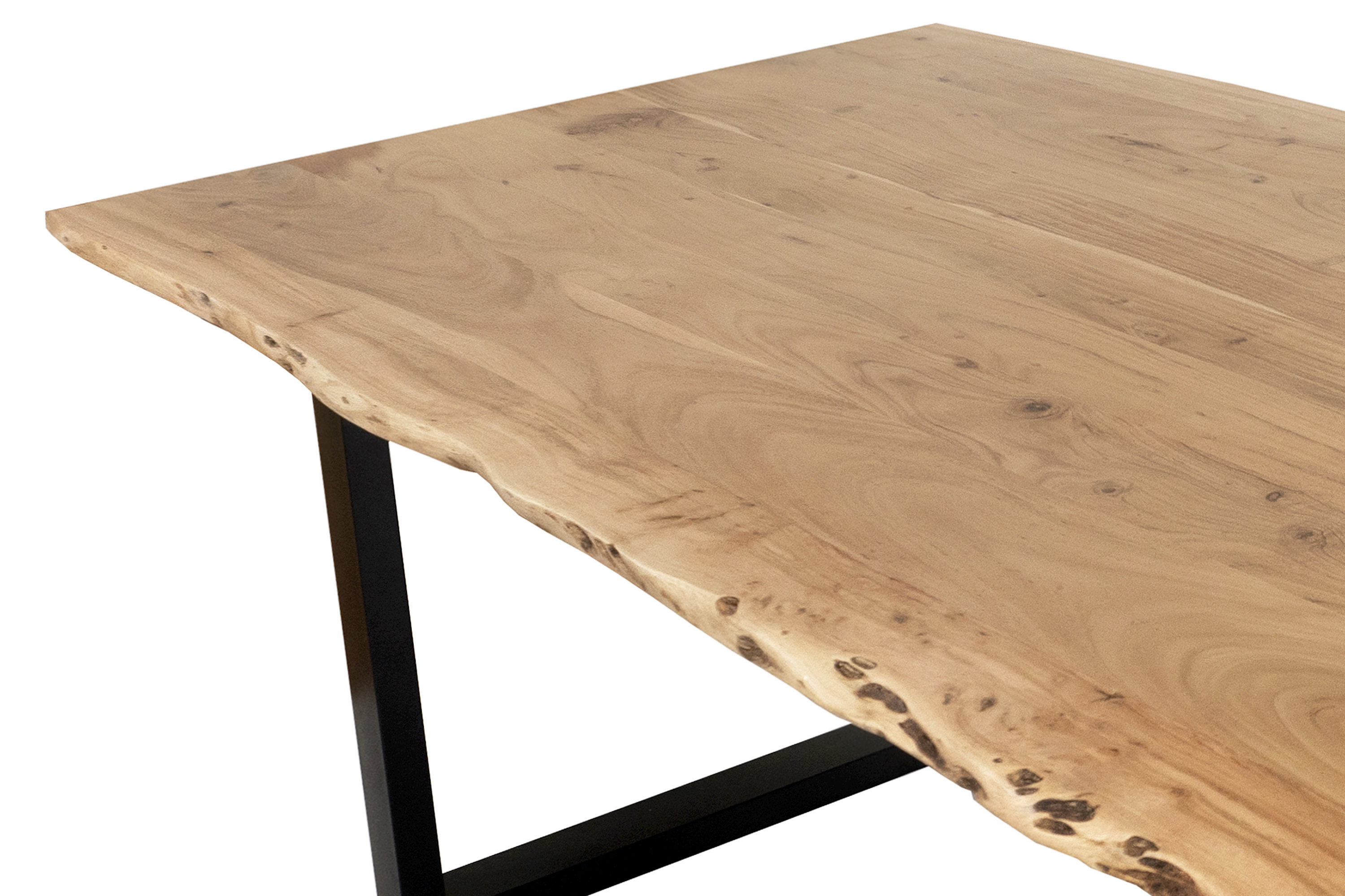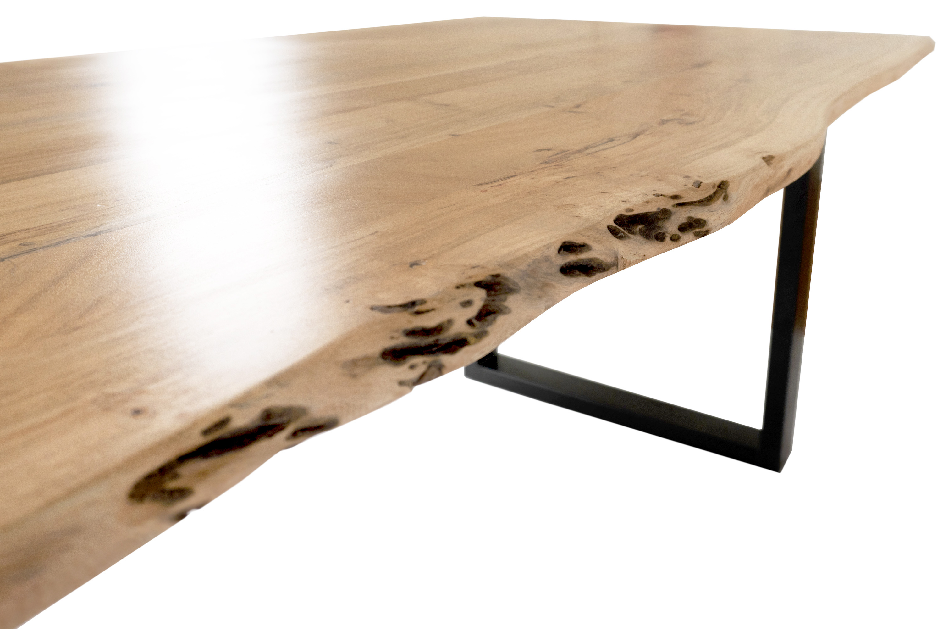 Die Tischkanten wurden direkt aus dem Baumstamm geschnitten und behalten ihre natürliche Form bei, was jeden Baumkantentisch zu einem Unikat macht. Die Metallbeine sind ein besonderes Highlight, denn das elegante U-Gestell aus hochwertigem Metall setzt gezielte Akzente im Industrial-Design. Durch diese Kombination wirkt der Tisch sowohl rustikal als auch modern und fügt sich nahtlos in jedes Ambiente ein.