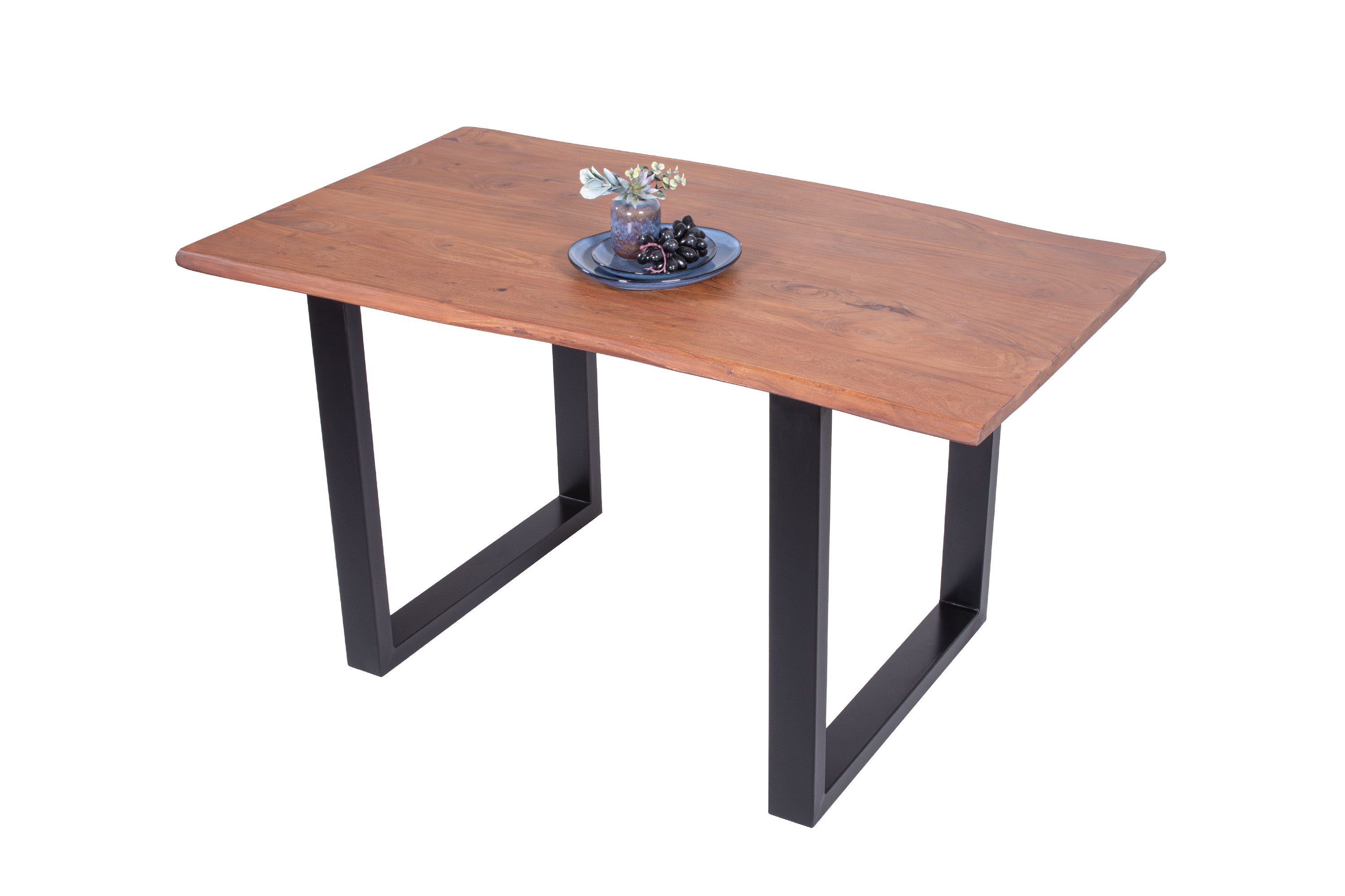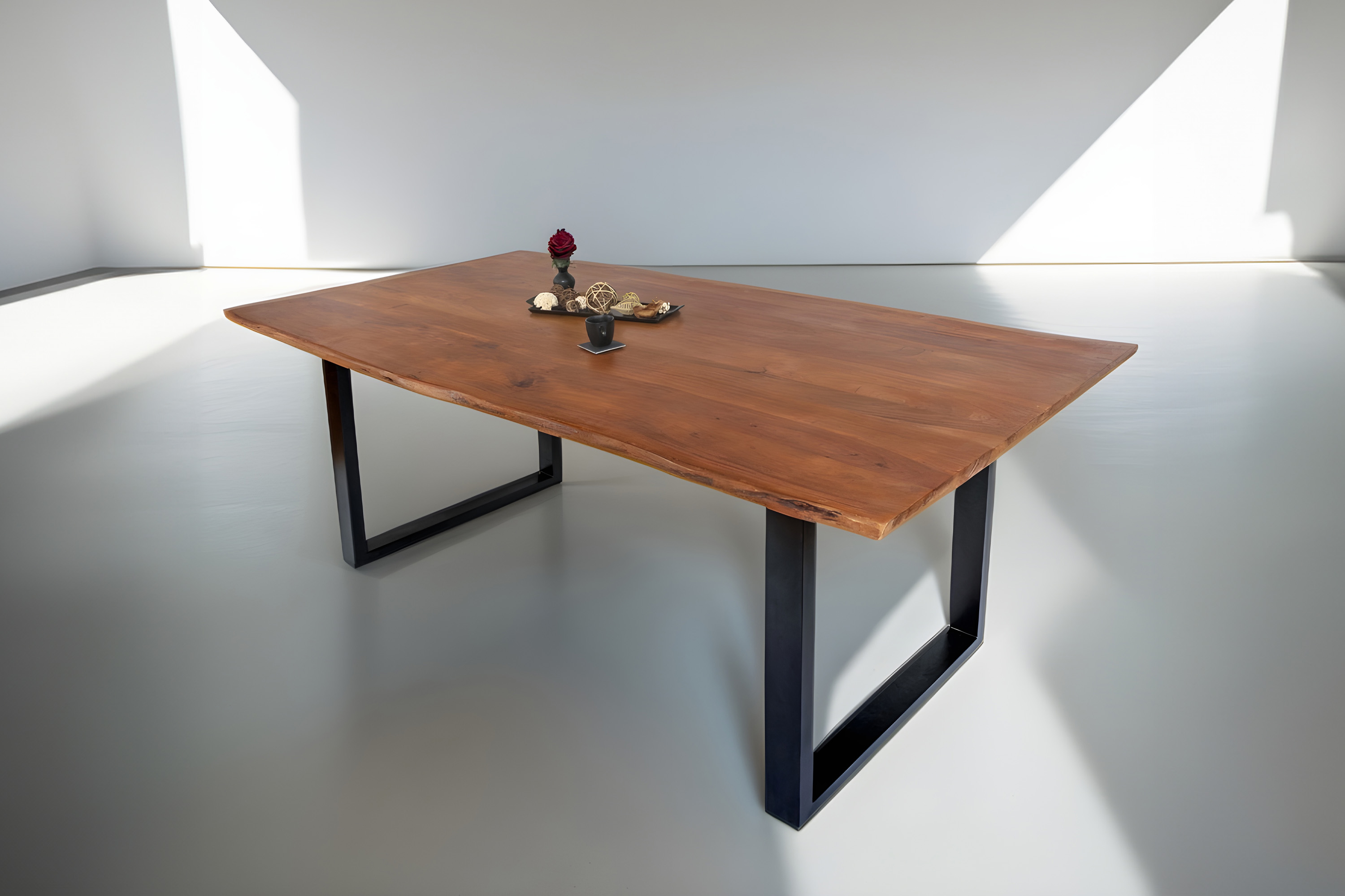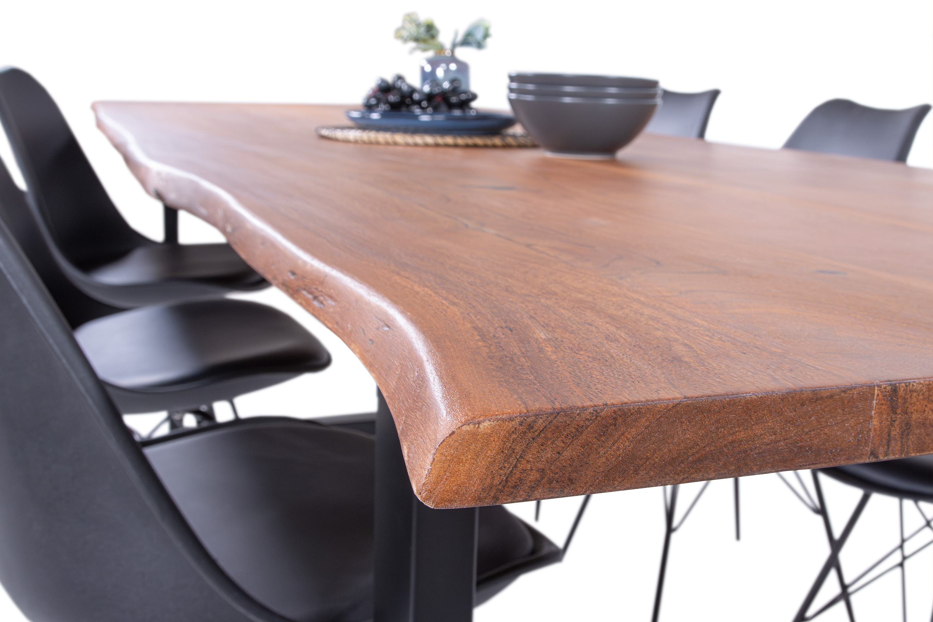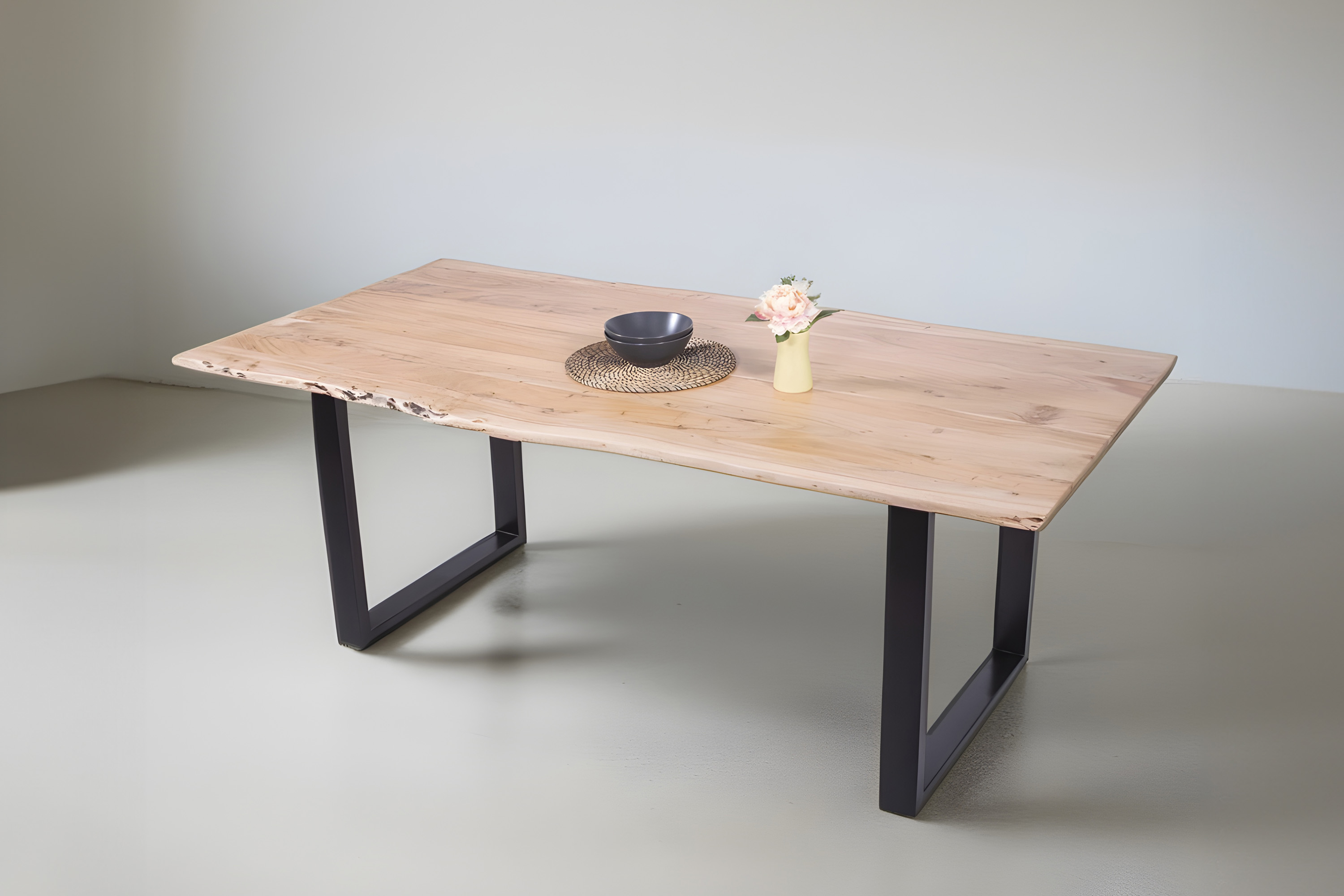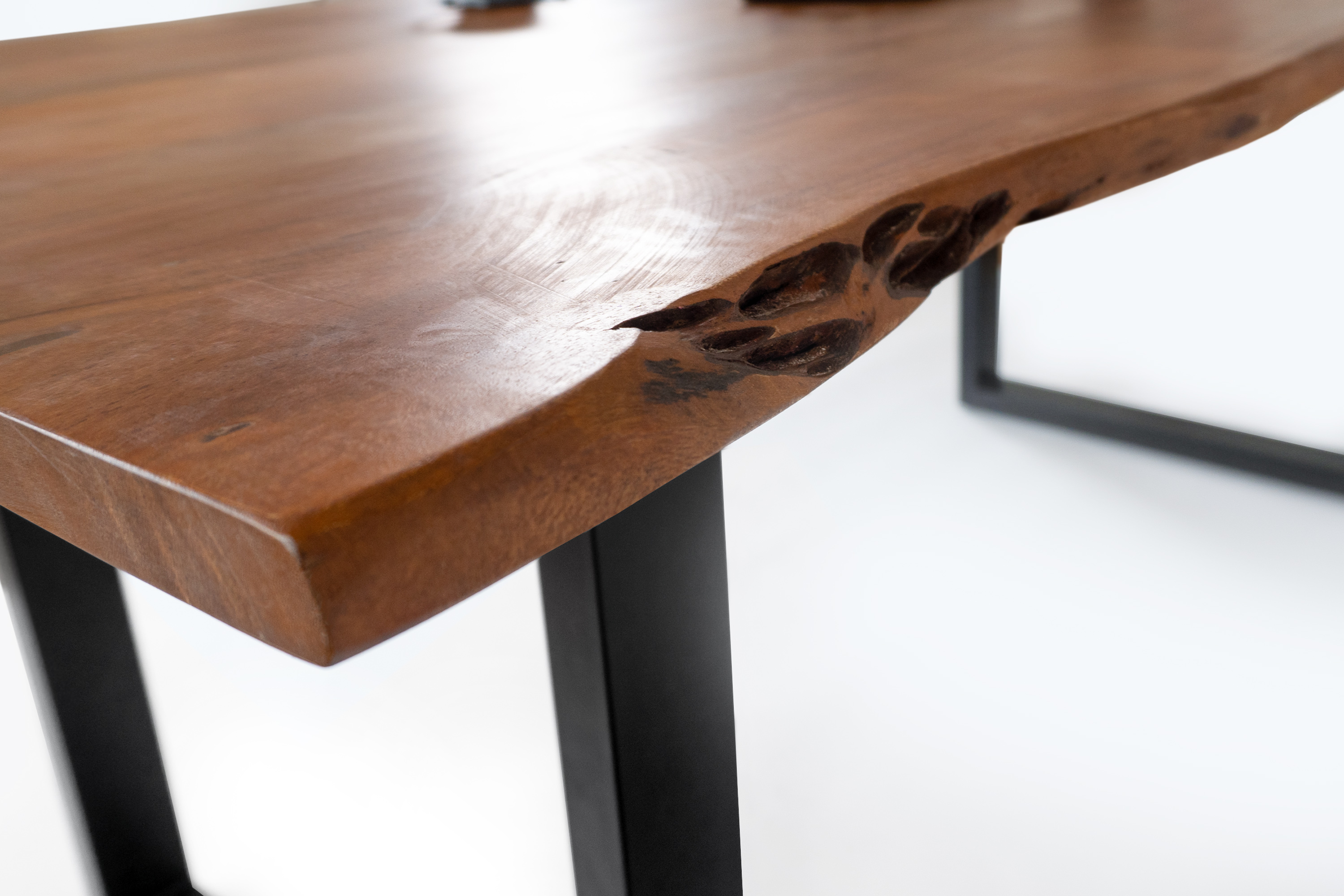 Die Tischkanten wurden direkt aus dem Baumstamm geschnitten und behalten ihre natürliche Form bei, was jeden Baumkantentisch zu einem Unikat macht. Die Metallbeine sind ein besonderes Highlight, denn das elegante U-Gestell aus hochwertigem Metall setzt gezielte Akzente im Industrial-Design. Durch diese Kombination wirkt der Tisch sowohl rustikal als auch modern und fügt sich nahtlos in jedes Ambiente ein.