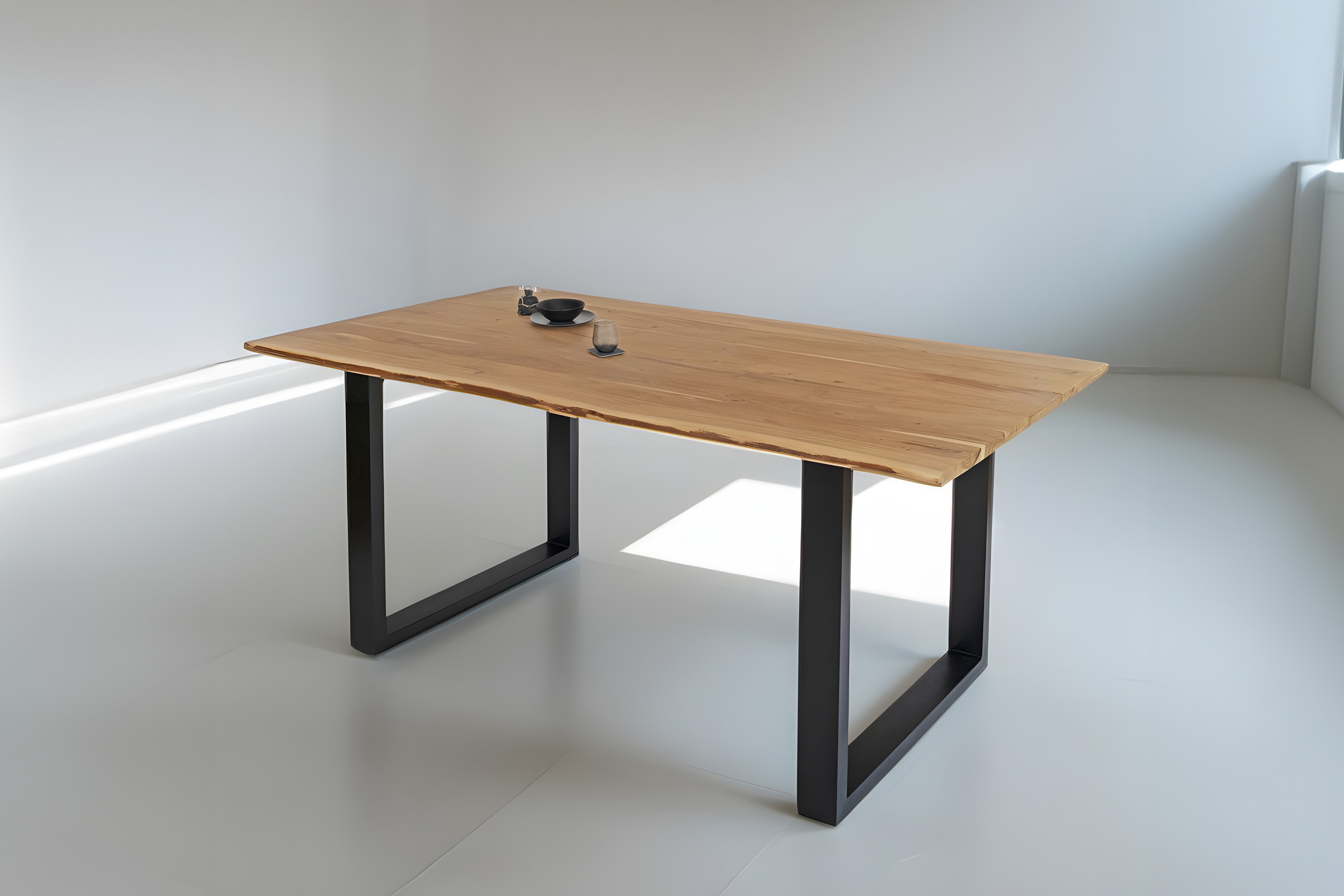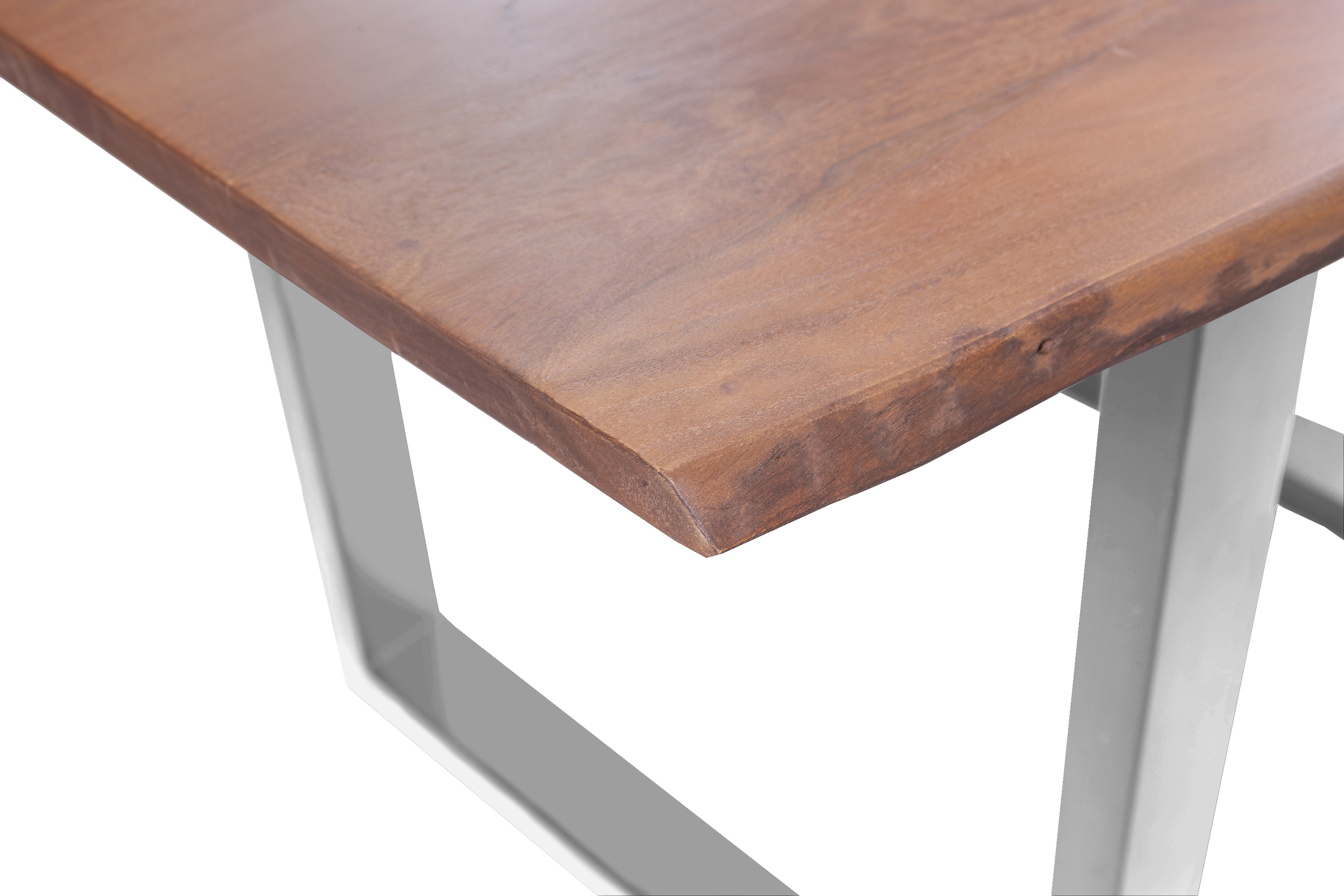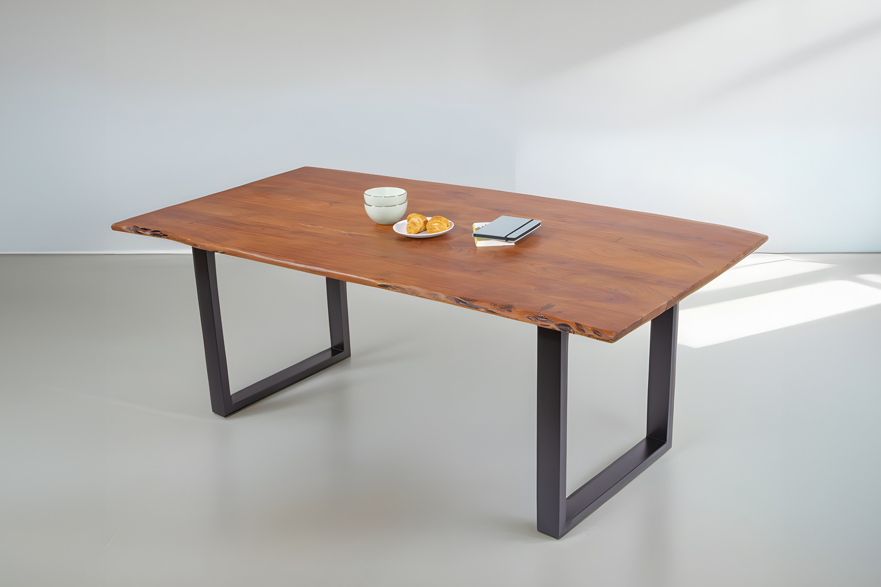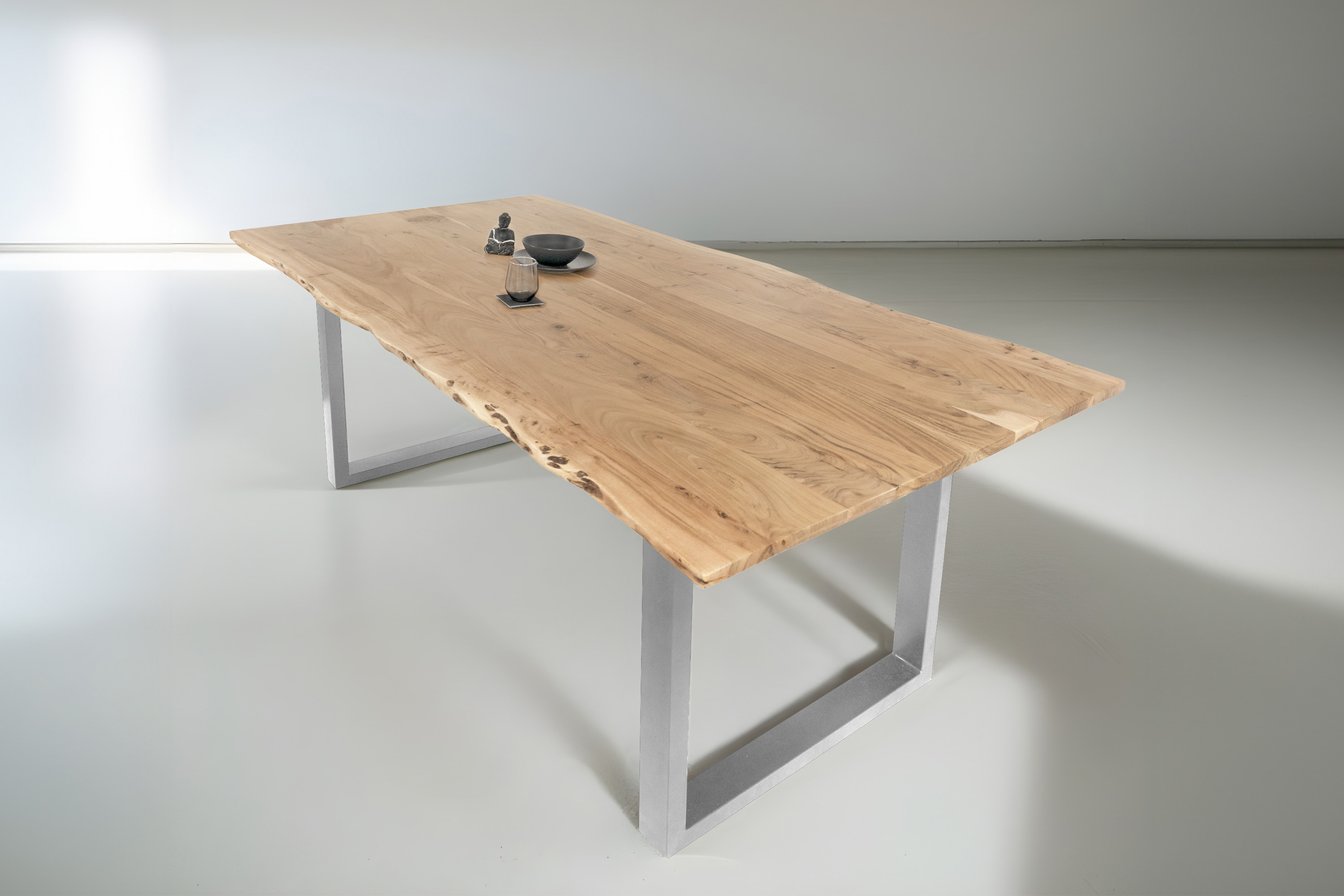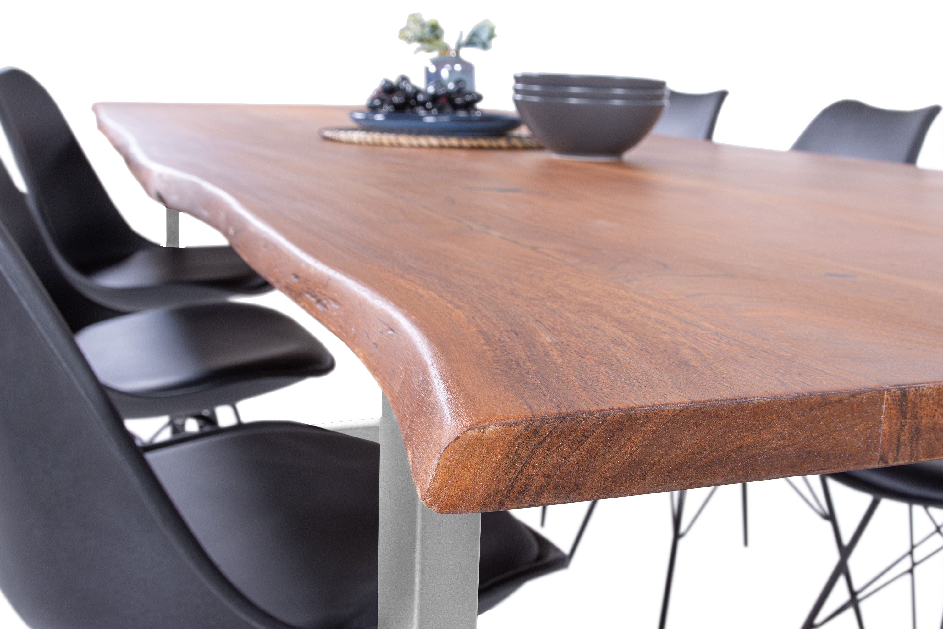 Die Tischkanten wurden direkt aus dem Baumstamm geschnitten und behalten ihre natürliche Form bei, was jeden Baumkantentisch zu einem Unikat macht. Die Metallbeine sind ein besonderes Highlight, denn das elegante U-Gestell aus hochwertigem Metall setzt gezielte Akzente im Industrial-Design. Durch diese Kombination wirkt der Tisch sowohl rustikal als auch modern und fügt sich nahtlos in jedes Ambiente ein.