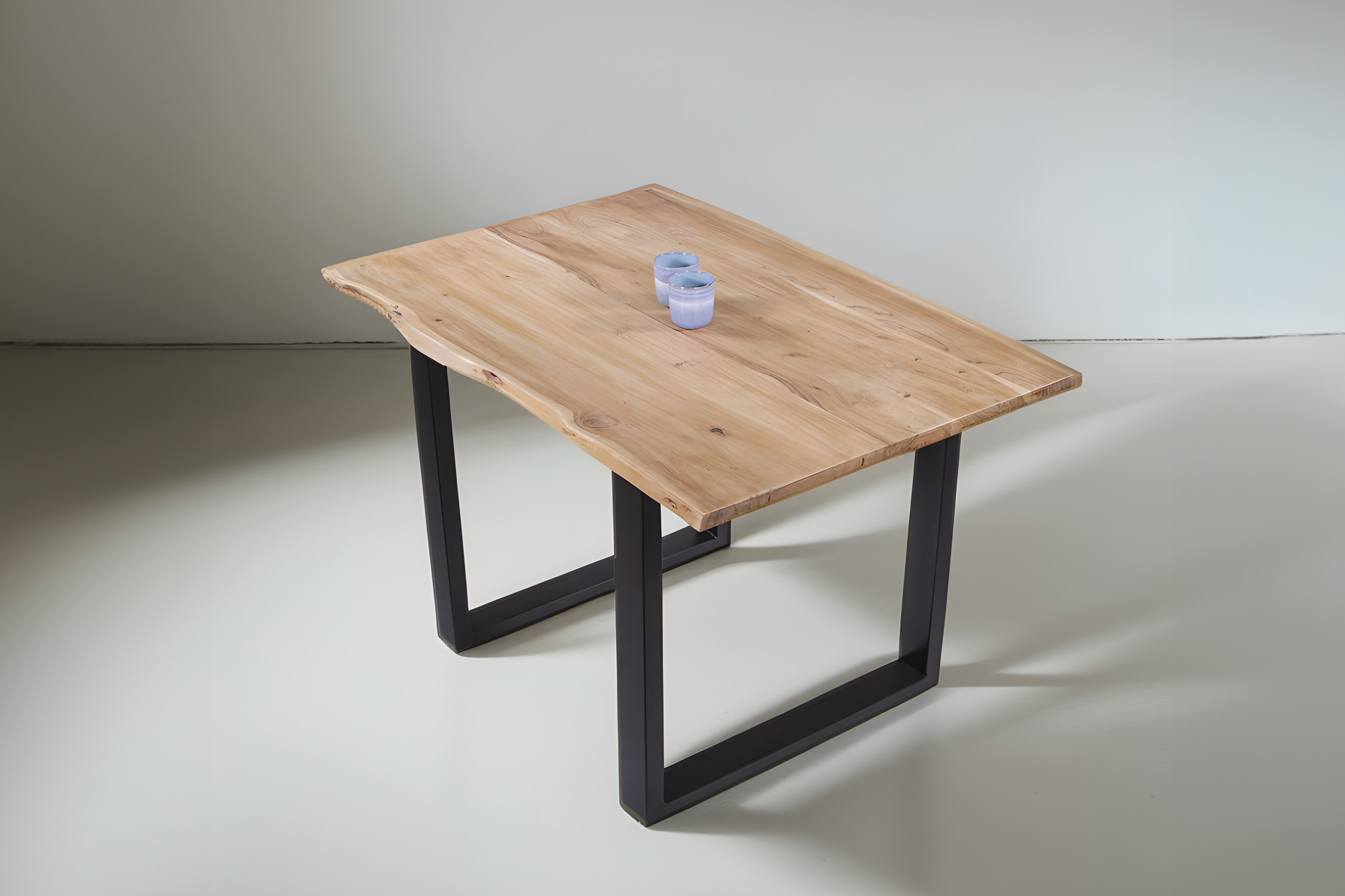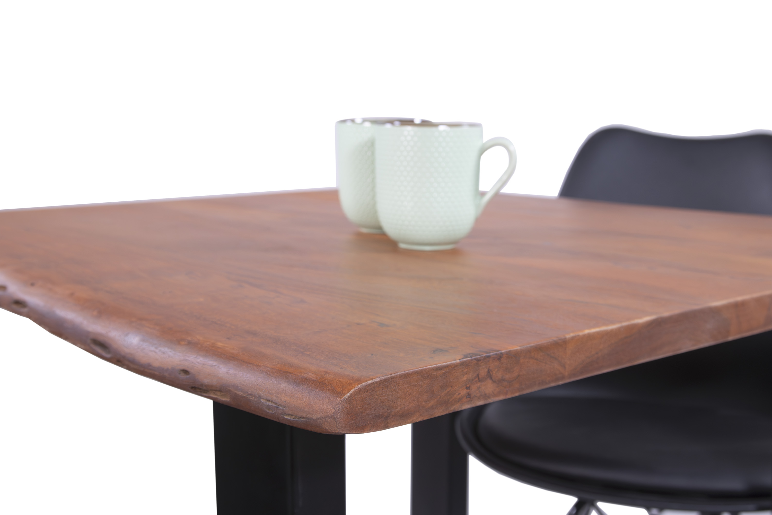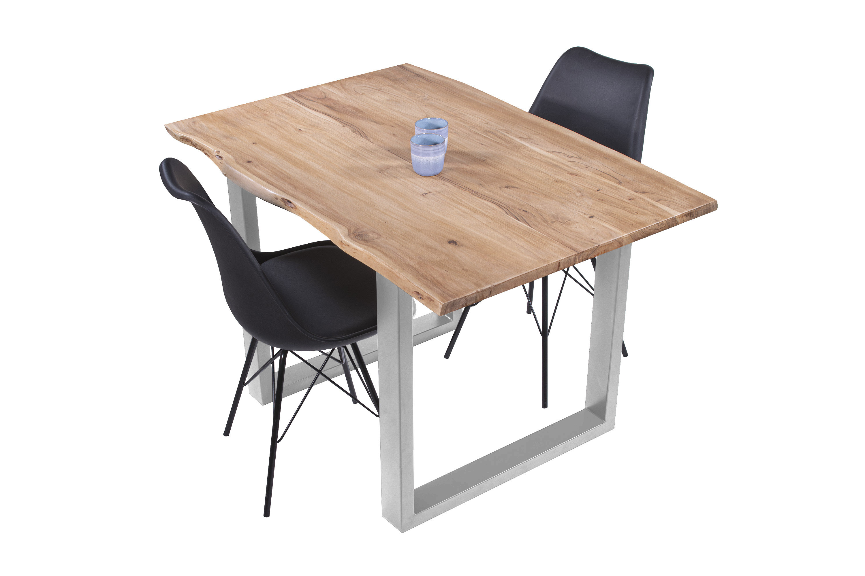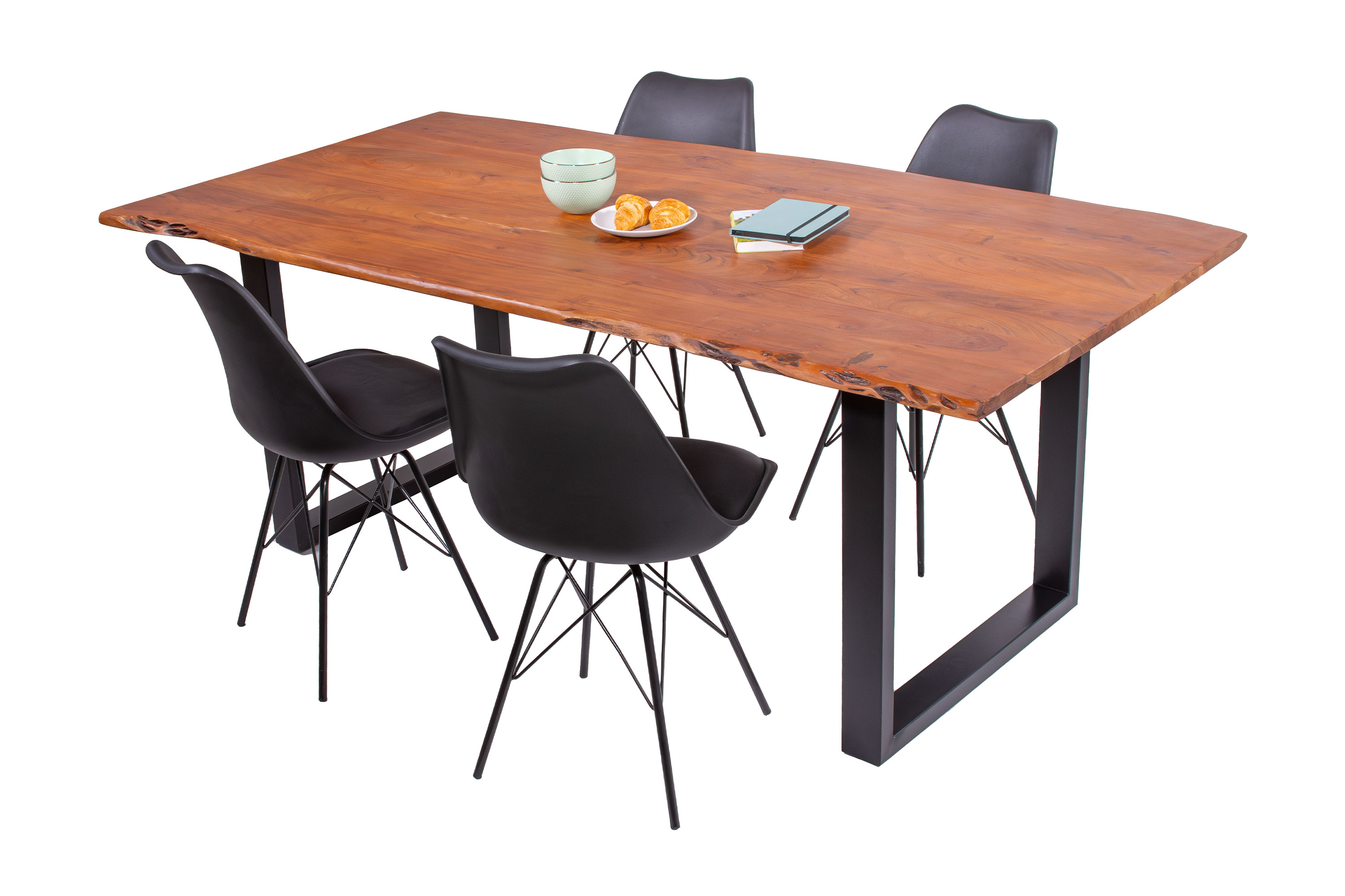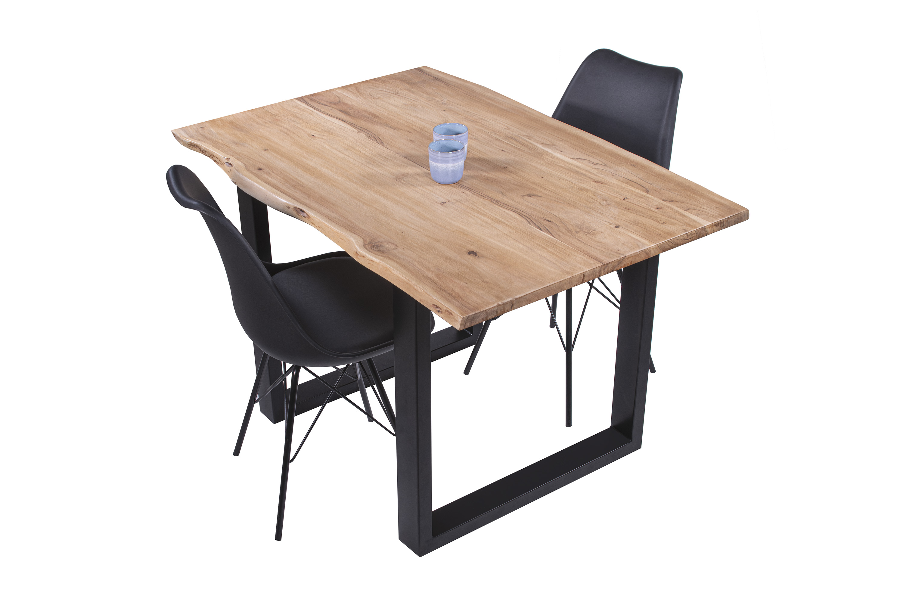 Die Tischkanten wurden direkt aus dem Baumstamm geschnitten und behalten ihre natürliche Form bei, was jeden Baumkantentisch zu einem Unikat macht. Die Metallbeine sind ein besonderes Highlight, denn das elegante U-Gestell aus hochwertigem Metall setzt gezielte Akzente im Industrial-Design. Durch diese Kombination wirkt der Tisch sowohl rustikal als auch modern und fügt sich nahtlos in jedes Ambiente ein.