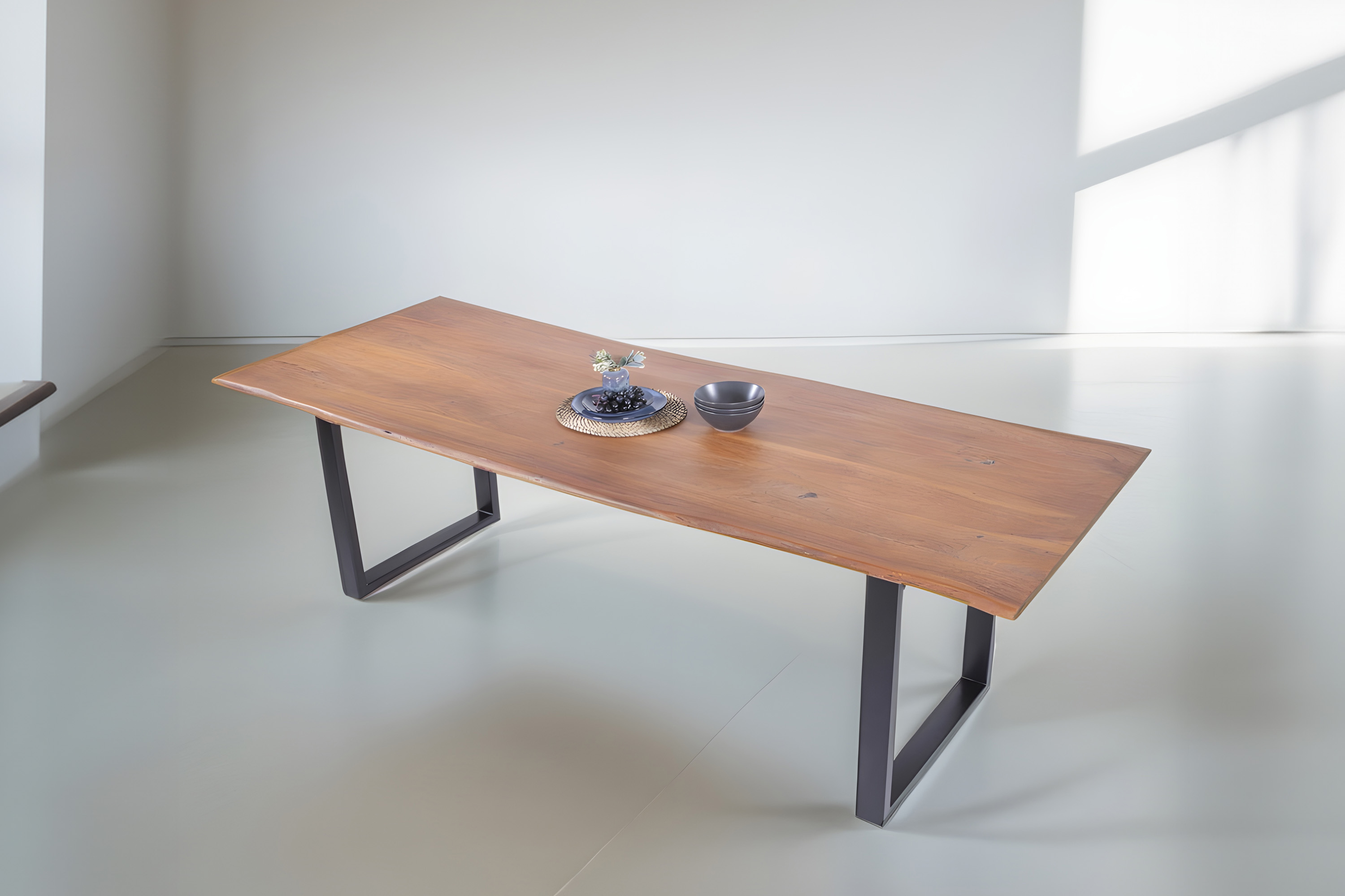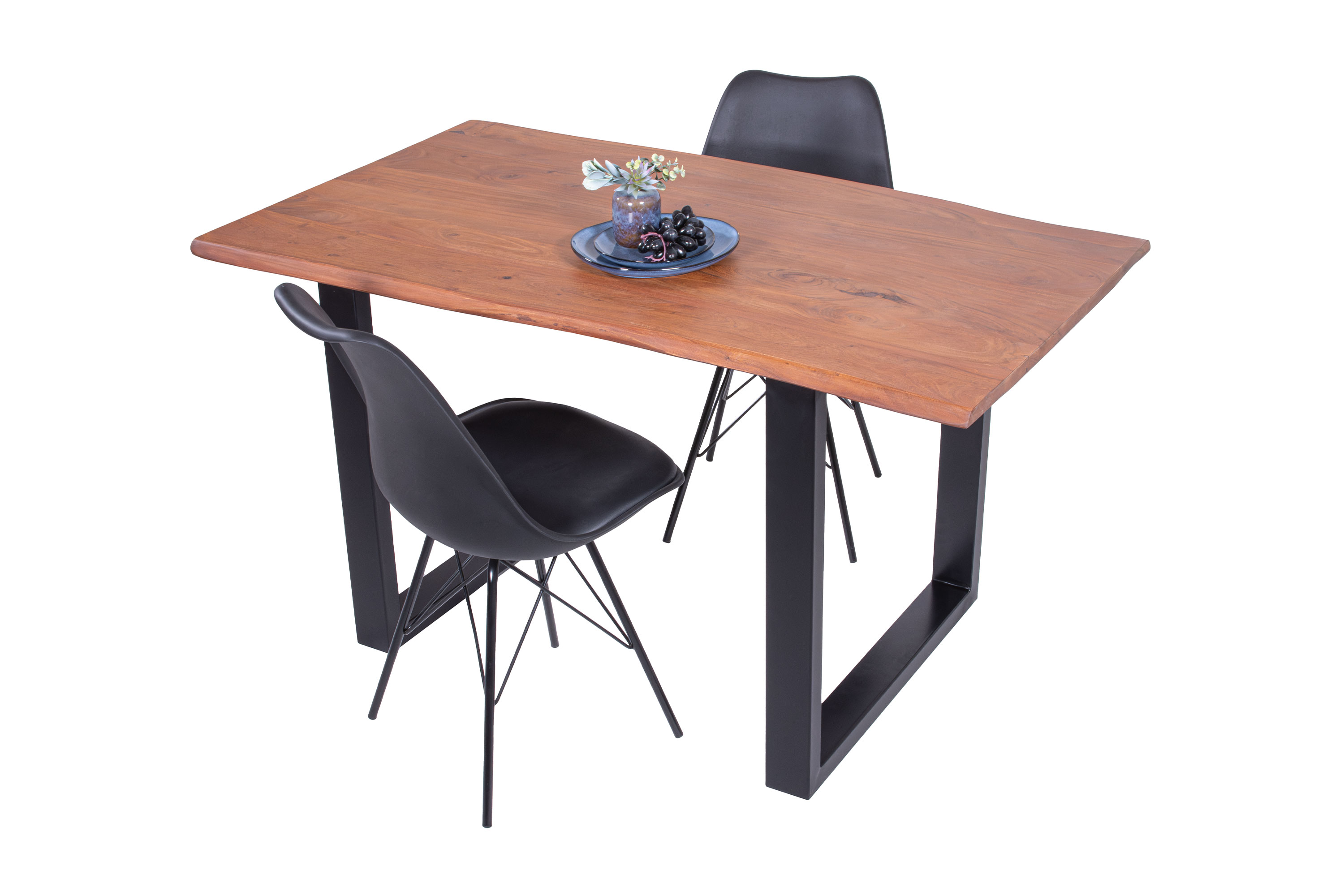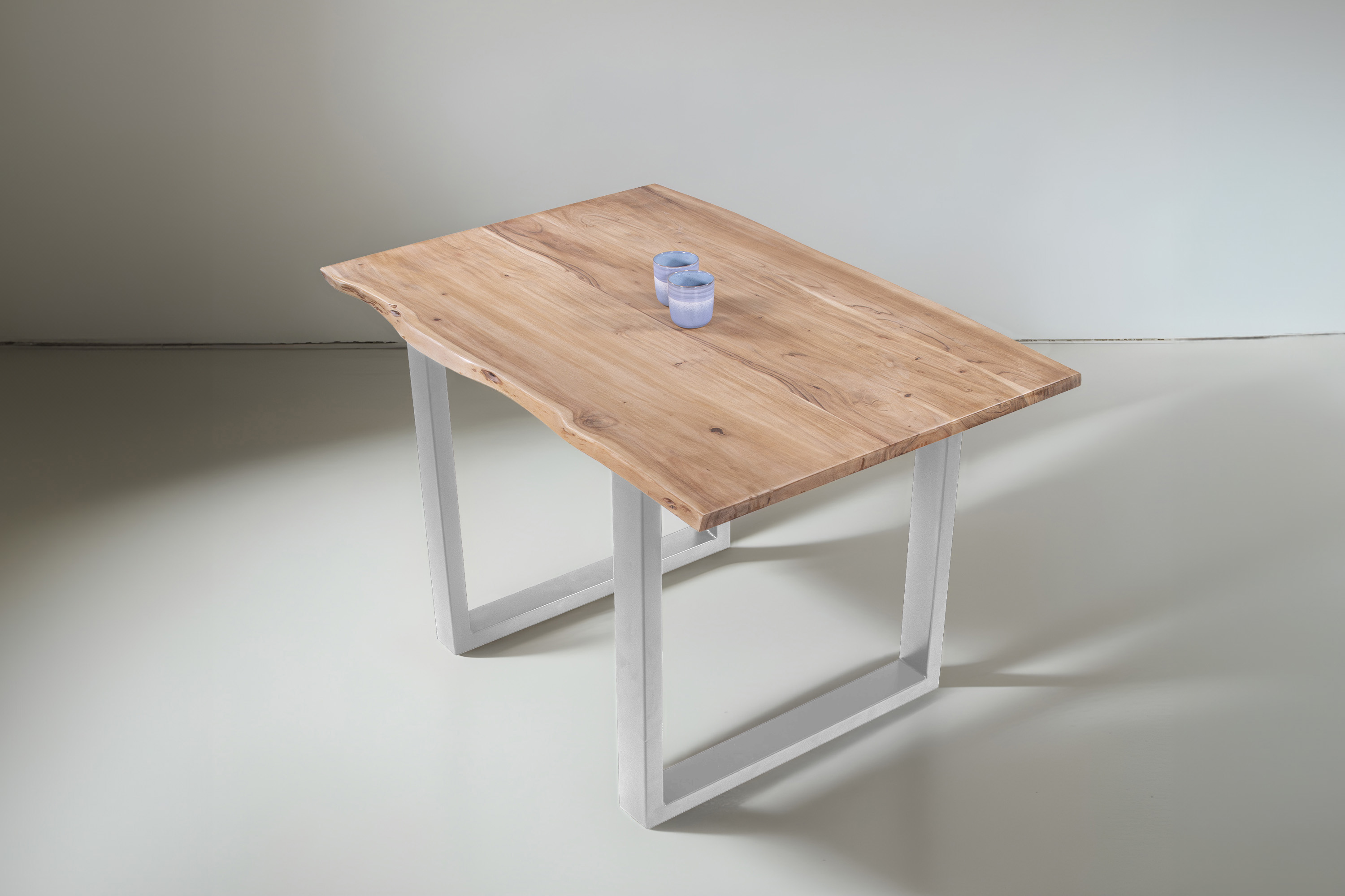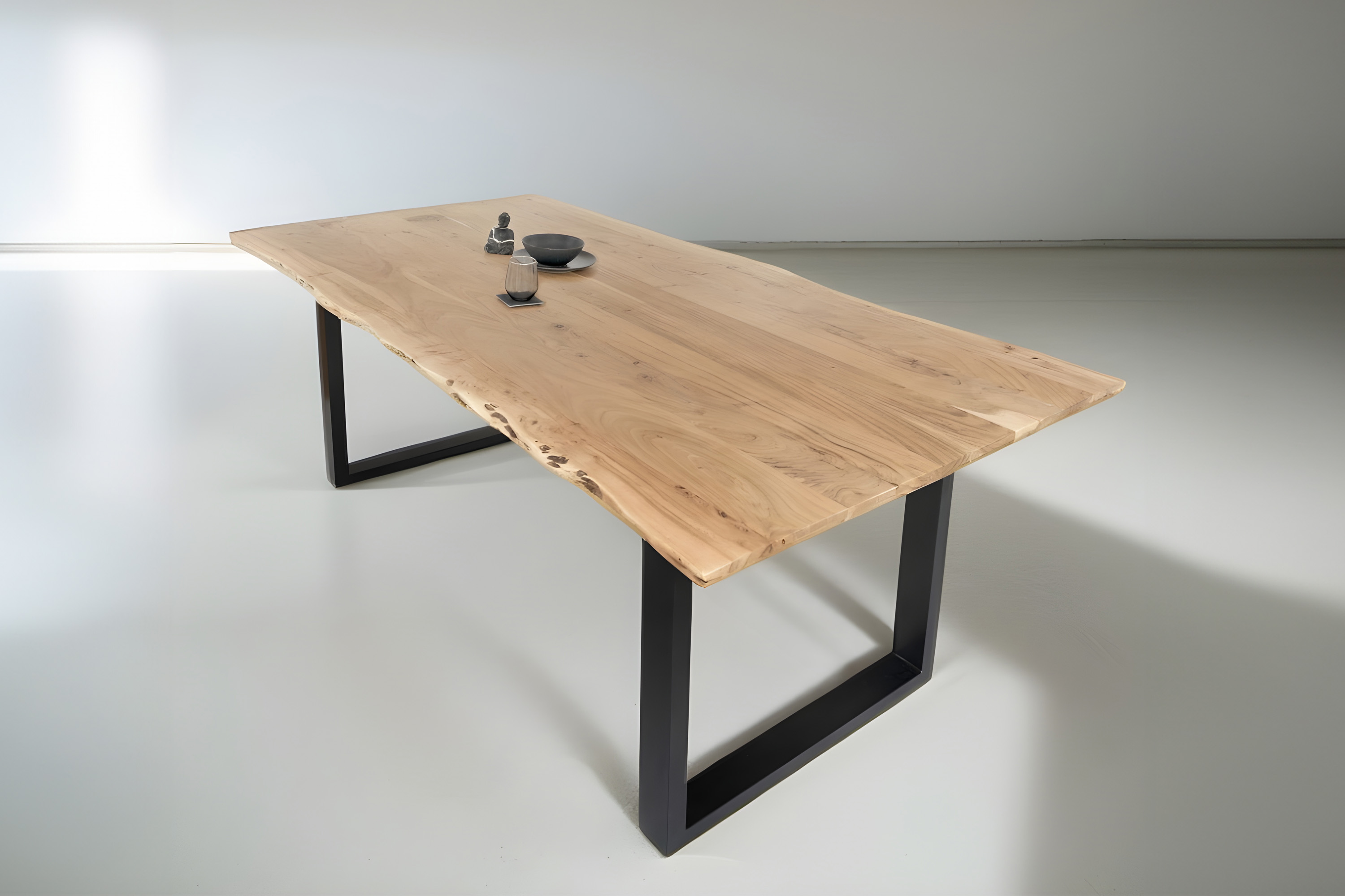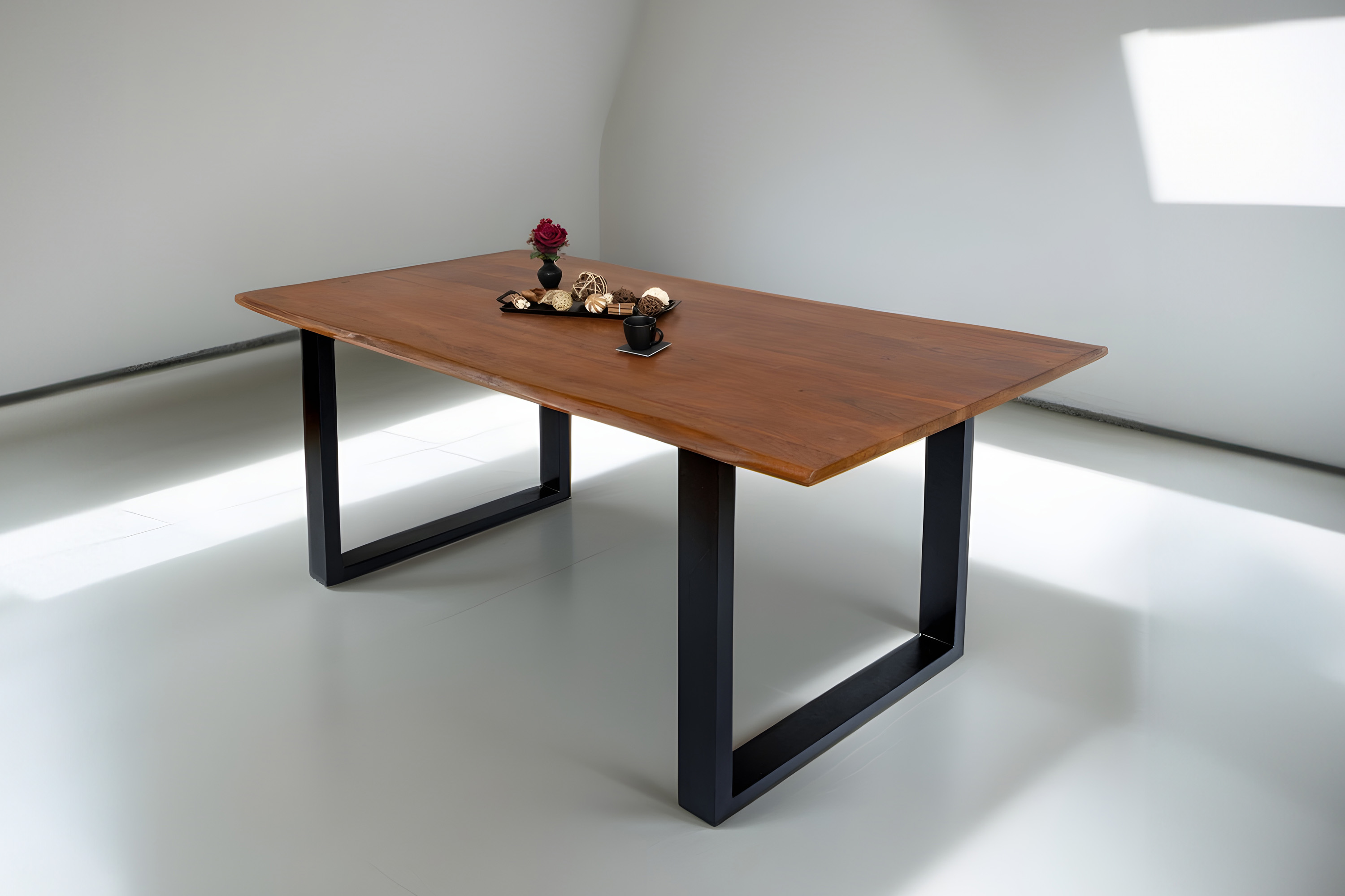 Die Tischkanten wurden direkt aus dem Baumstamm geschnitten und behalten ihre natürliche Form bei, was jeden Baumkantentisch zu einem Unikat macht. Die Metallbeine sind ein besonderes Highlight, denn das elegante U-Gestell aus hochwertigem Metall setzt gezielte Akzente im Industrial-Design. Durch diese Kombination wirkt der Tisch sowohl rustikal als auch modern und fügt sich nahtlos in jedes Ambiente ein.
