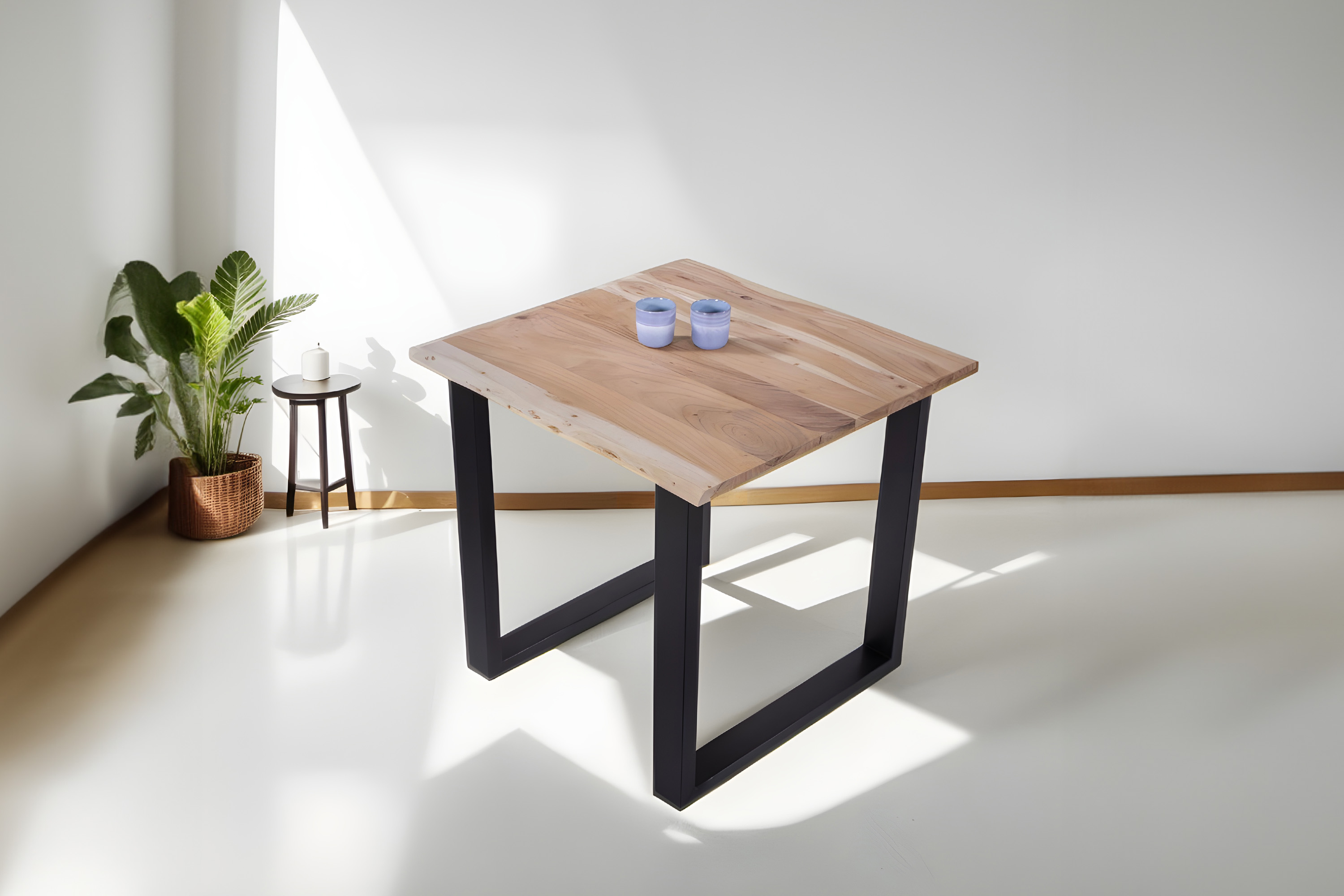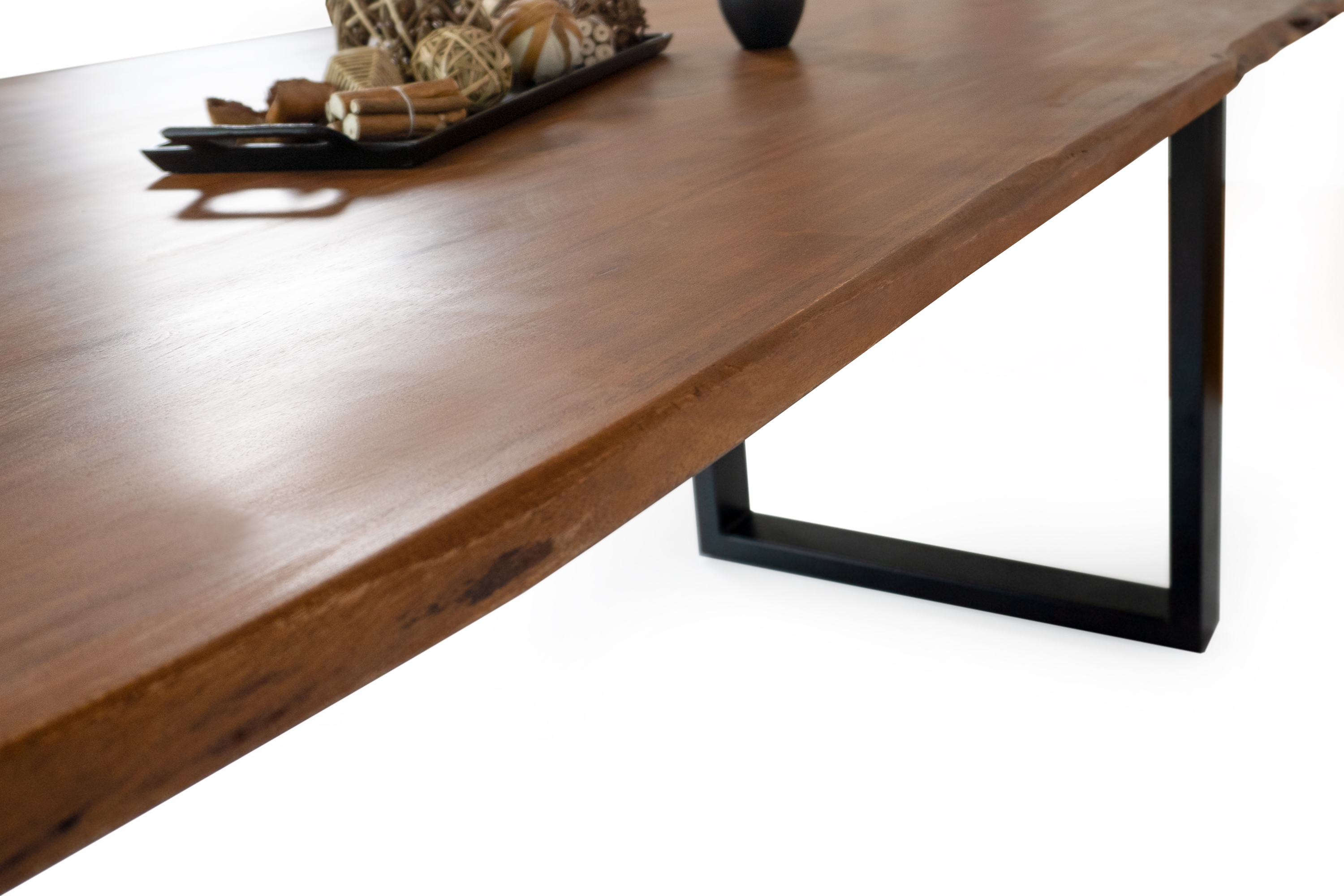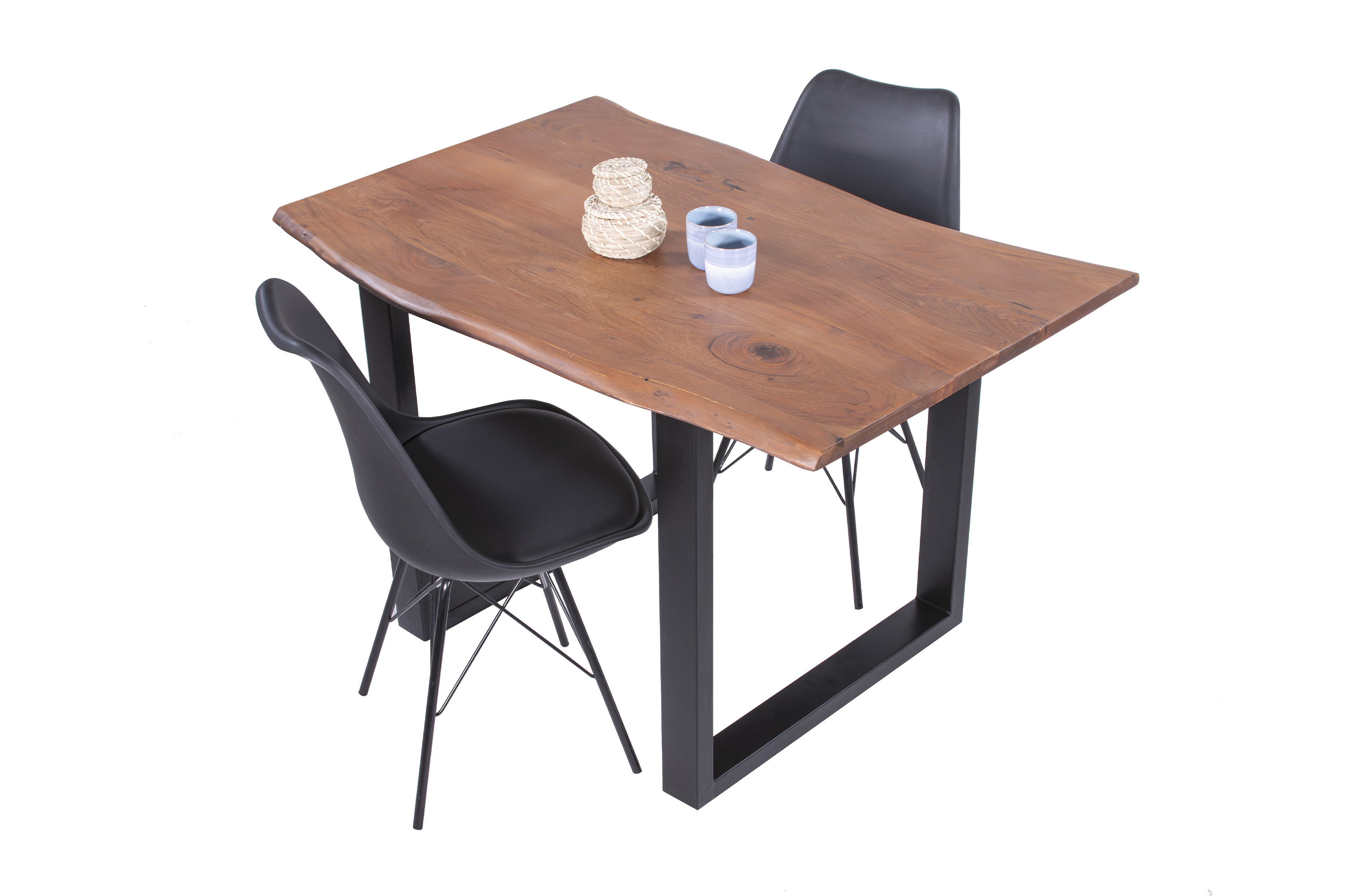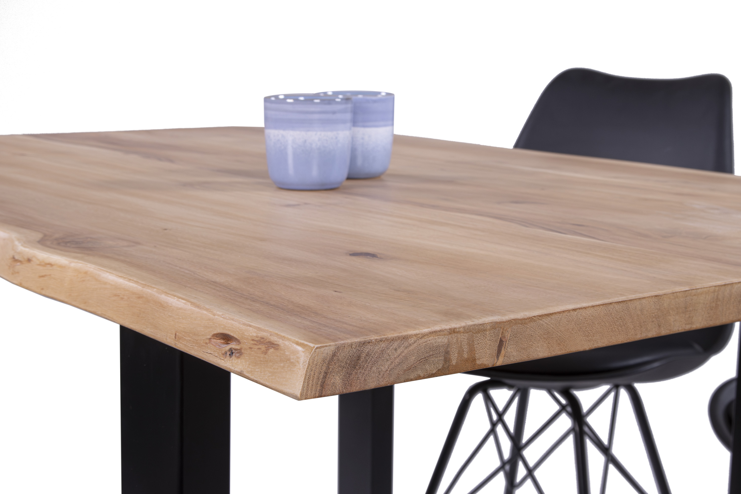 Die Tischkanten wurden direkt aus dem Baumstamm geschnitten und behalten ihre natürliche Form bei, was jeden Baumkantentisch zu einem Unikat macht. Die Metallbeine sind ein besonderes Highlight, denn das elegante U-Gestell aus hochwertigem Metall setzt gezielte Akzente im Industrial-Design. Durch diese Kombination wirkt der Tisch sowohl rustikal als auch modern und fügt sich nahtlos in jedes Ambiente ein.