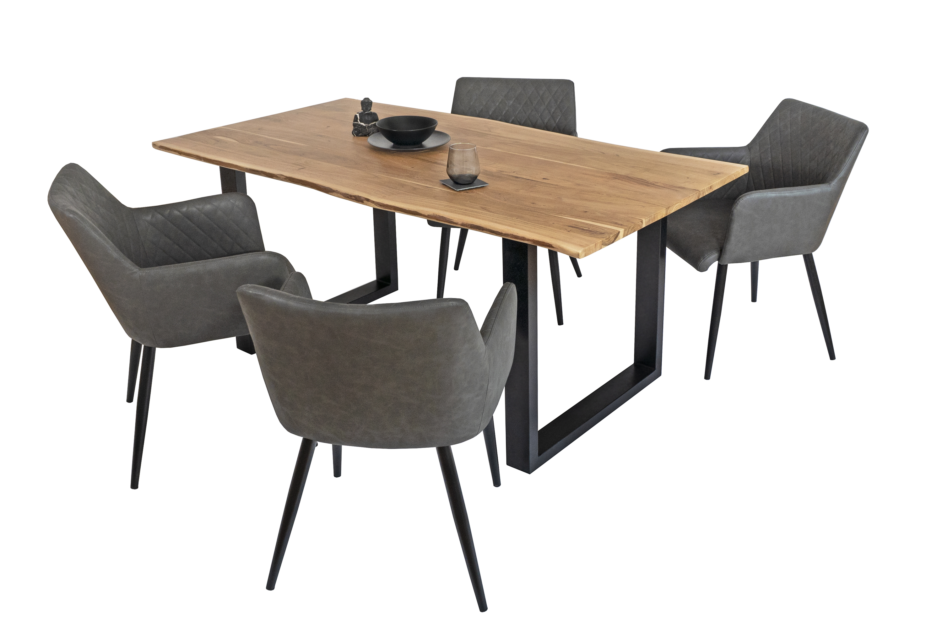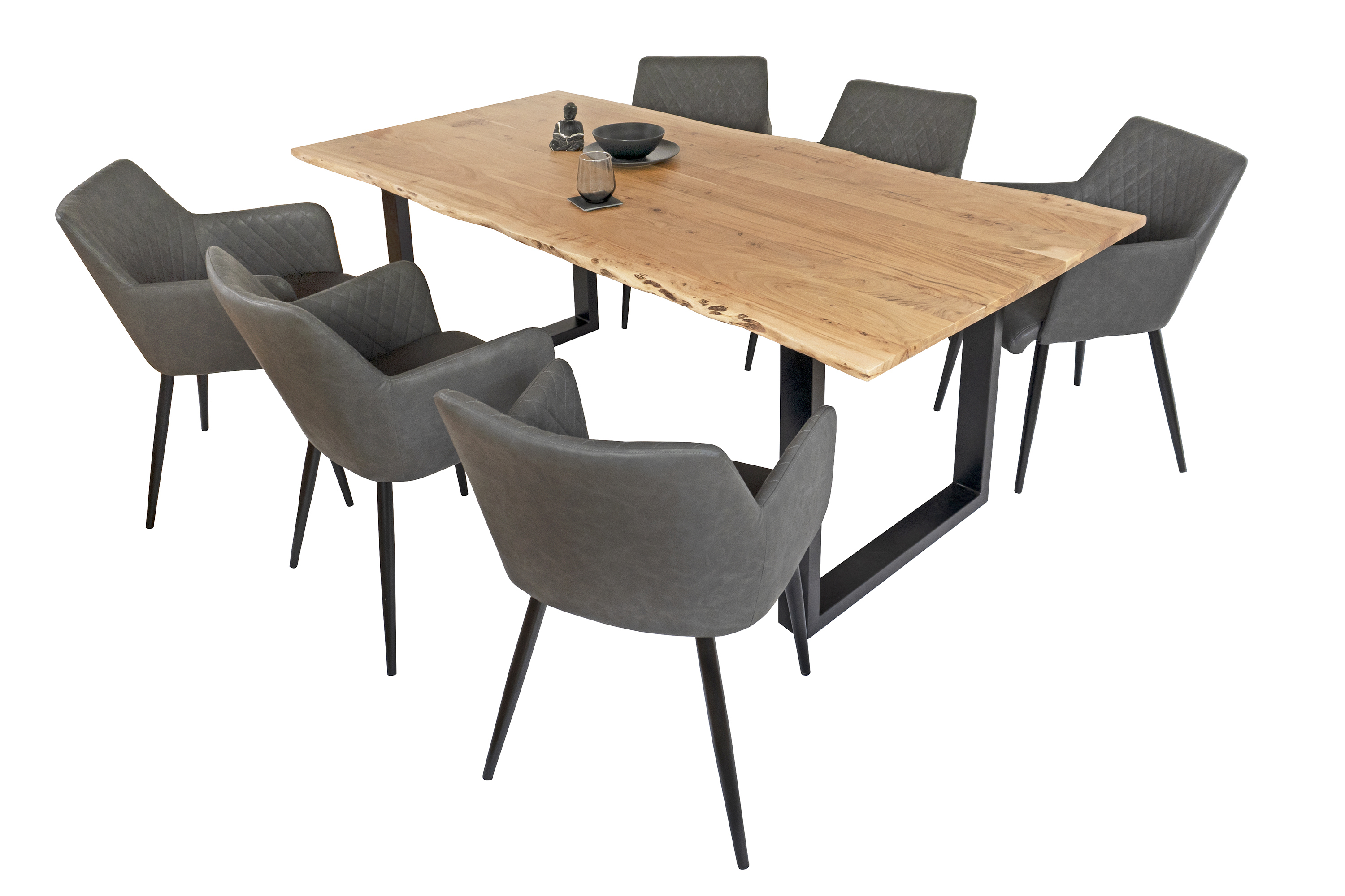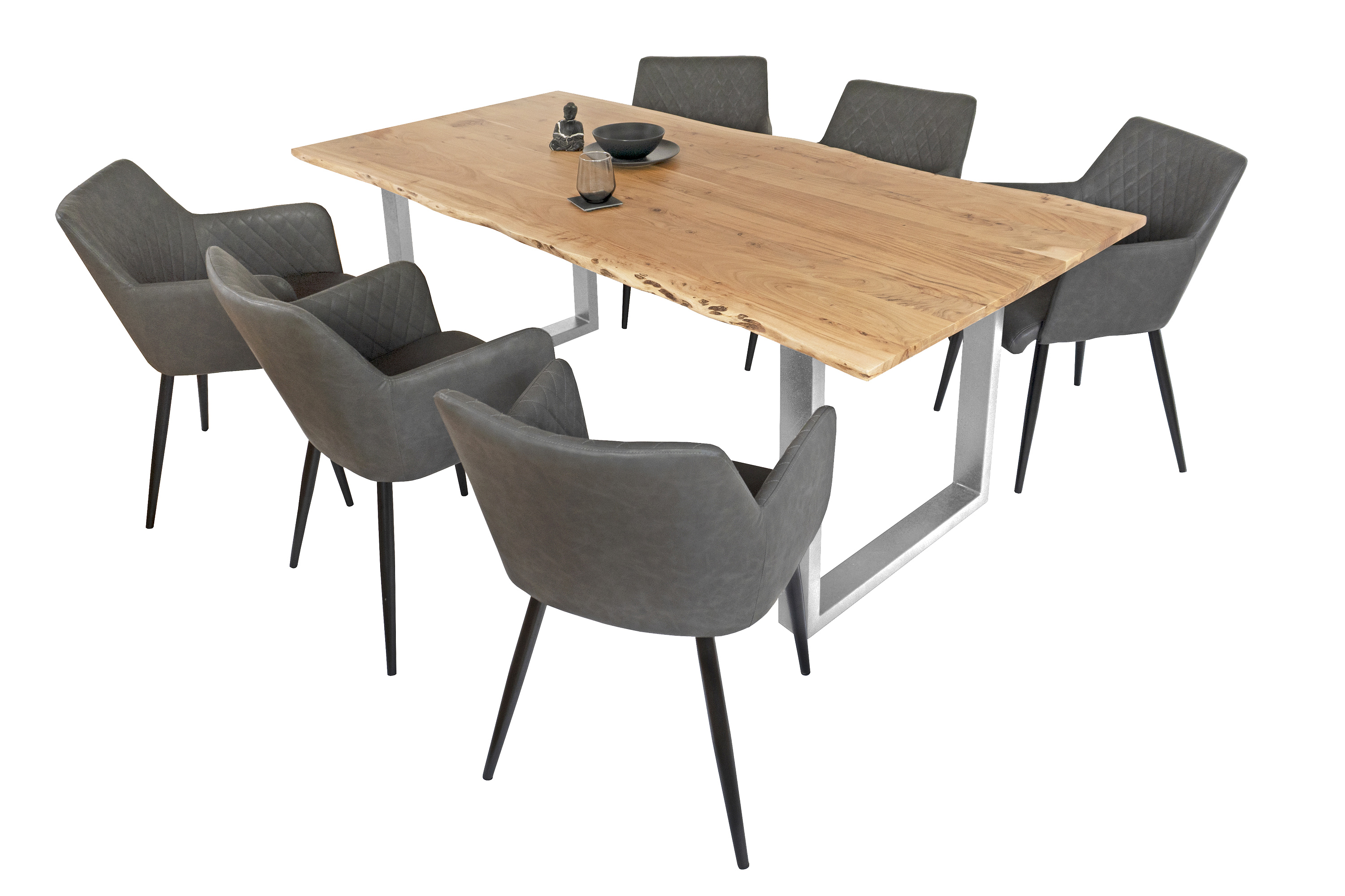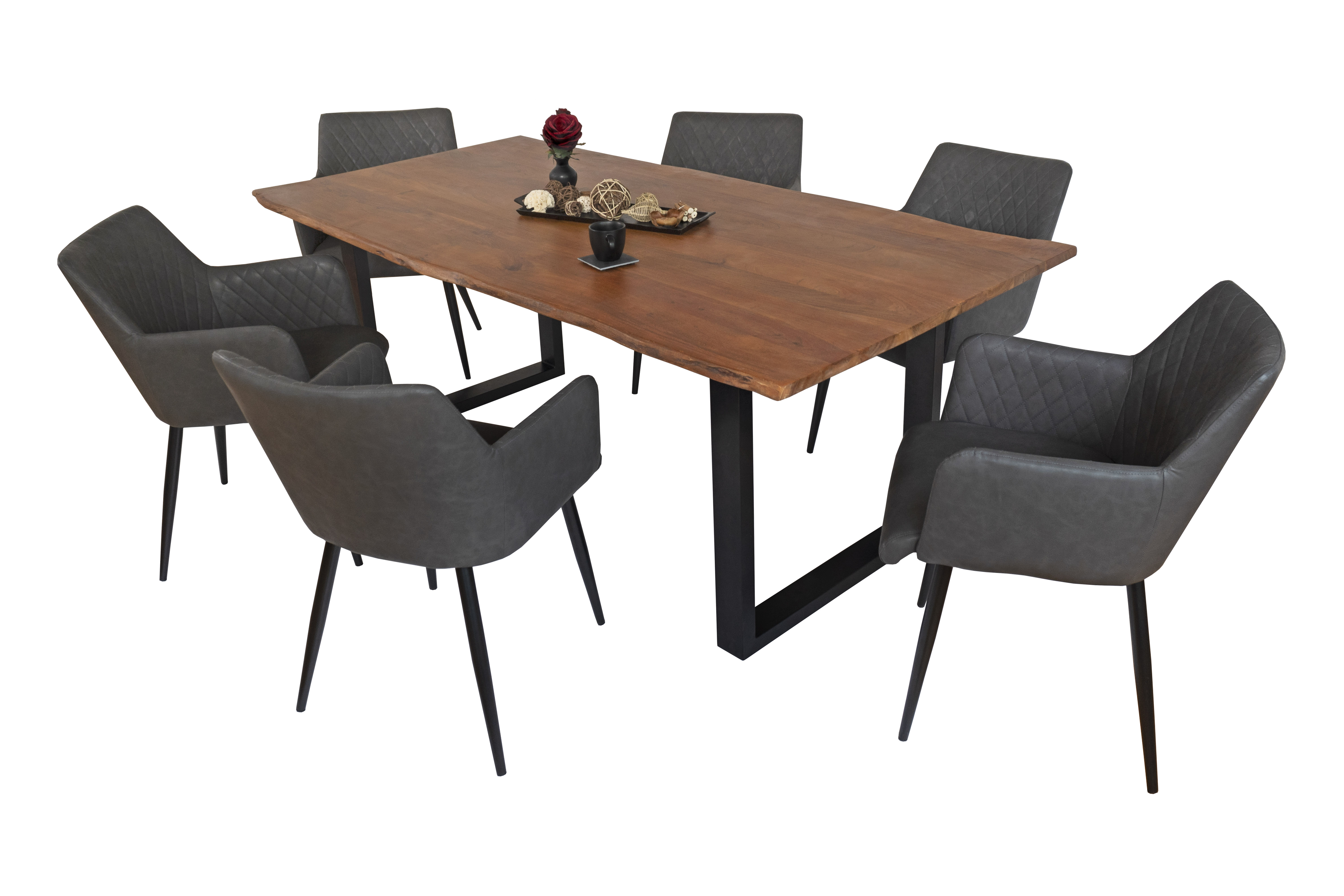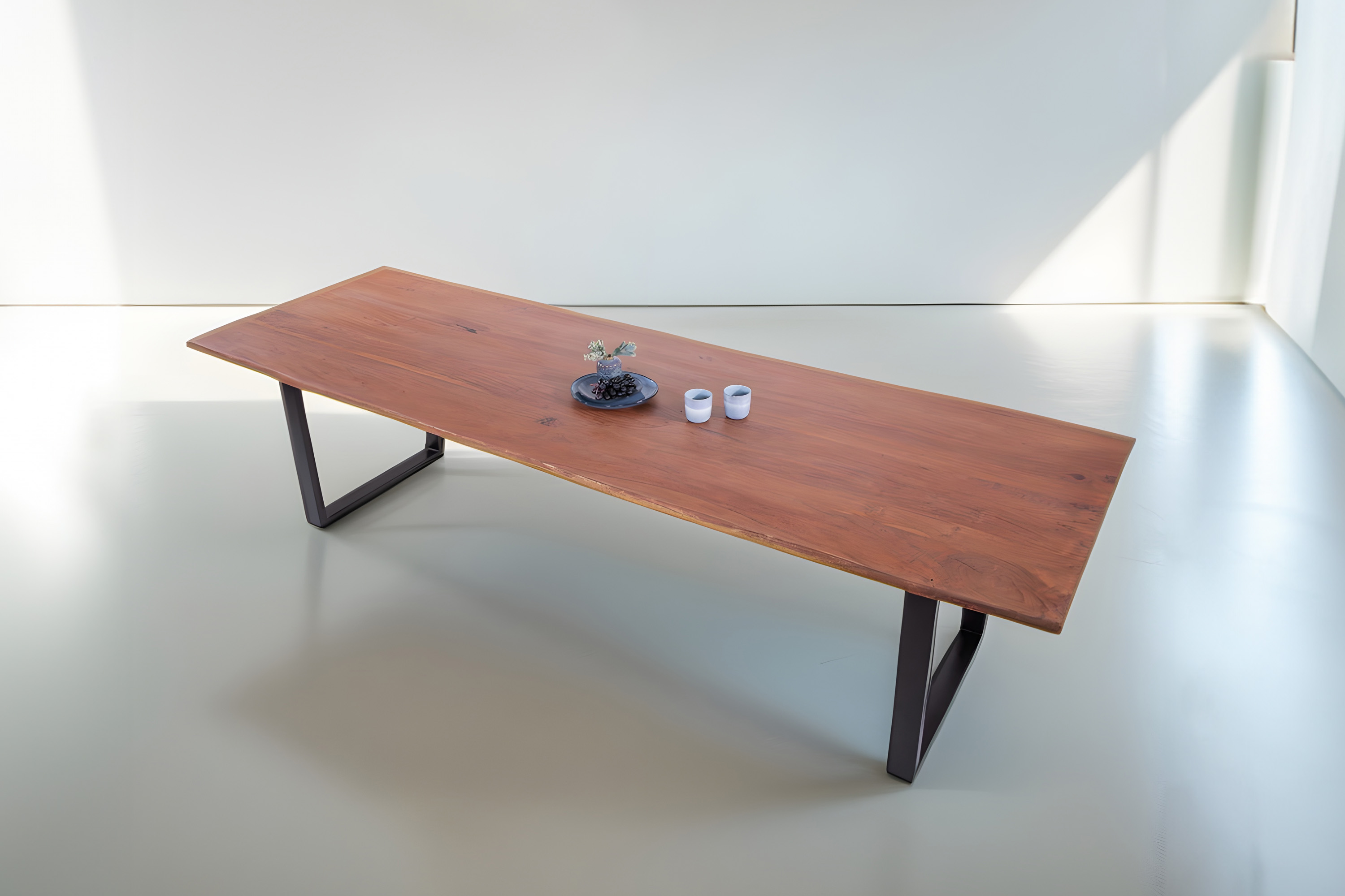 Die Tischkanten wurden direkt aus dem Baumstamm geschnitten und behalten ihre natürliche Form bei, was jeden Baumkantentisch zu einem Unikat macht. Die Metallbeine sind ein besonderes Highlight, denn das elegante U-Gestell aus hochwertigem Metall setzt gezielte Akzente im Industrial-Design. Durch diese Kombination wirkt der Tisch sowohl rustikal als auch modern und fügt sich nahtlos in jedes Ambiente ein.