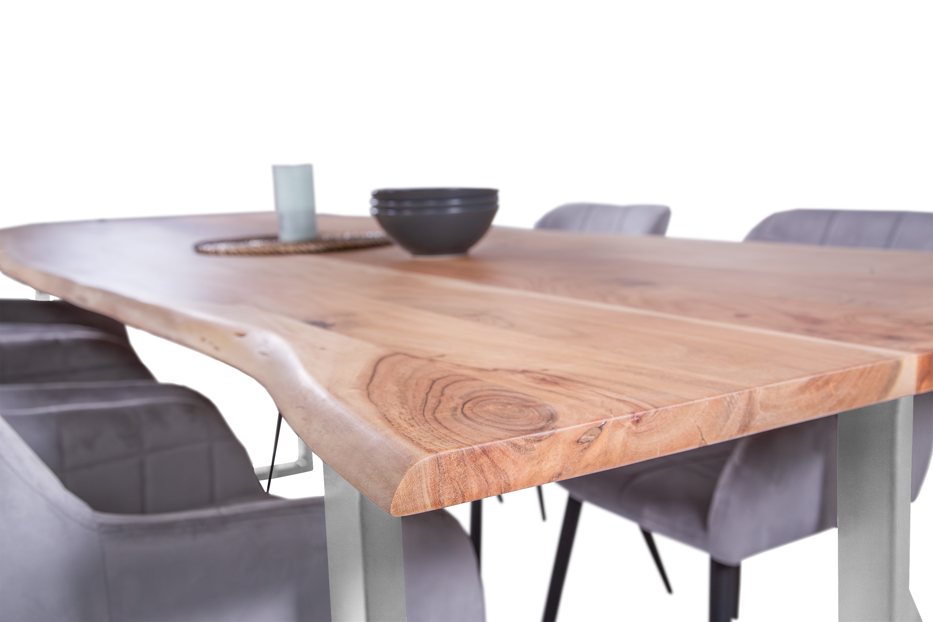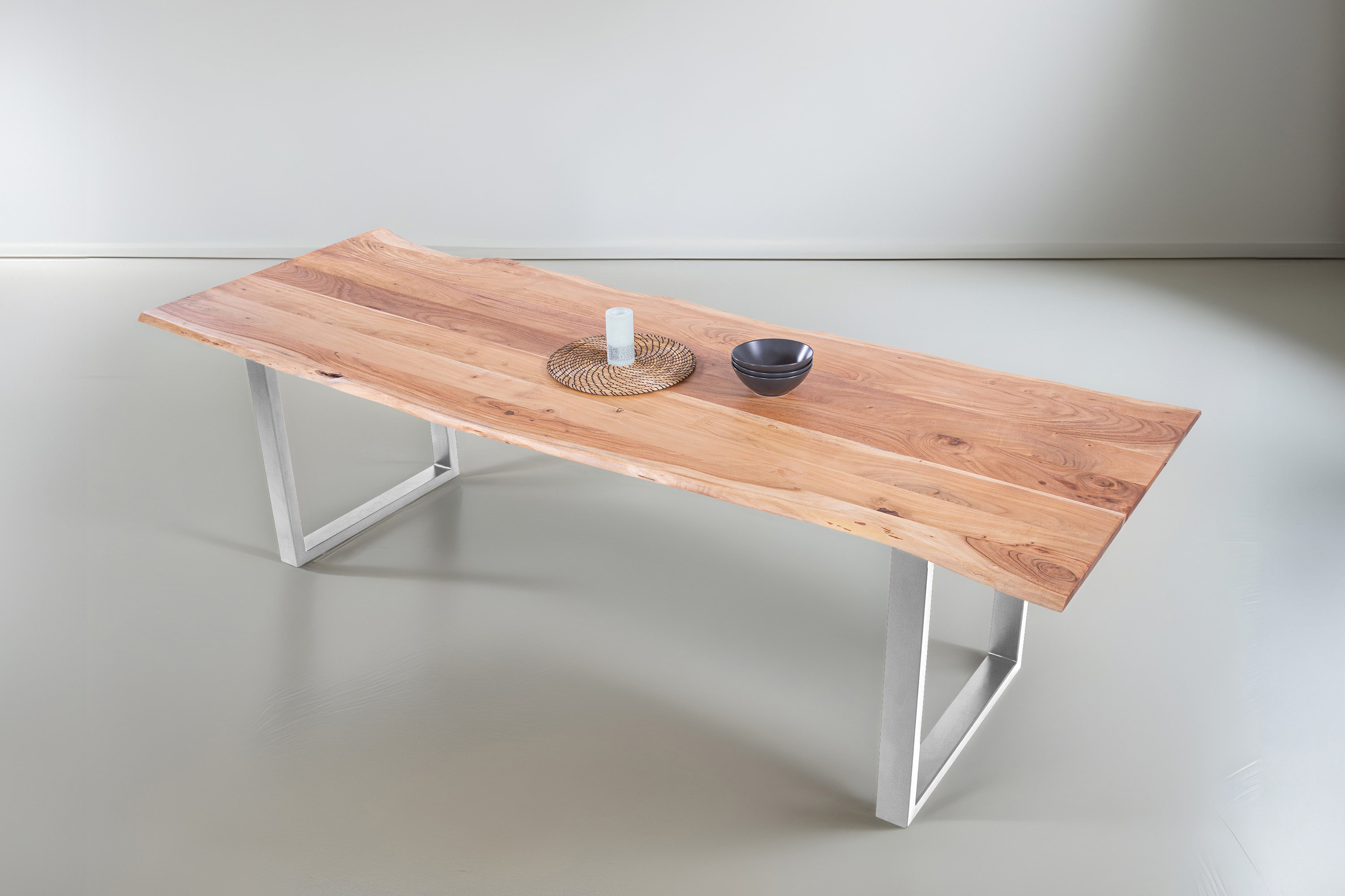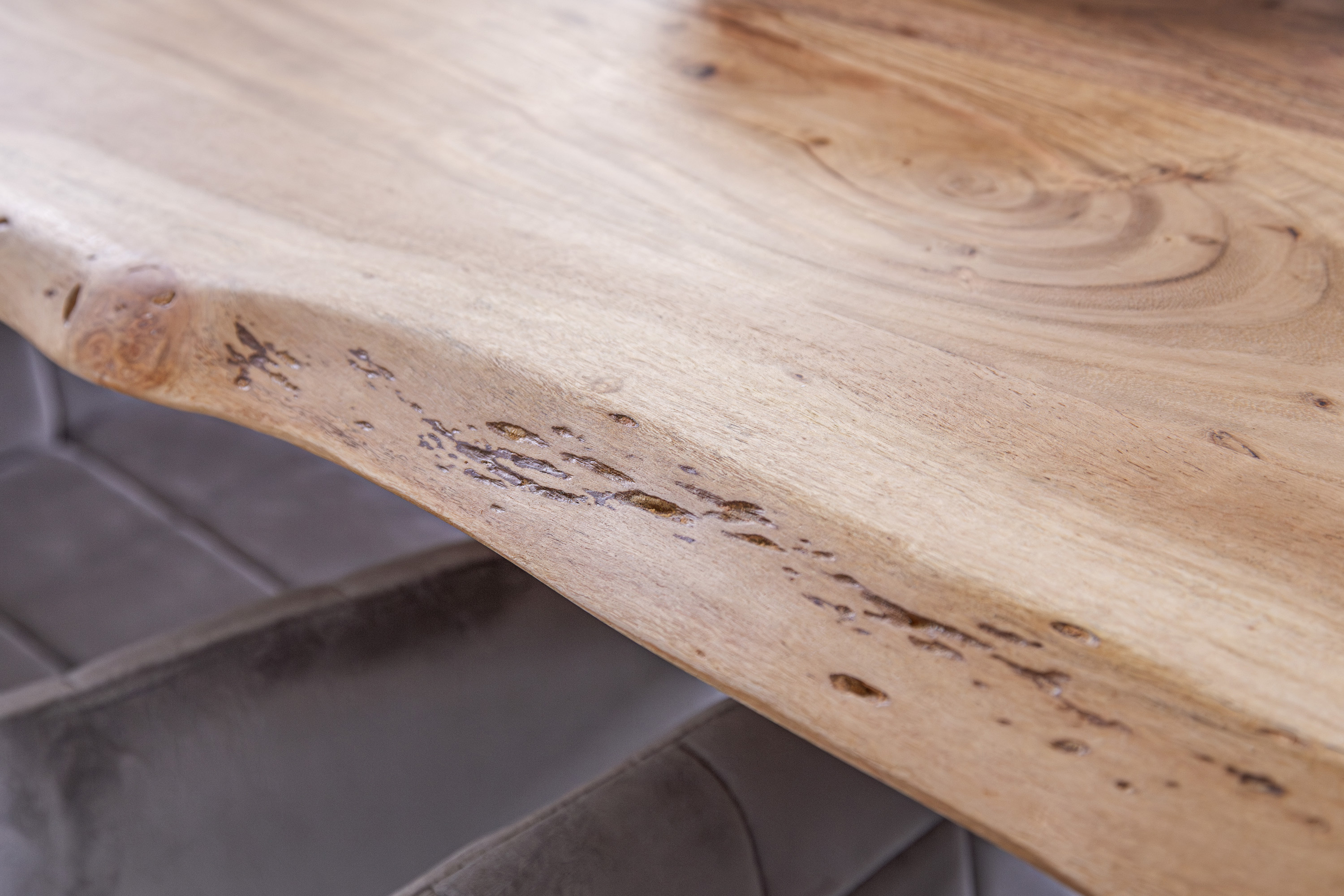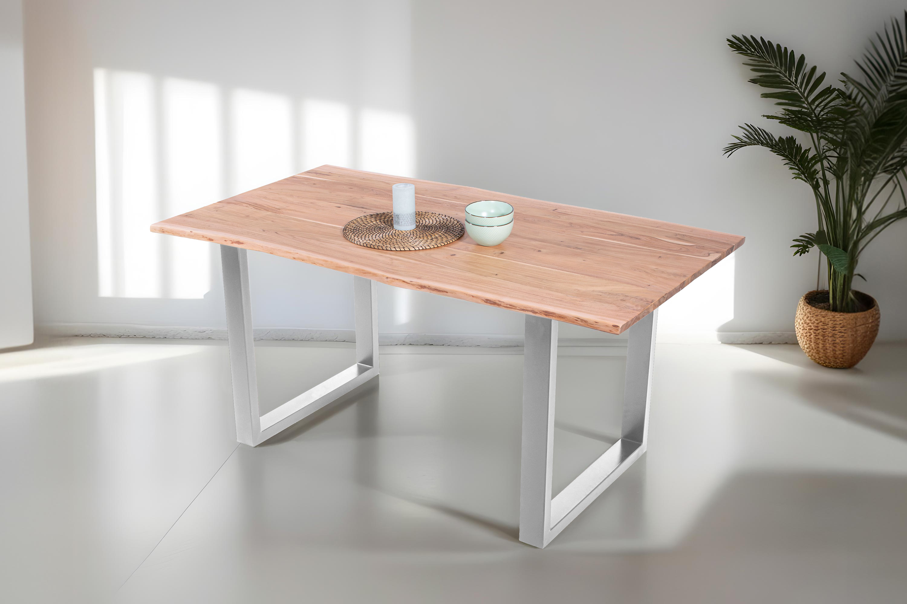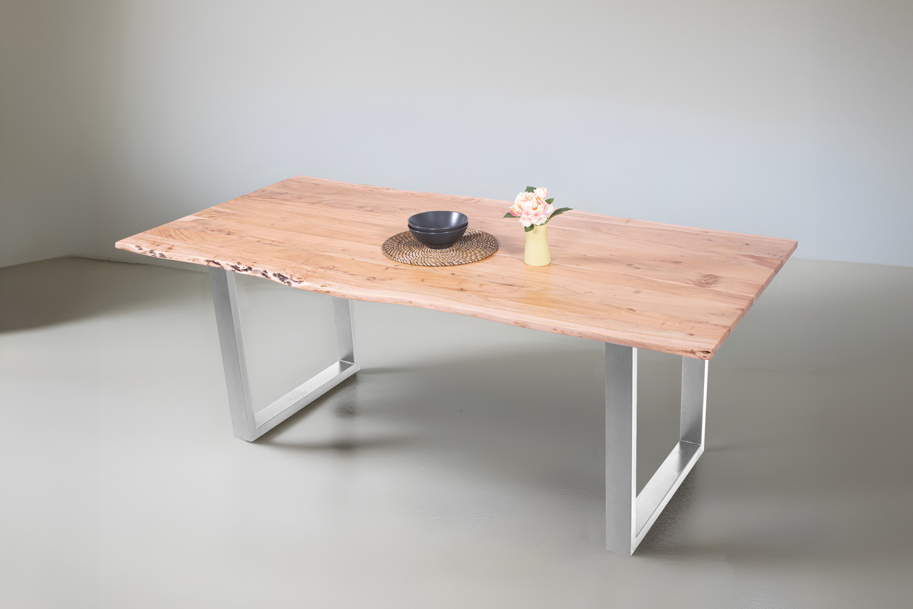 Für die Herstellung unseres Holztisches Adella verwenden wir nur das beste Akazienholz. Dieses Holz zeichnet sich durch seine Härte und Widerstandsfähigkeit aus, wodurch der fertige Tisch besonders belastbar und robust ist. Das hochwertige und natürliche Erscheinungsbild macht den Baumkantentisch Adella zum Mittelpunkt Ihres Interieurs. Er lädt zur Geselligkeit ein und ist ein exklusiver Eyecatcher, der sich in jeden Wohnstil integrieren lässt.