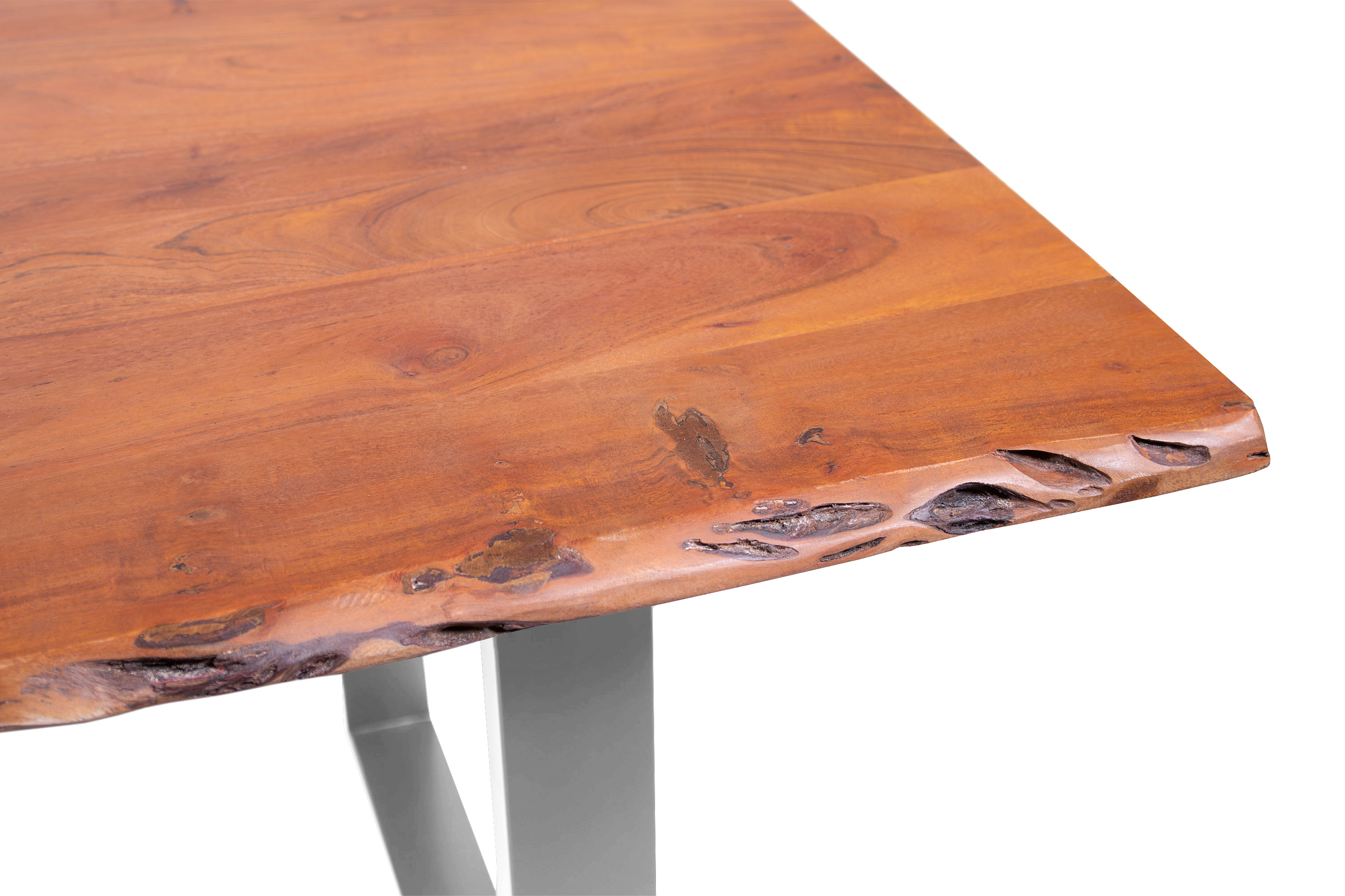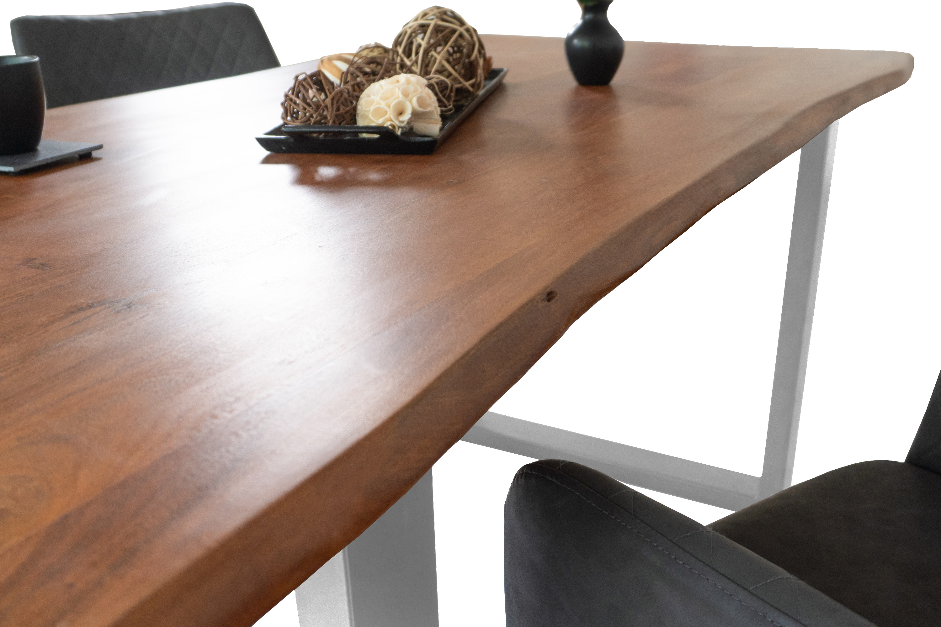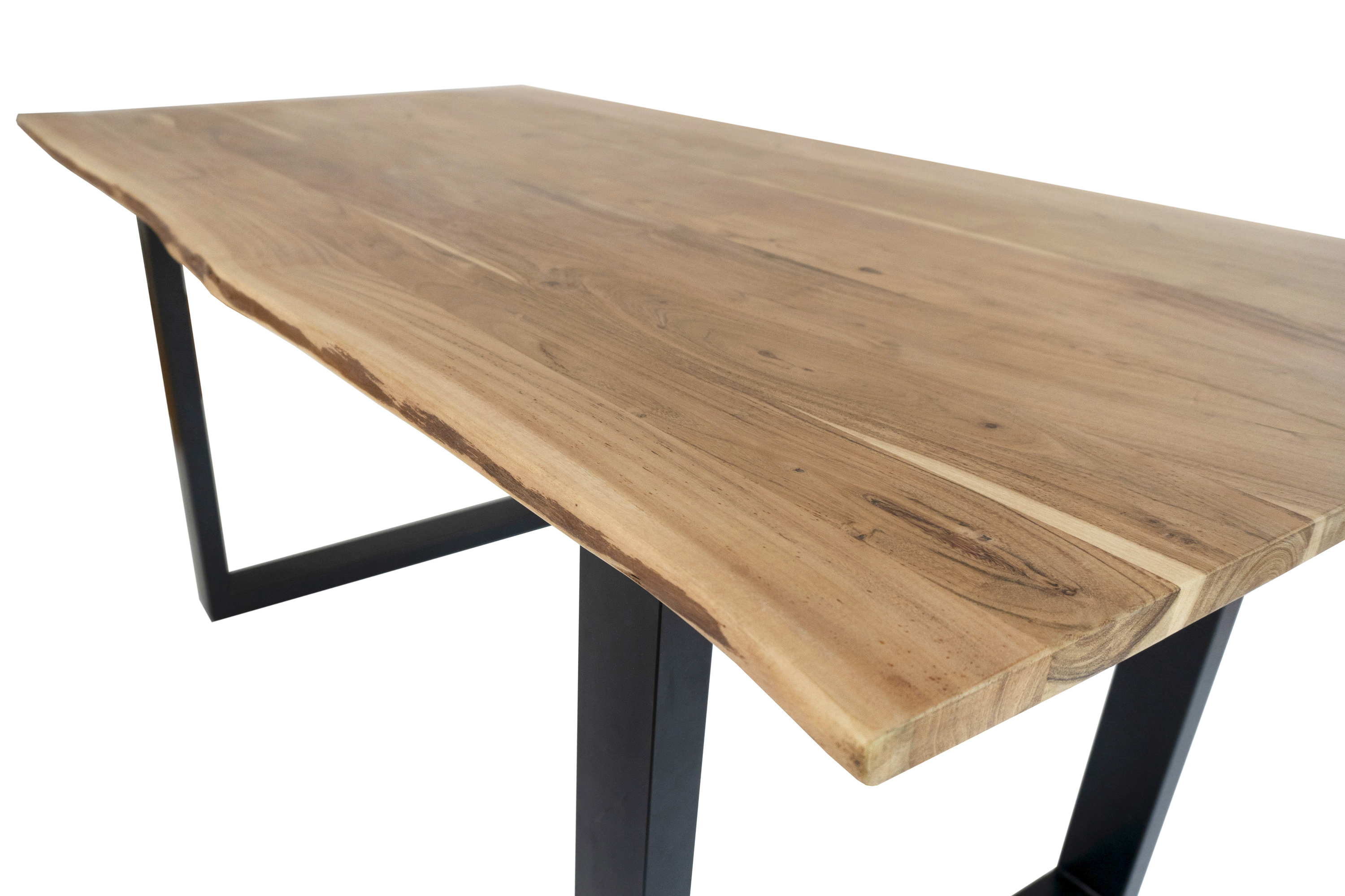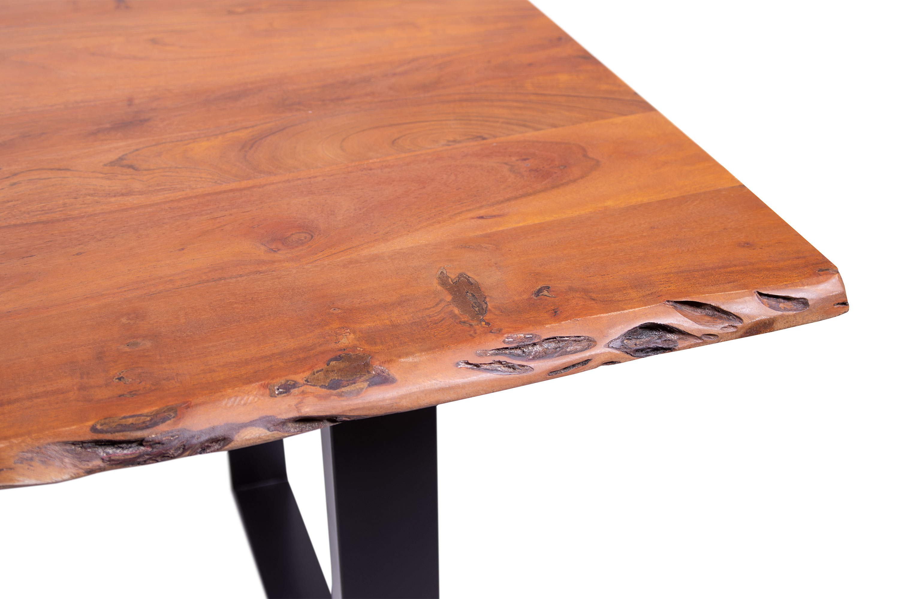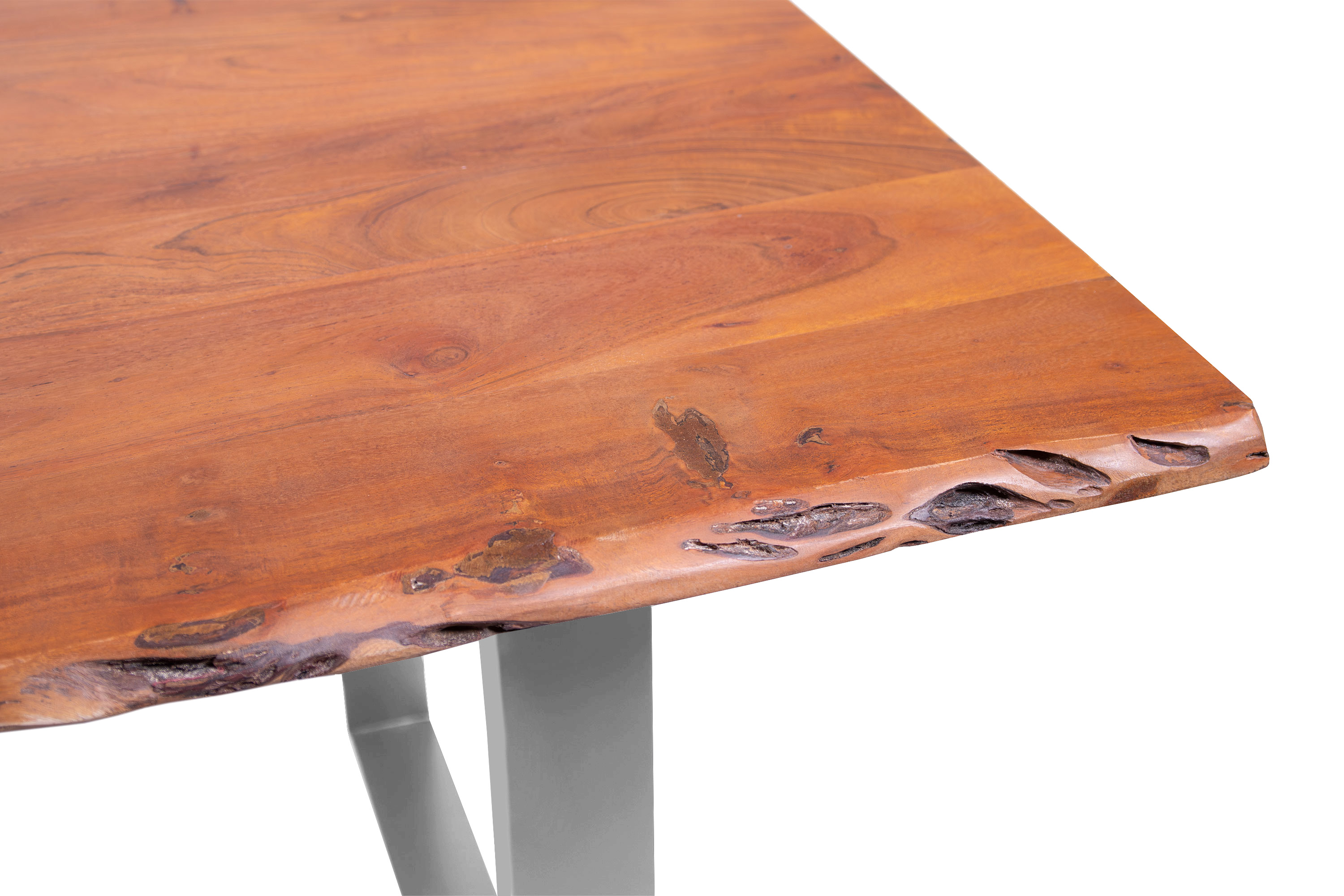Die unterschiedlichen Maserungen und Farbnuancen verleihen dem Tisch seinen einzigartigen Charakter. Die Tischplatte besteht aus 26 mm starken massiven Holzbohlen aus Akazienholz.