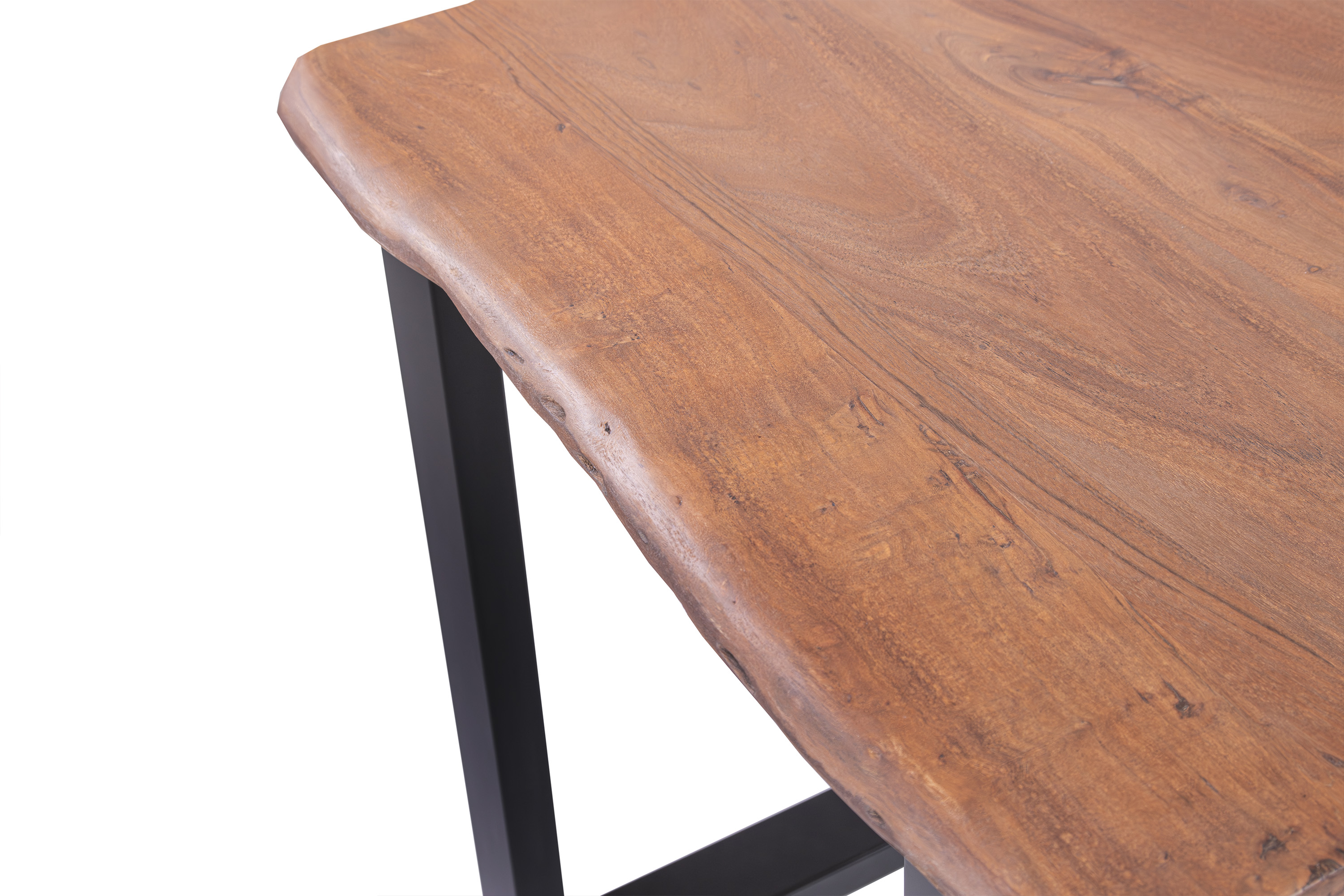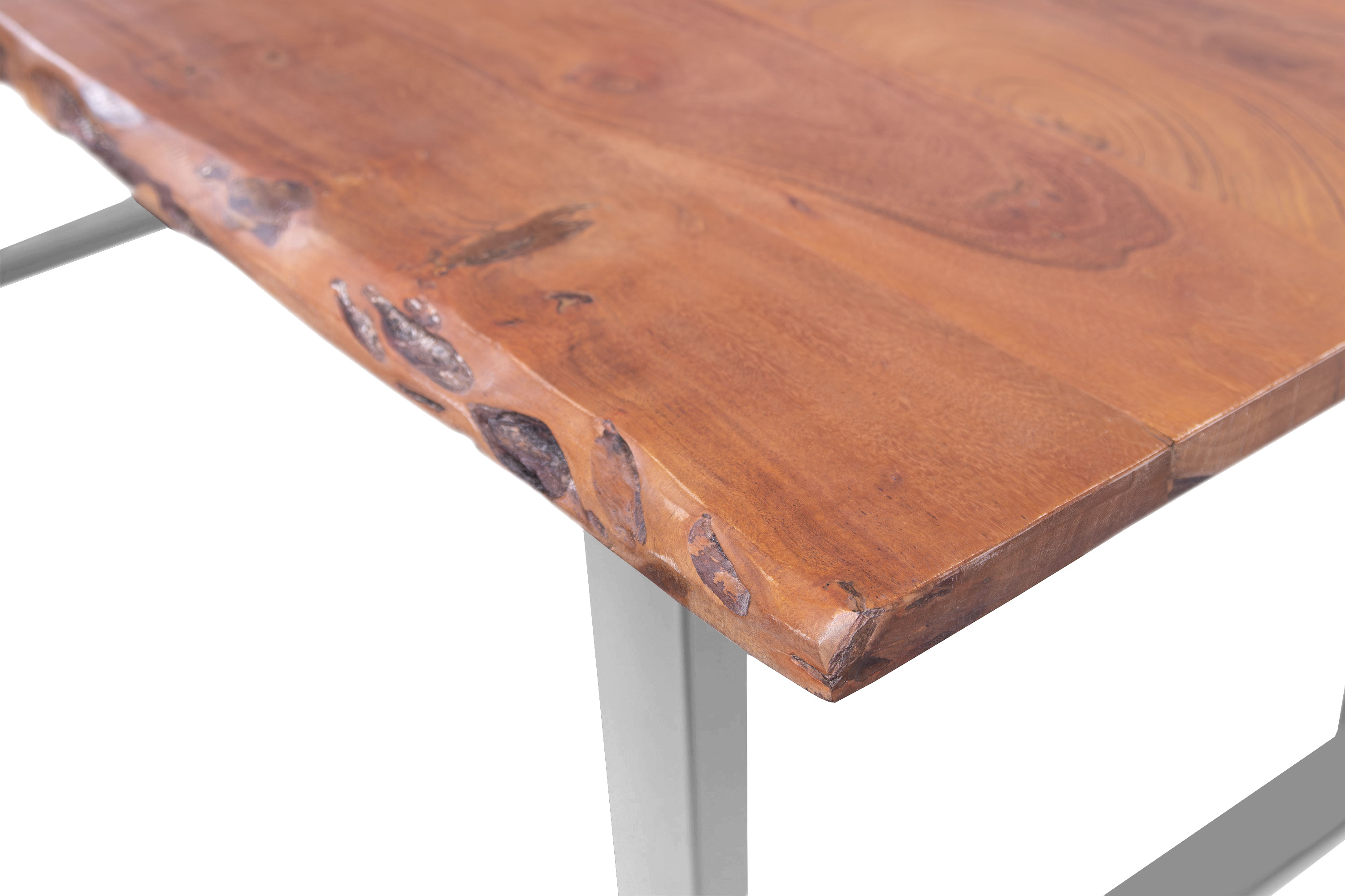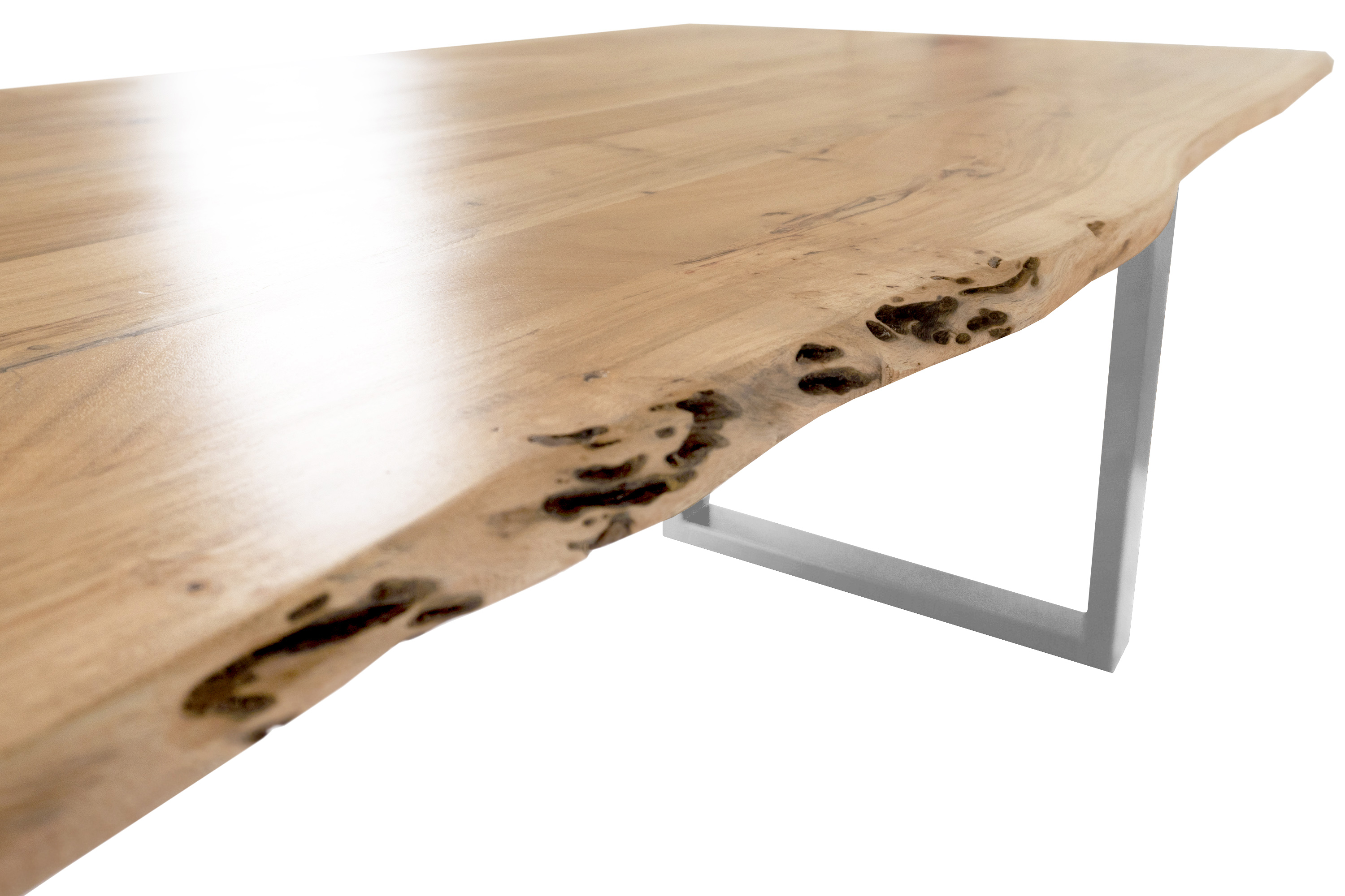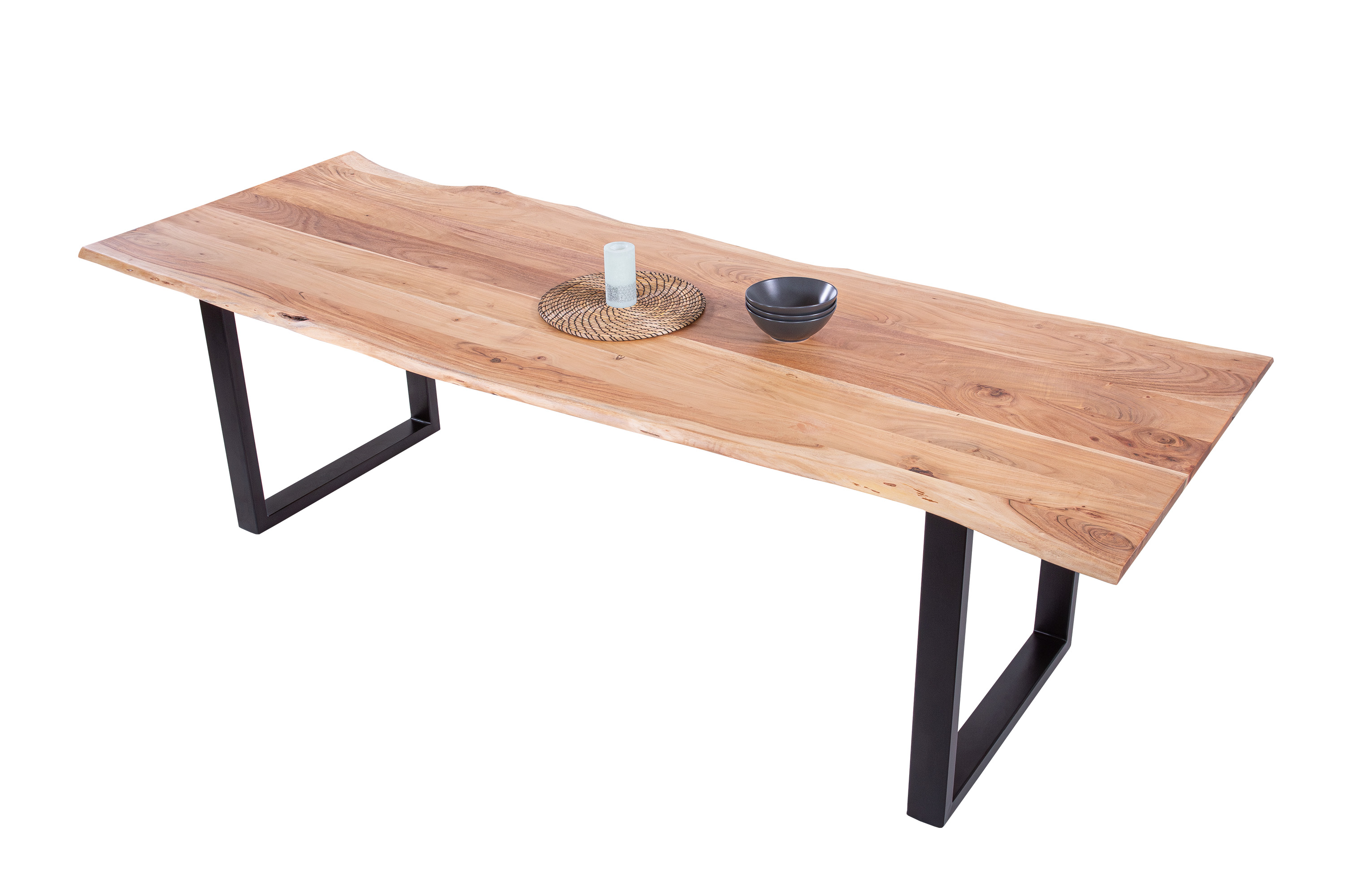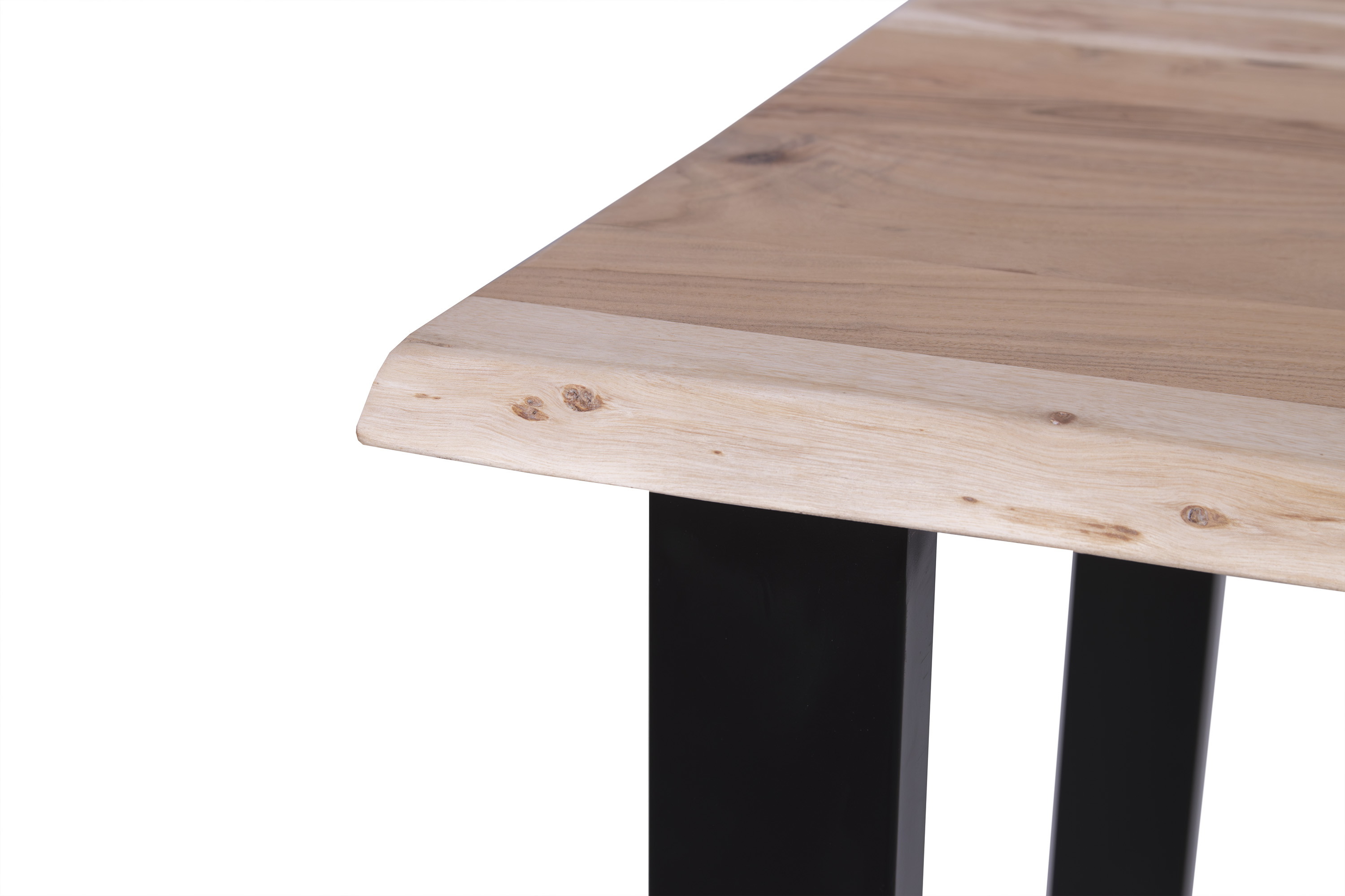 Die unterschiedlichen Maserungen und Farbnuancen verleihen dem Tisch seinen einzigartigen Charakter. Die Tischplatte besteht aus 26 mm starken massiven Holzbohlen aus Akazienholz.