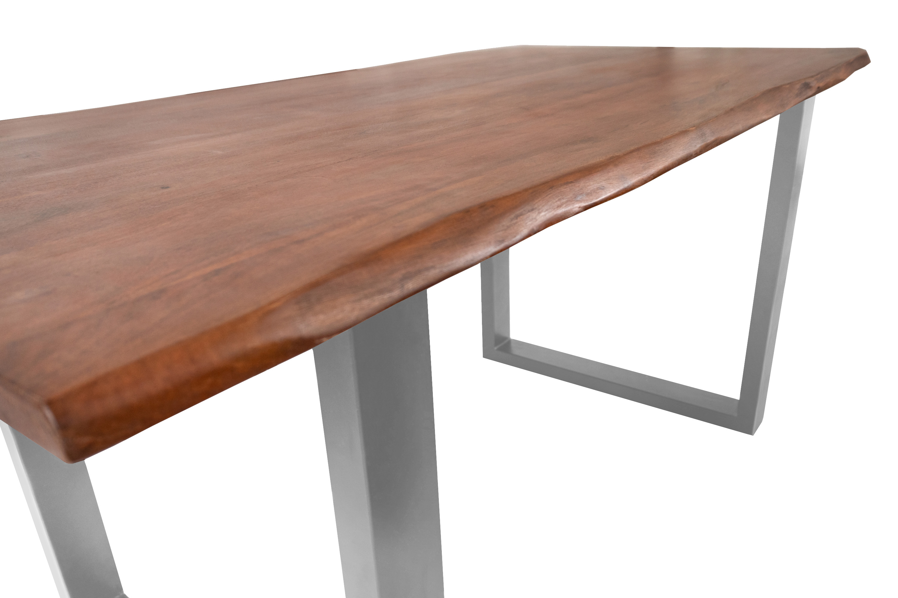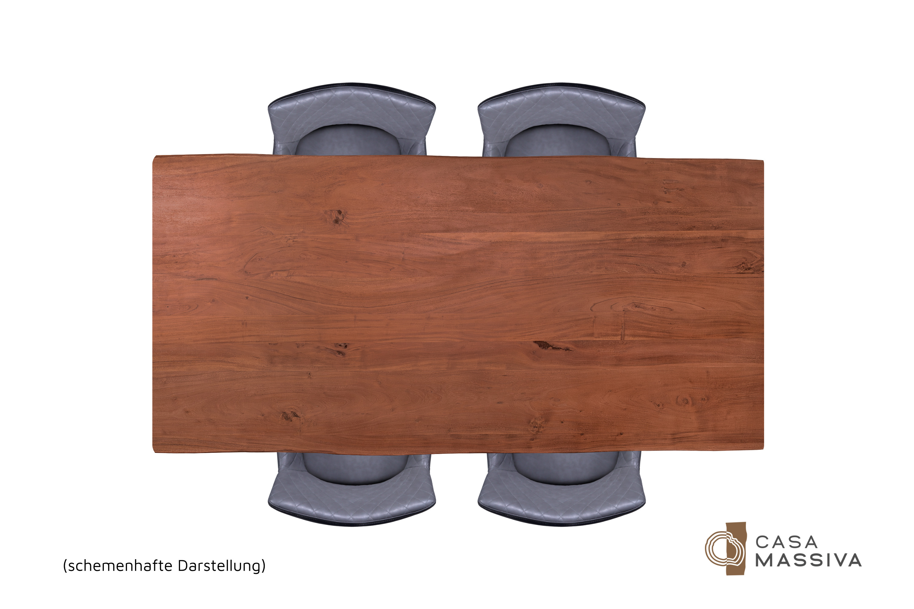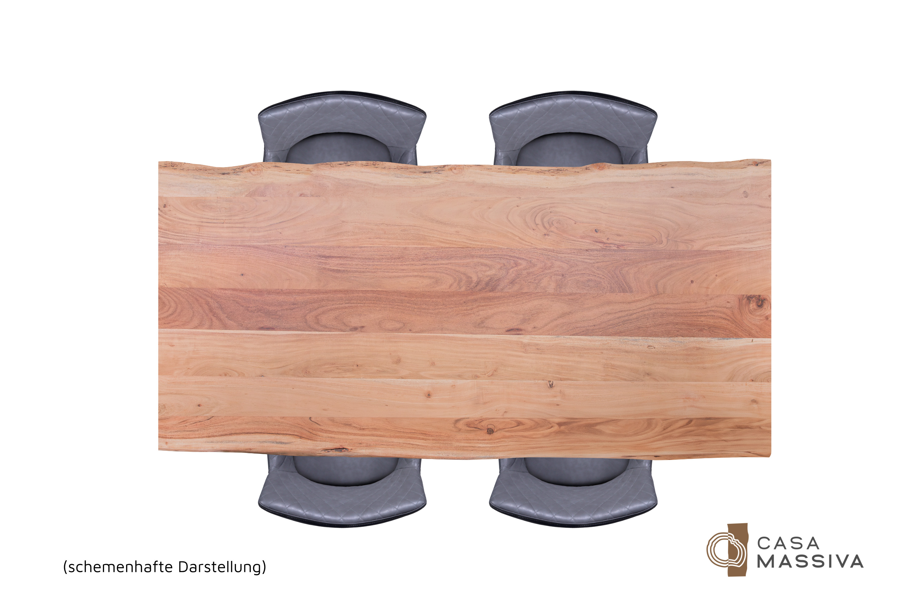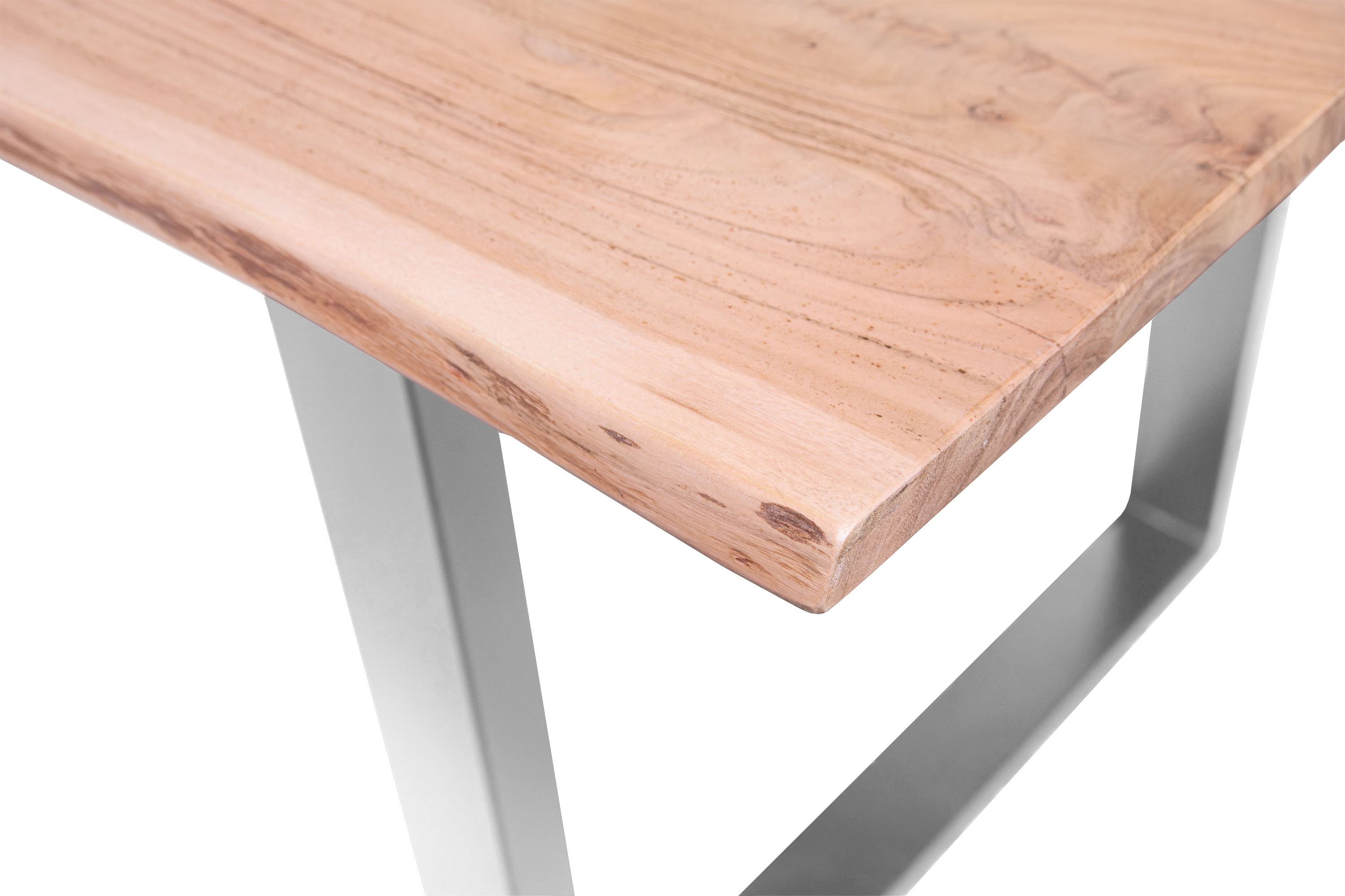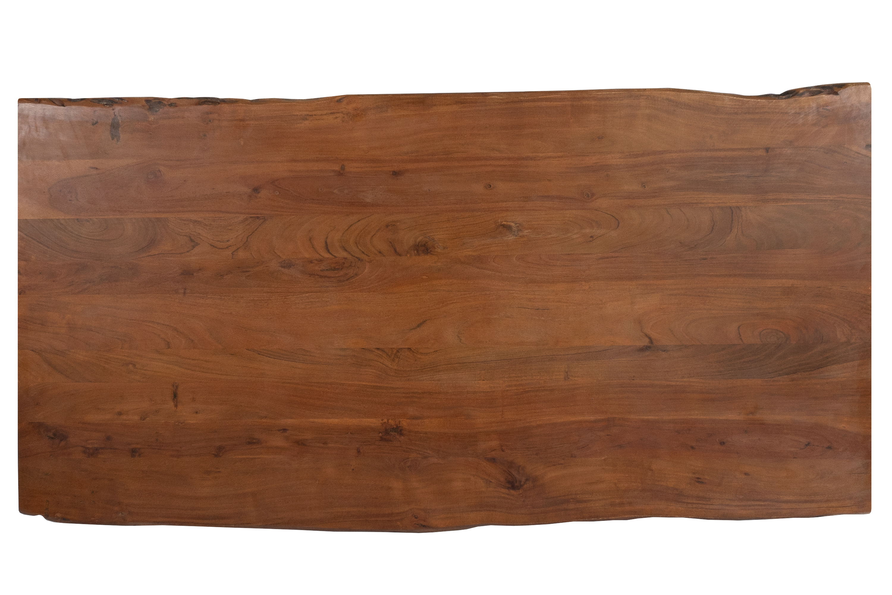 Die unterschiedlichen Maserungen und Farbnuancen verleihen dem Tisch seinen einzigartigen Charakter. Die Tischplatte besteht aus 26 mm starken massiven Holzbohlen aus Akazienholz.