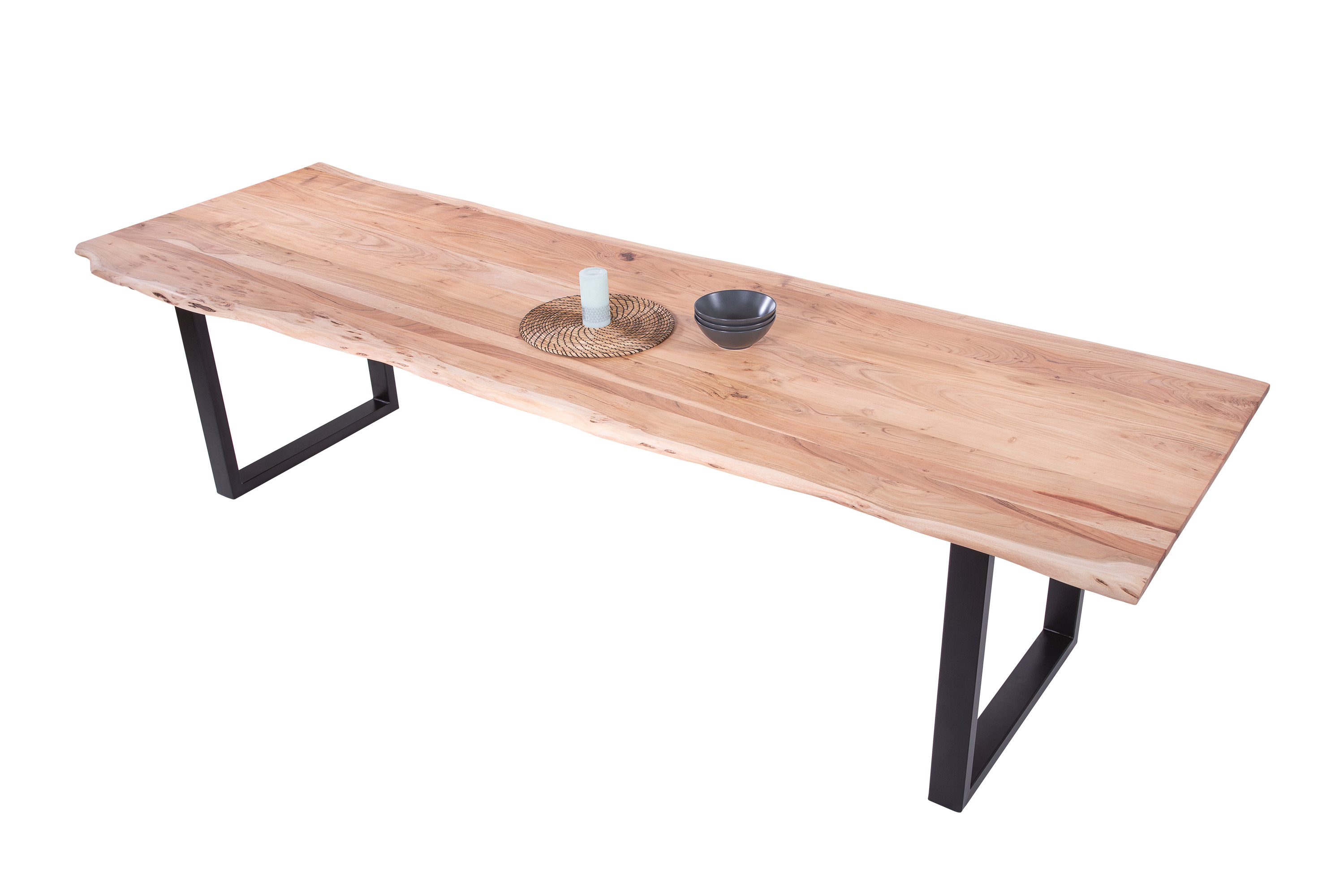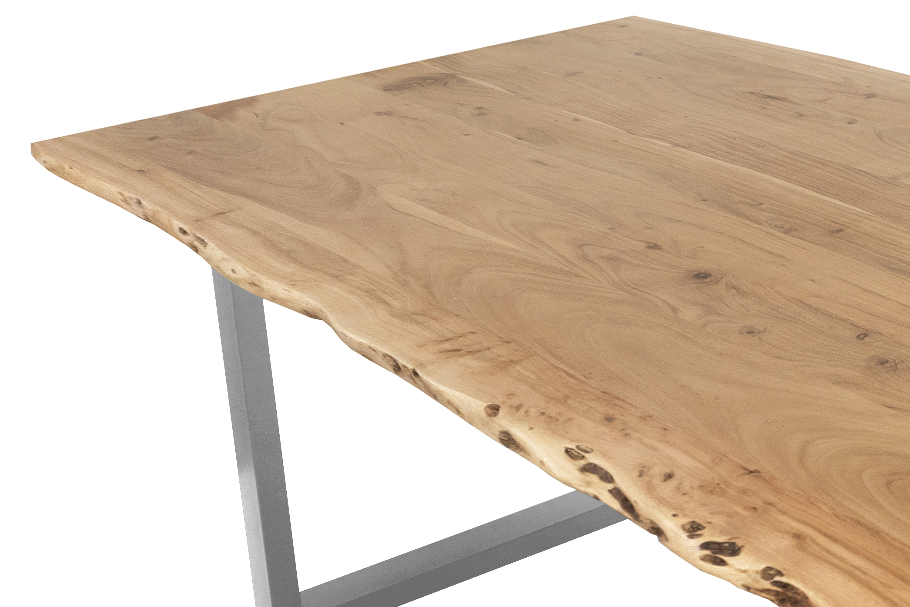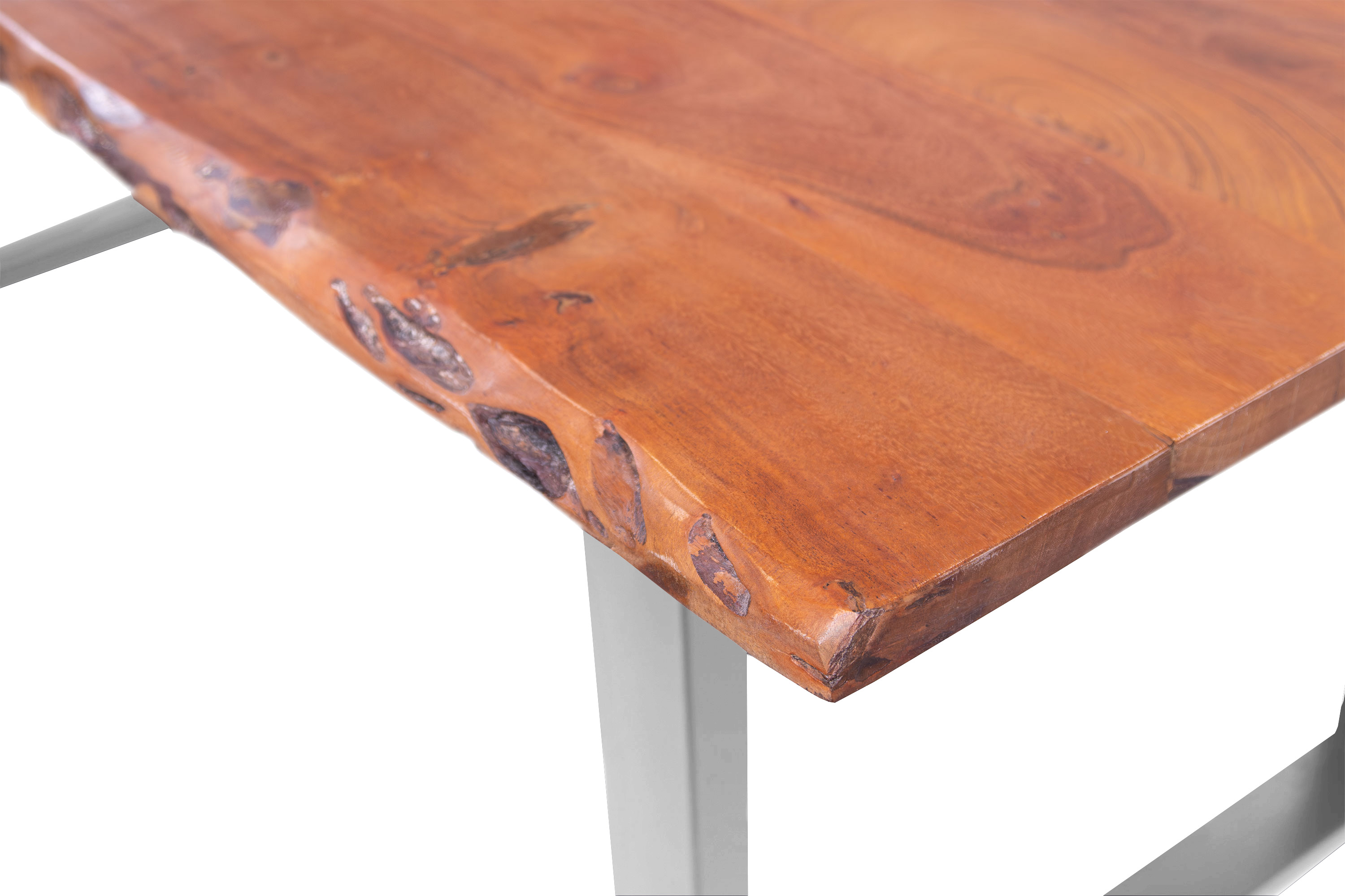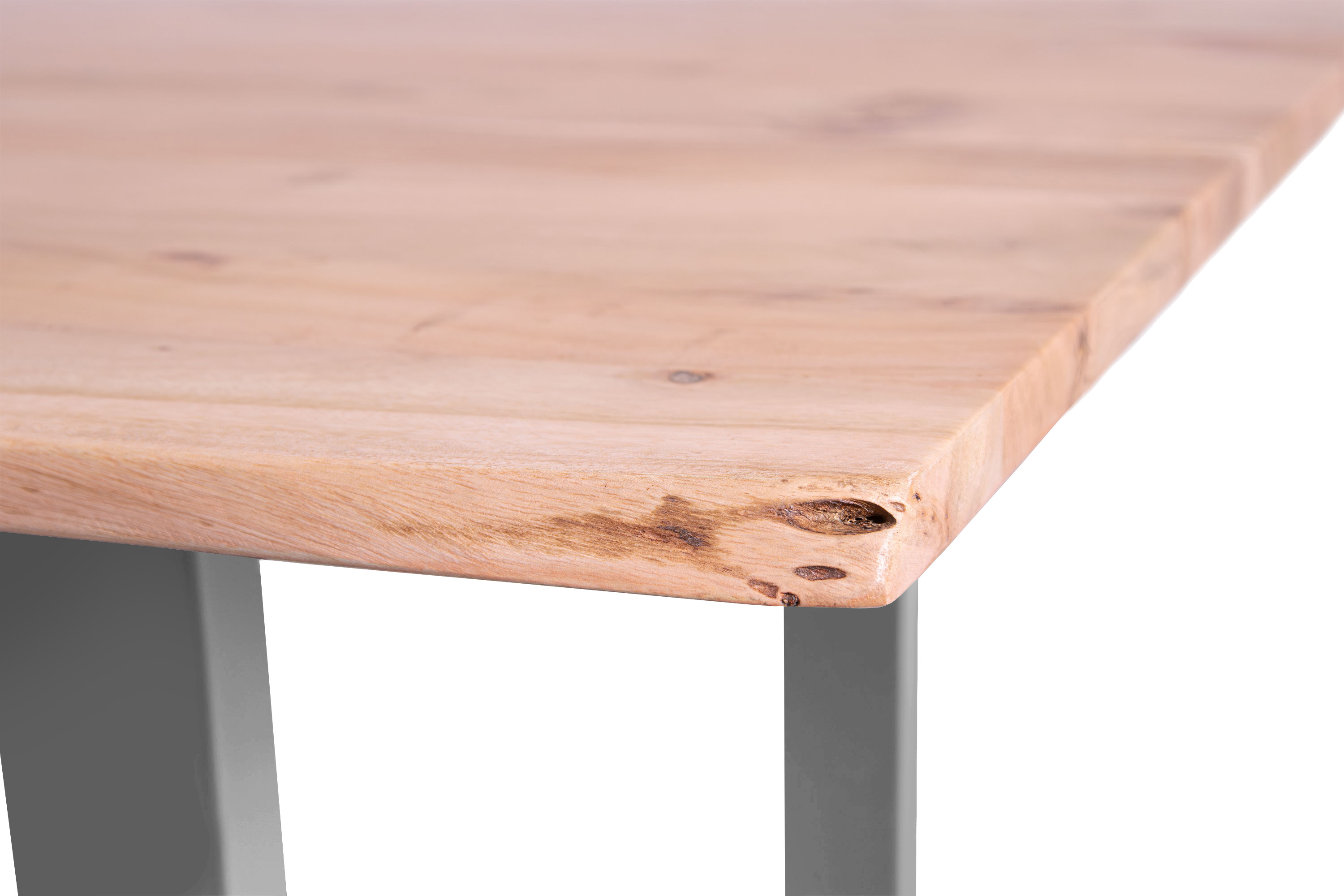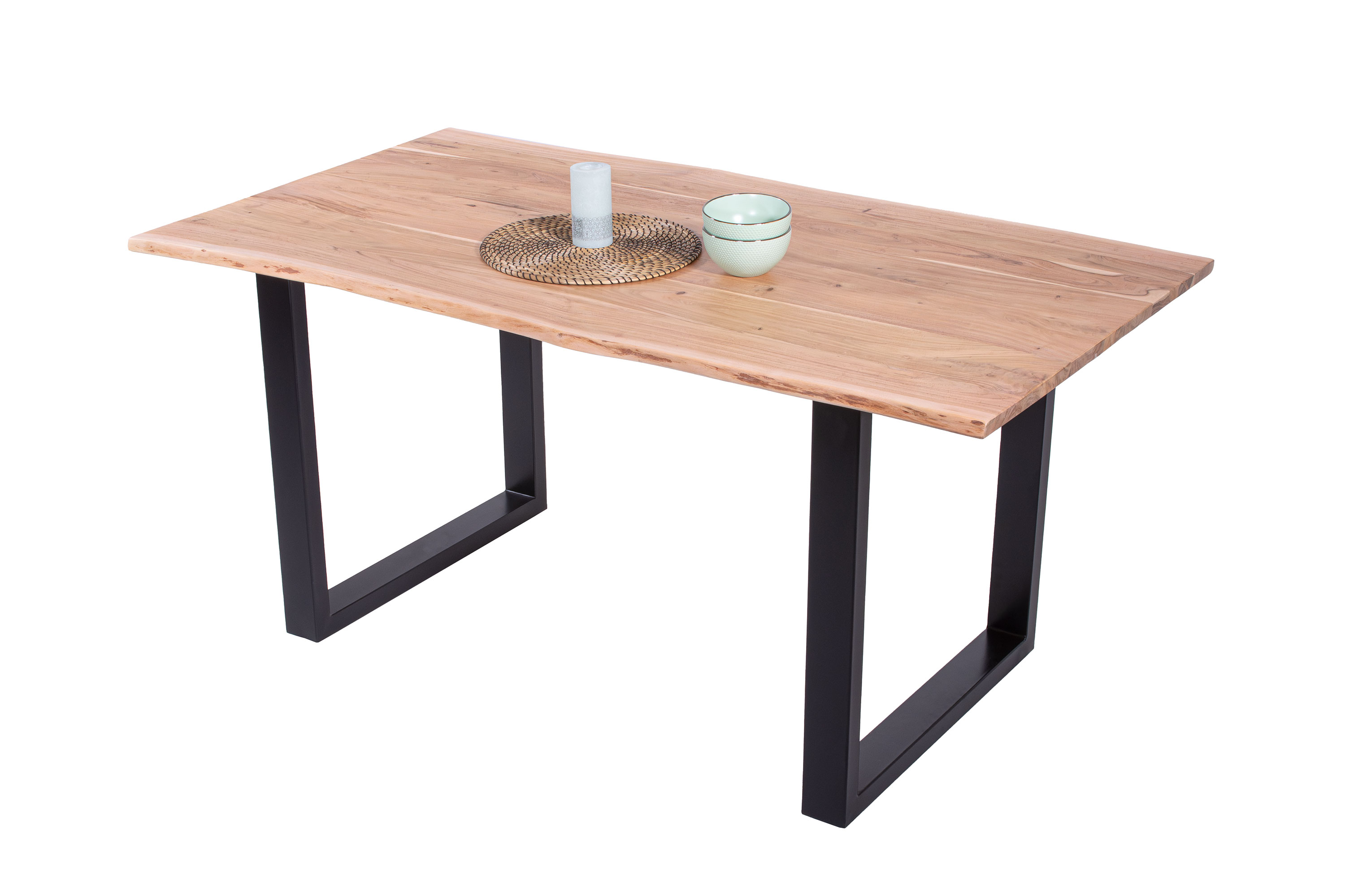 Die unterschiedlichen Maserungen und Farbnuancen verleihen dem Tisch seinen einzigartigen Charakter. Die Tischplatte besteht aus 26 mm starken massiven Holzbohlen aus Akazienholz.
