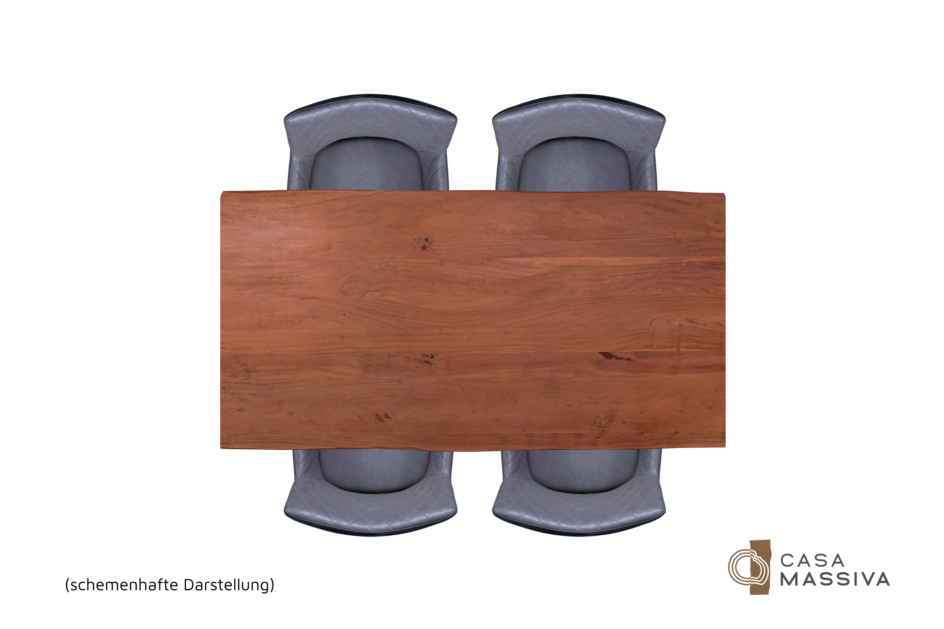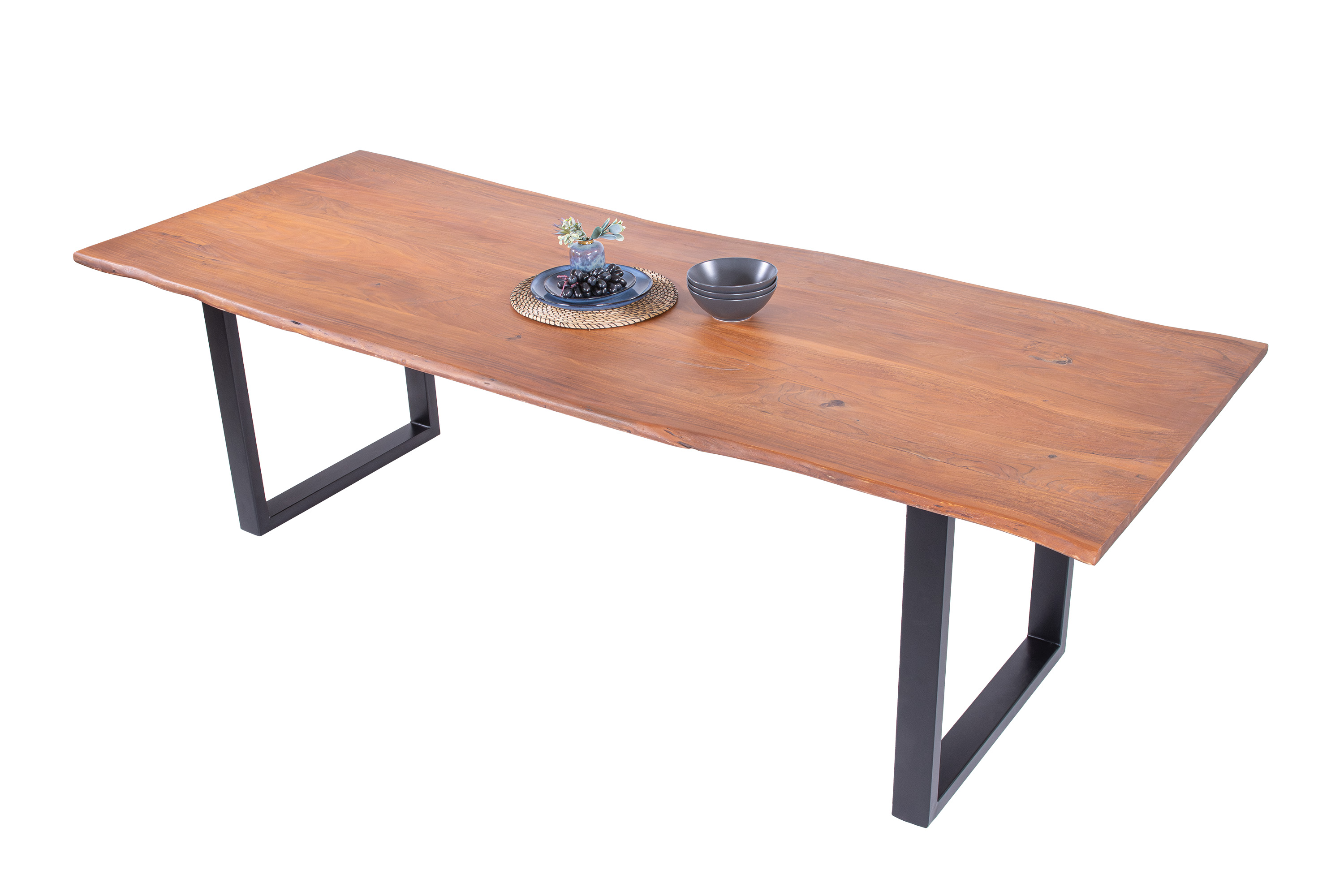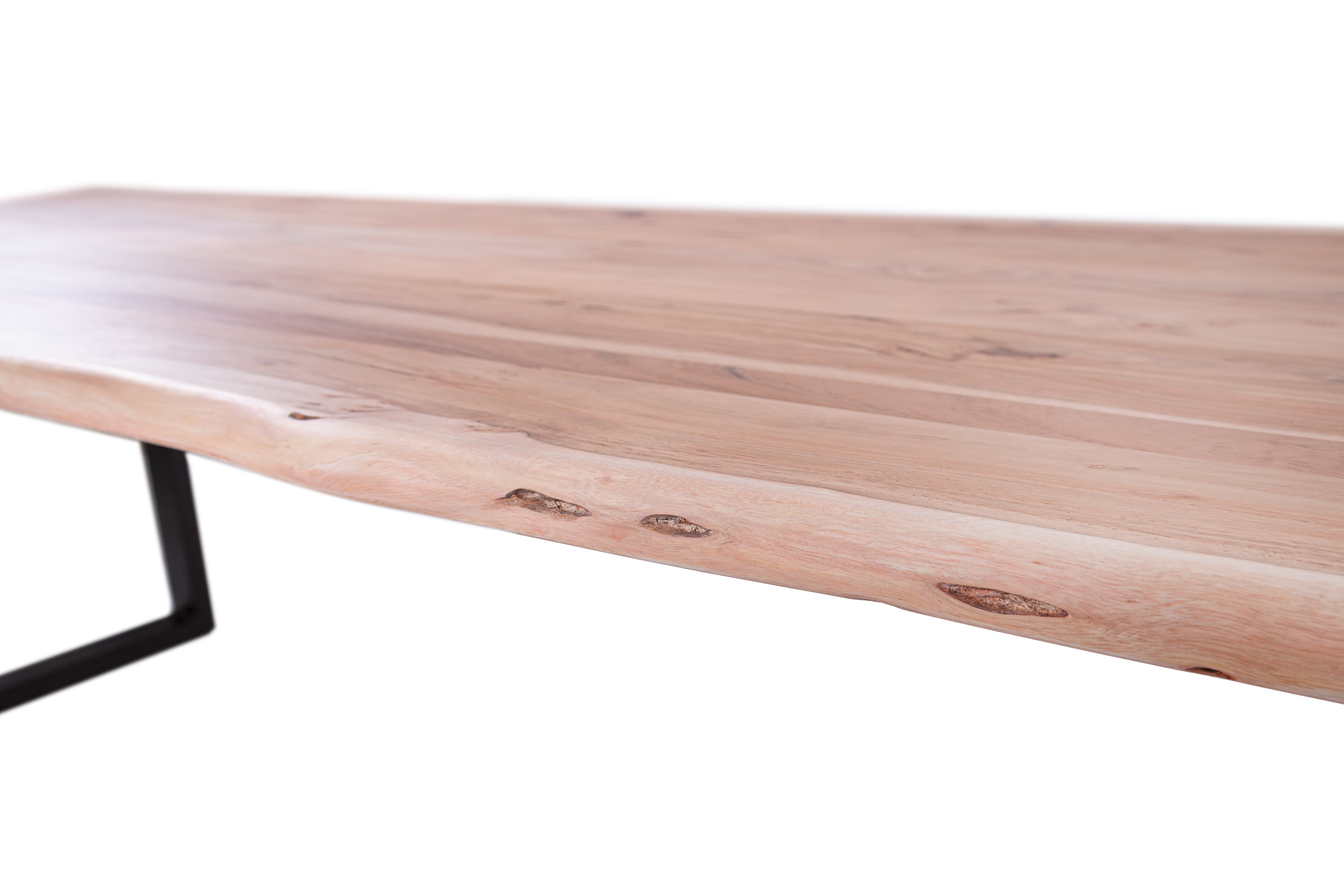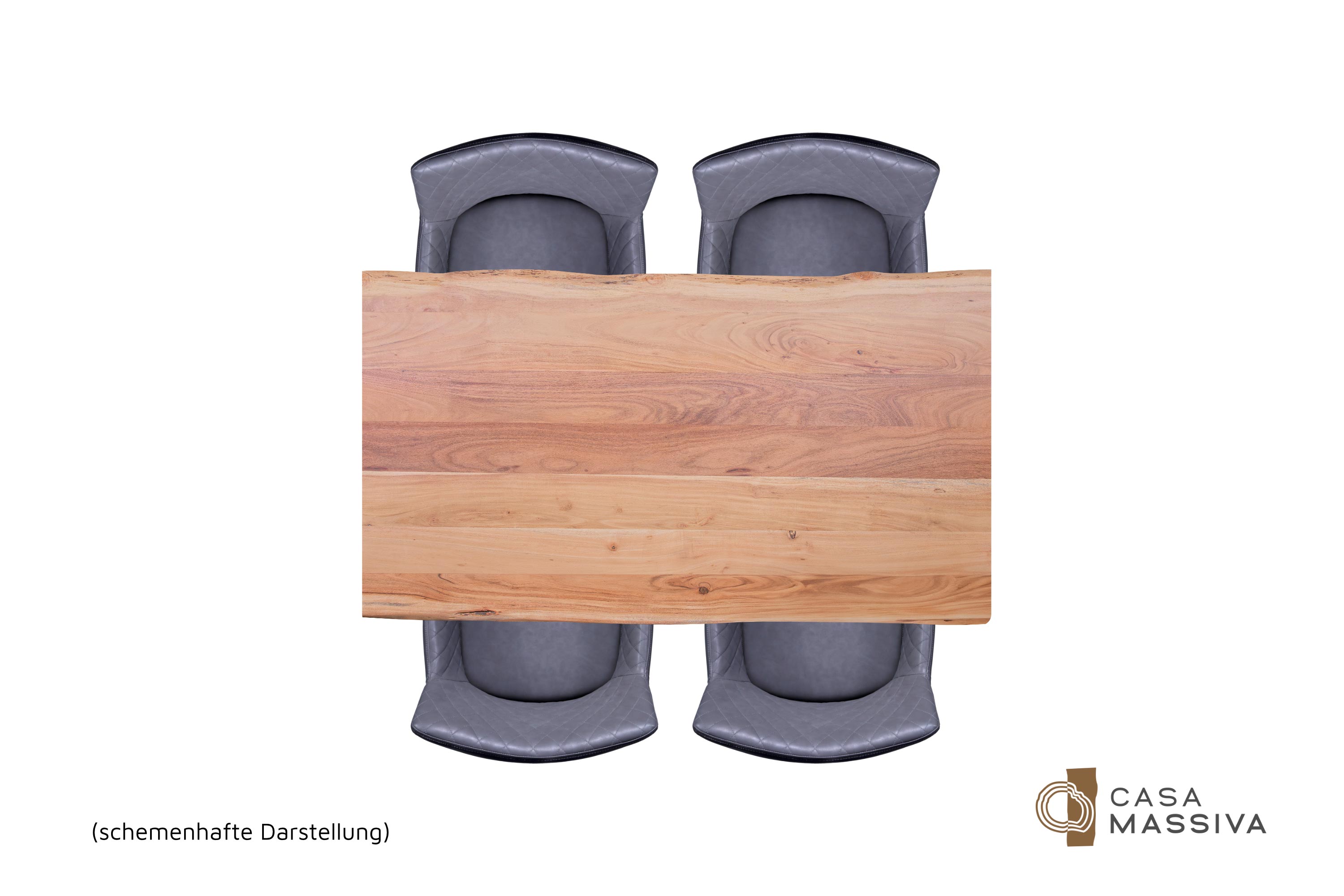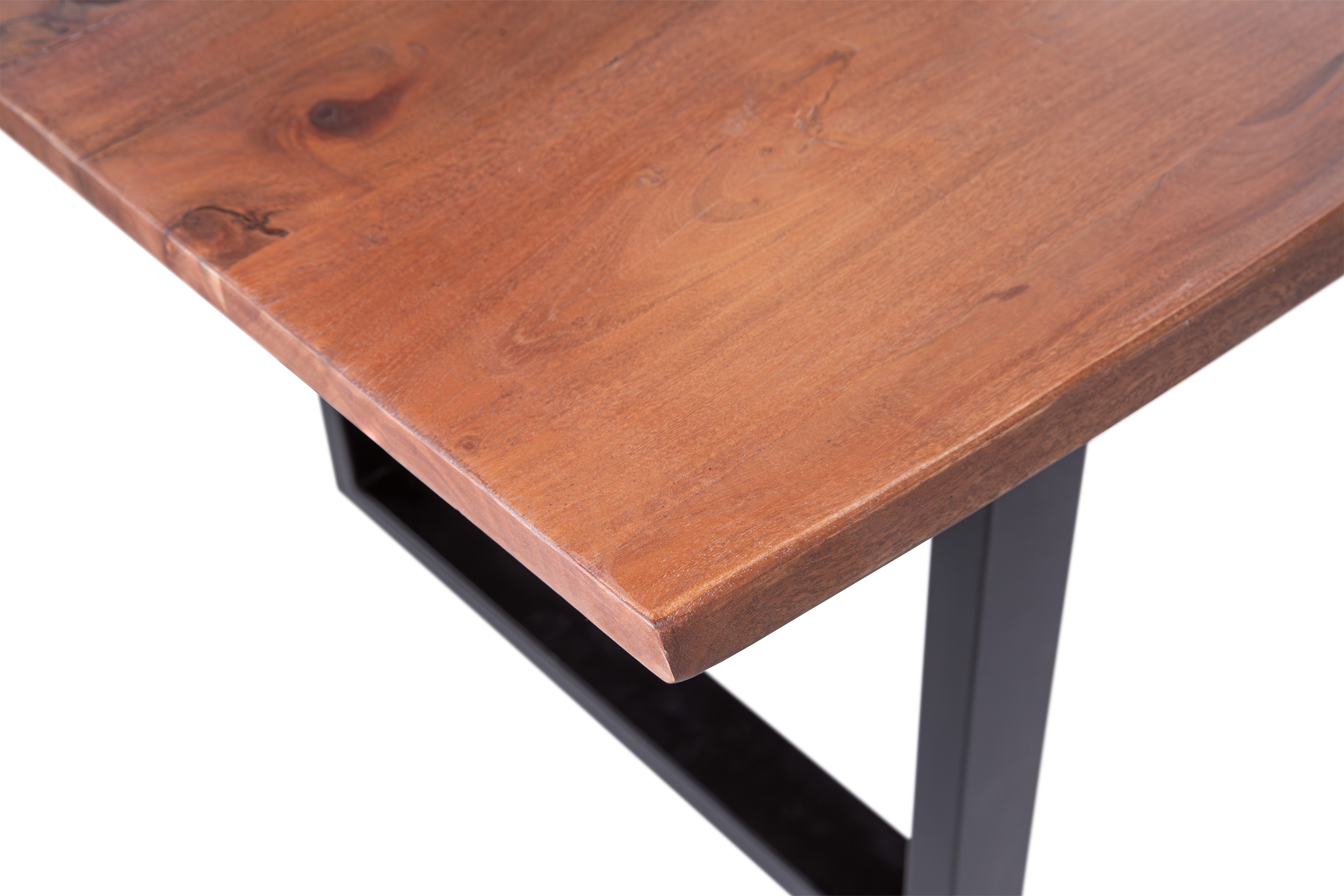 Die unterschiedlichen Maserungen und Farbnuancen verleihen dem Tisch seinen einzigartigen Charakter. Die Tischplatte besteht aus 26 mm starken massiven Holzbohlen aus Akazienholz.