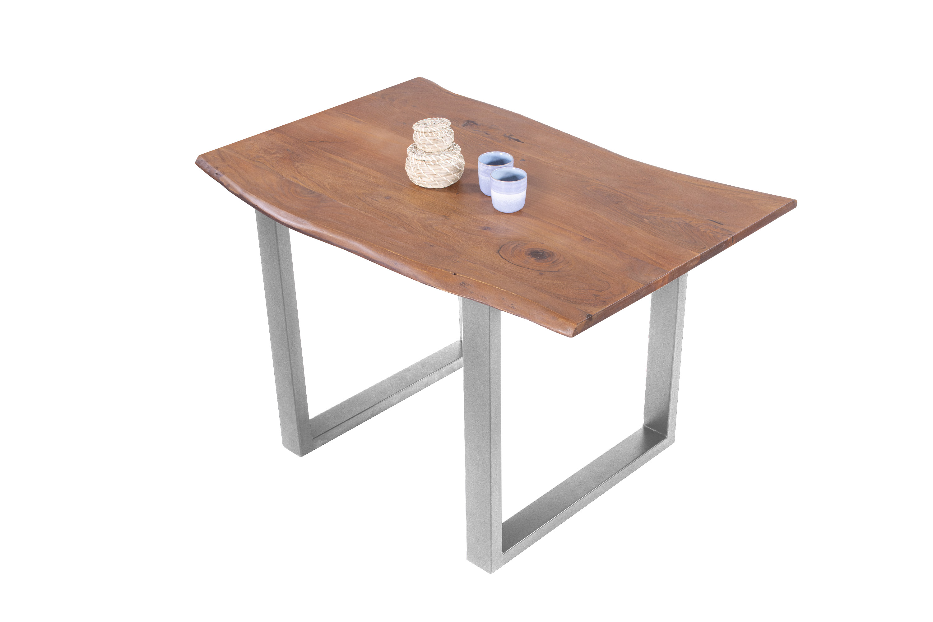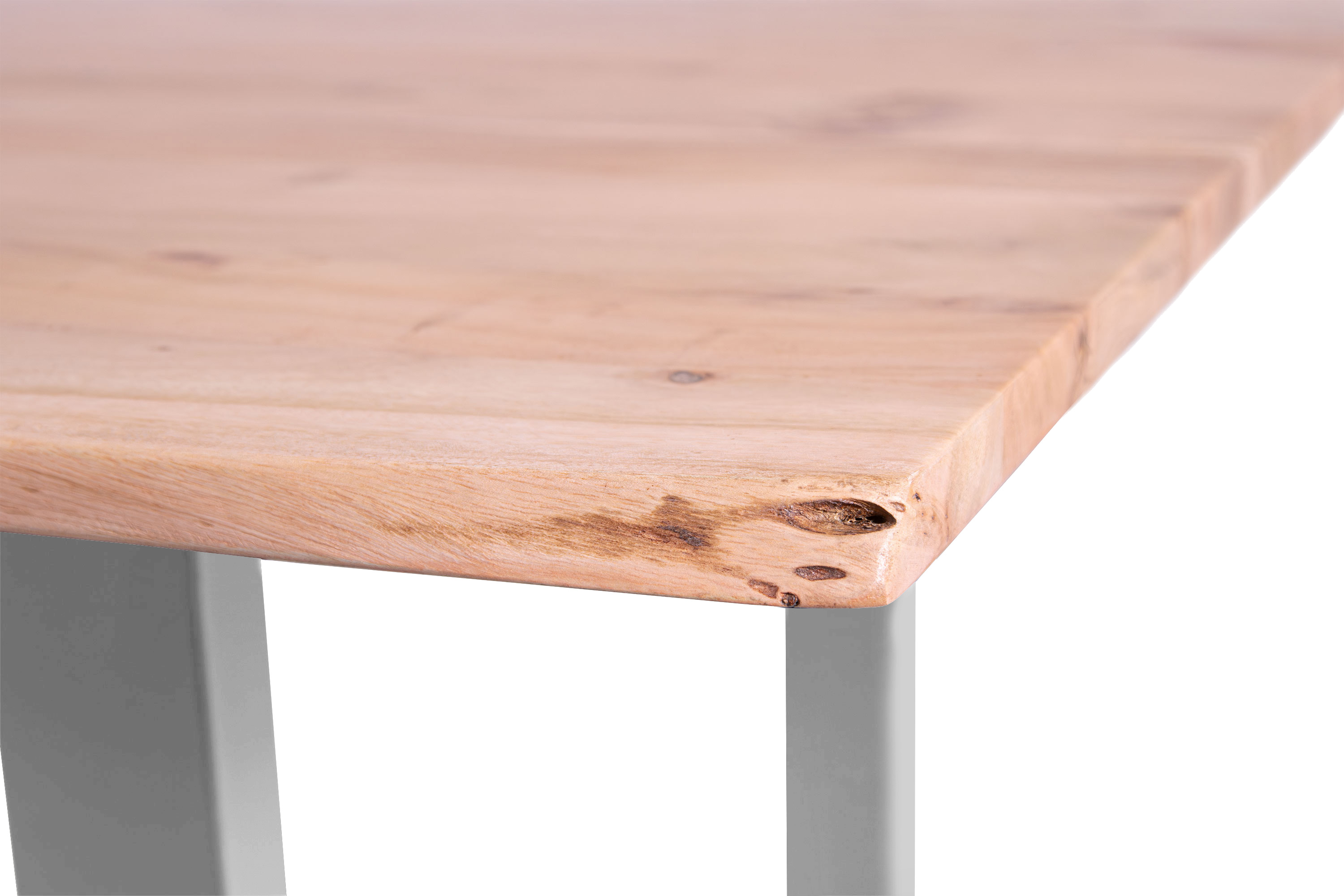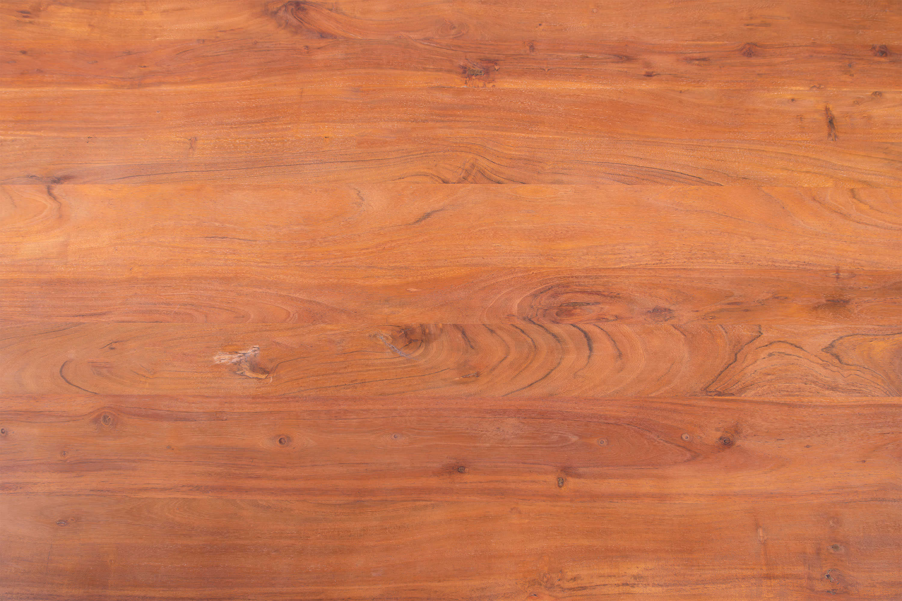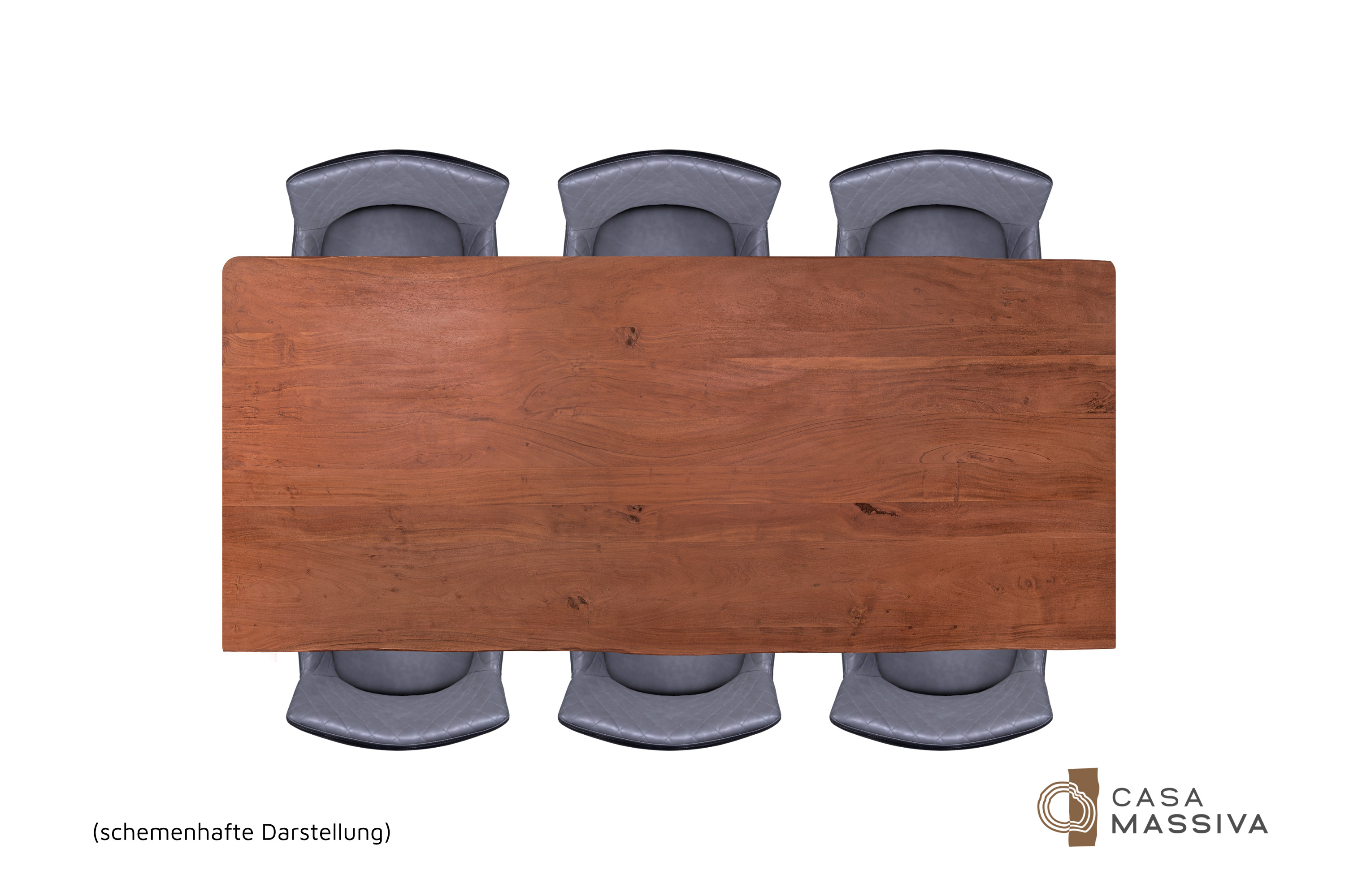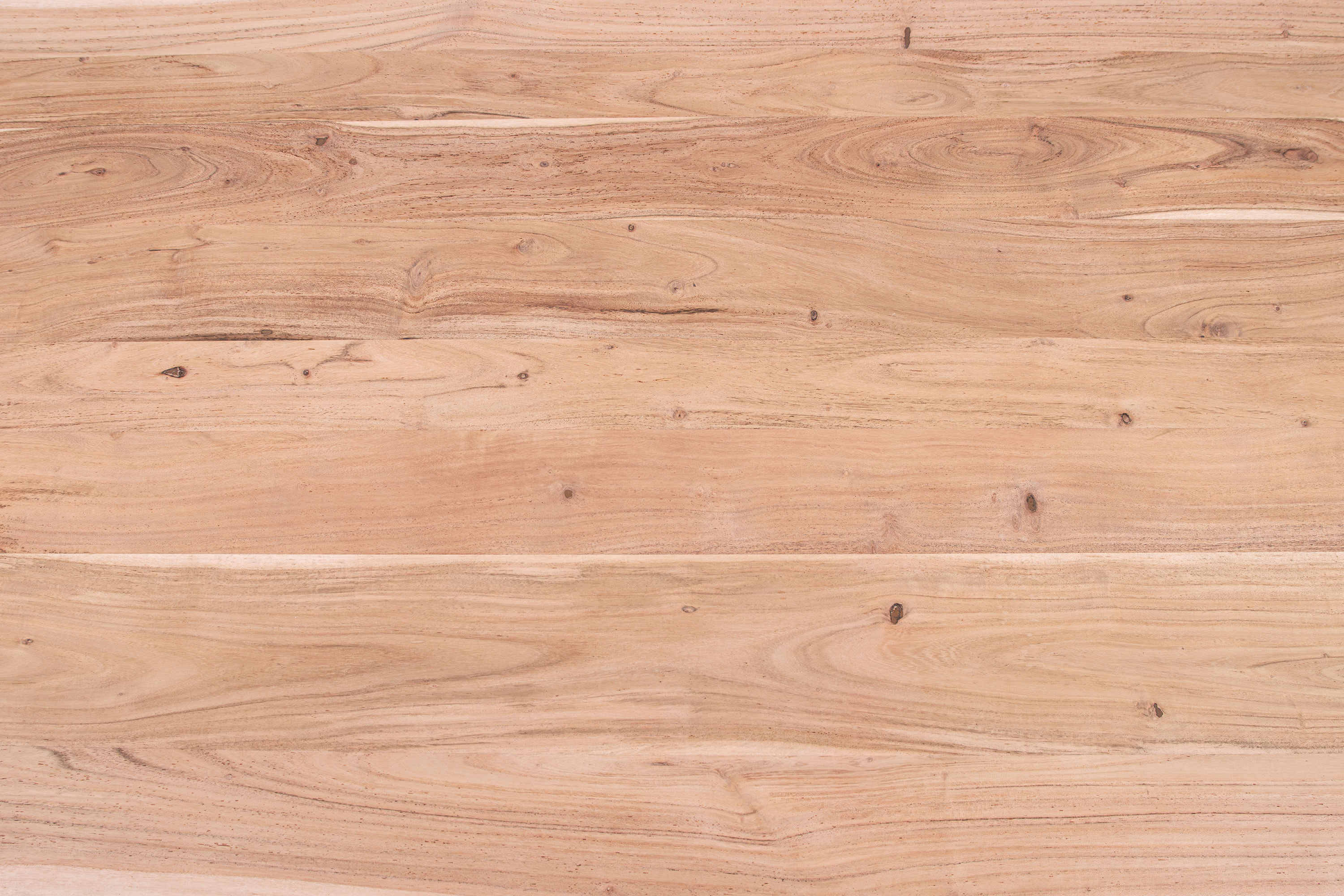 Die unterschiedlichen Maserungen und Farbnuancen verleihen dem Tisch seinen einzigartigen Charakter. Die Tischplatte besteht aus 26 mm starken massiven Holzbohlen aus Akazienholz.