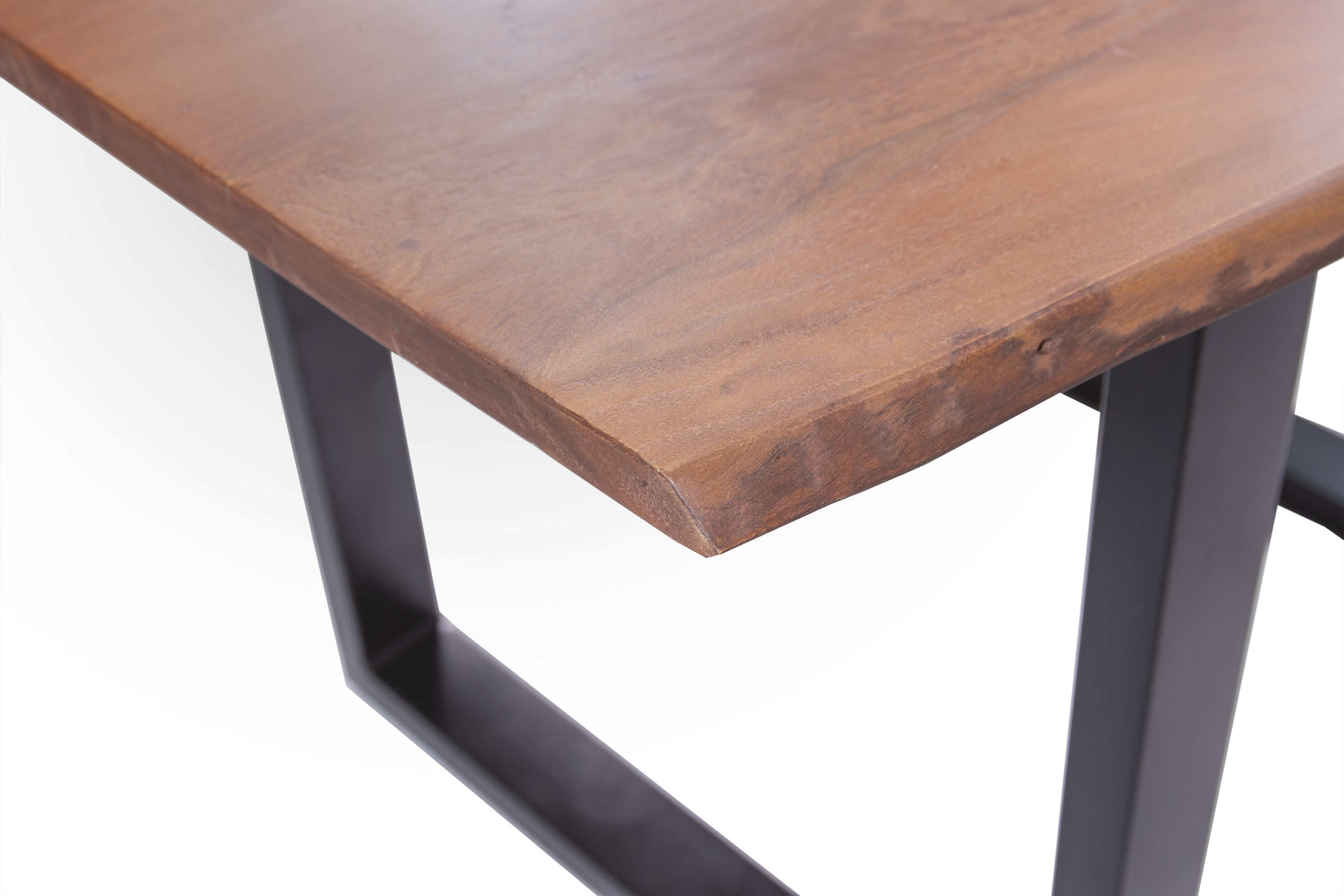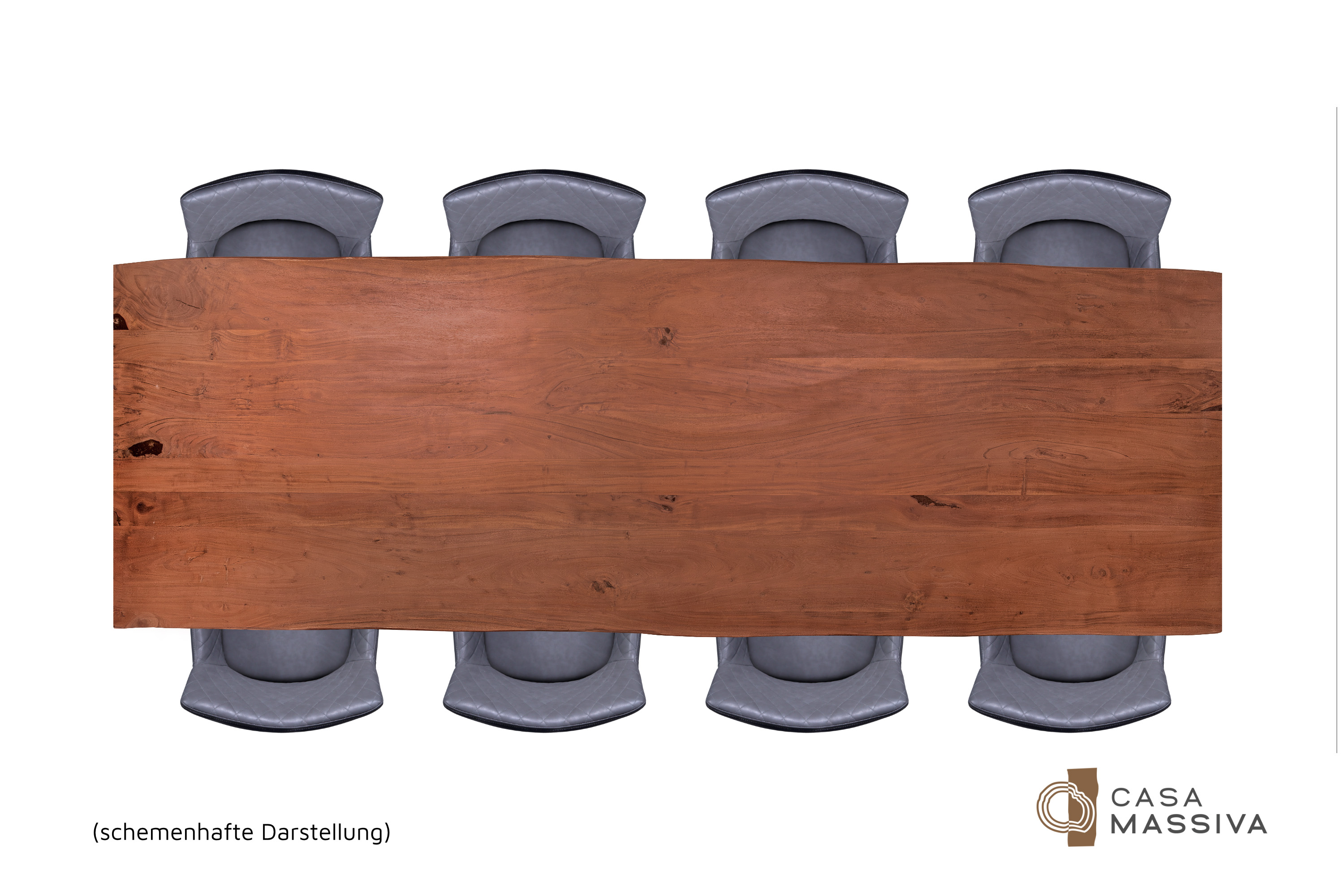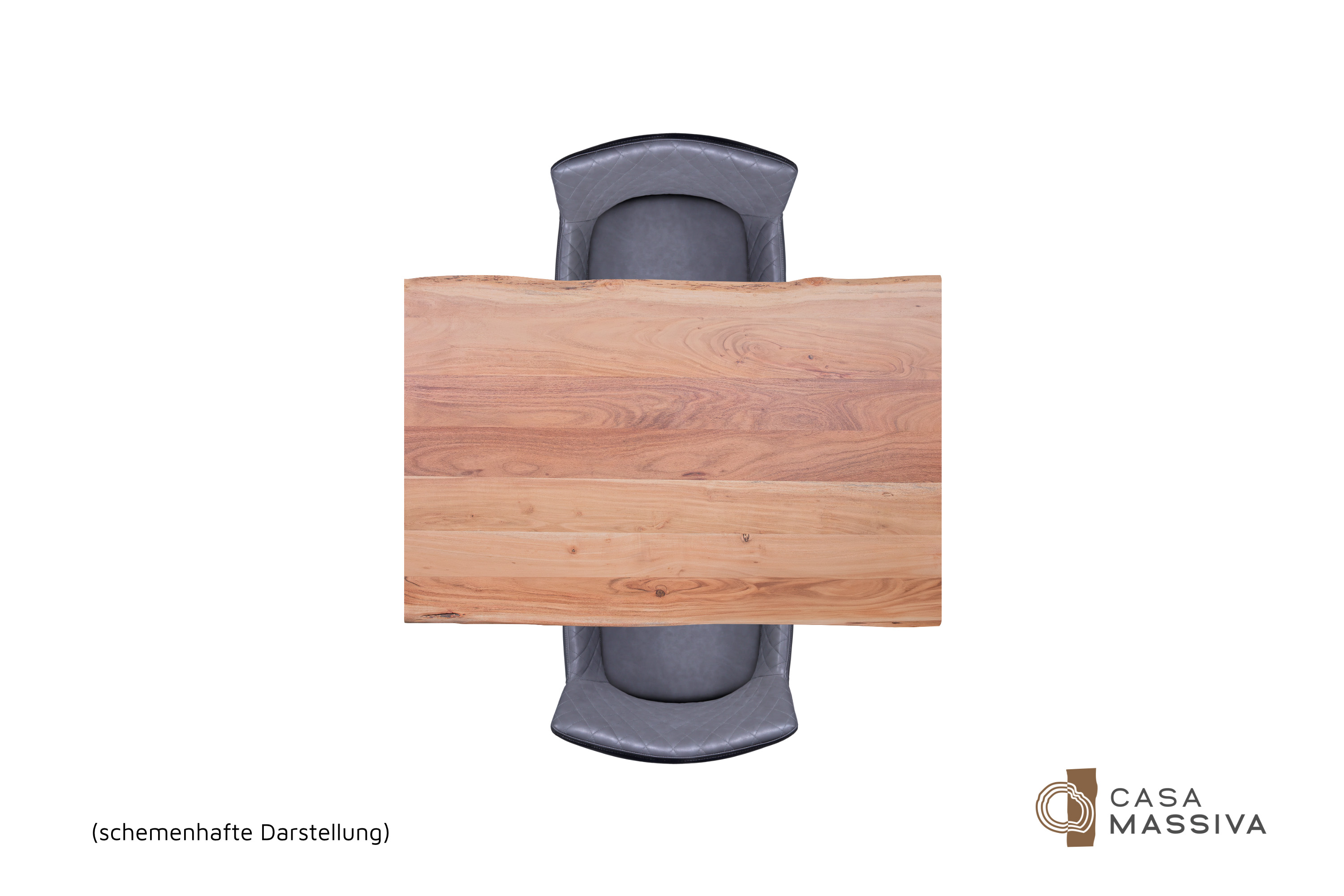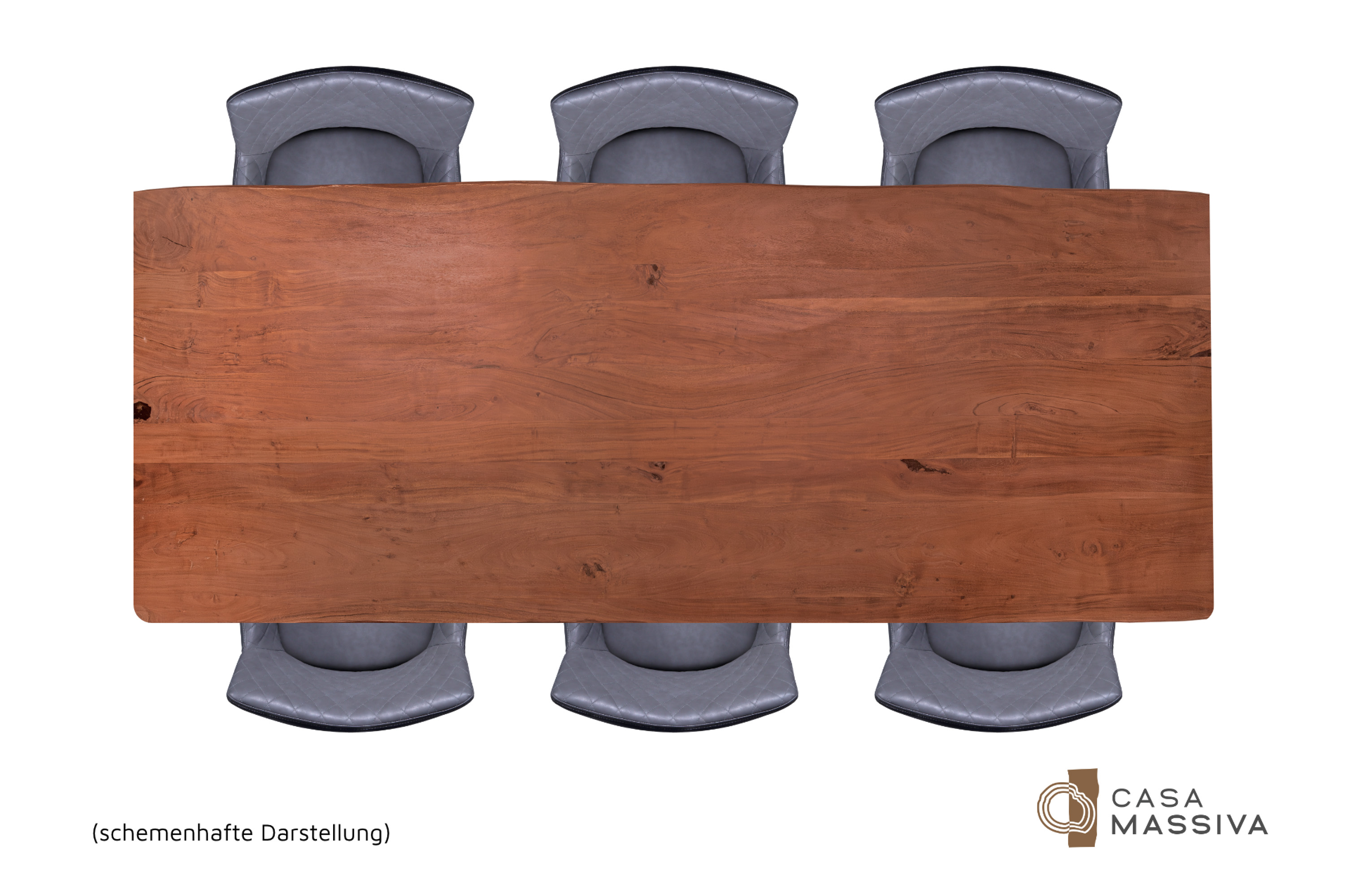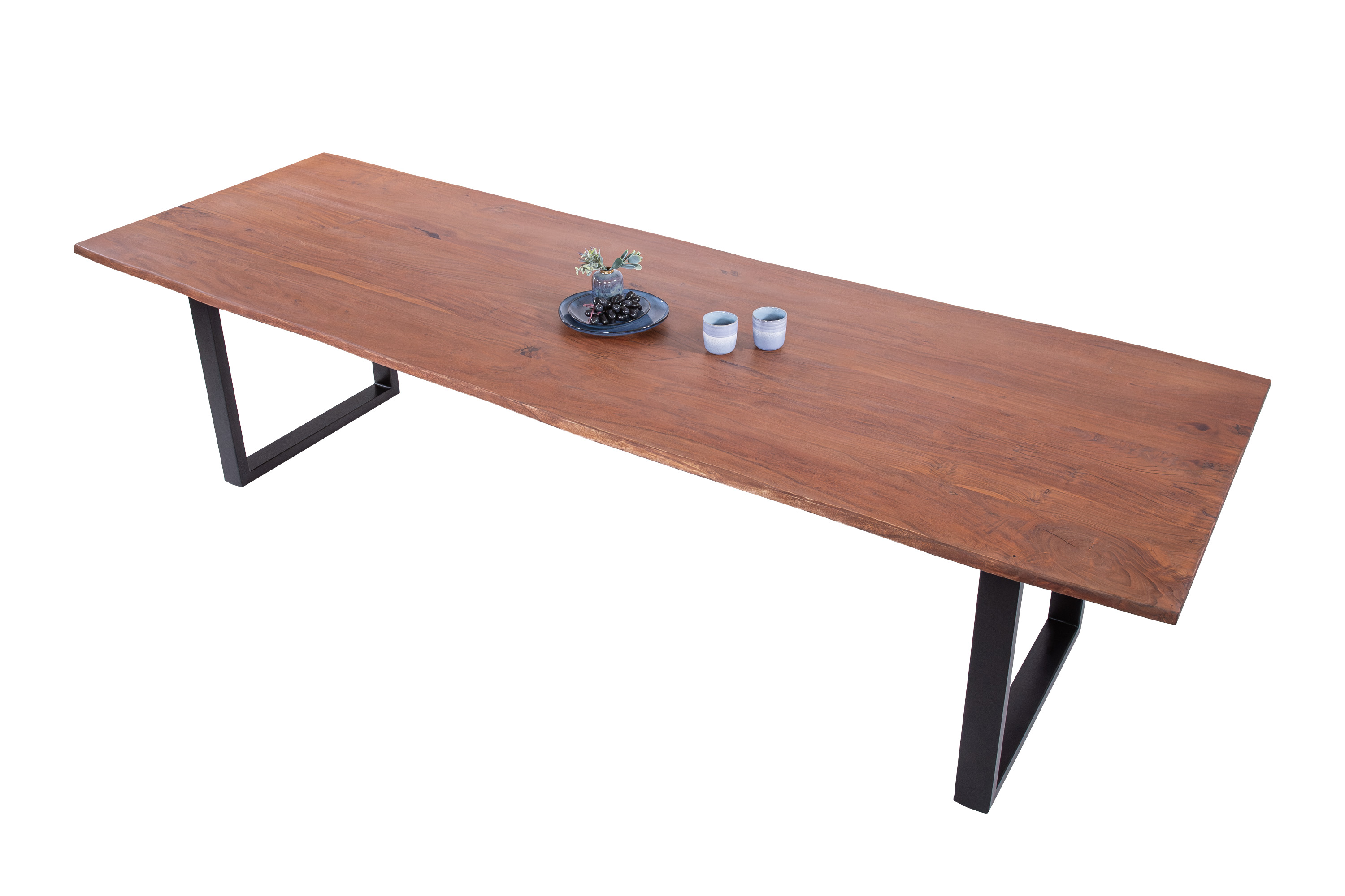 Die unterschiedlichen Maserungen und Farbnuancen verleihen dem Tisch seinen einzigartigen Charakter. Die Tischplatte besteht aus 26 mm starken massiven Holzbohlen aus Akazienholz.