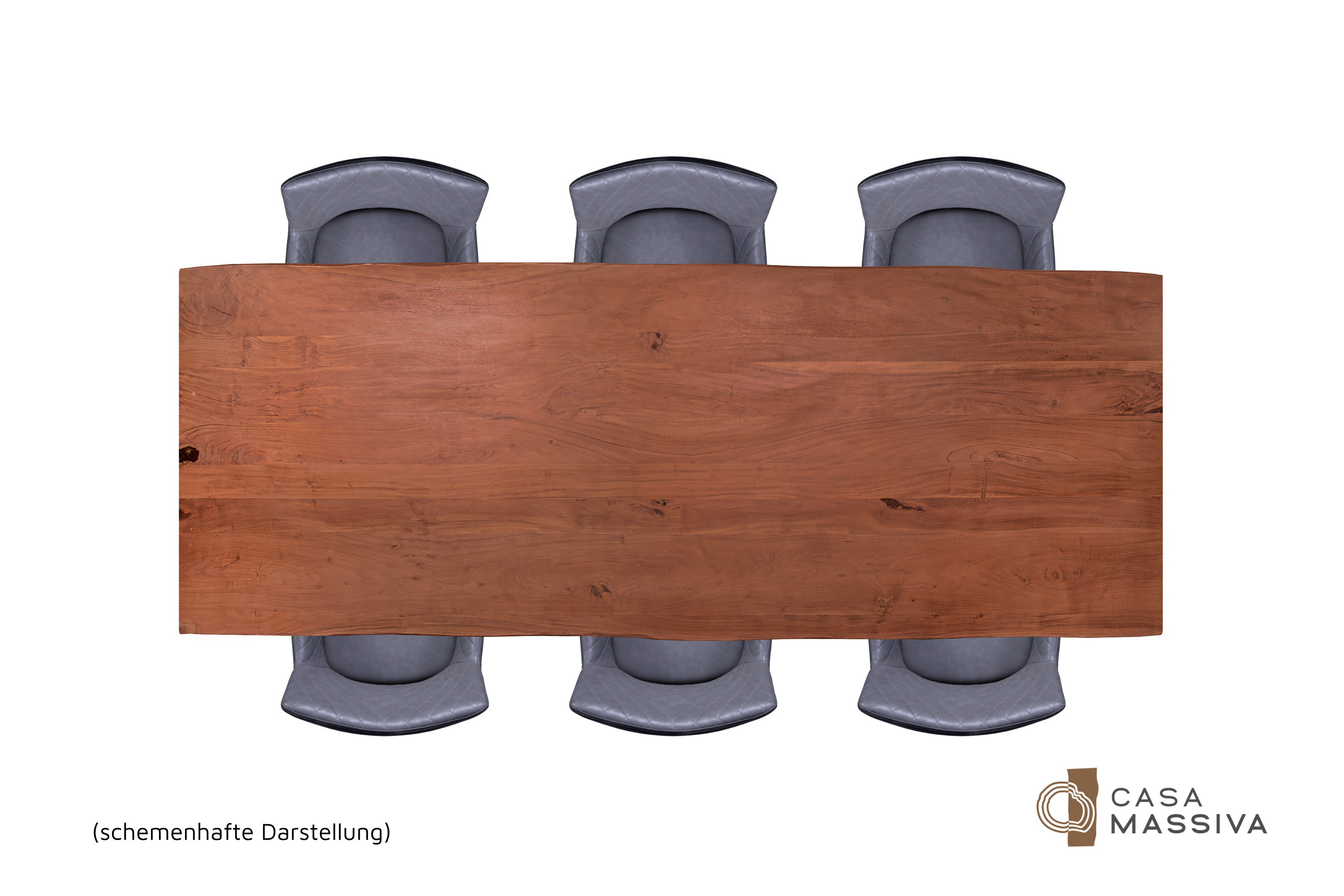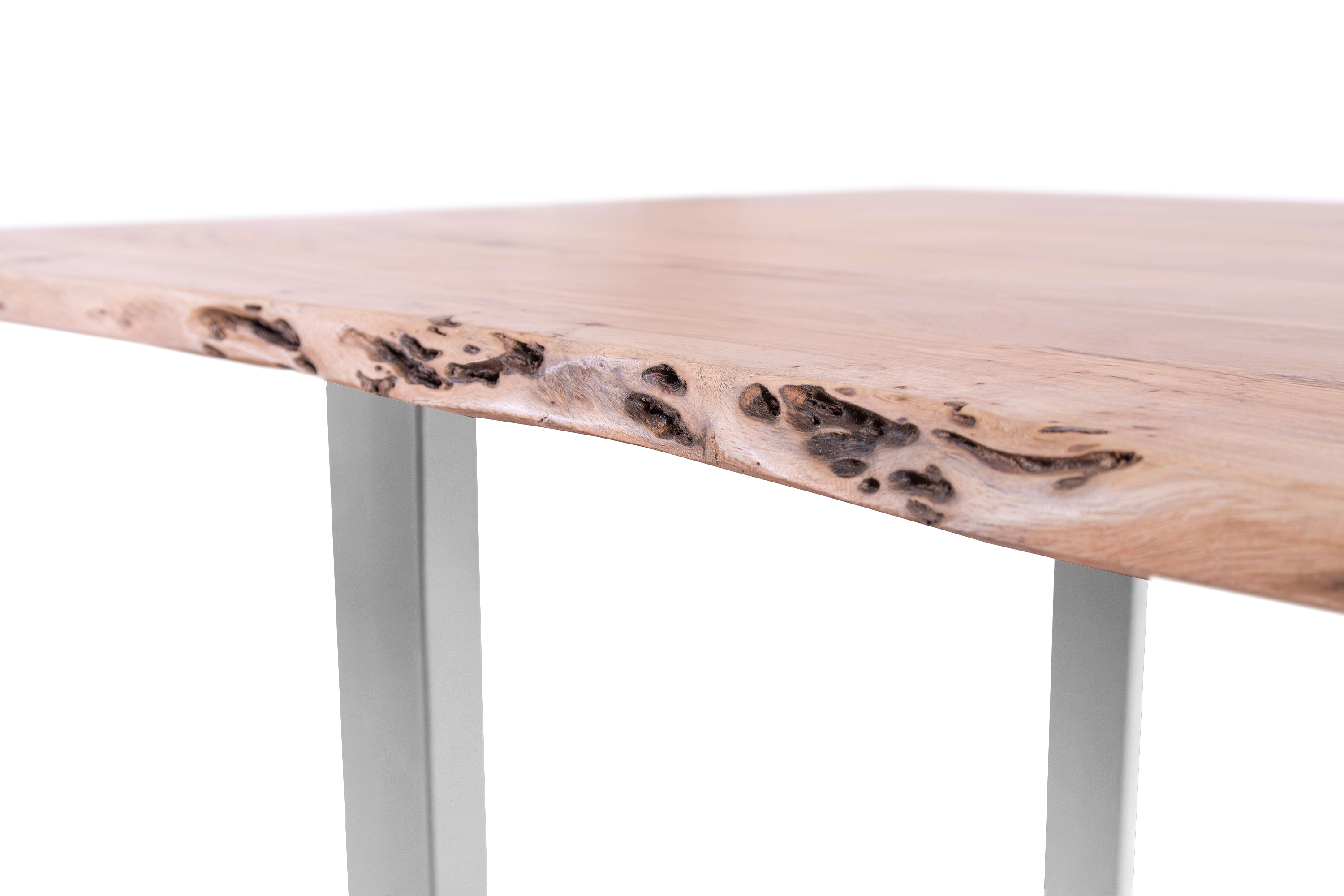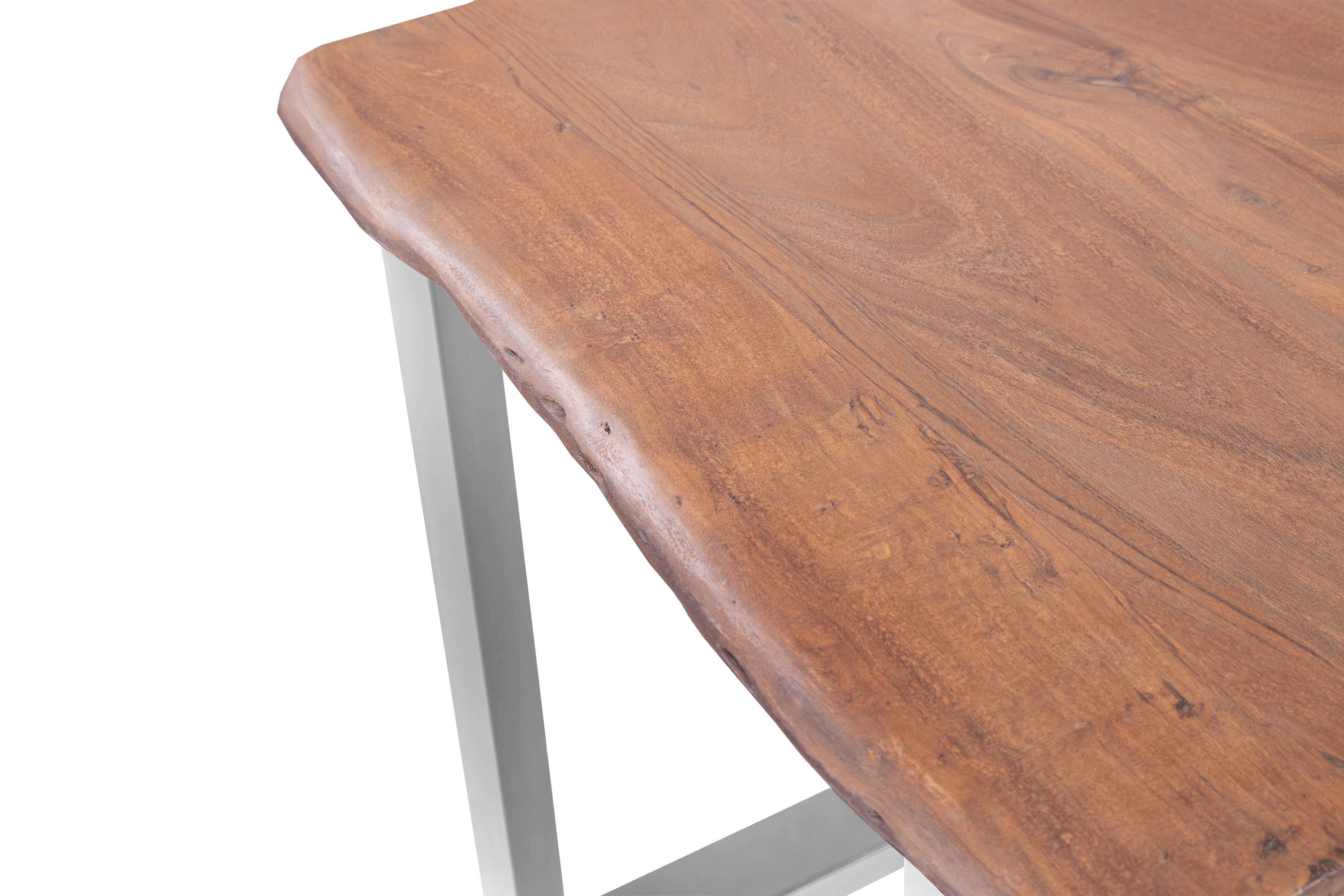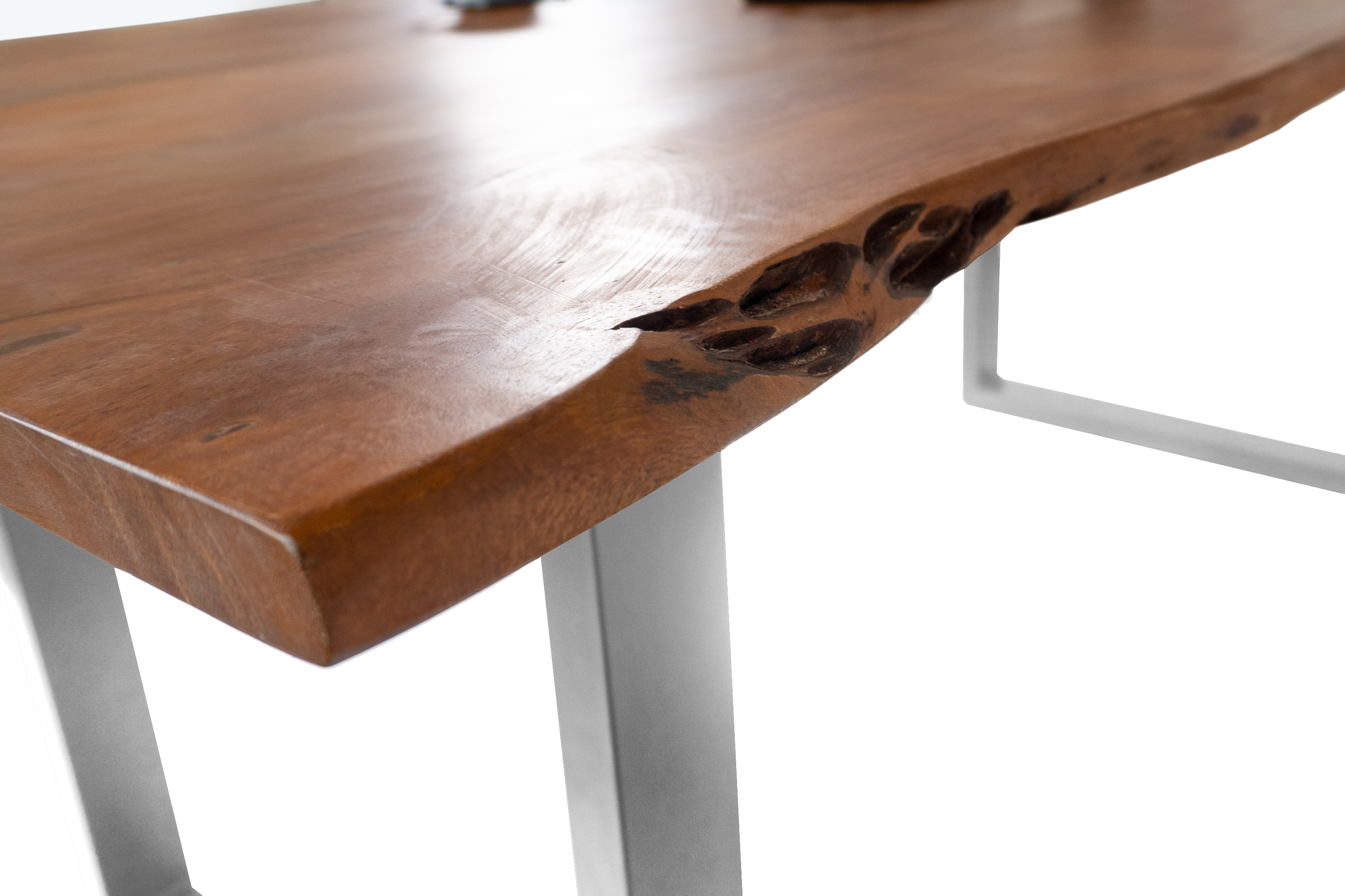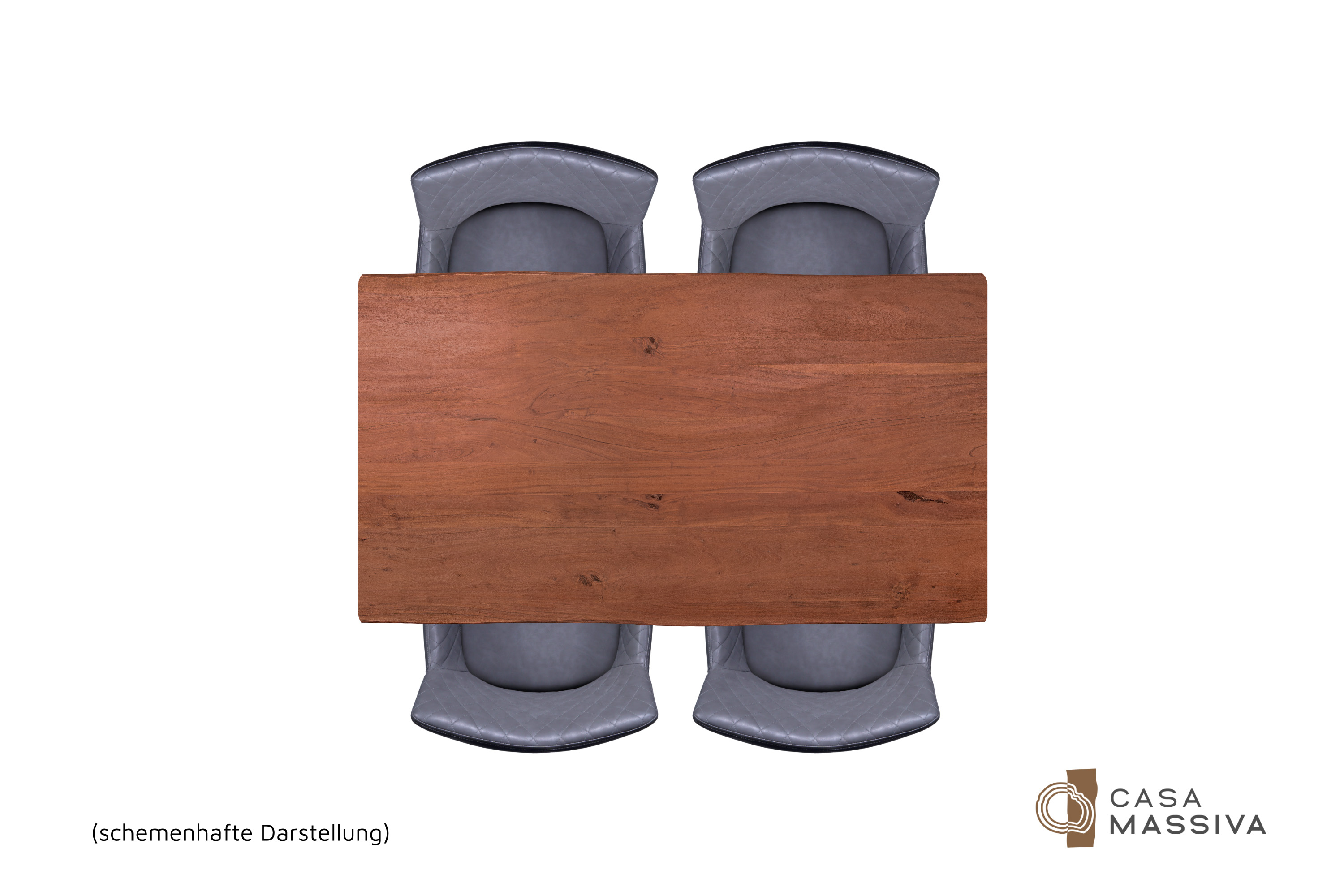Die unterschiedlichen Maserungen und Farbnuancen verleihen dem Tisch seinen einzigartigen Charakter. Die Tischplatte besteht aus 26 mm starken massiven Holzbohlen aus Akazienholz.