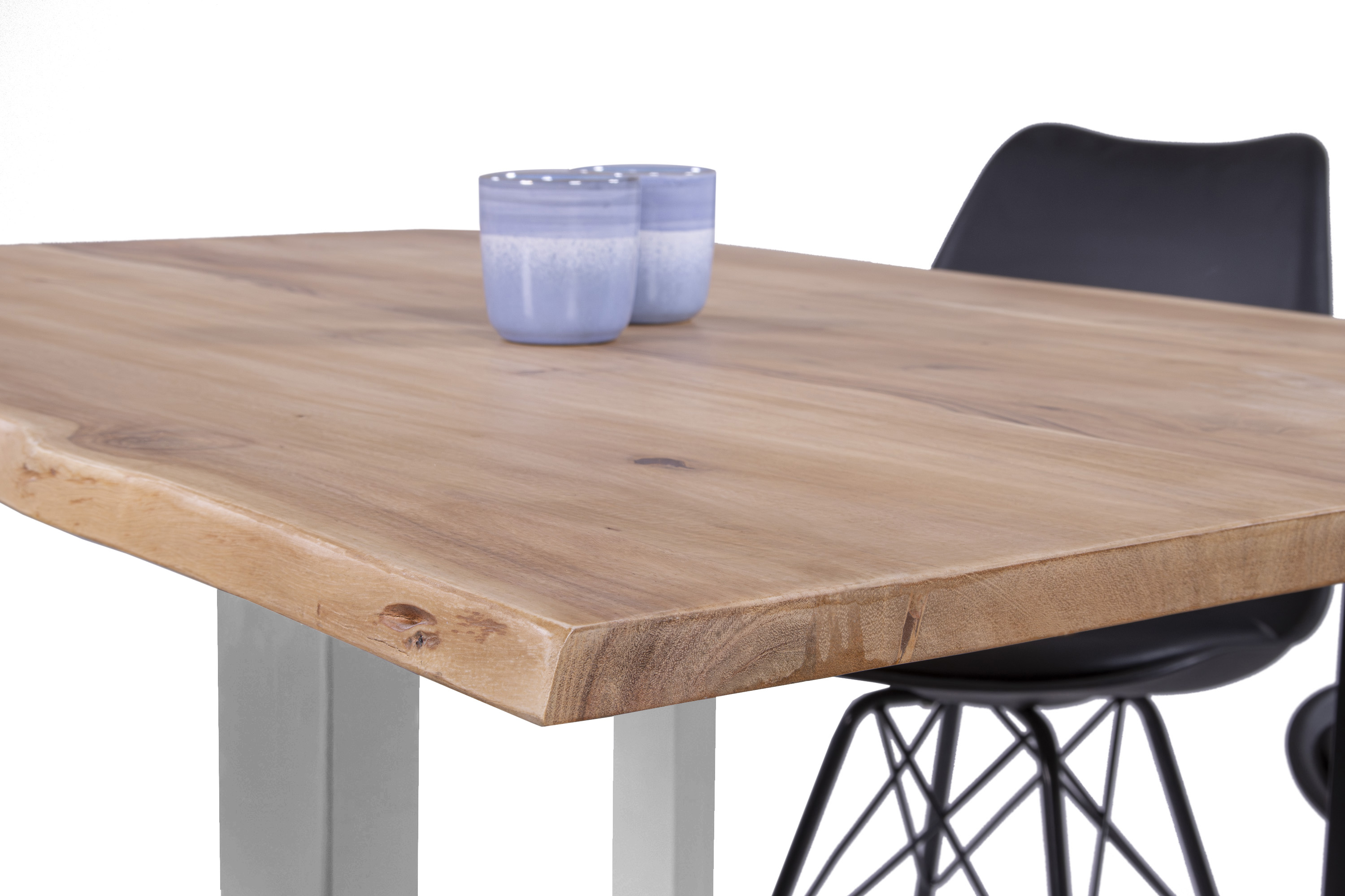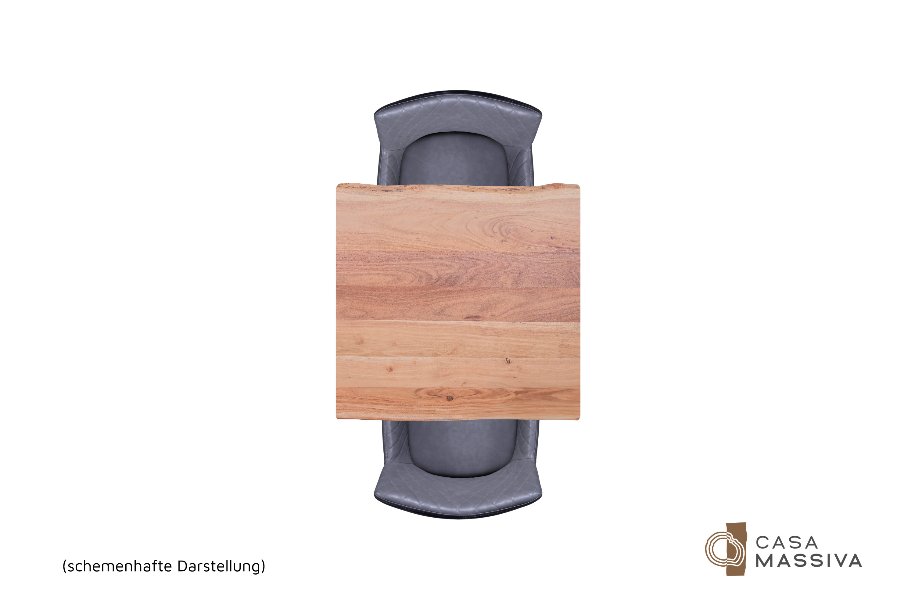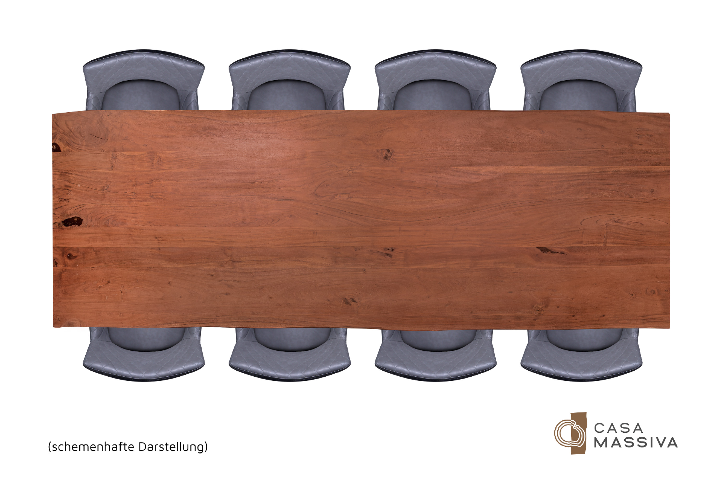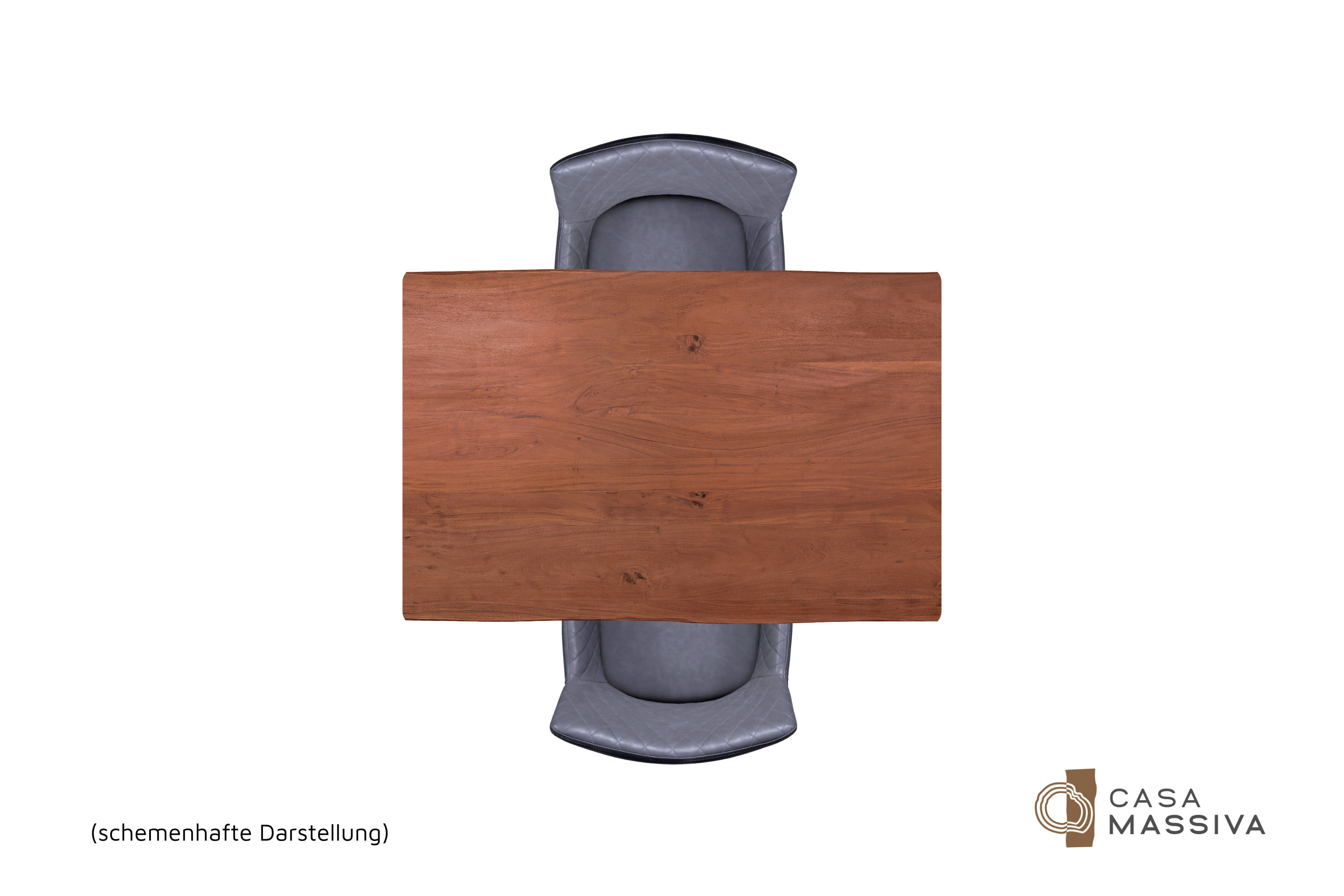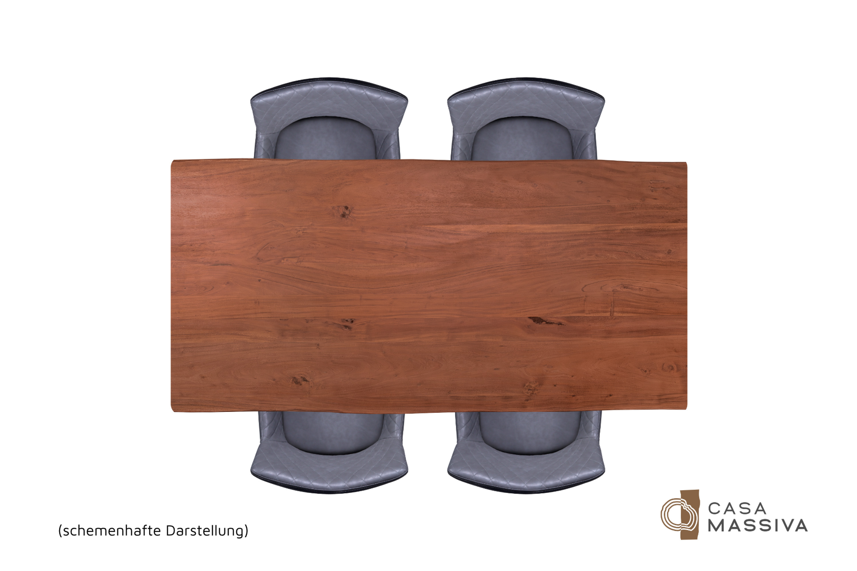 Die unterschiedlichen Maserungen und Farbnuancen verleihen dem Tisch seinen einzigartigen Charakter. Die Tischplatte besteht aus 26 mm starken massiven Holzbohlen aus Akazienholz.