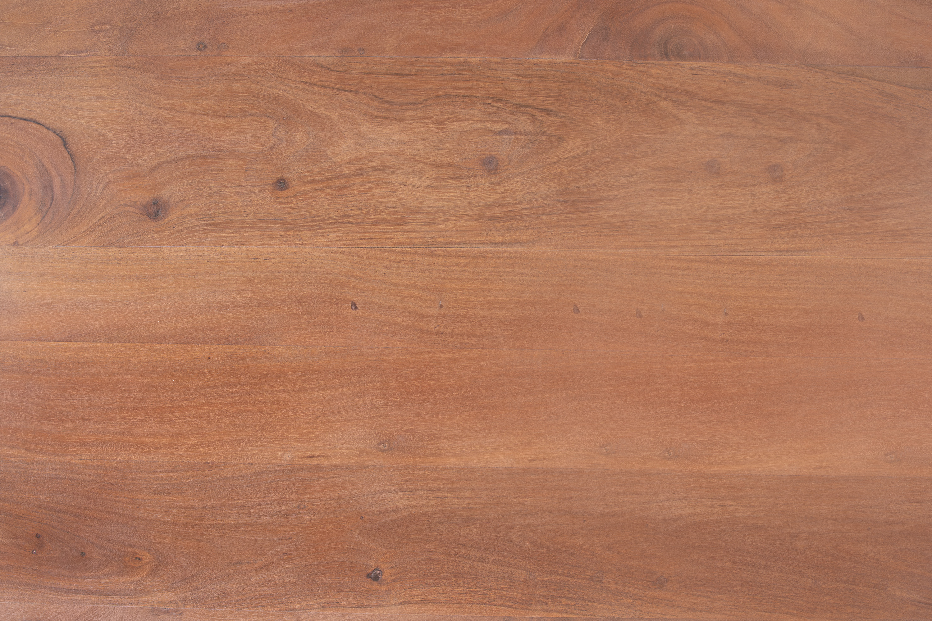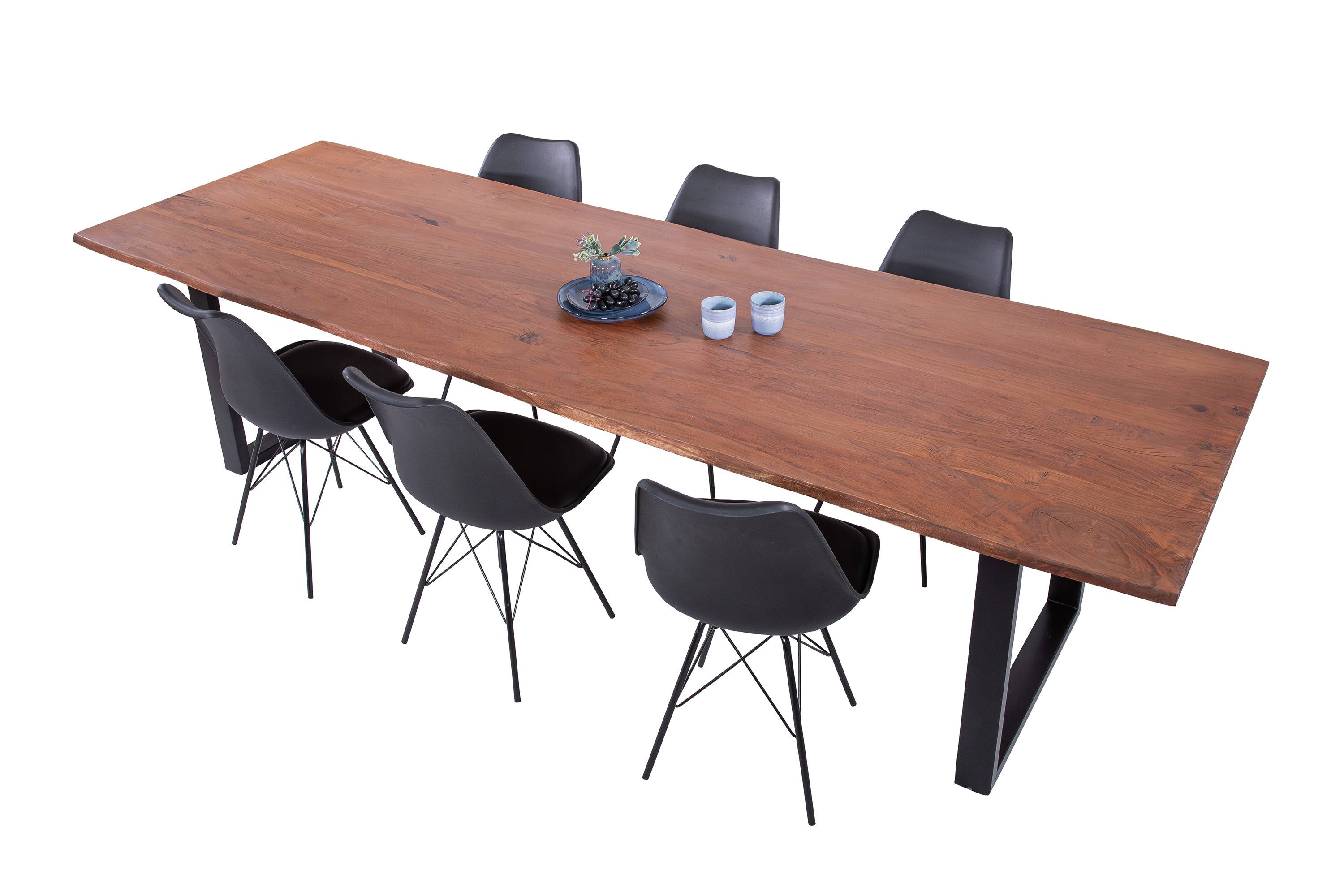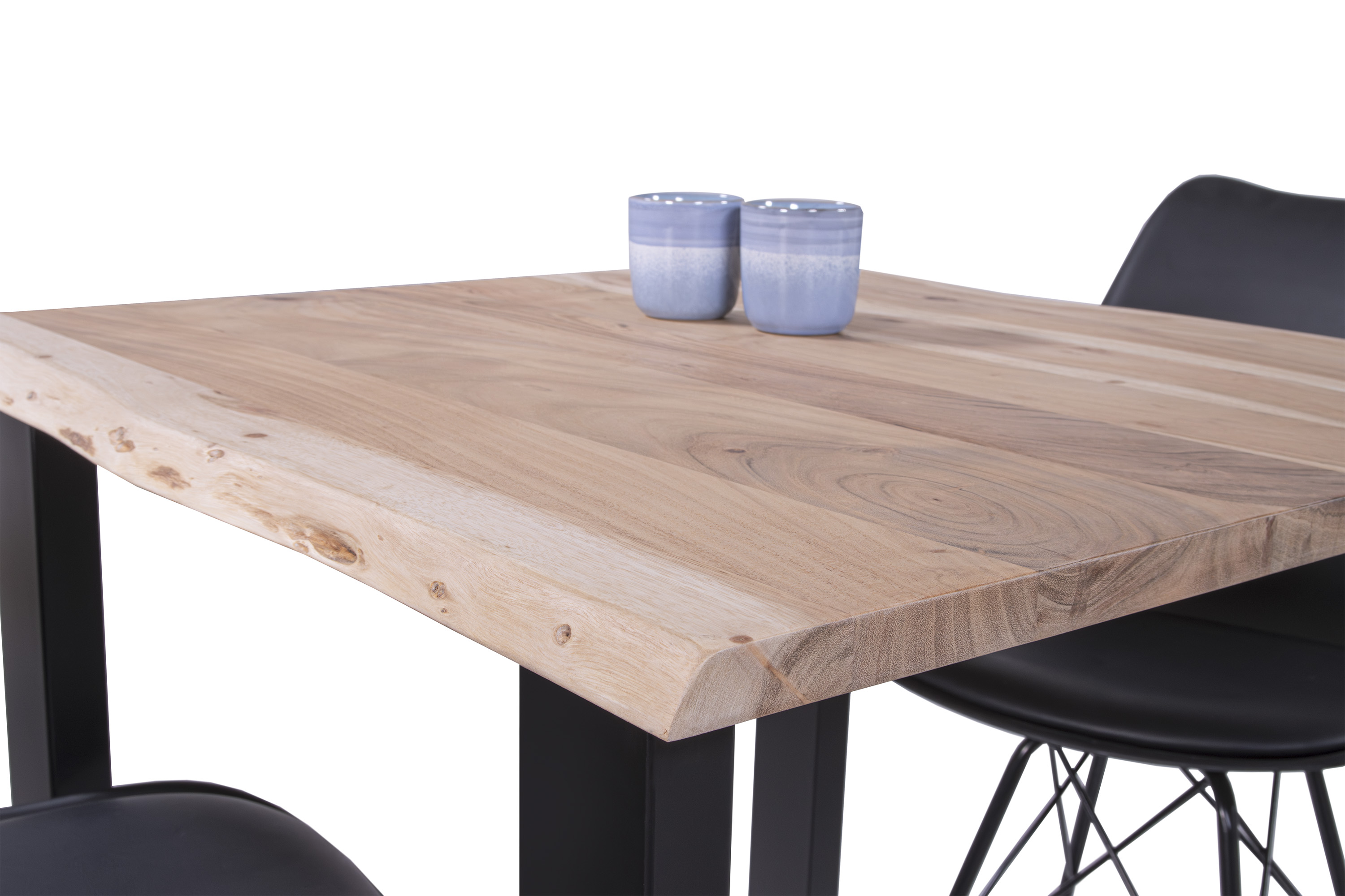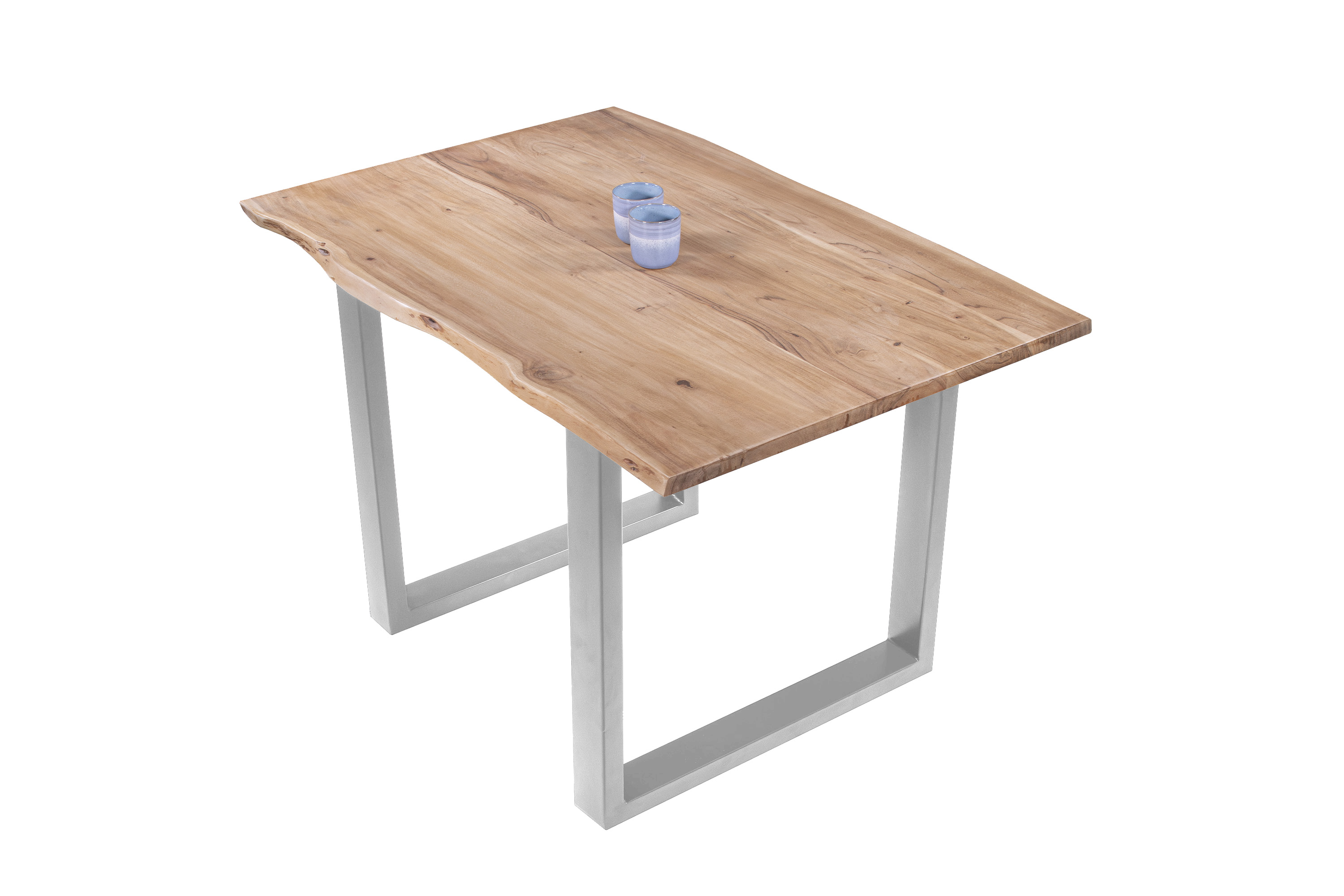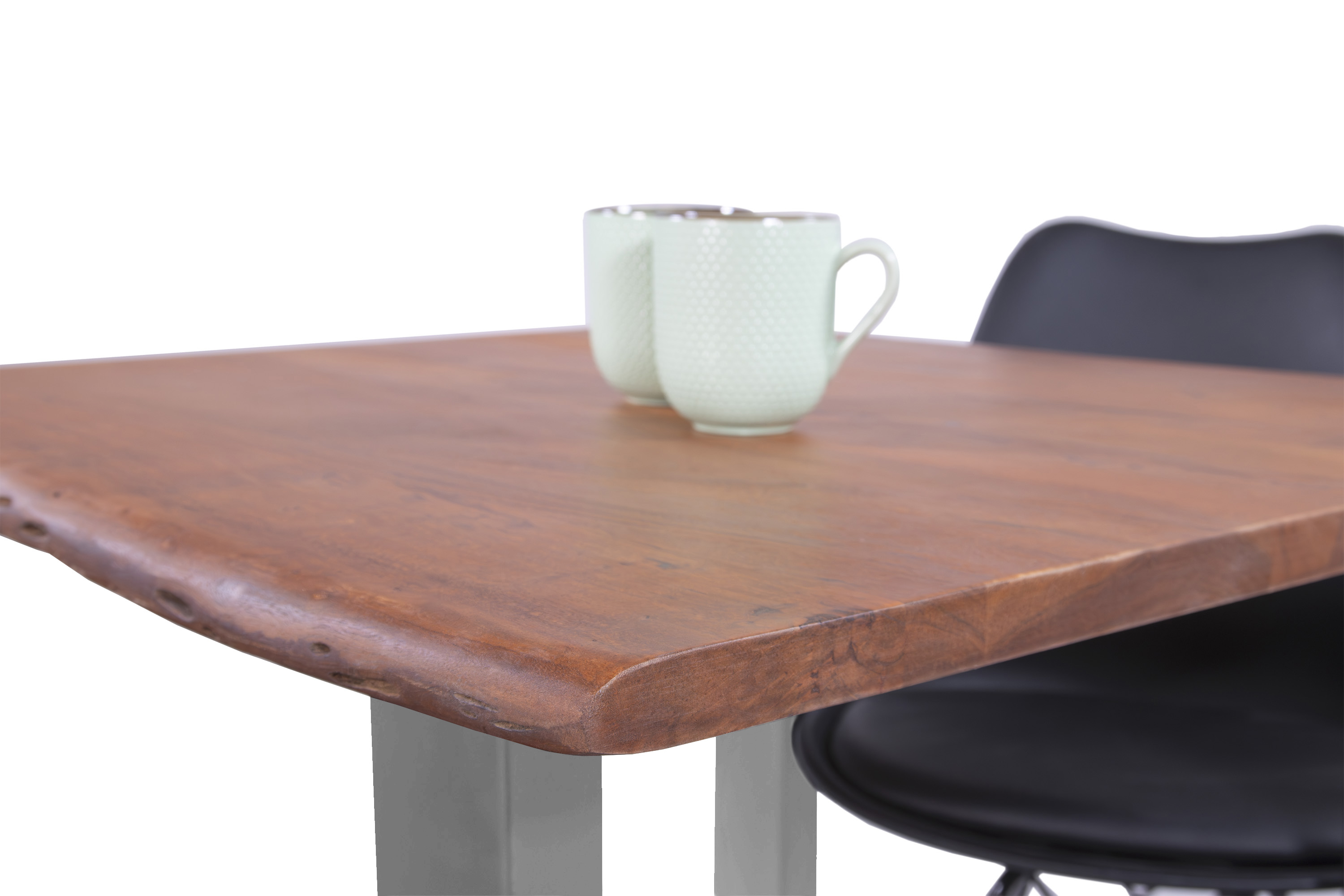 Die unterschiedlichen Maserungen und Farbnuancen verleihen dem Tisch seinen einzigartigen Charakter. Die Tischplatte besteht aus 26 mm starken massiven Holzbohlen aus Akazienholz.