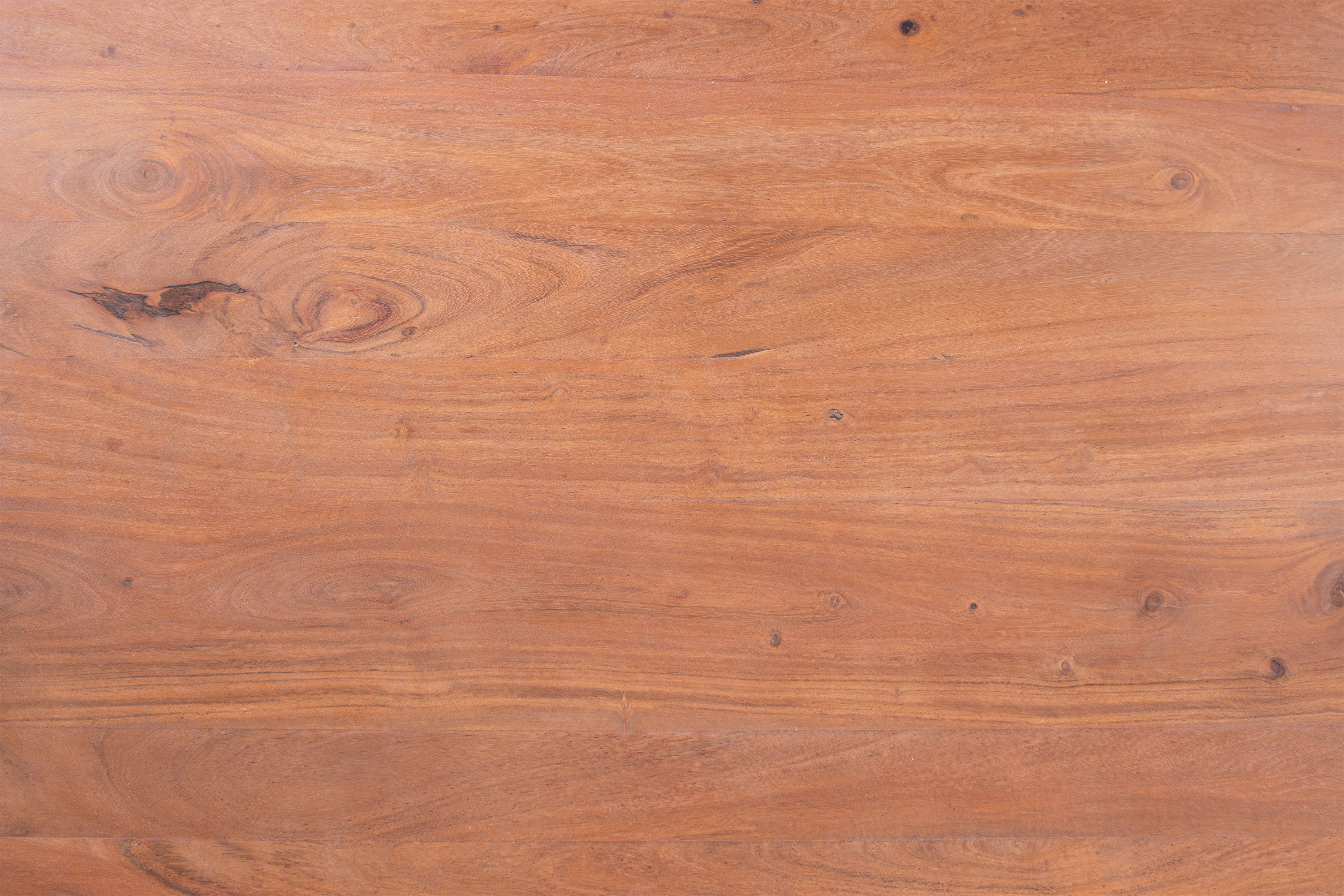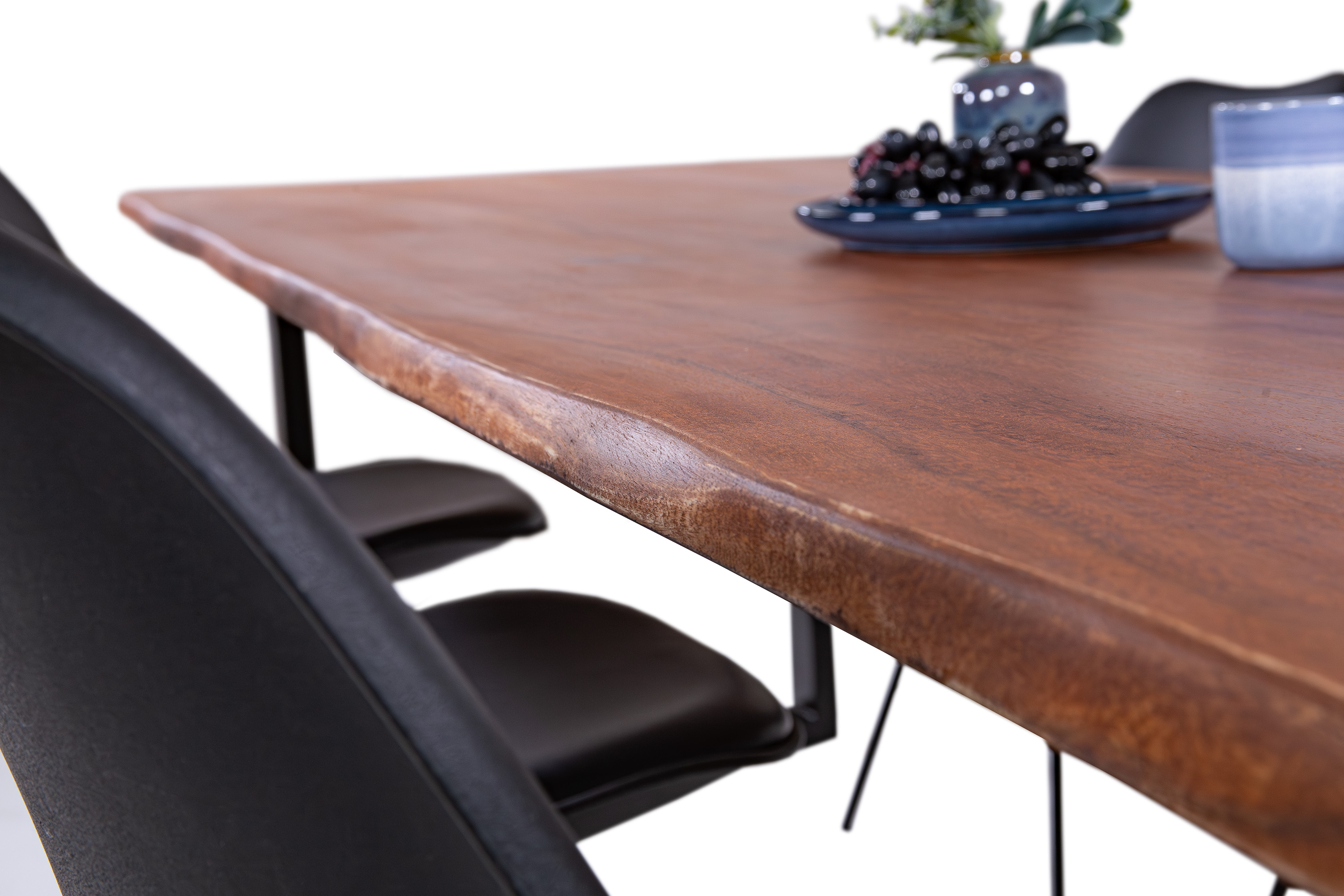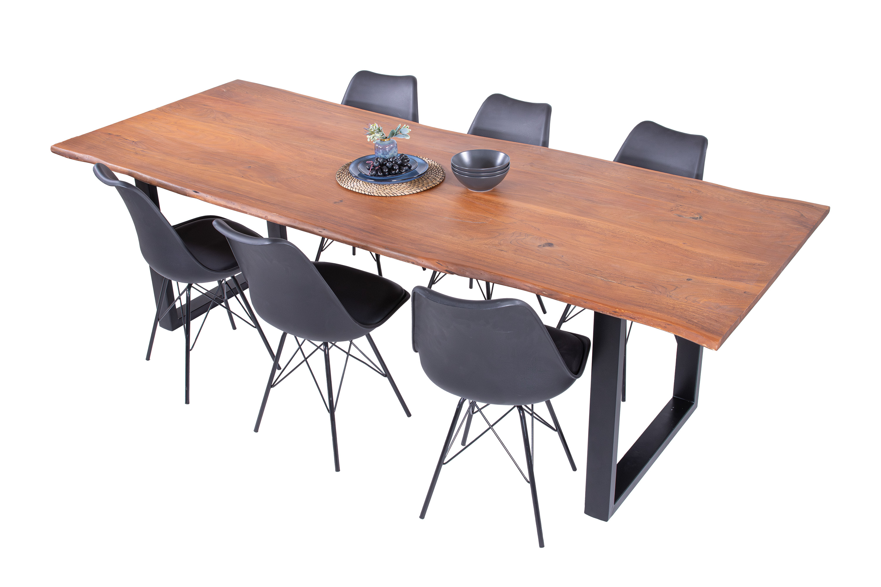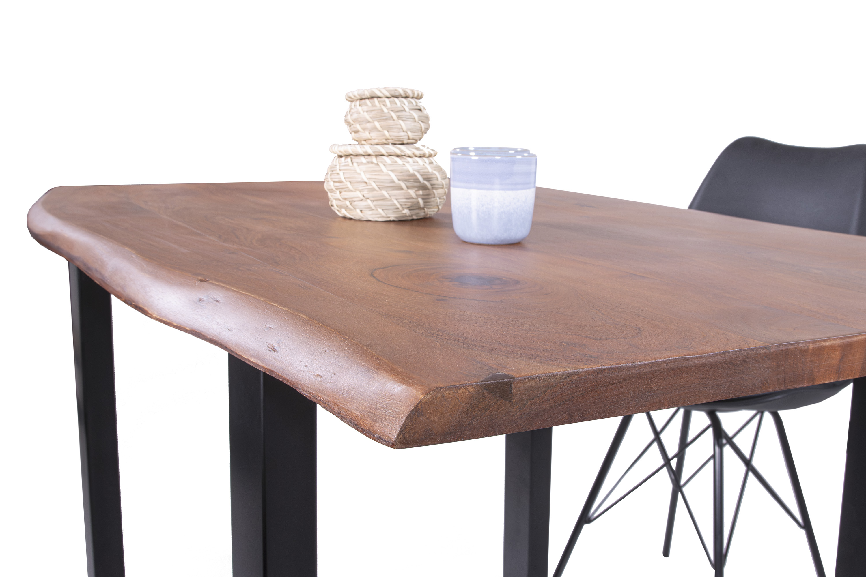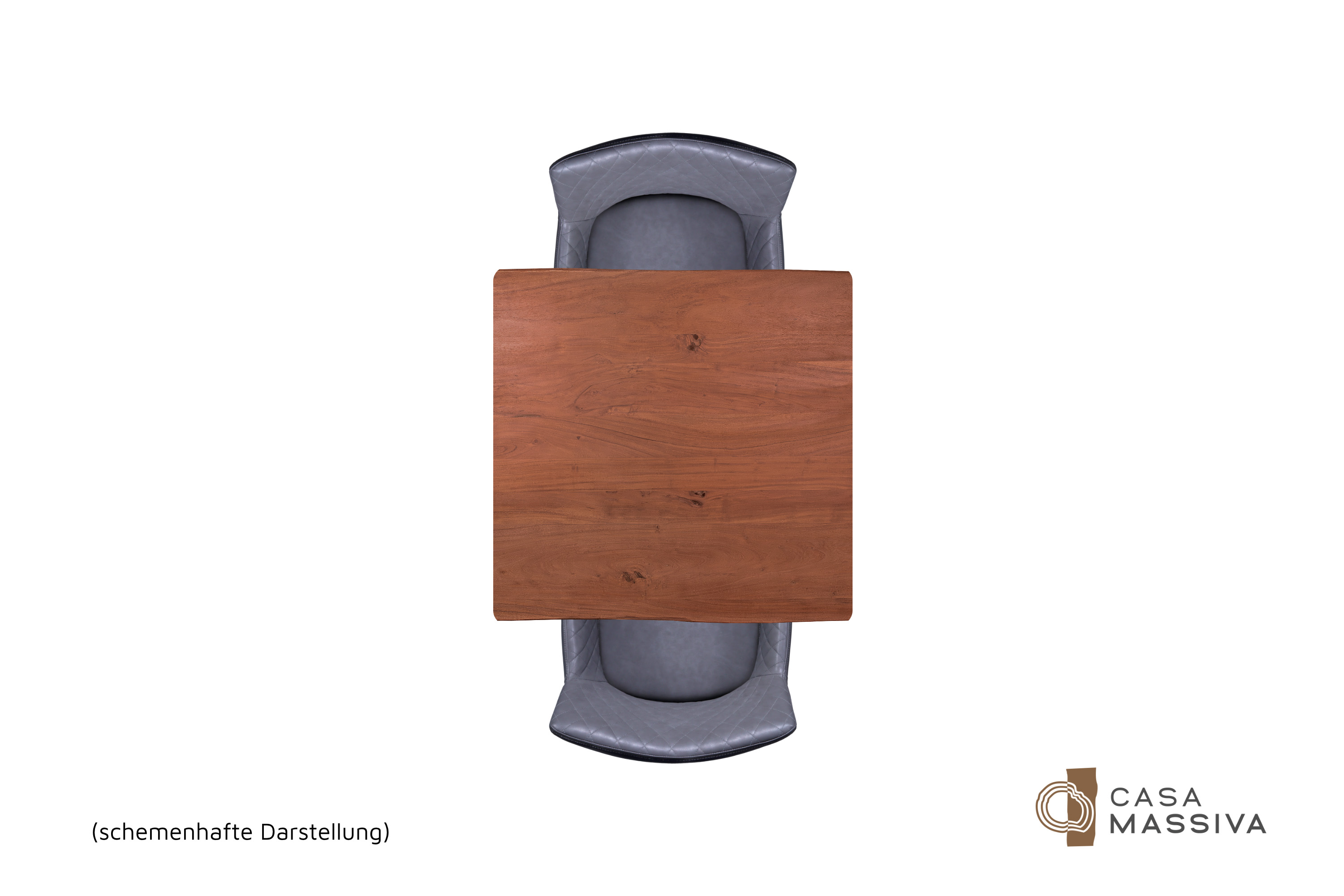 Die unterschiedlichen Maserungen und Farbnuancen verleihen dem Tisch seinen einzigartigen Charakter. Die Tischplatte besteht aus 26 mm starken massiven Holzbohlen aus Akazienholz.