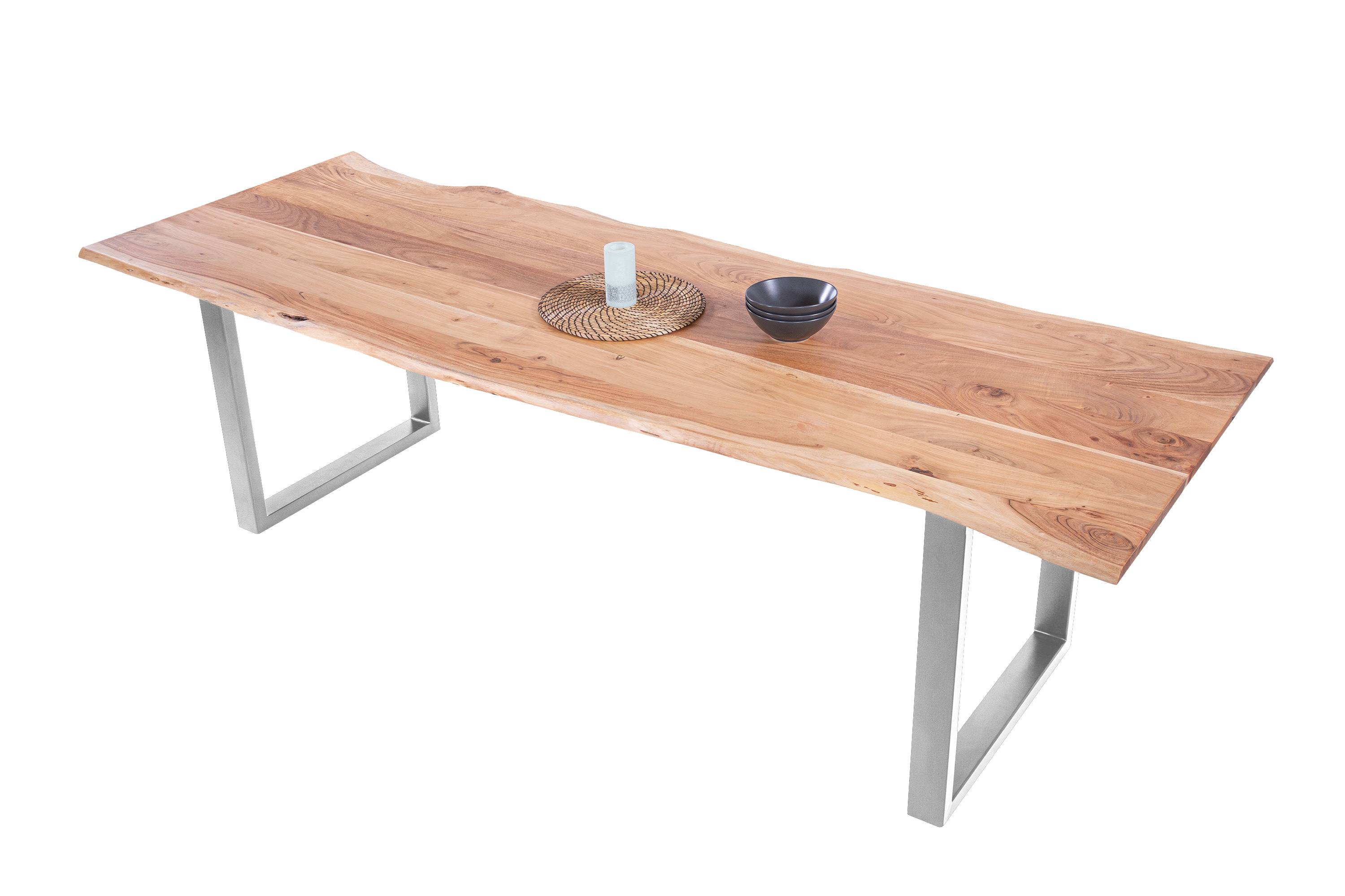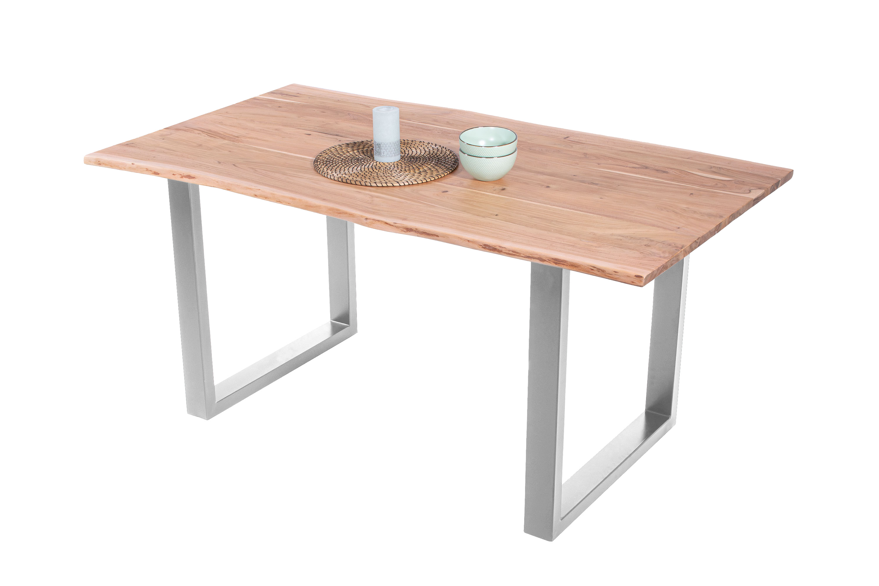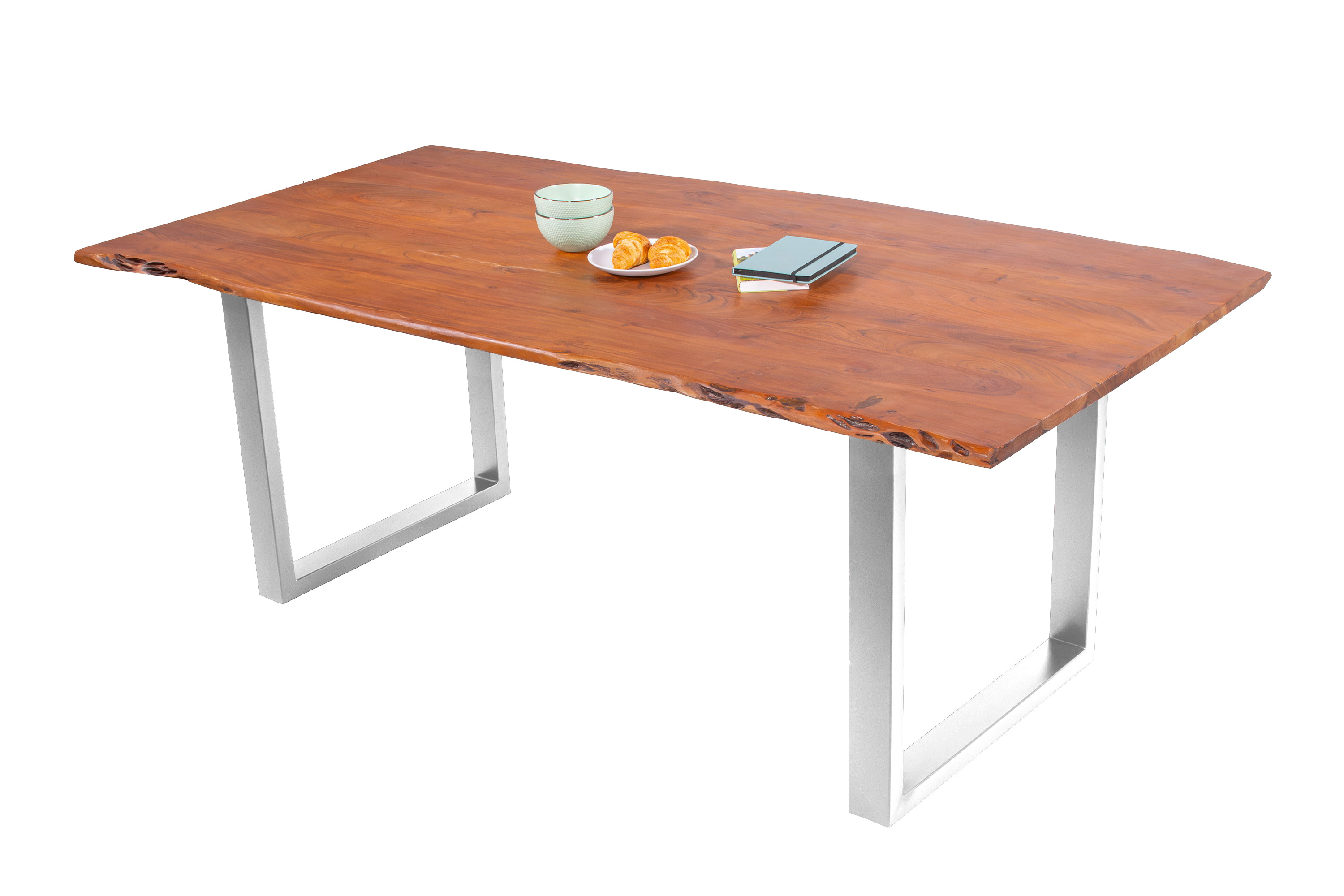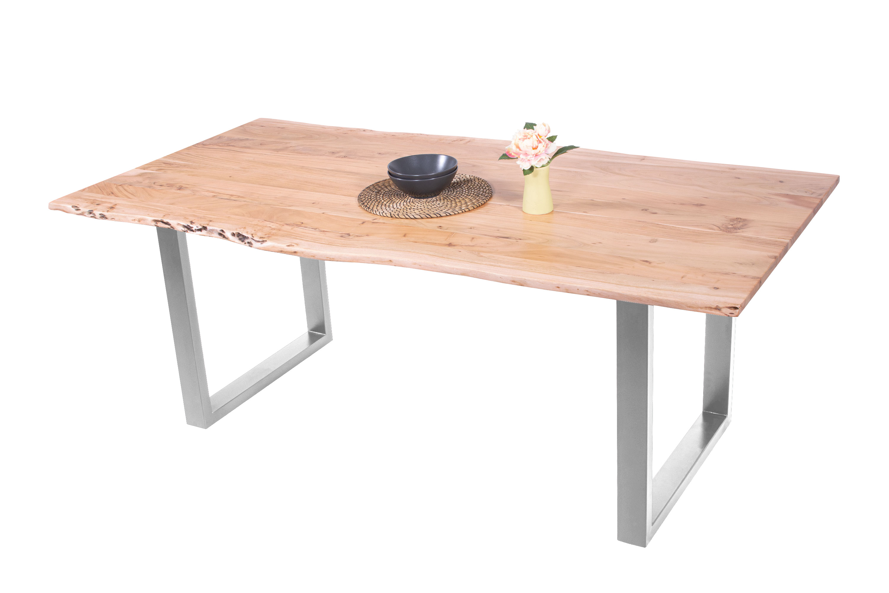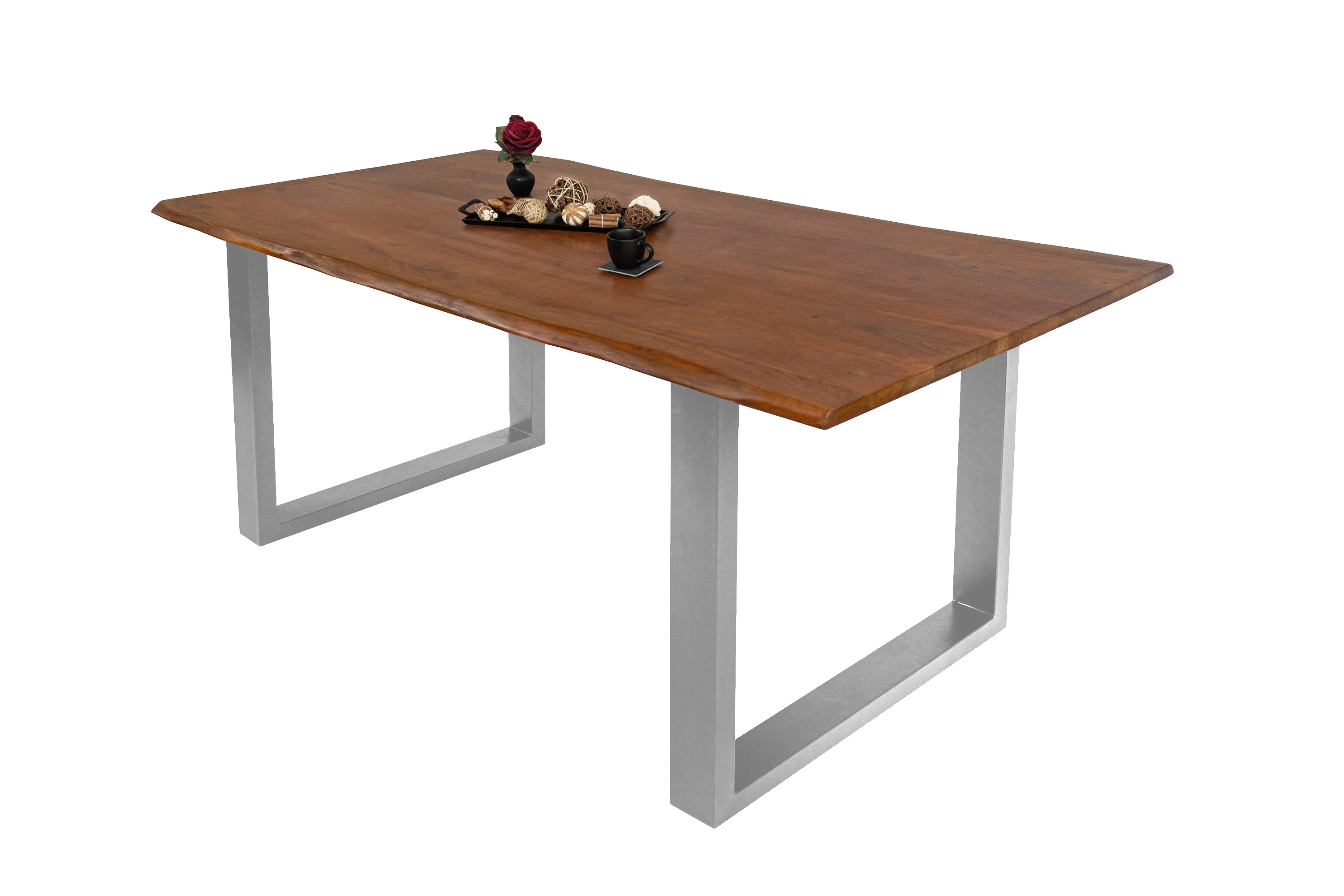 Baumkantentisch Adella, Esszimmertisch Massivholz Akazie / Natur- und Nussbaumfarben, Gestell in Silber und Schwarz