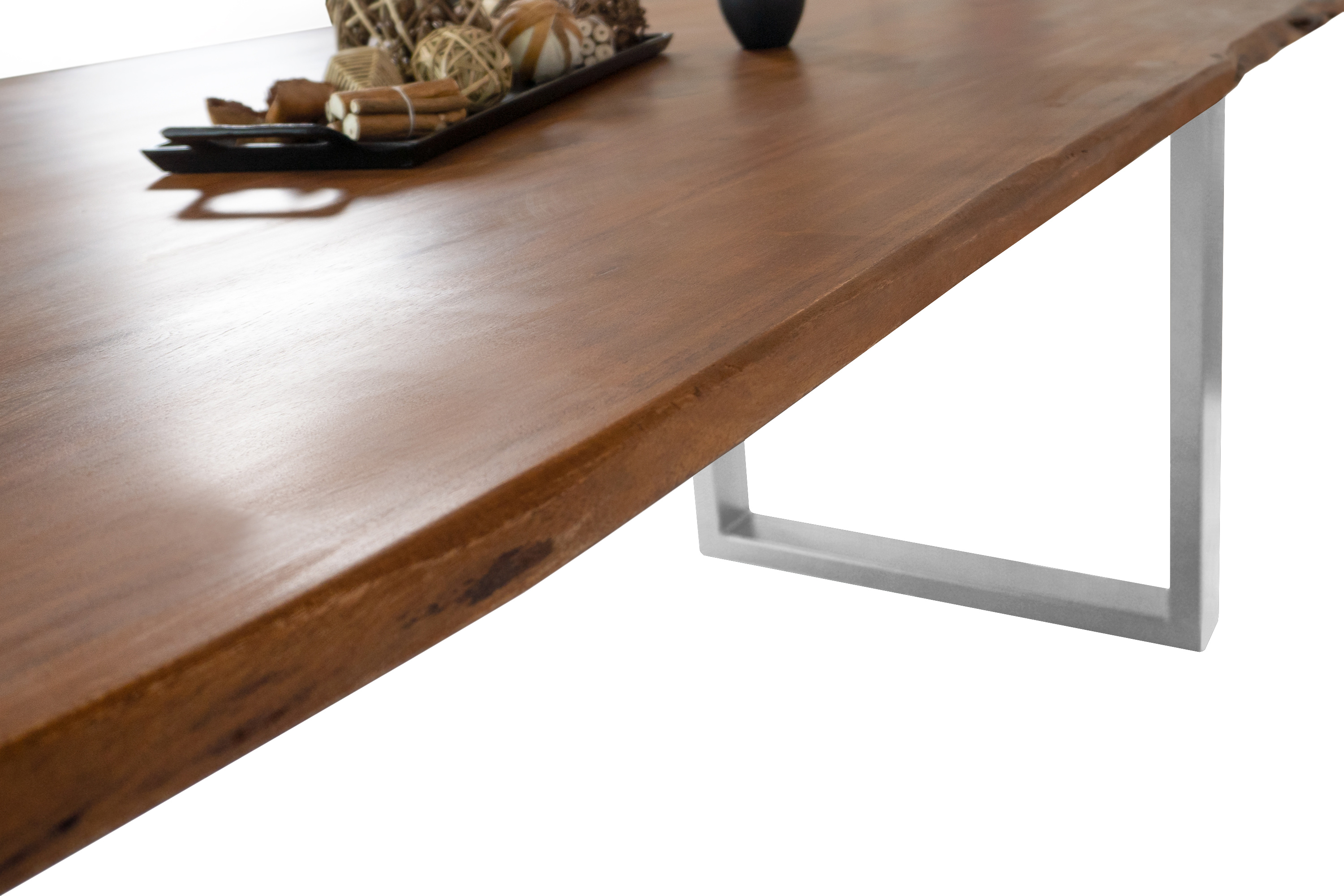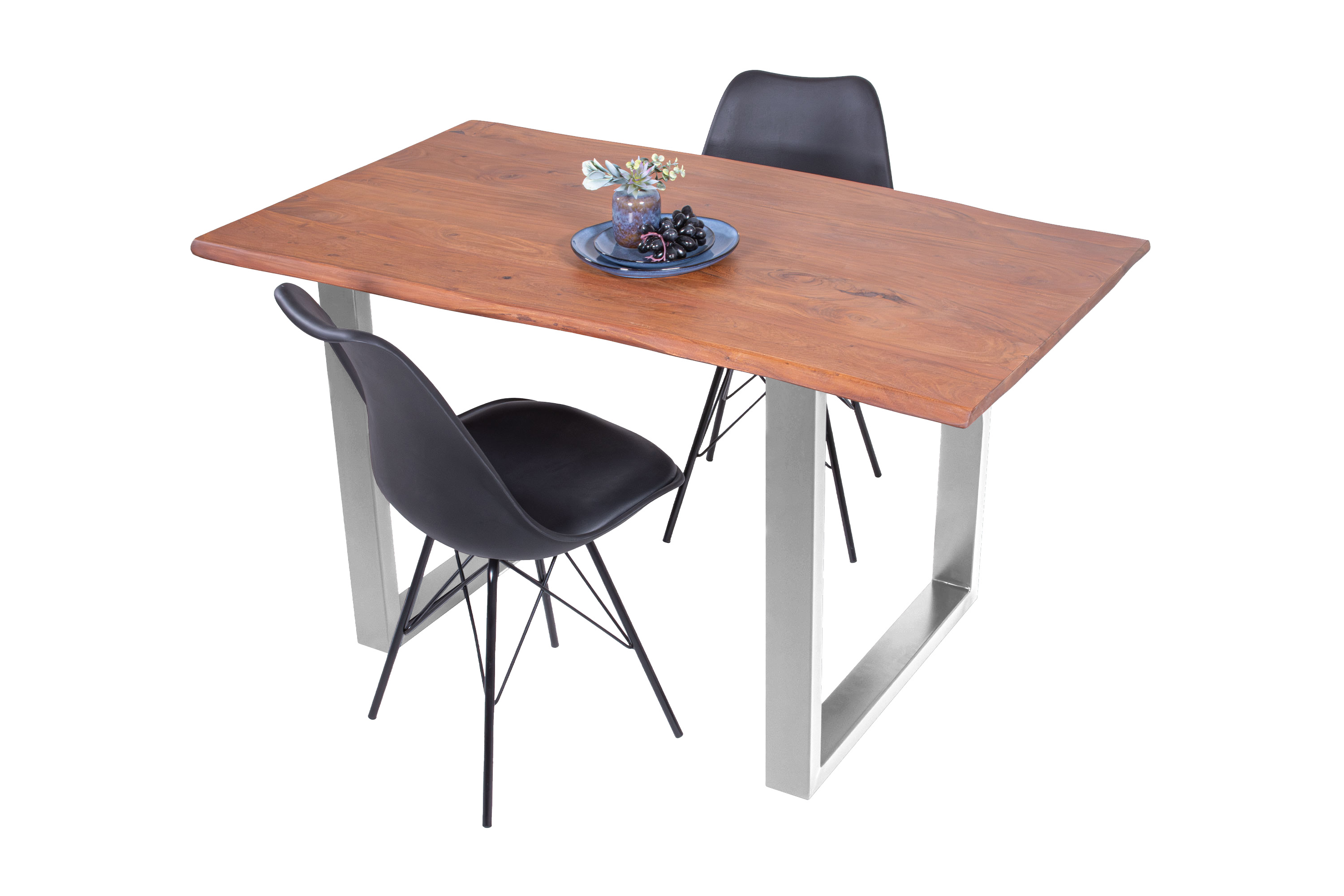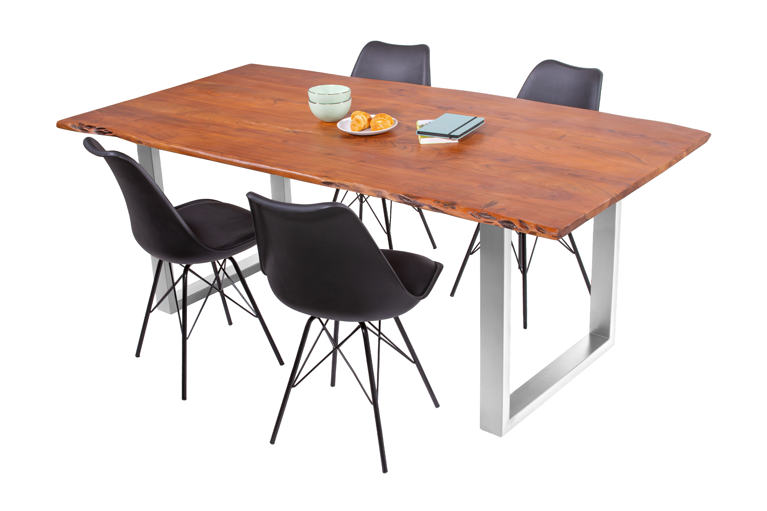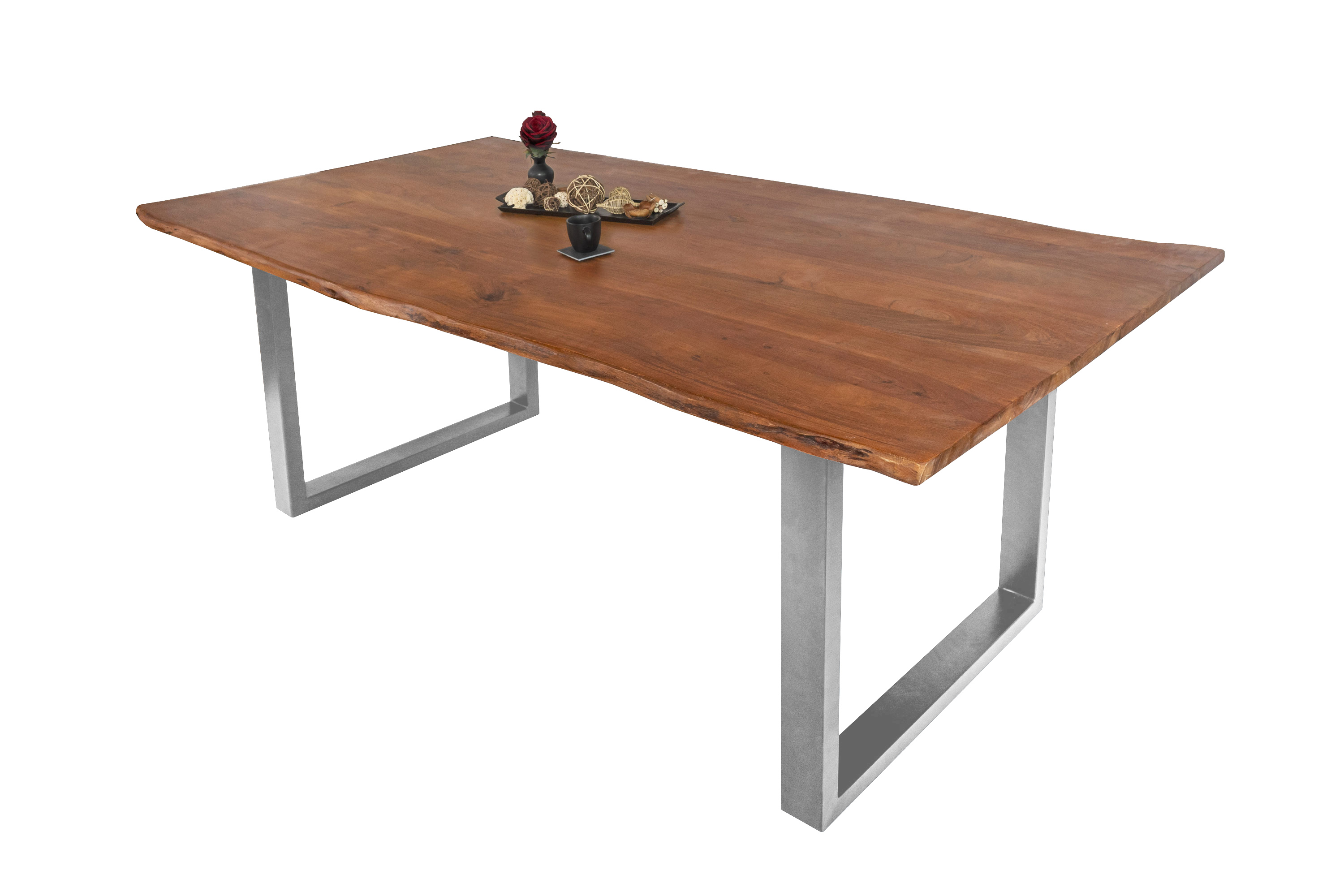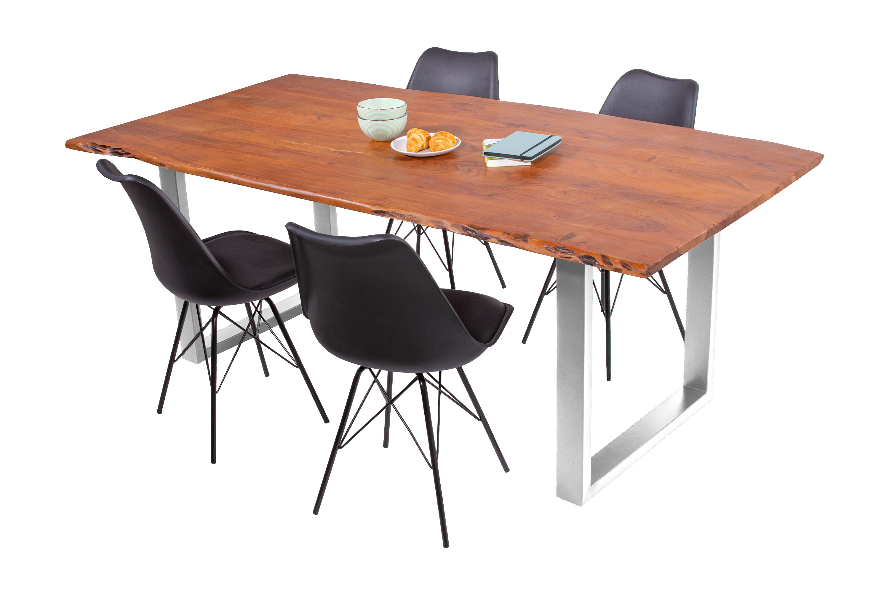 Baumkantentisch Adella, Esszimmertisch Massivholz Akazie / Natur- und Nussbaumfarben, Gestell in Silber und Schwarz