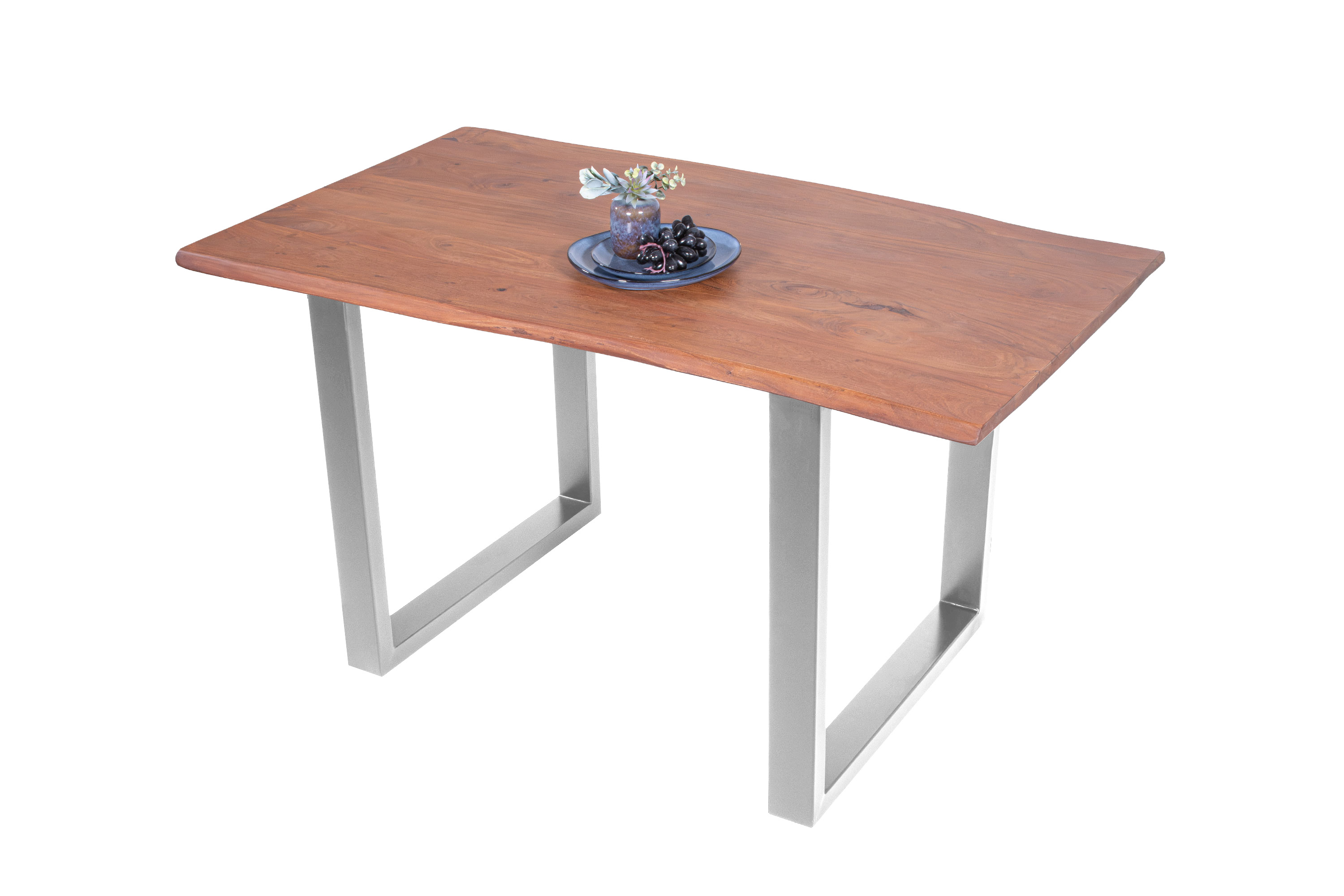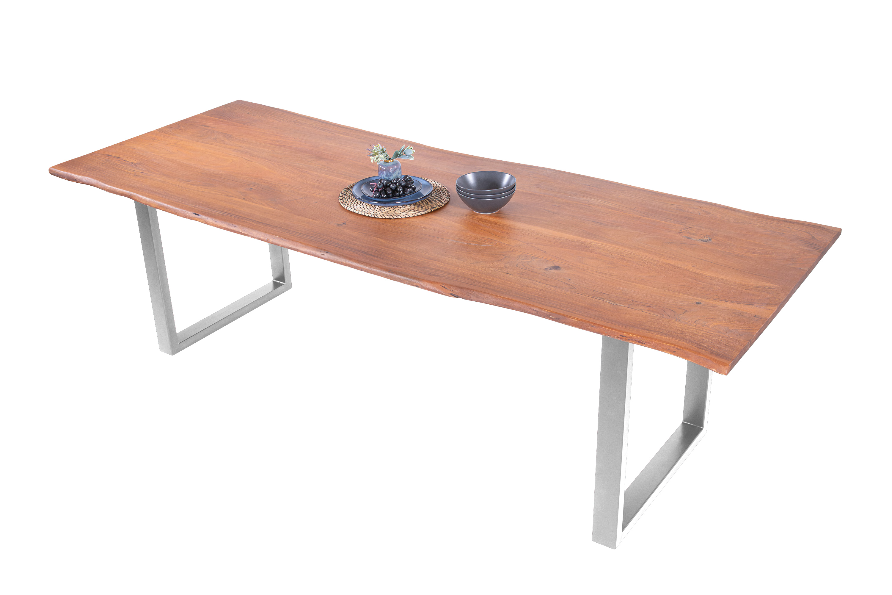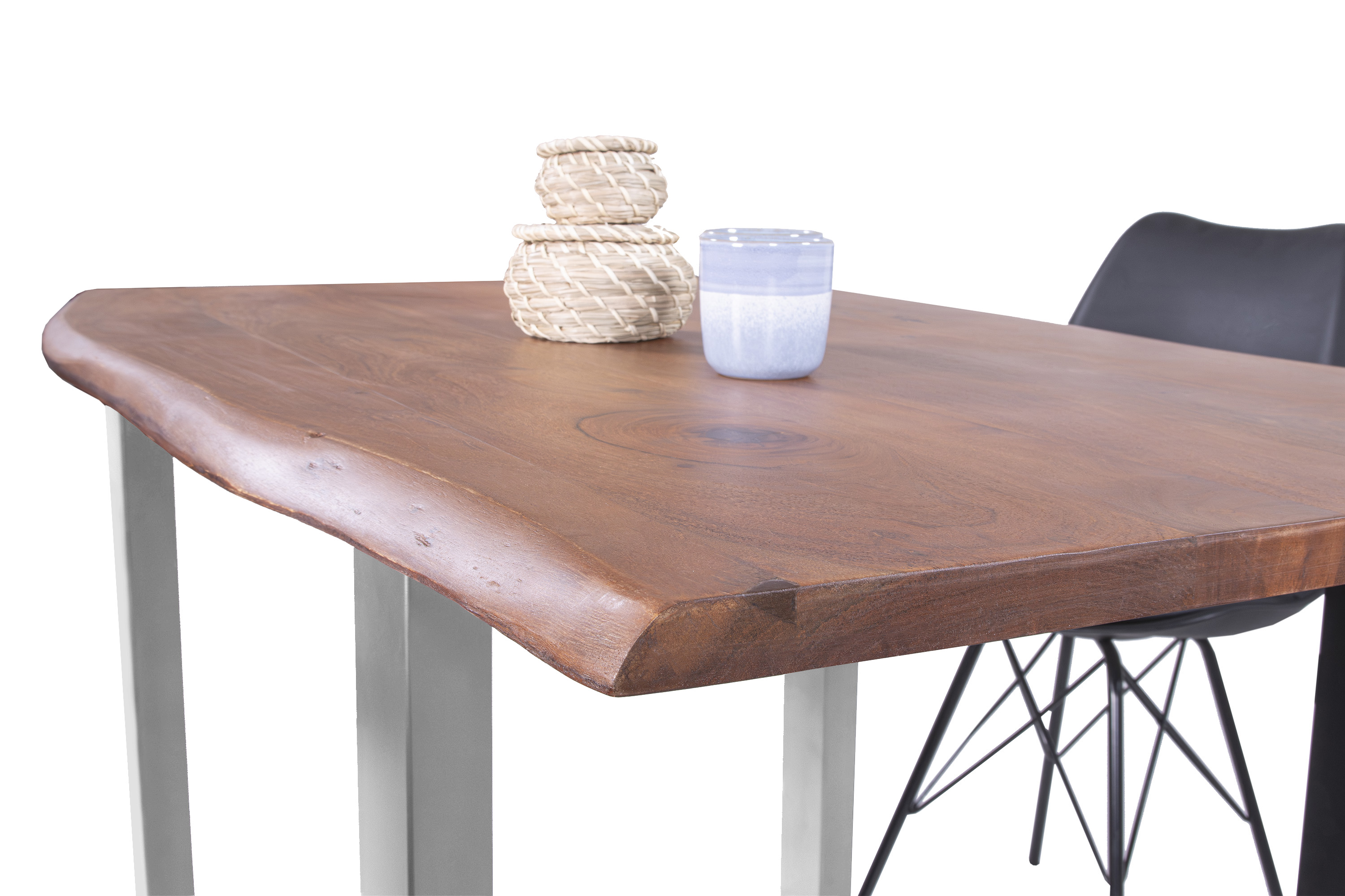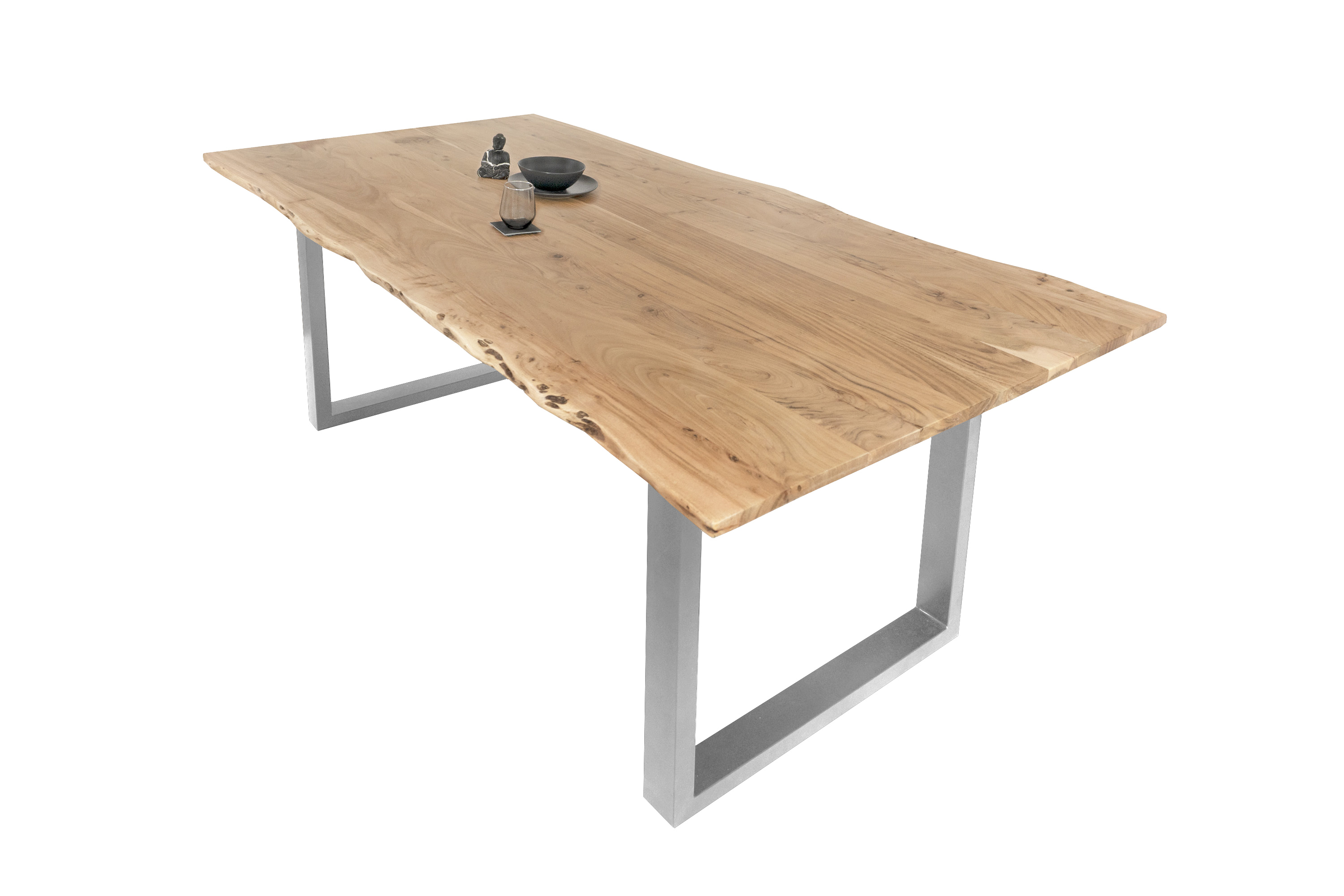 Baumkantentisch Adella, Esszimmertisch Massivholz Akazie / Natur- und Nussbaumfarben, Gestell in Silber und Schwarz