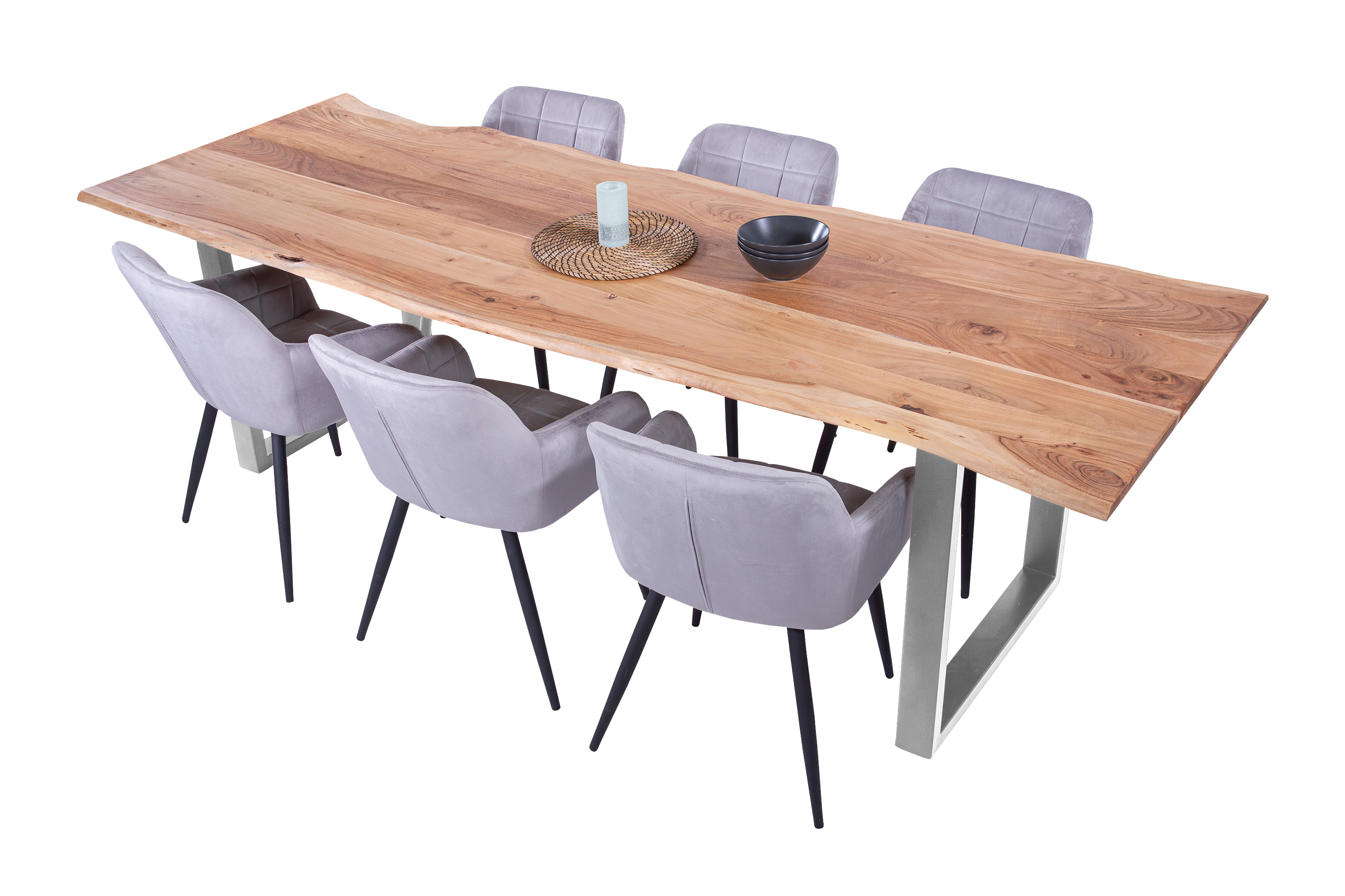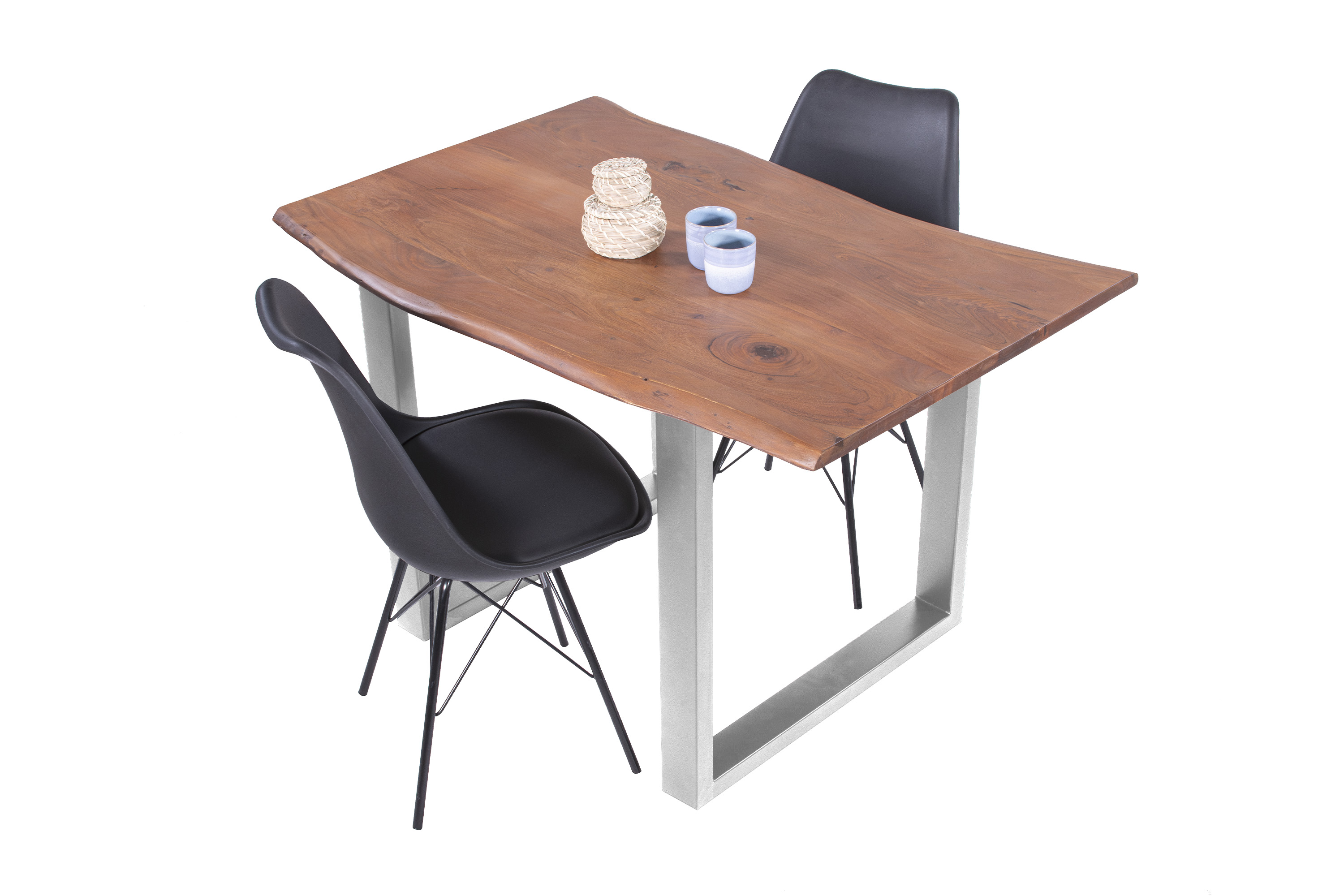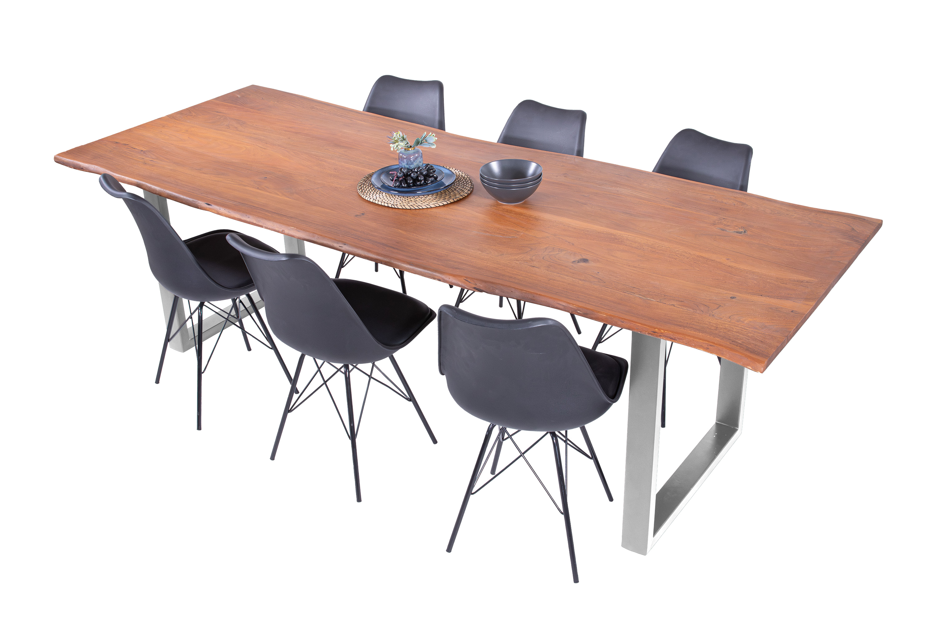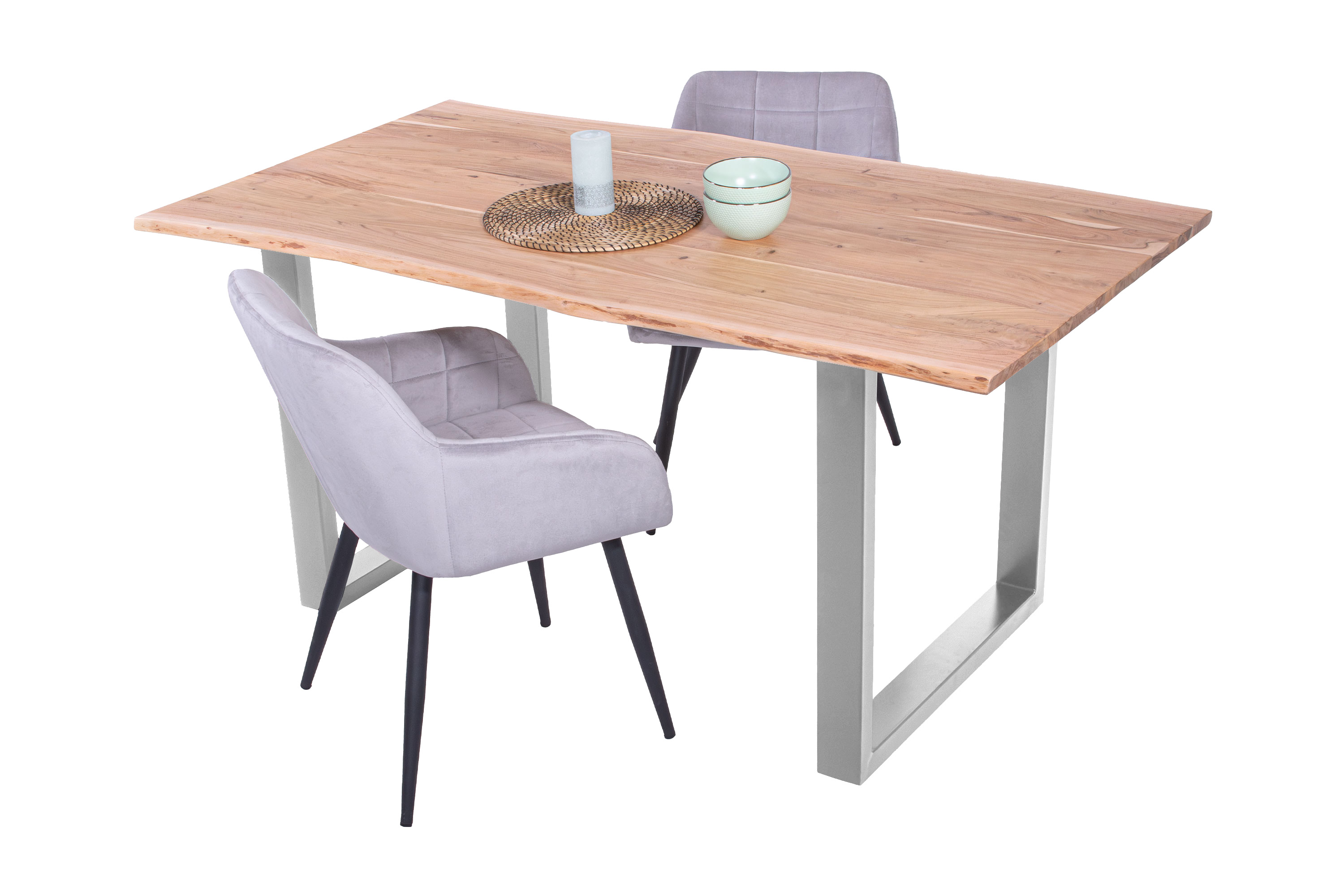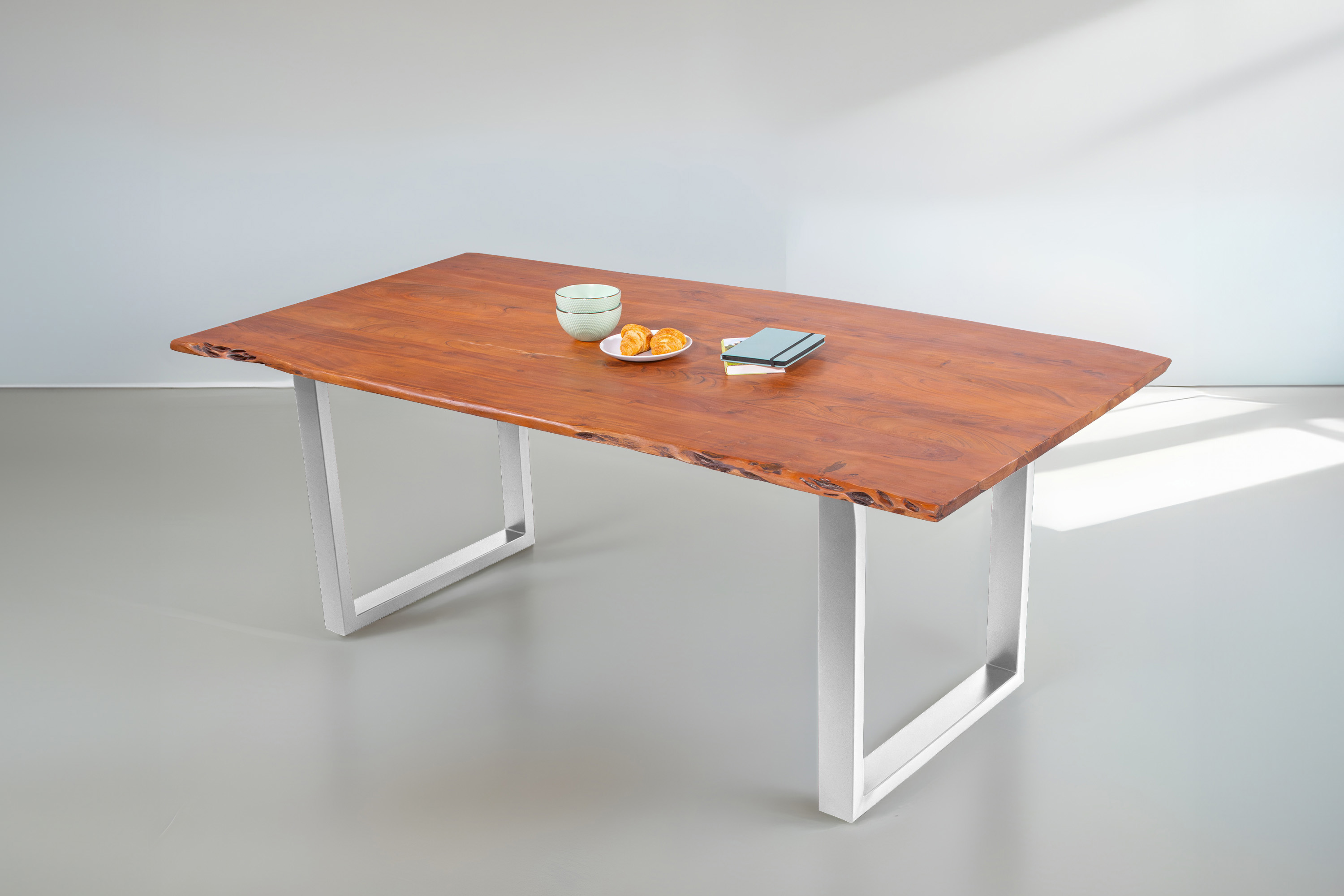 Baumkantentisch Adella, Esszimmertisch Massivholz Akazie / Natur- und Nussbaumfarben, Gestell in Silber und Schwarz