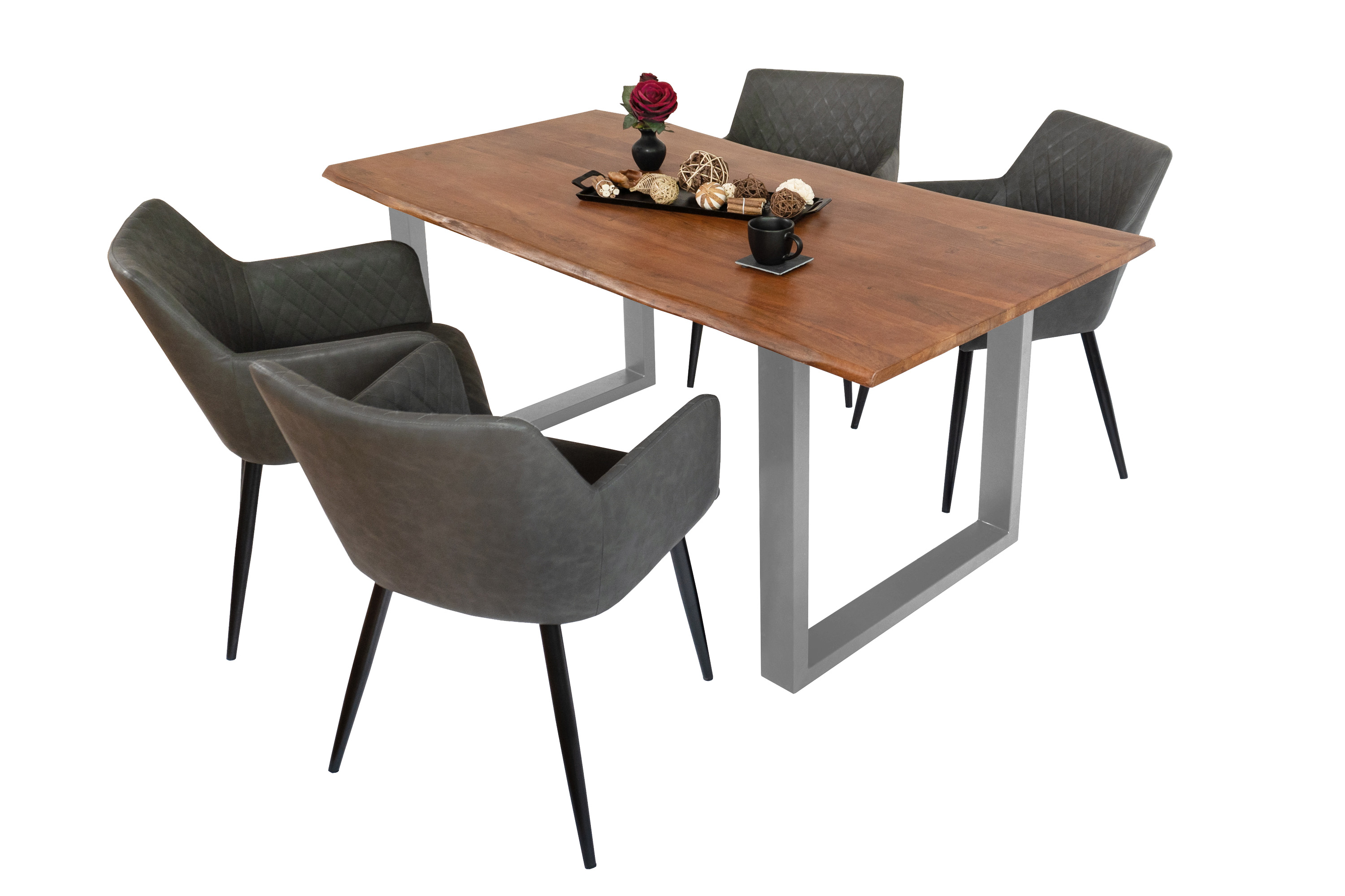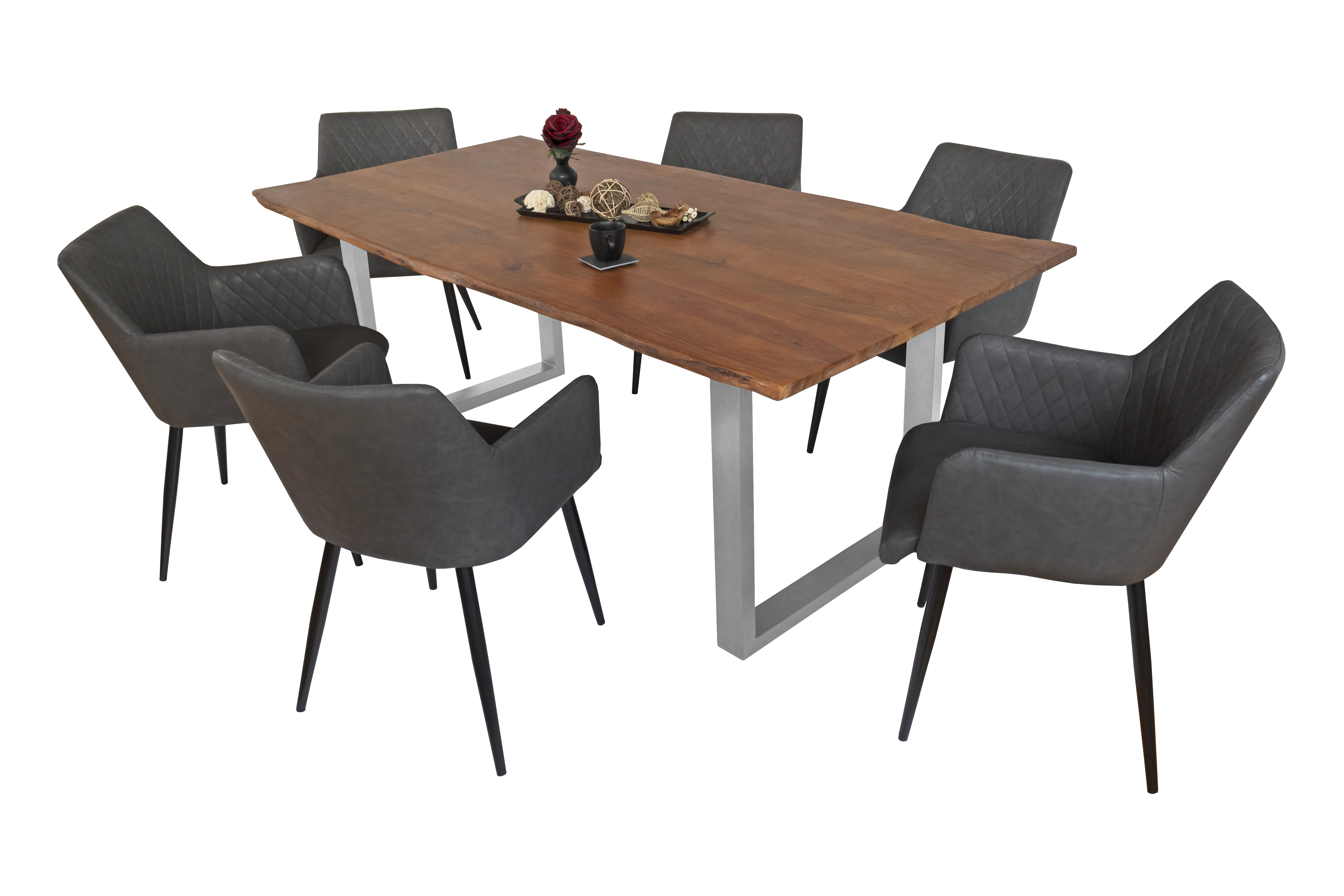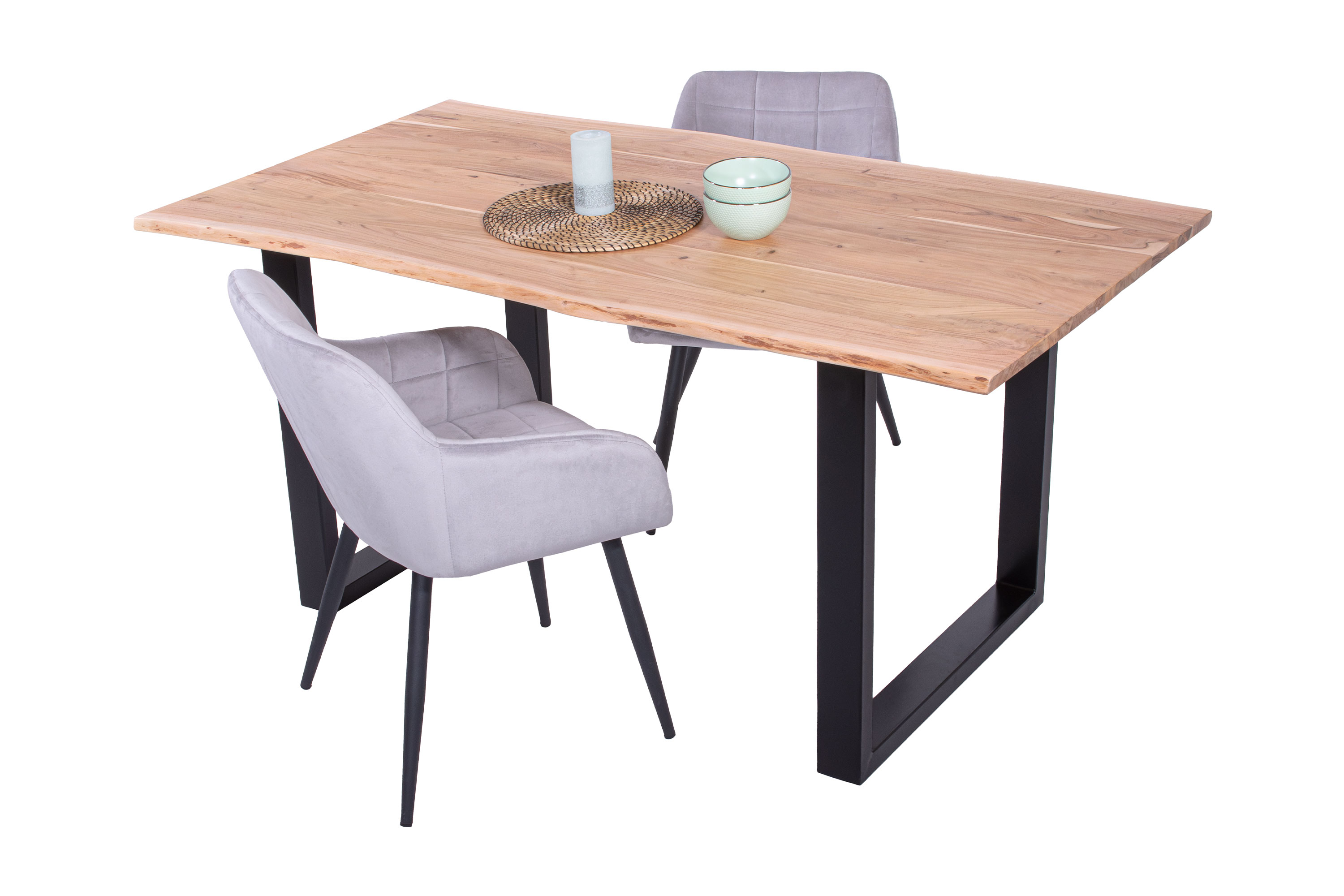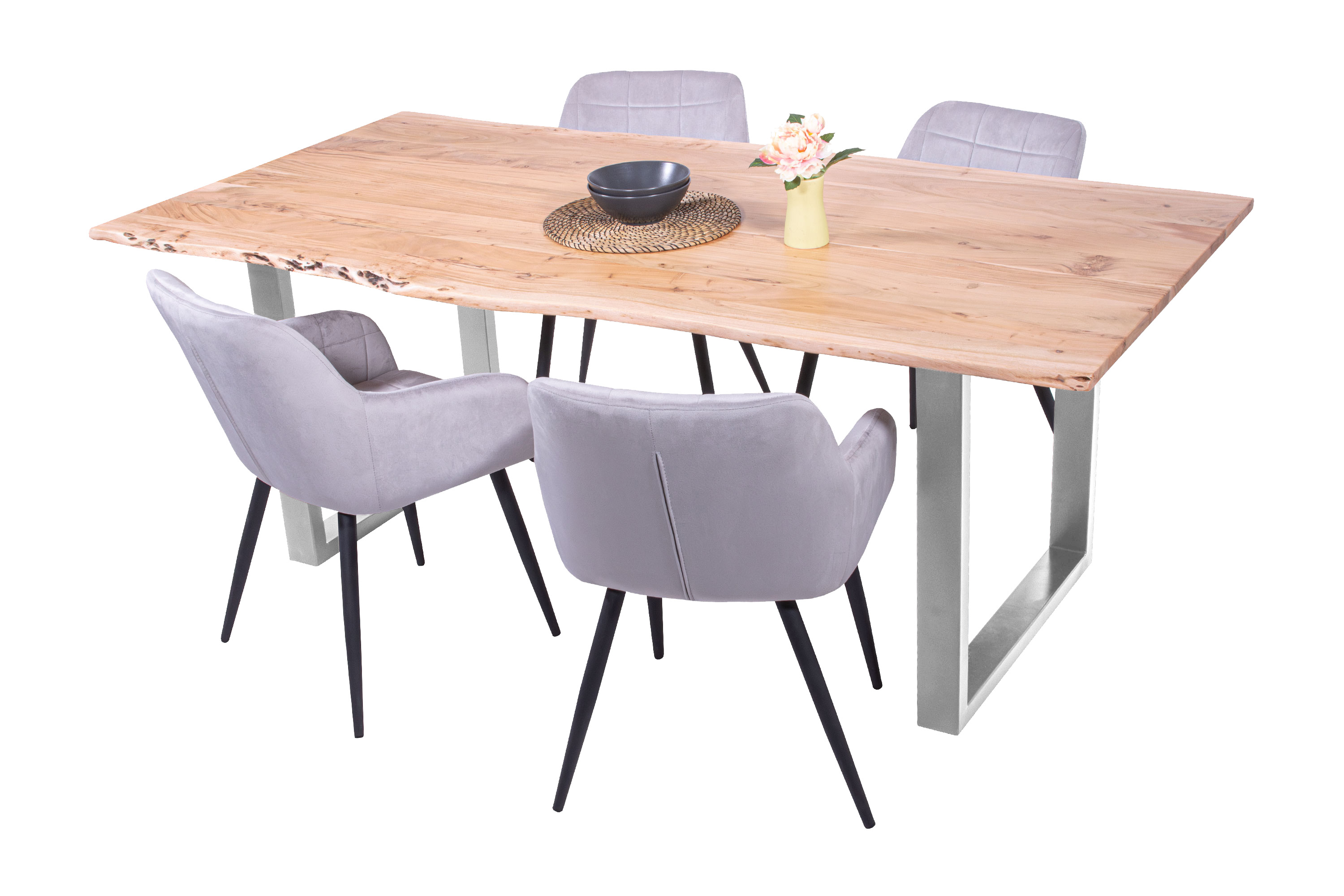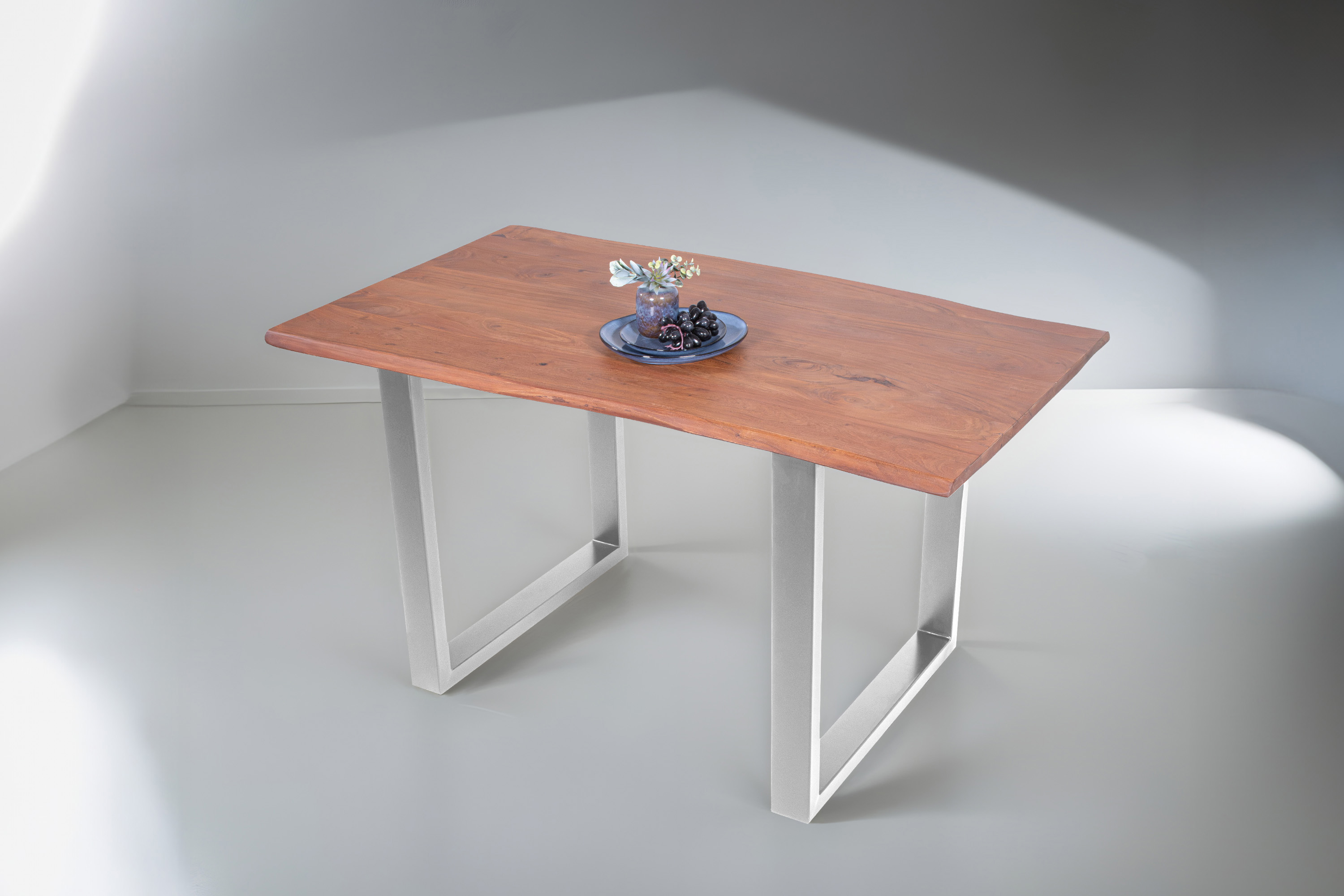 Baumkantentisch Adella, Esszimmertisch Massivholz Akazie / Natur- und Nussbaumfarben, Gestell in Silber und Schwarz